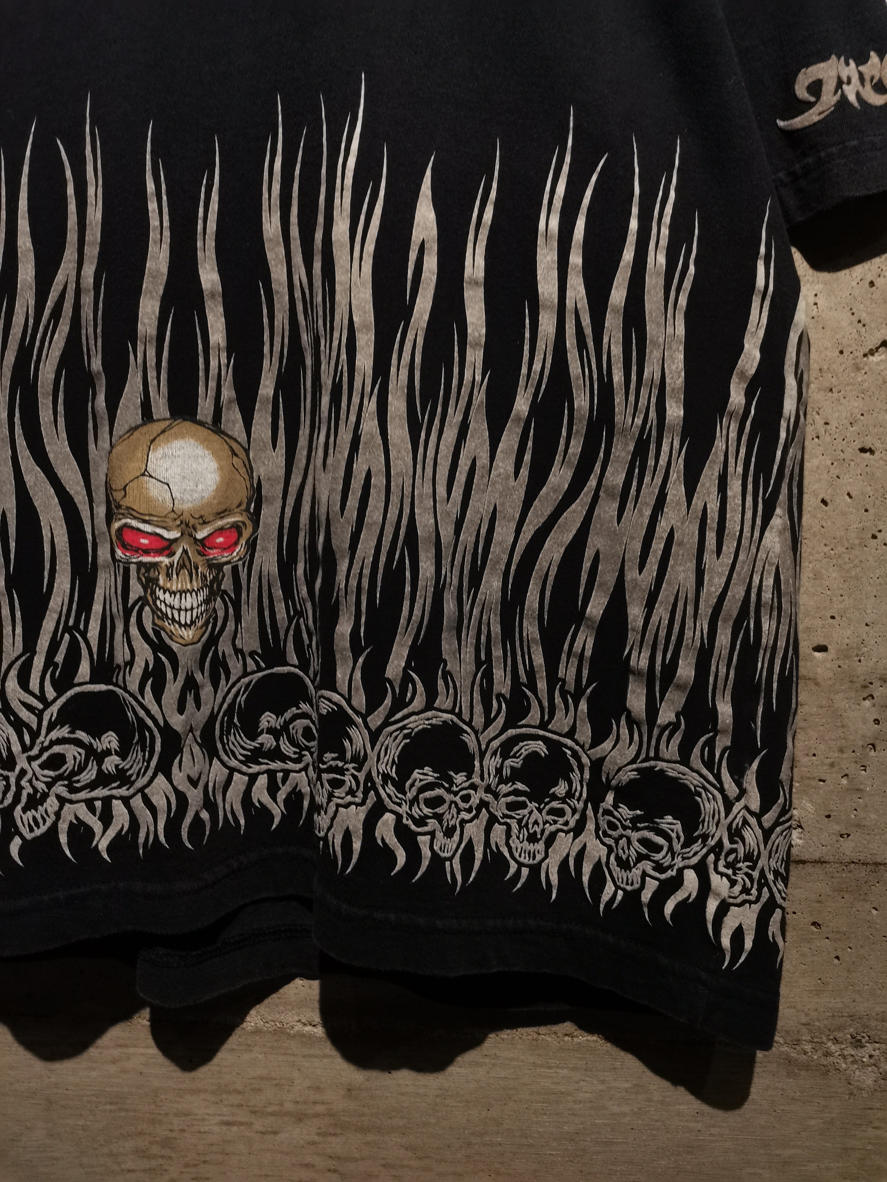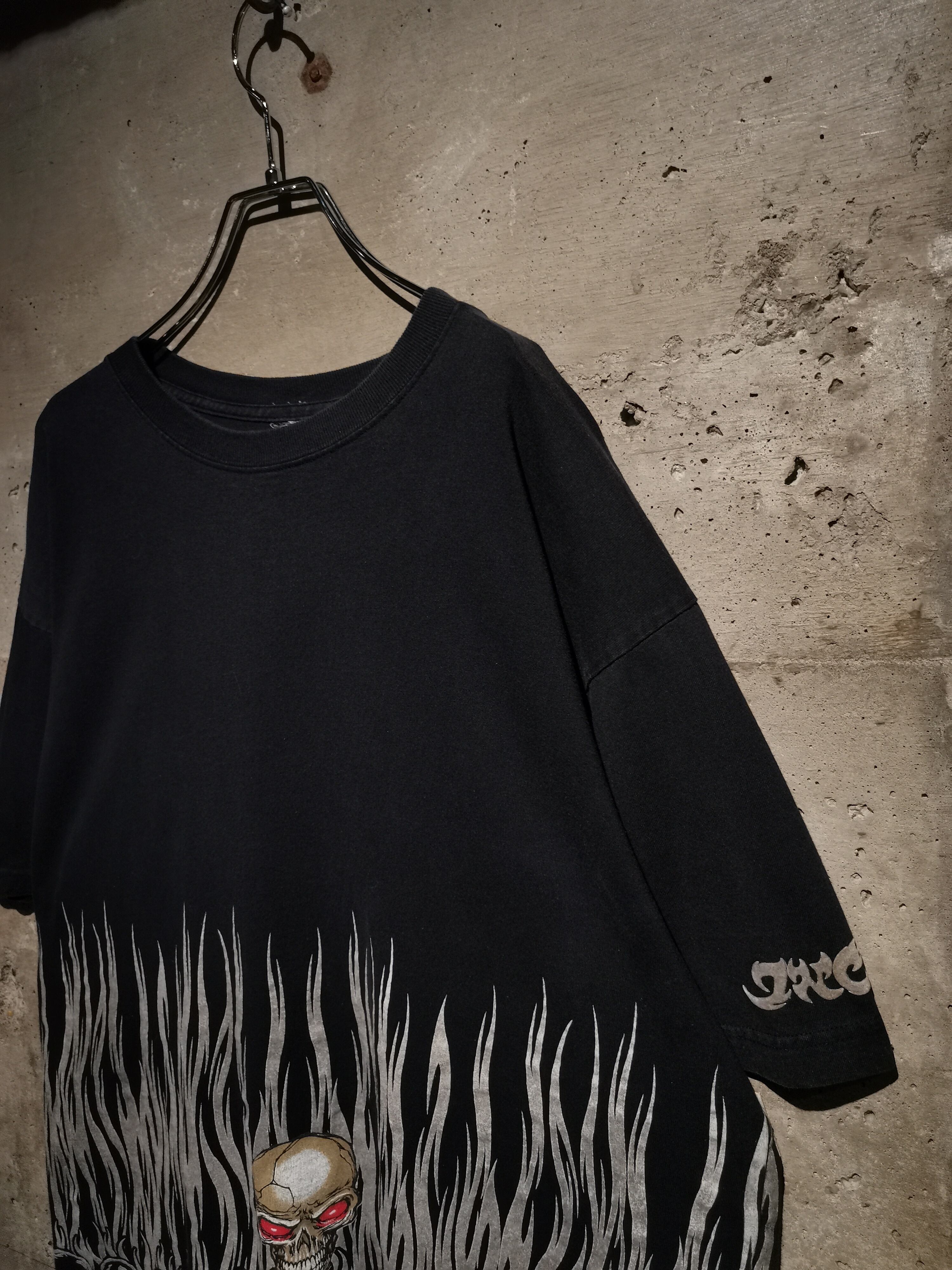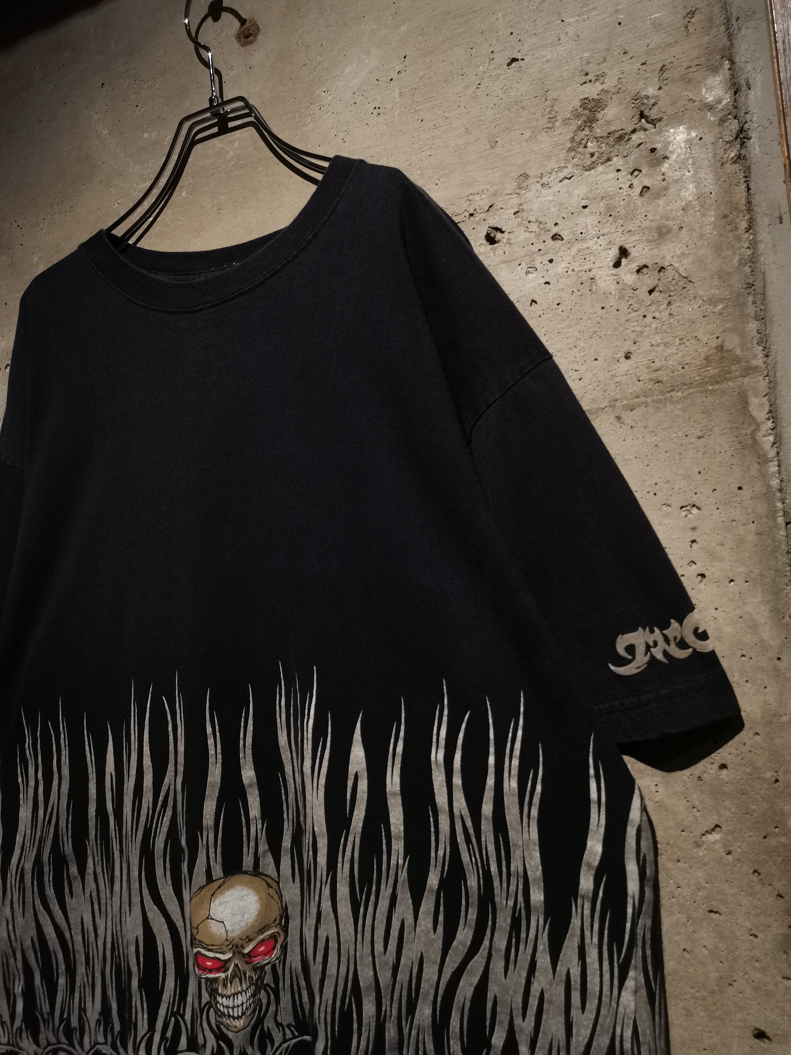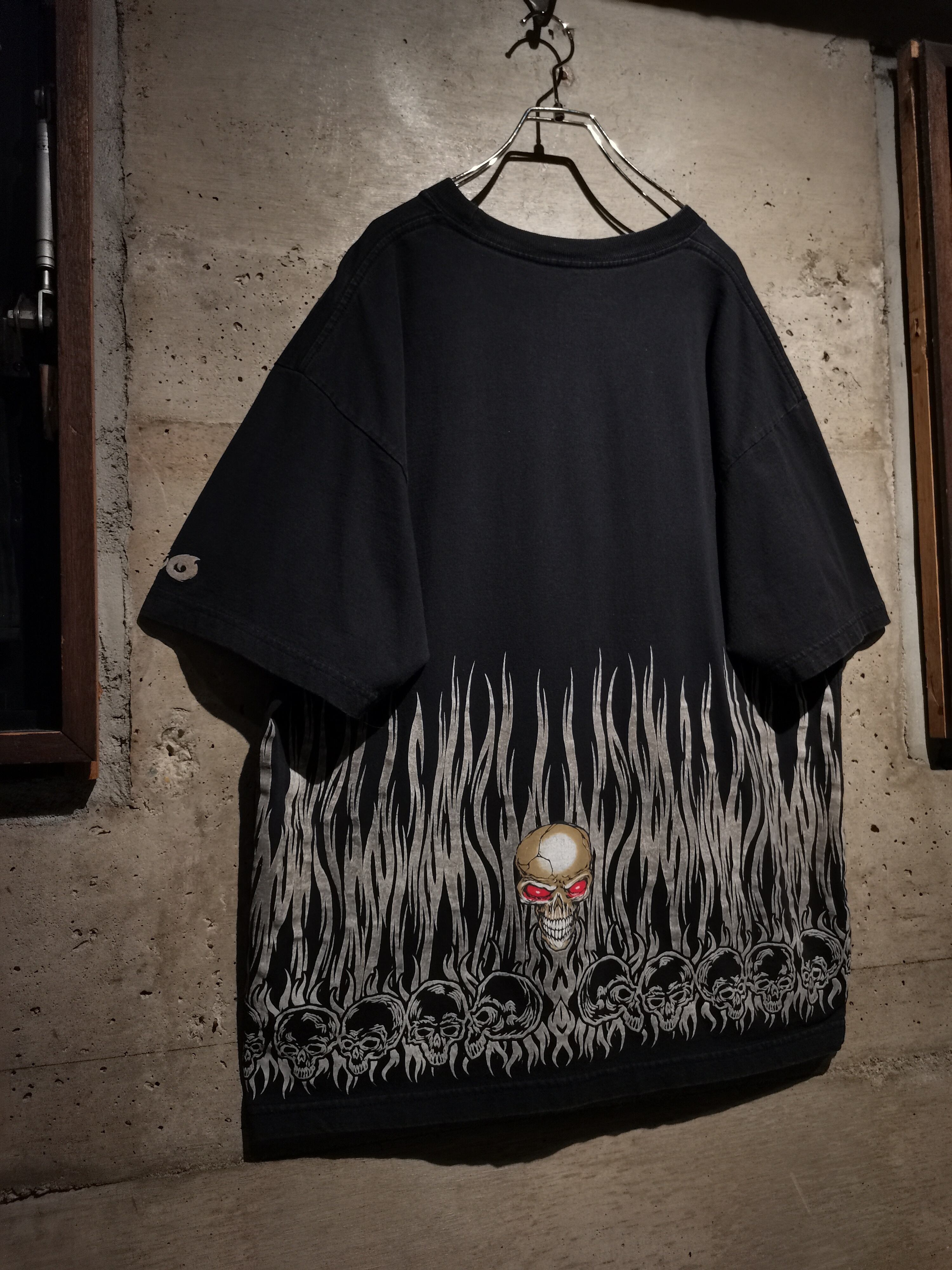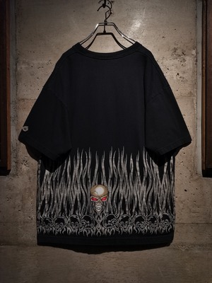 ブラックボディに白のフロッキープリントによってスカル×ファイヤーのデザインを載せた1枚。