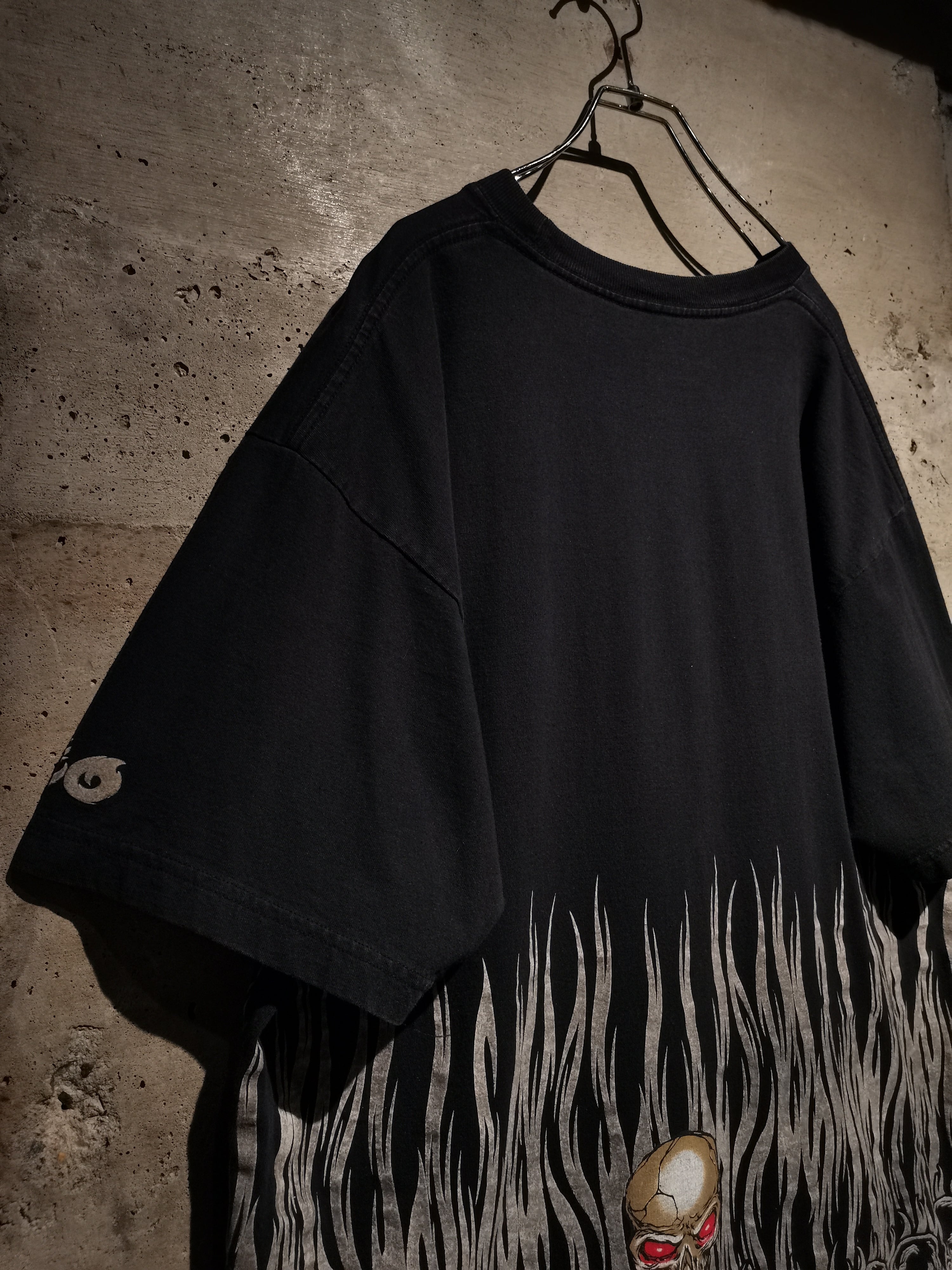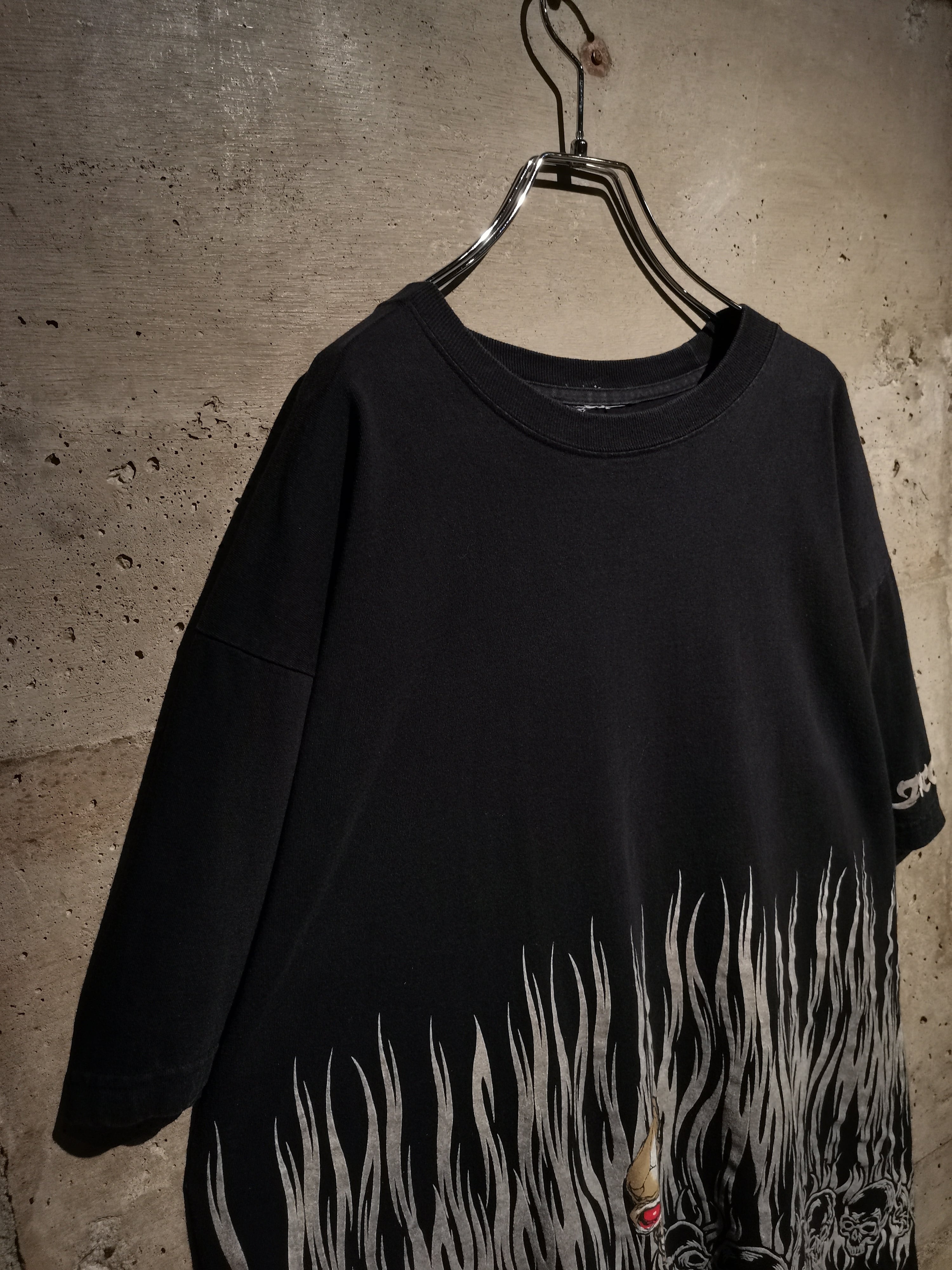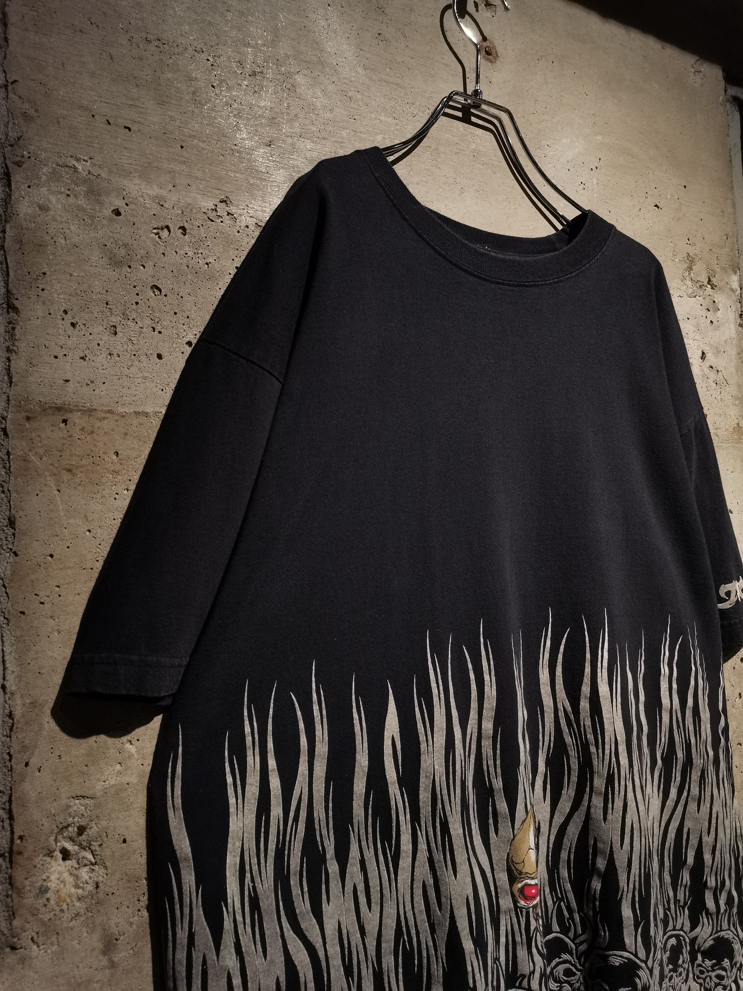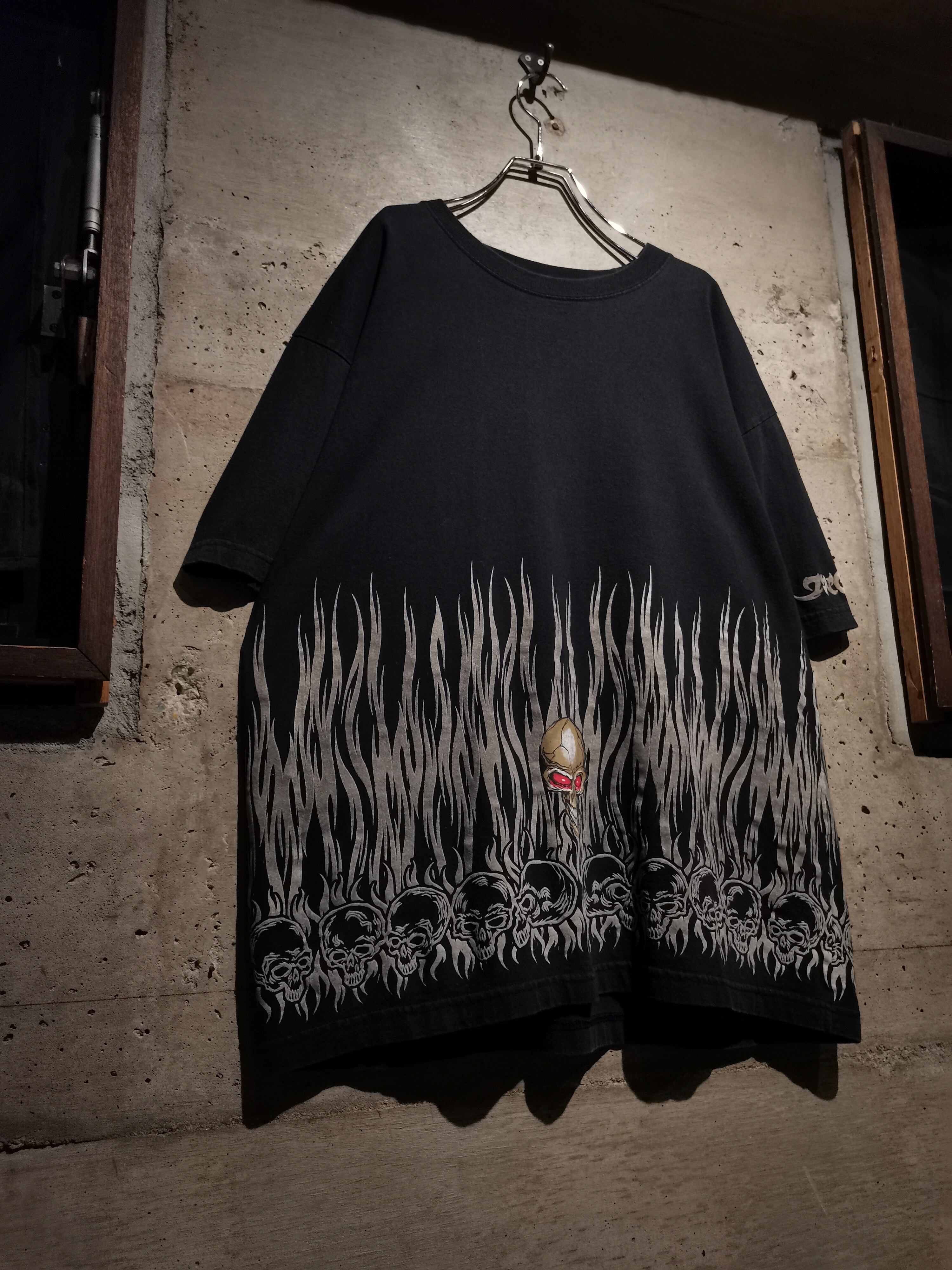 ブラックボディに白のフロッキープリントによってスカル×ファイヤーのデザインを載せた1枚。