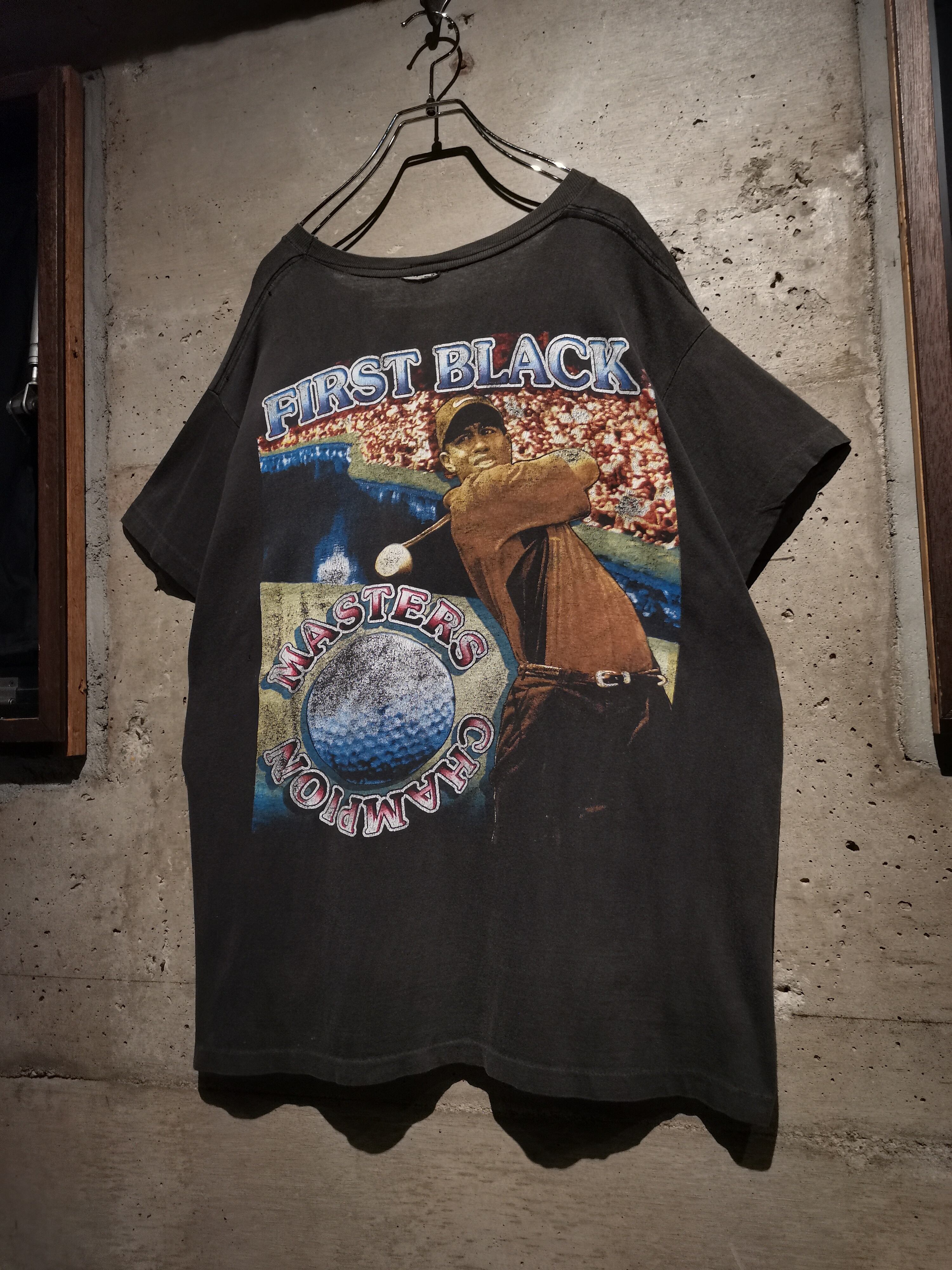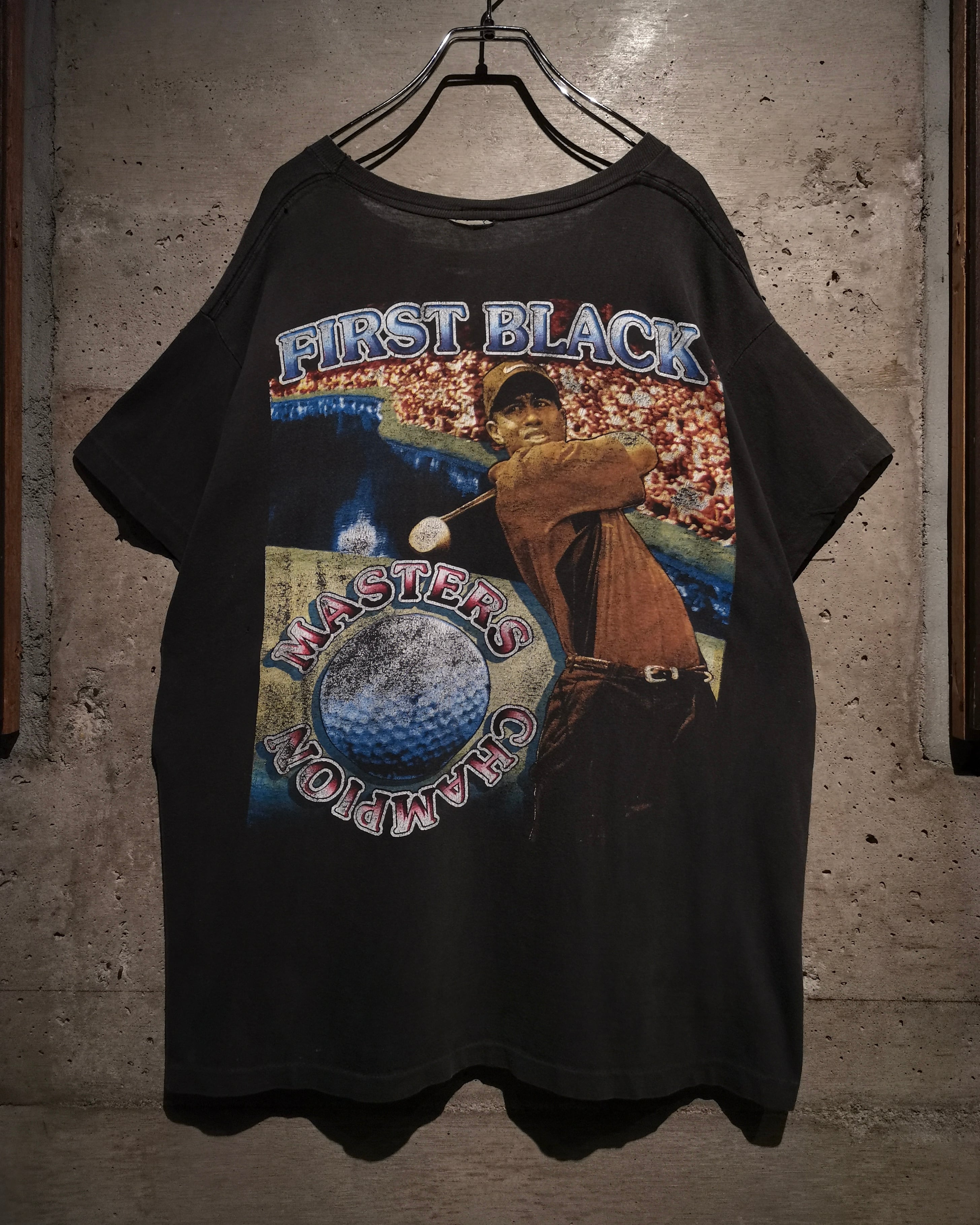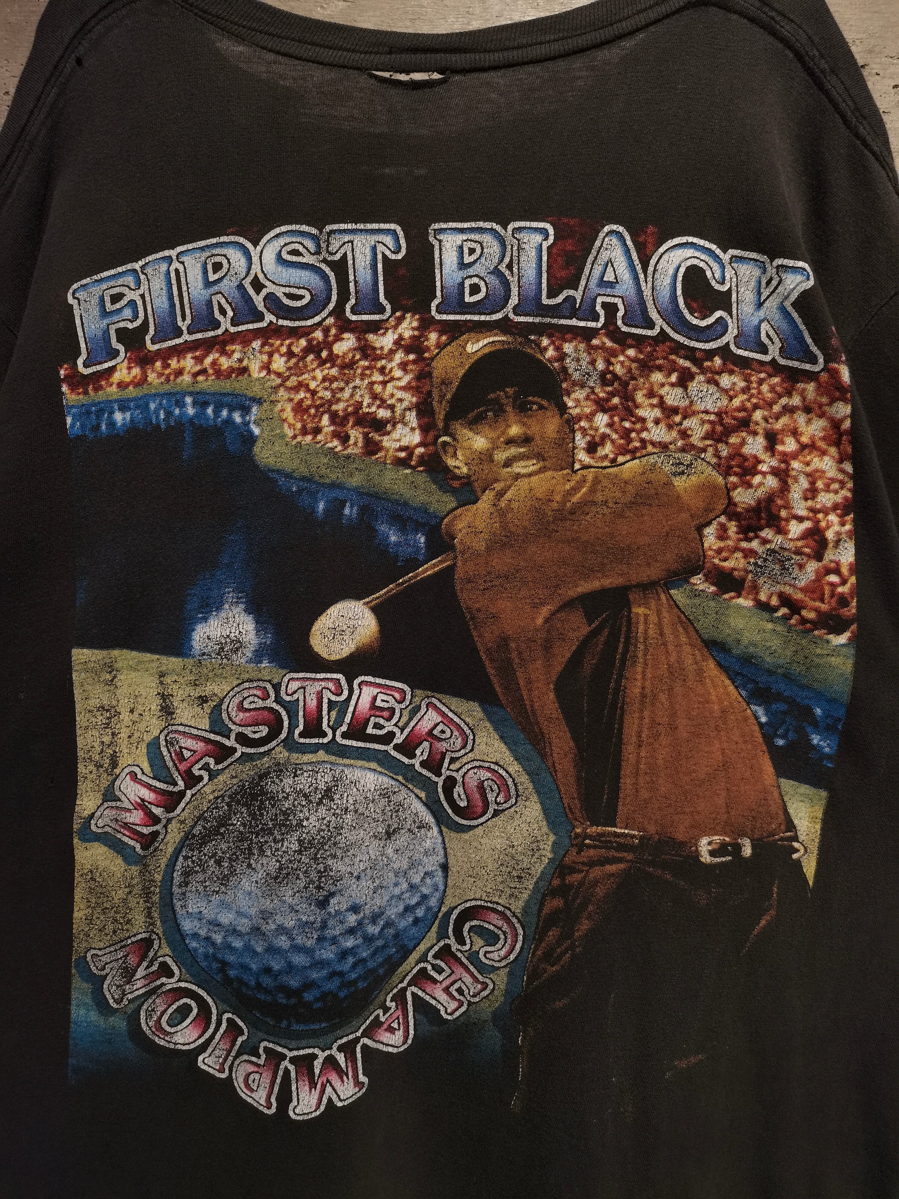 フロントにタイガー・ウッズと虎、背面には"FIRST BLACK MASTERS CHAMPION"の文字と共に彼の姿と、存在感を見せるプリントを両面に載せた1枚。