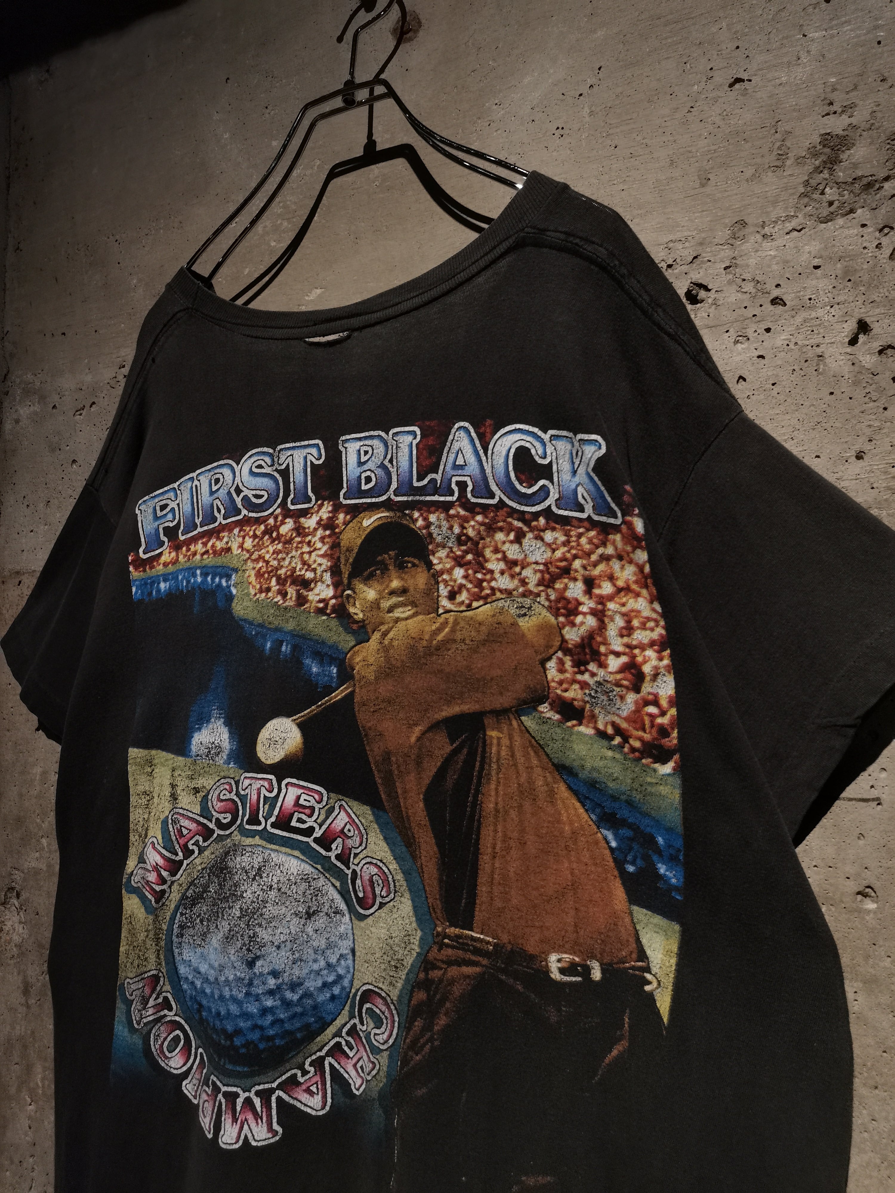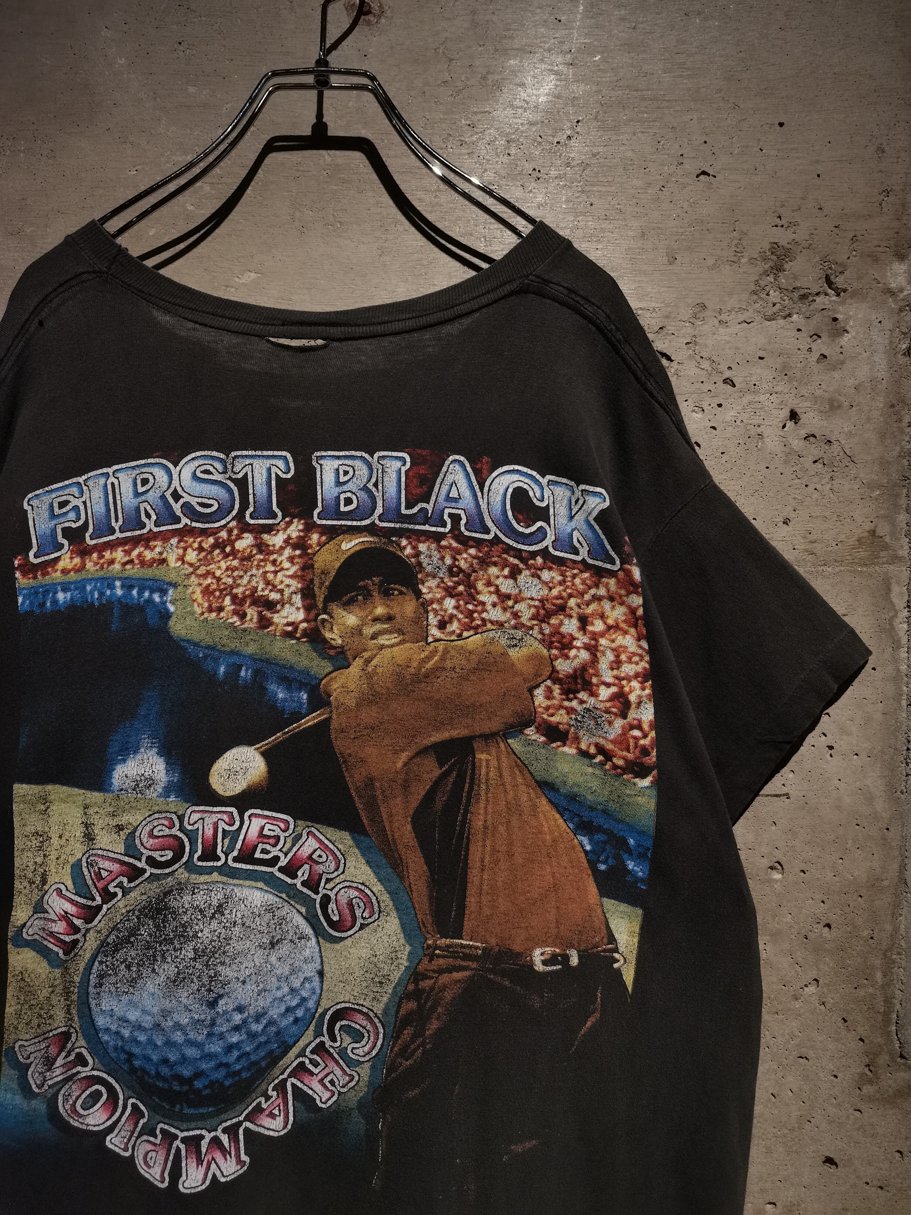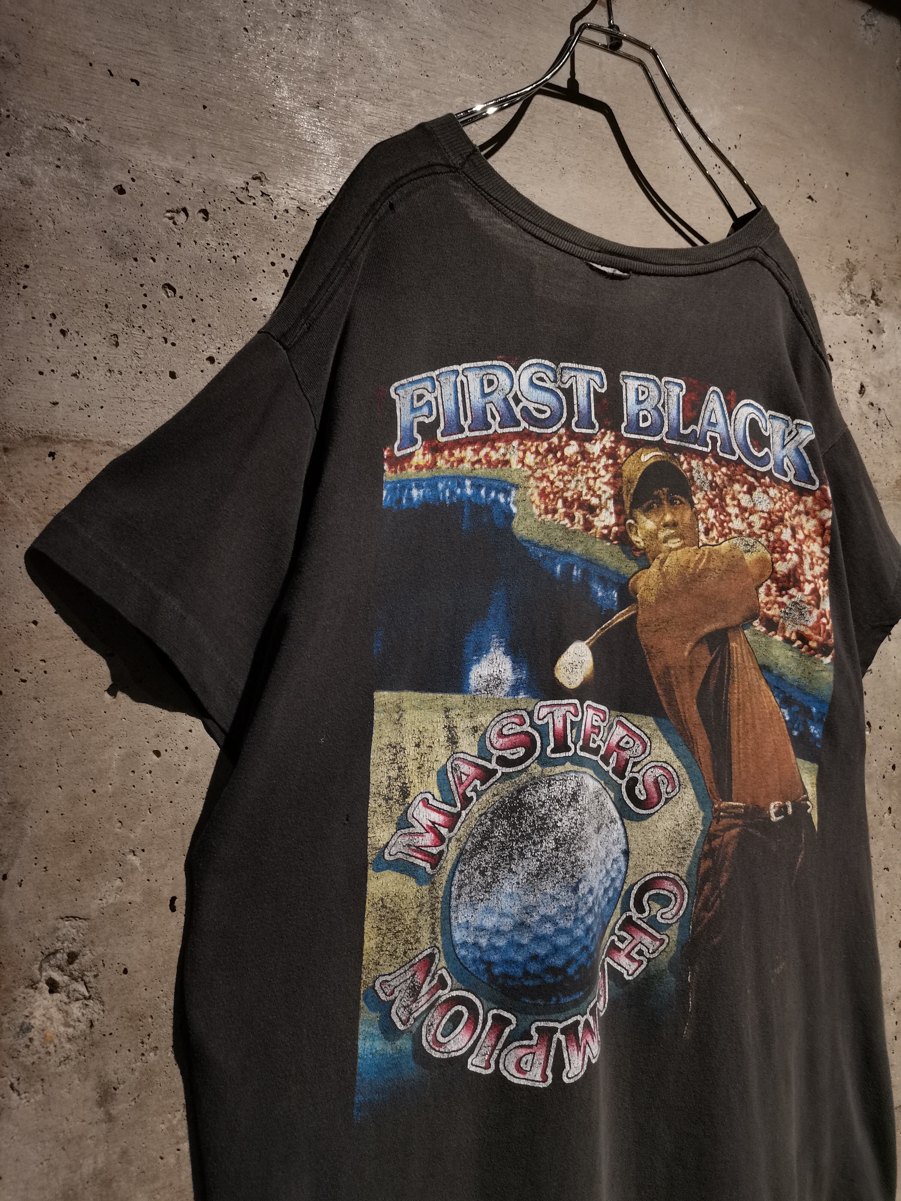 フロントにタイガー・ウッズと虎、背面には"FIRST BLACK MASTERS CHAMPION"の文字と共に彼の姿と、存在感を見せるプリントを両面に載せた1枚。