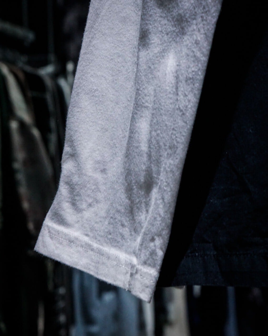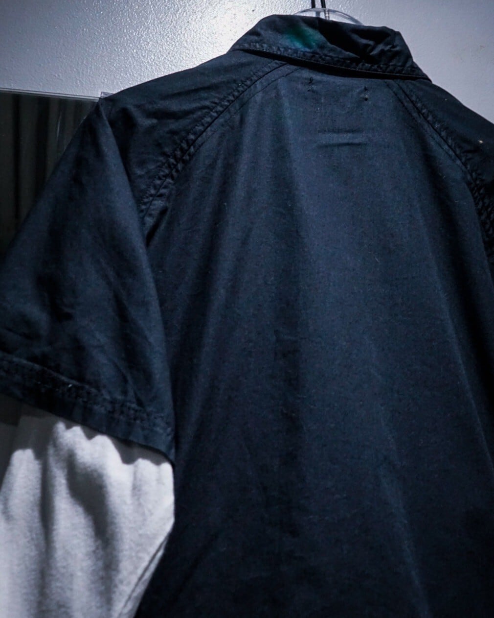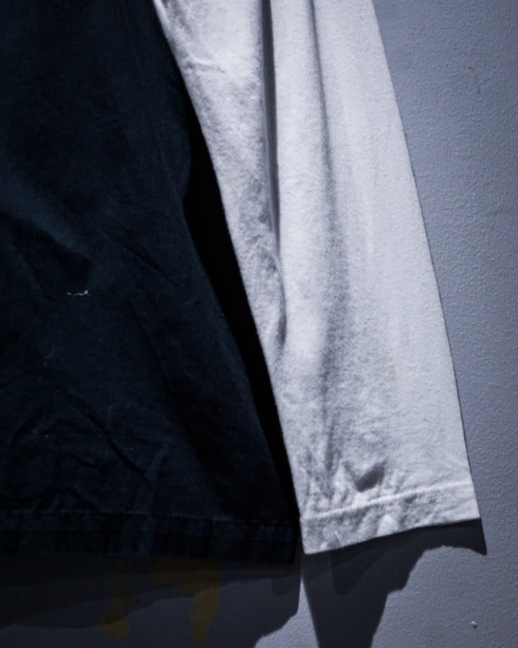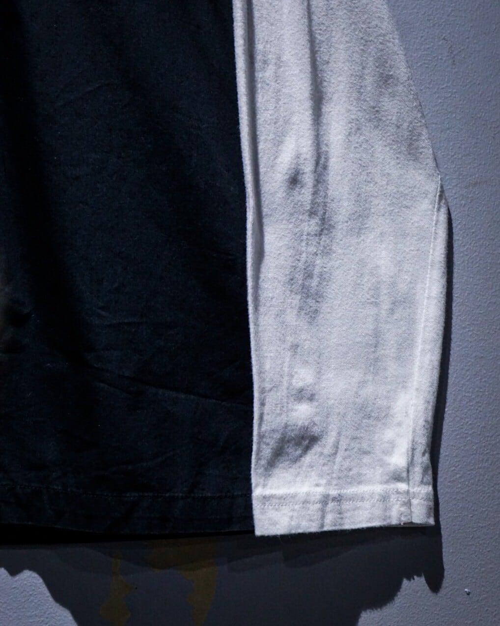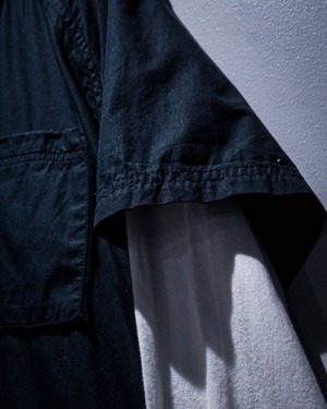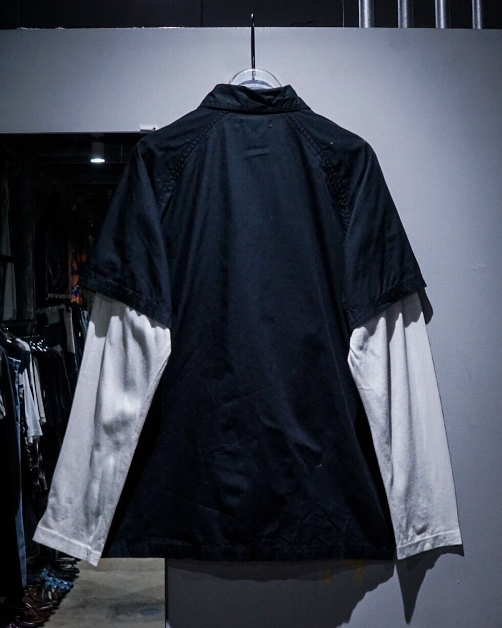 白のロンTの上から黒の半袖シャツを重ねたような、レイヤード風のデザインに仕上げた1着。