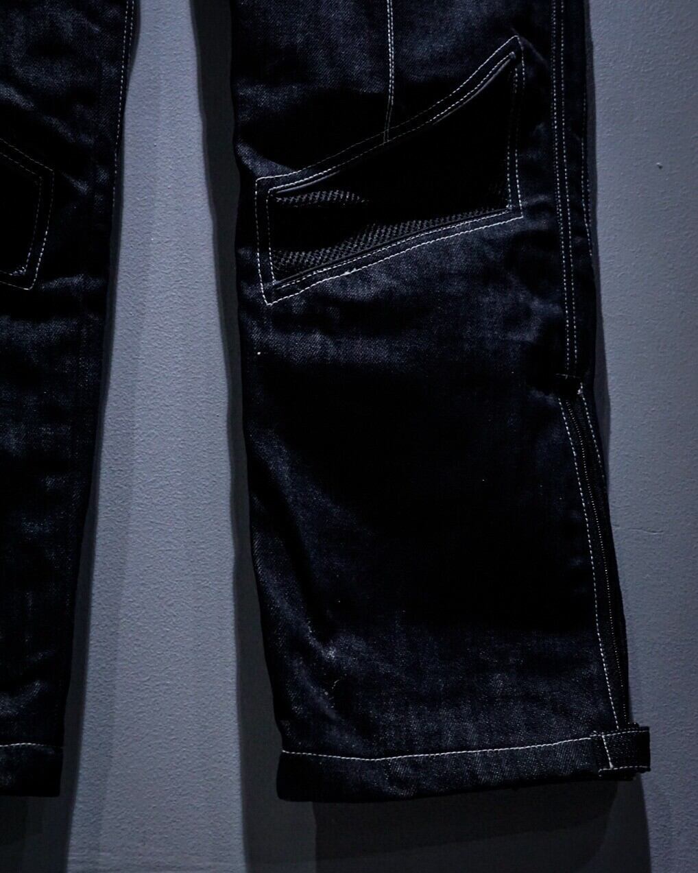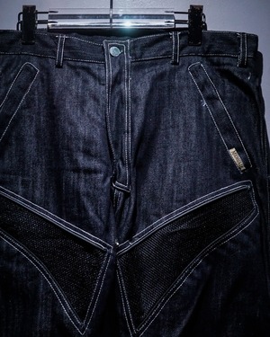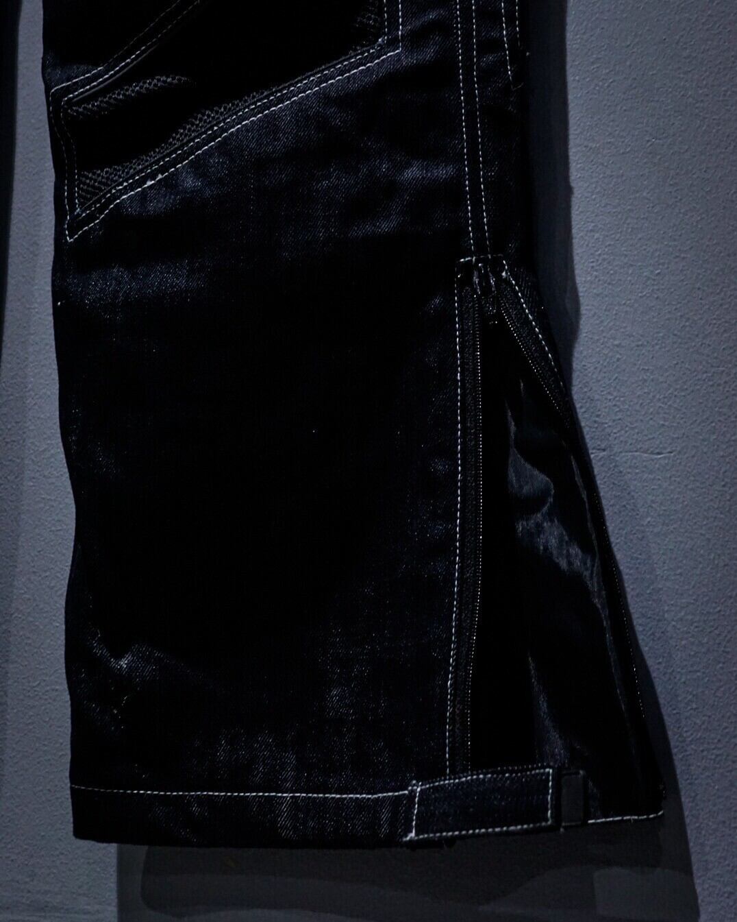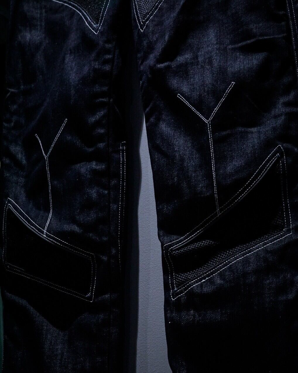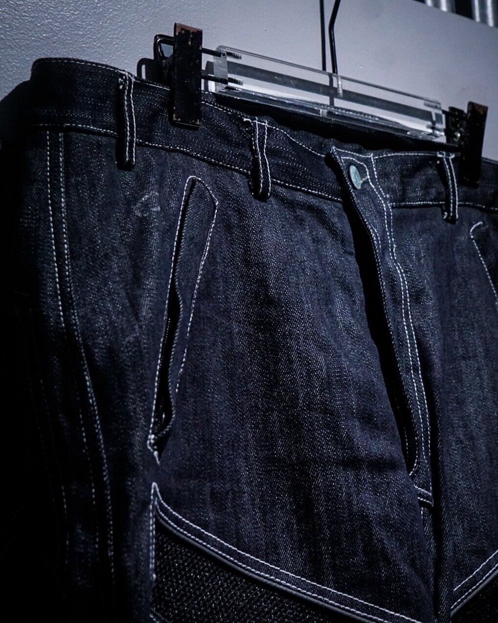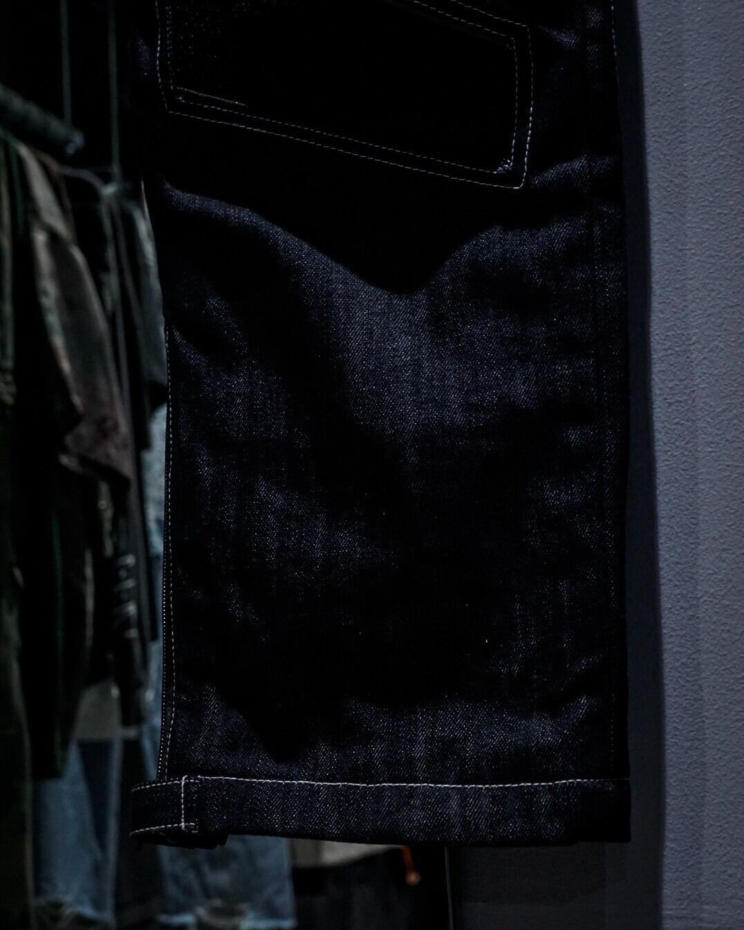太もも付近、膝下、背面には強化のための切り替えに、膝部分には立体感を出すダーツ。機能的かつデザインにも富んだ、通常のデニムパンツとは異なる当店らしいテクニカルな雰囲気を漂わせています。