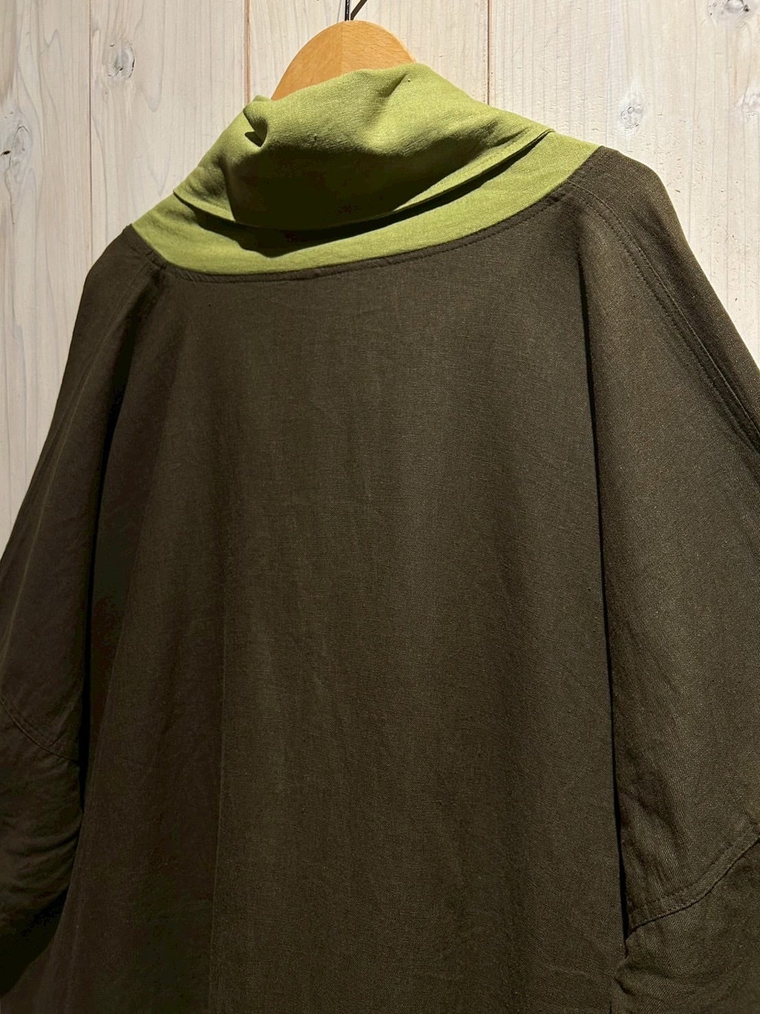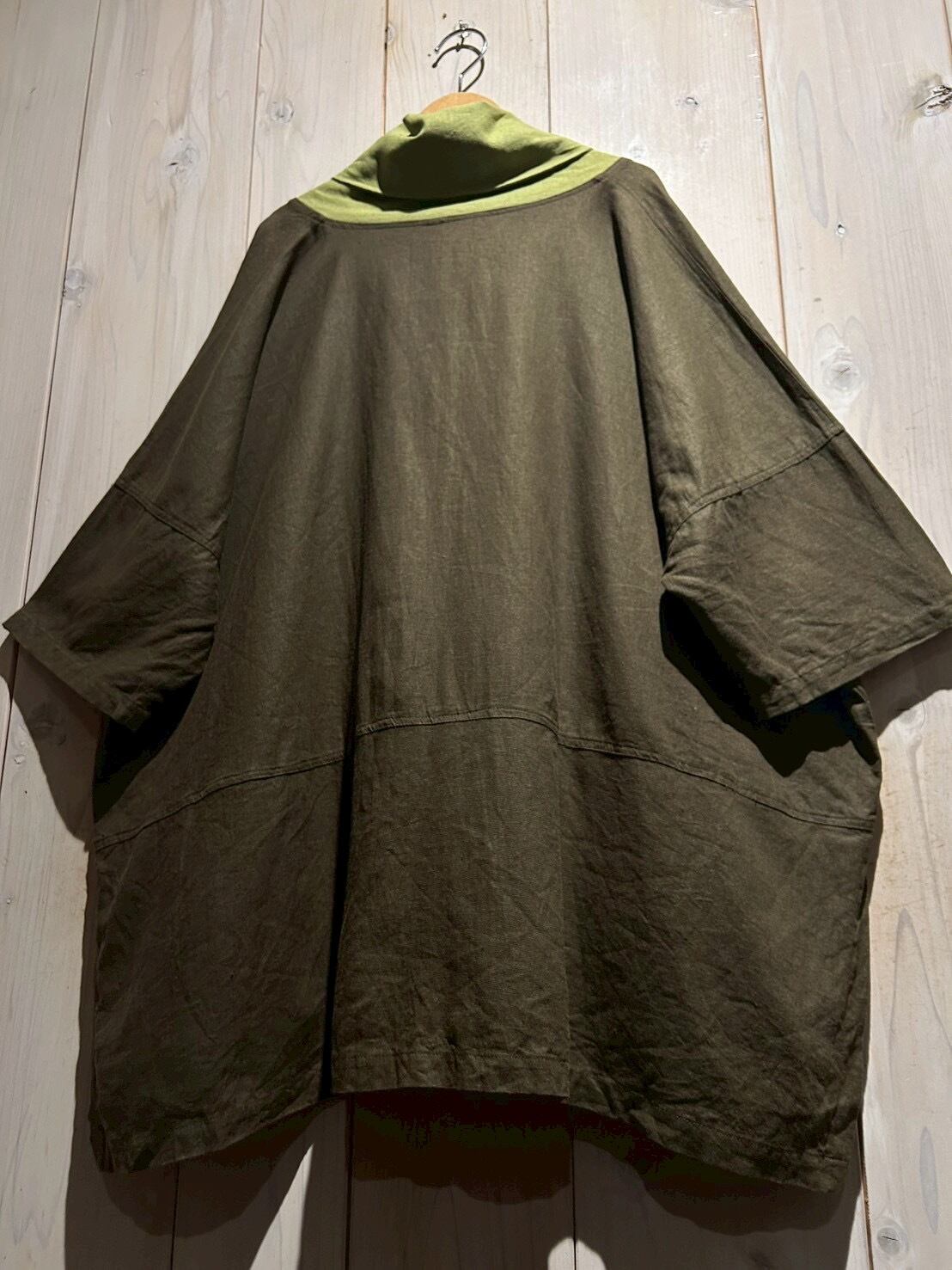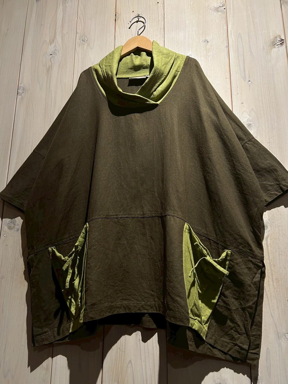 緑を混ぜたような、深みのあるブラウンのボディにくすんだ黄緑を首元、ポケットに切り替えた半袖プルオーバー。