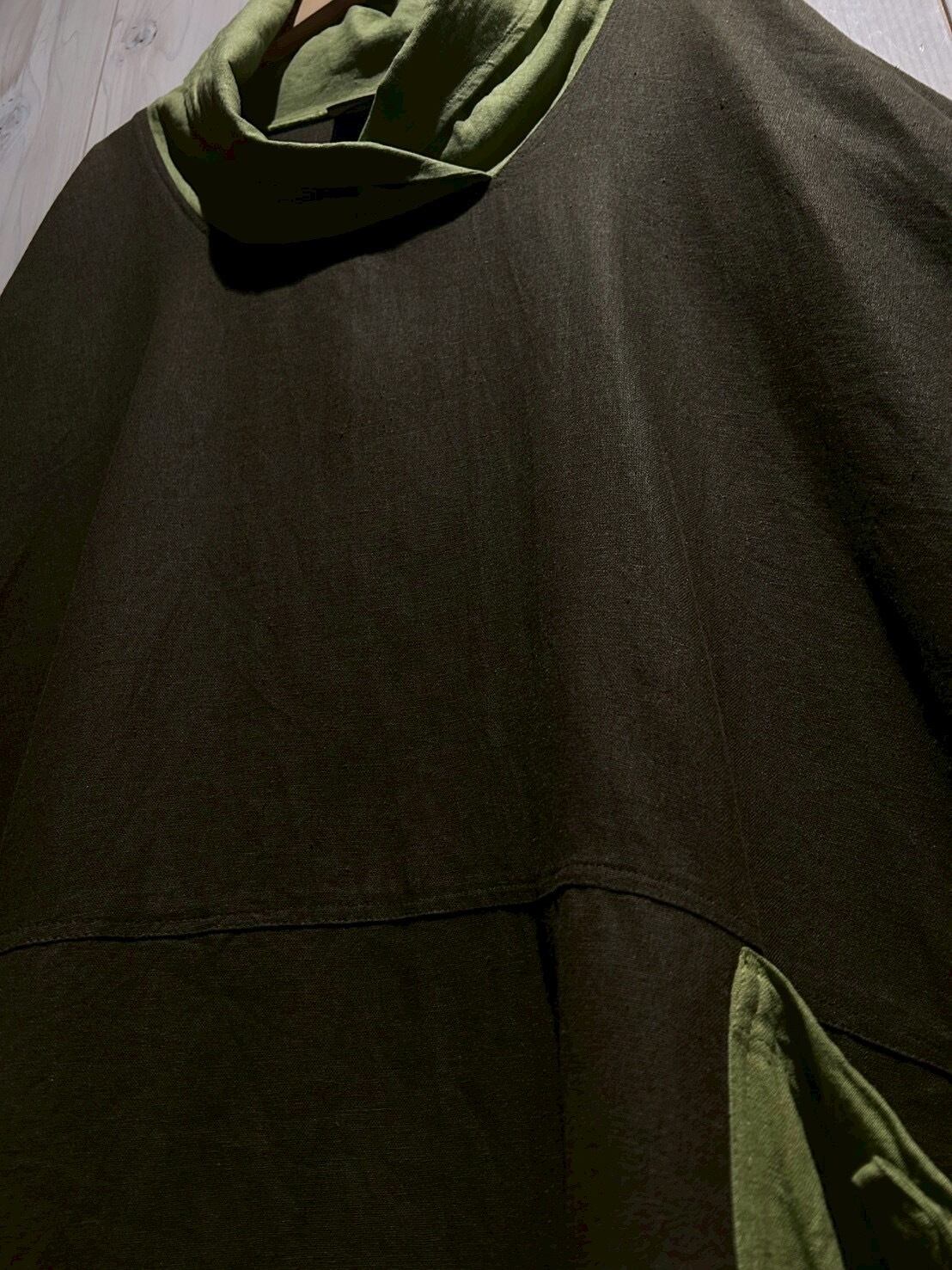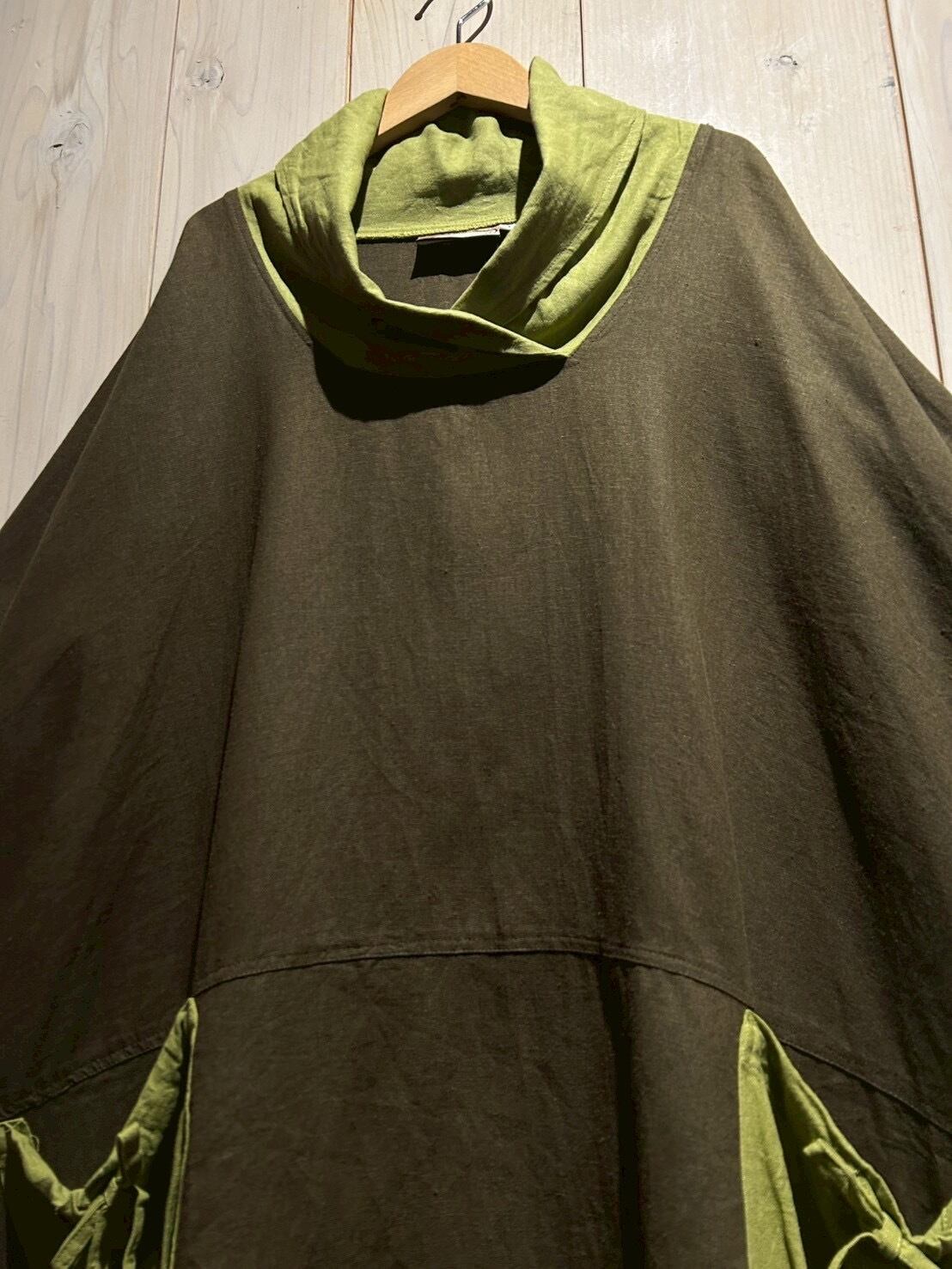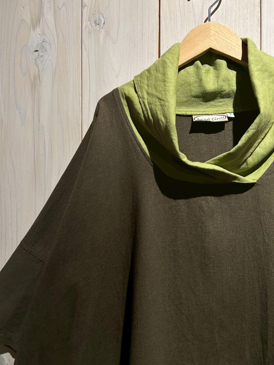緑を混ぜたような、深みのあるブラウンのボディにくすんだ黄緑を首元、ポケットに切り替えた半袖プルオーバー。