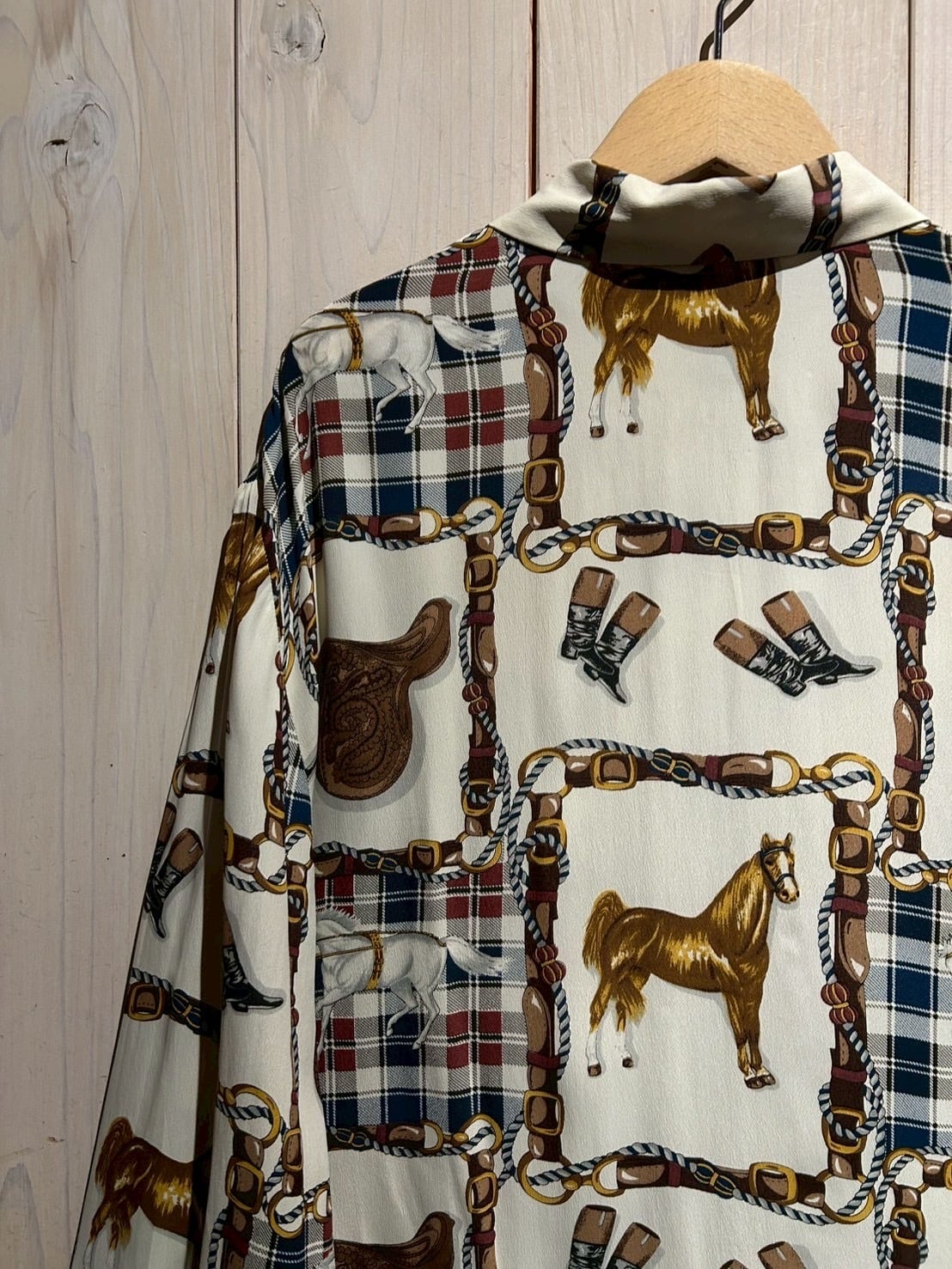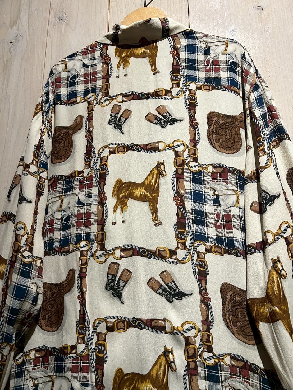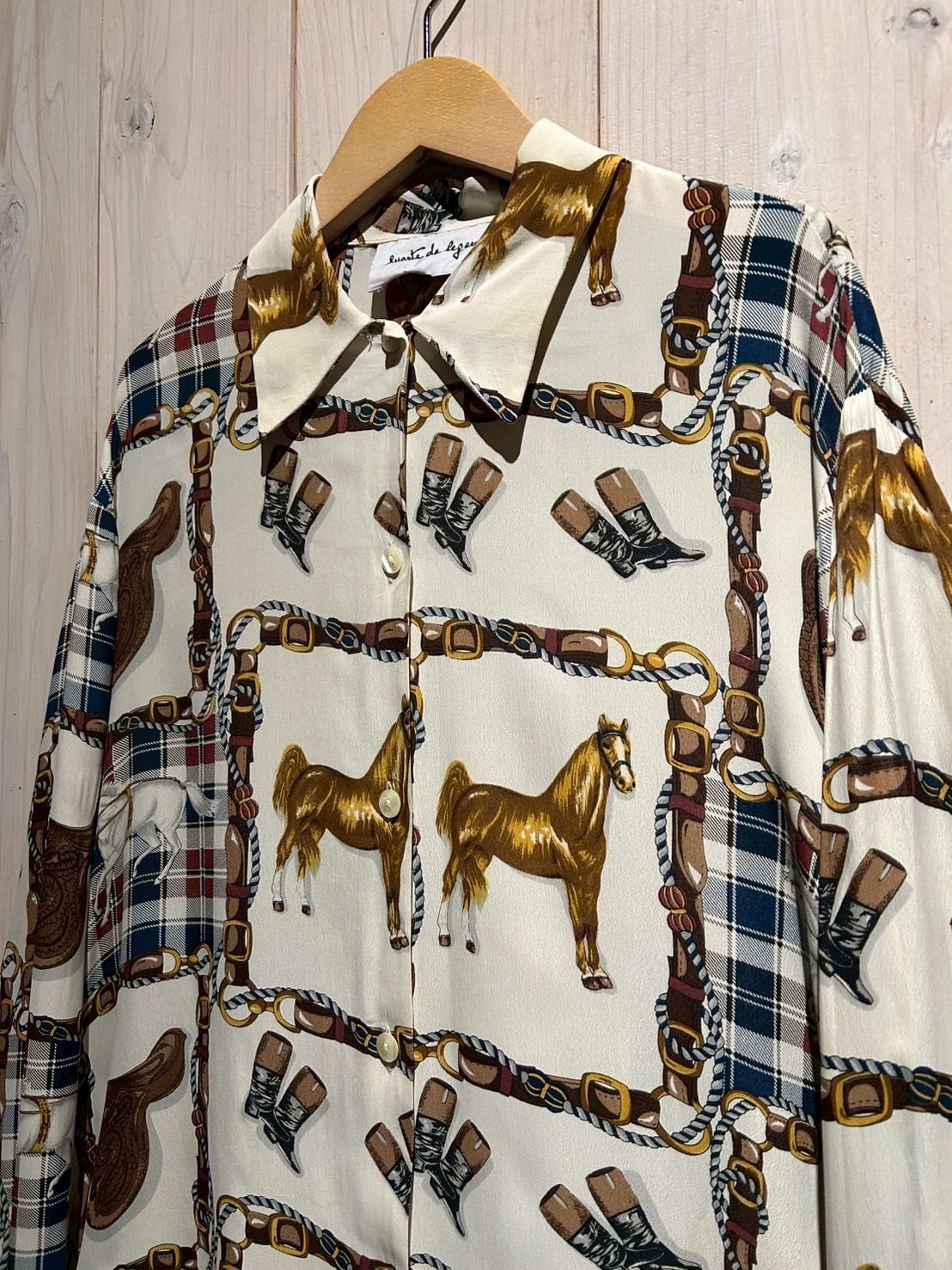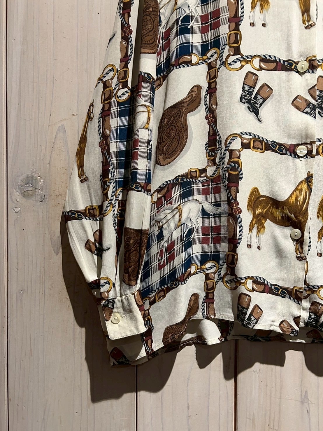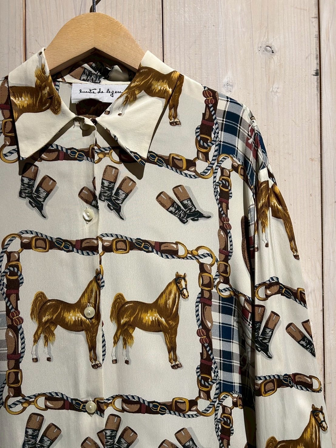 オフホワイトのボディをベースに、馬や馬具をモチーフにした高級感漂うデザインを落とし込んだ長袖シャツ。