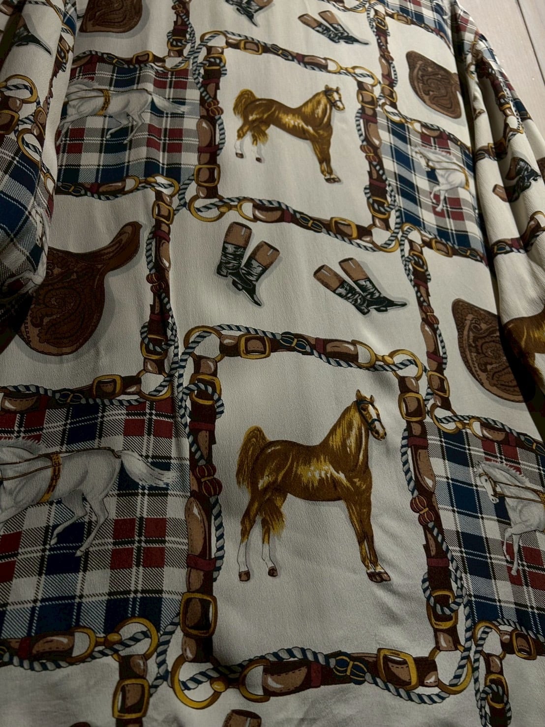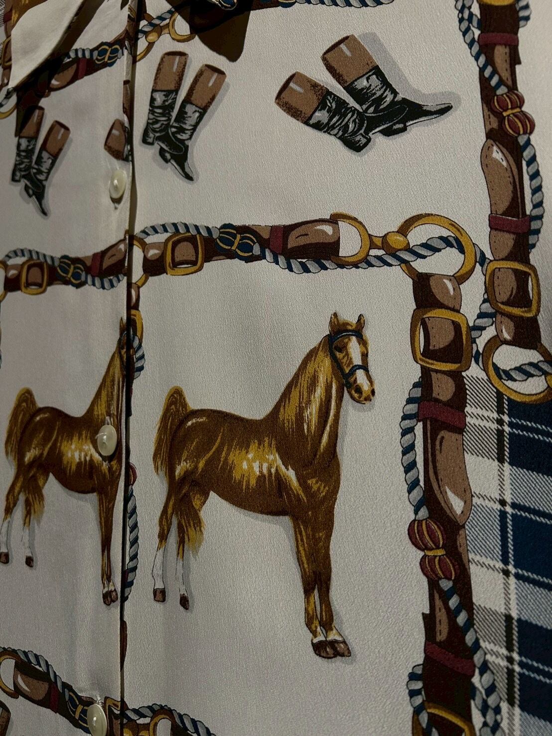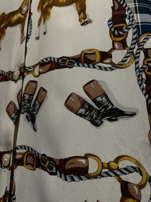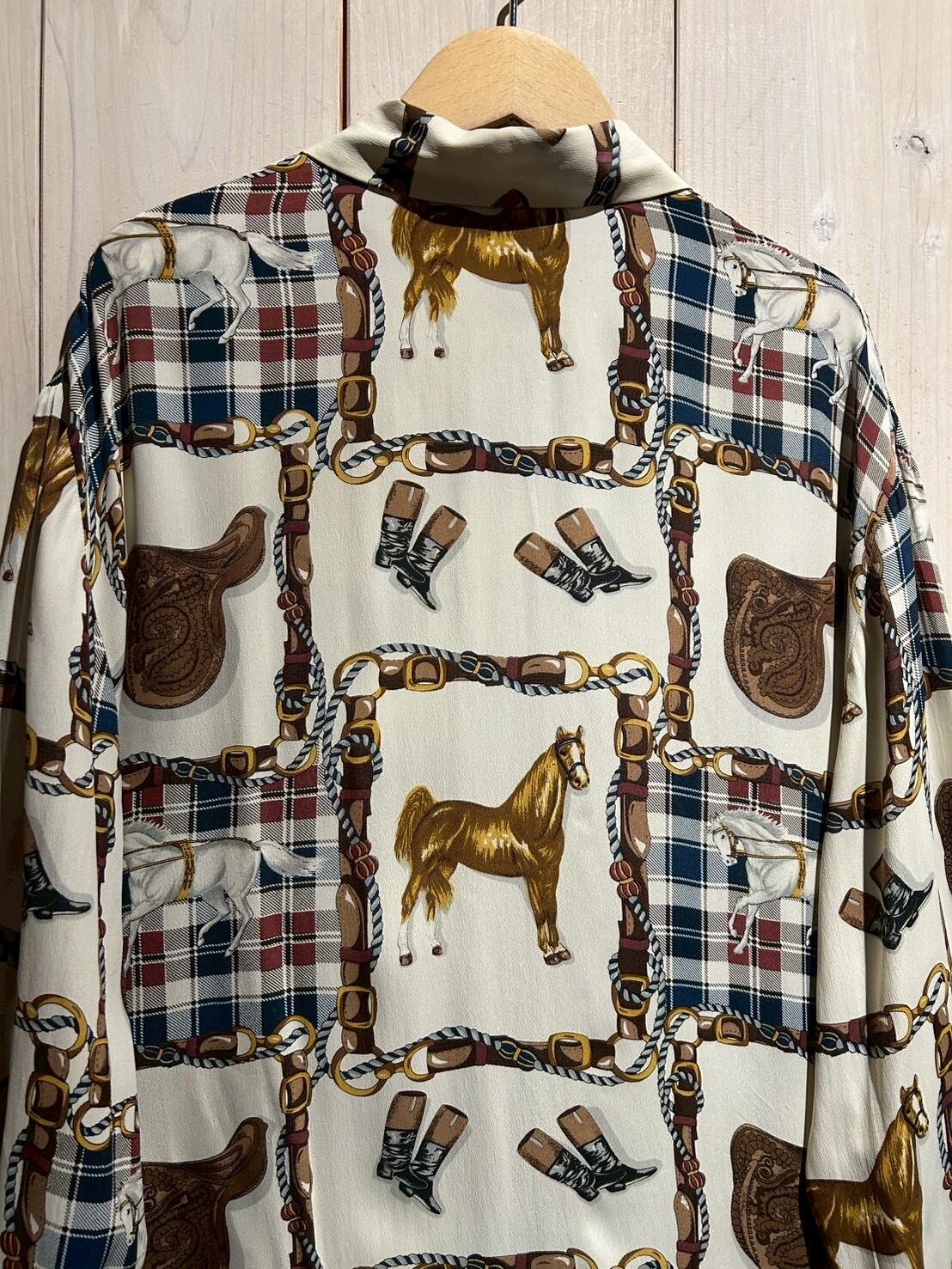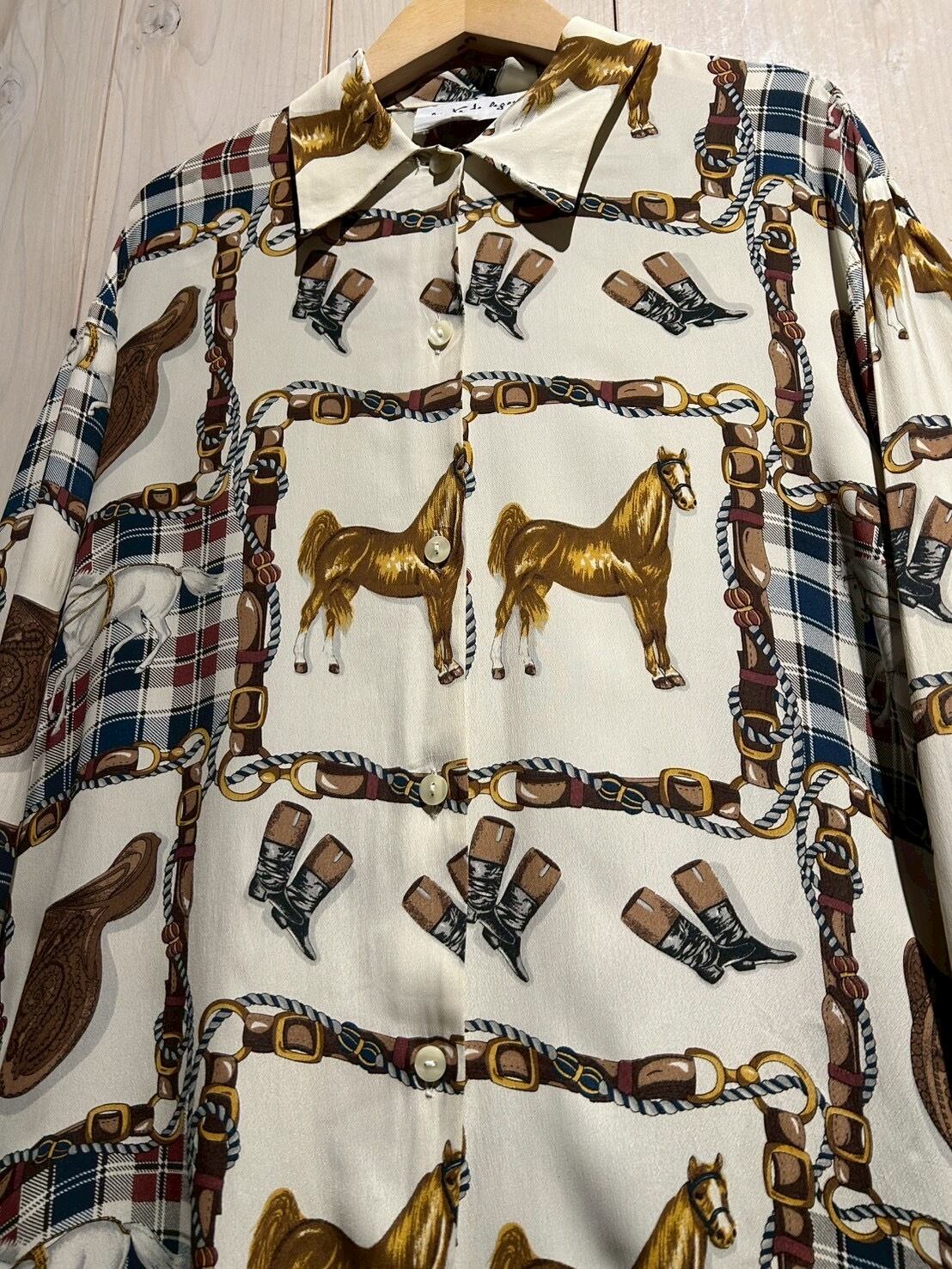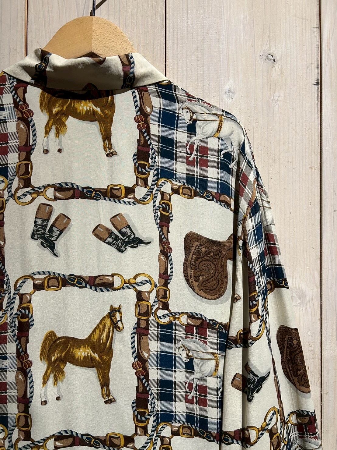 オフホワイトのボディをベースに、馬や馬具をモチーフにした高級感漂うデザインを落とし込んだ長袖シャツ。