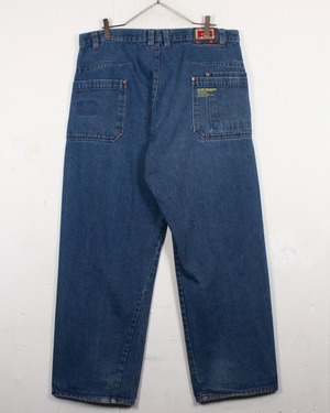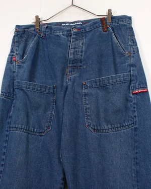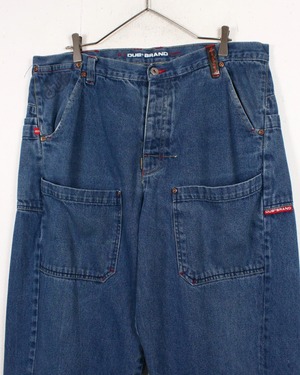 色残りのあるインディゴのブルーのボディに、フロント、背面に大きめのポケットを配したバギーデニムパンツ。