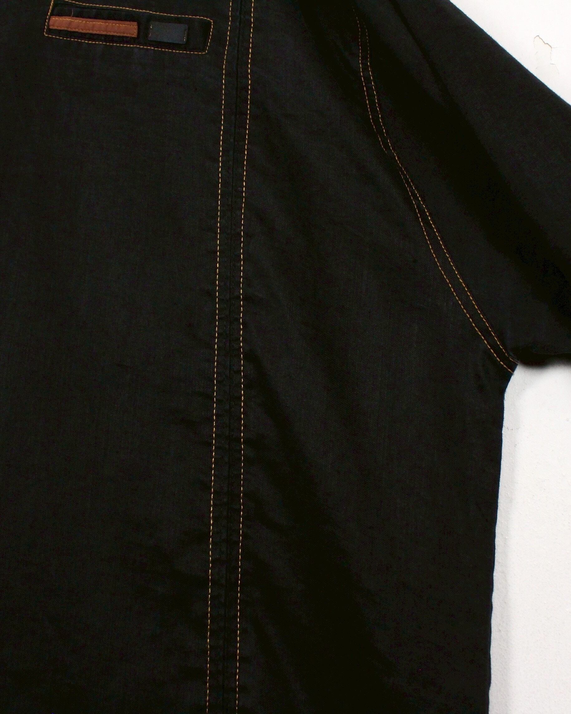 ブラックのボディにオレンジのステッチが映え、立体感のある印象に、左胸のラインデザインもアクセントになりつつ、ミニマルでシンプルな作りが非常に玄人好み。