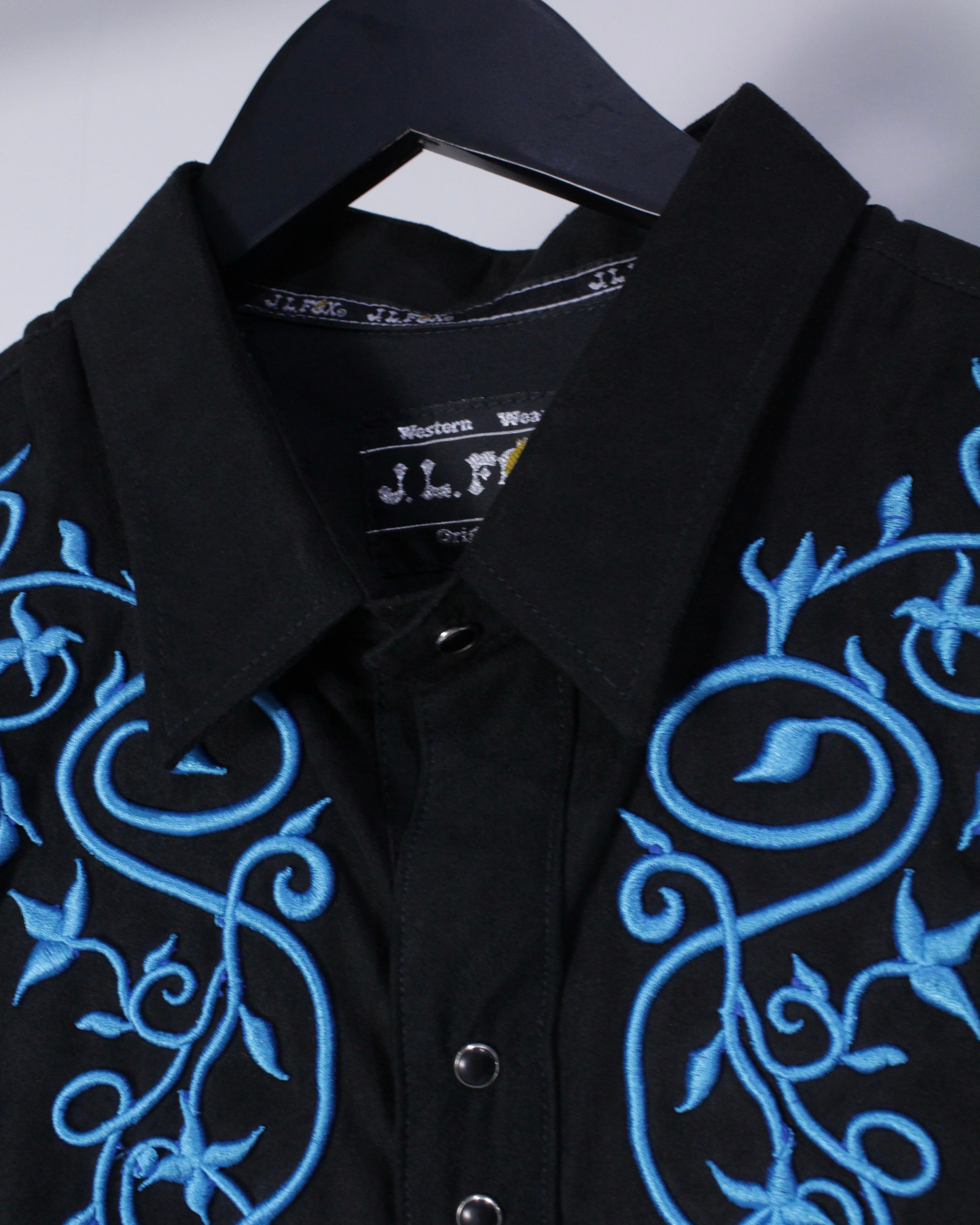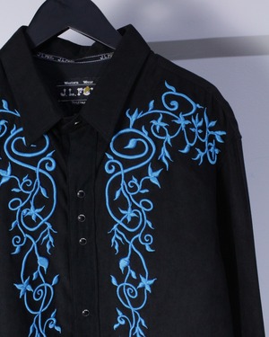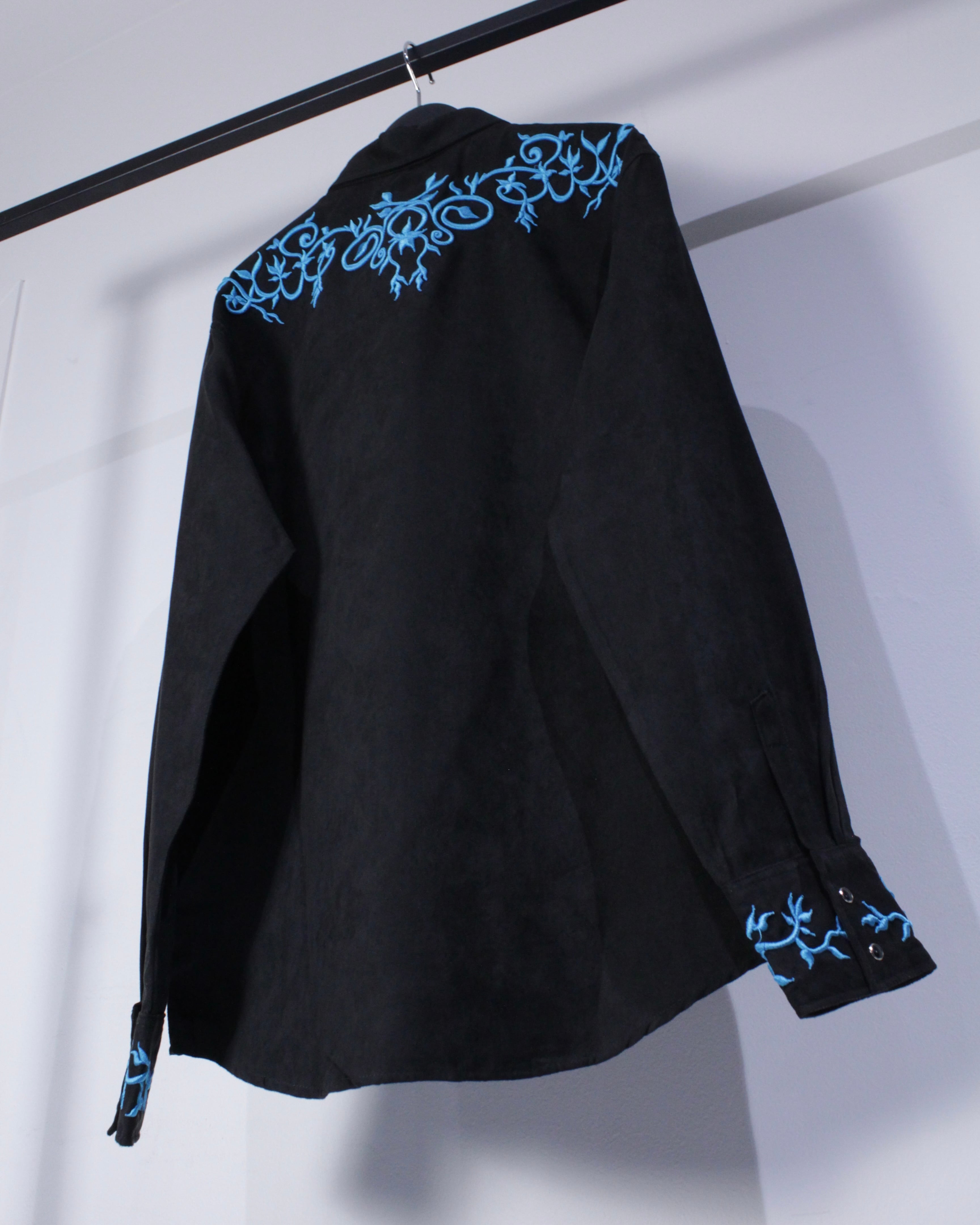 ブラックのボディをベースに、鮮やかなライトブルーの糸でボタニカルな刺繍を刻んだウエスタンシャツ。