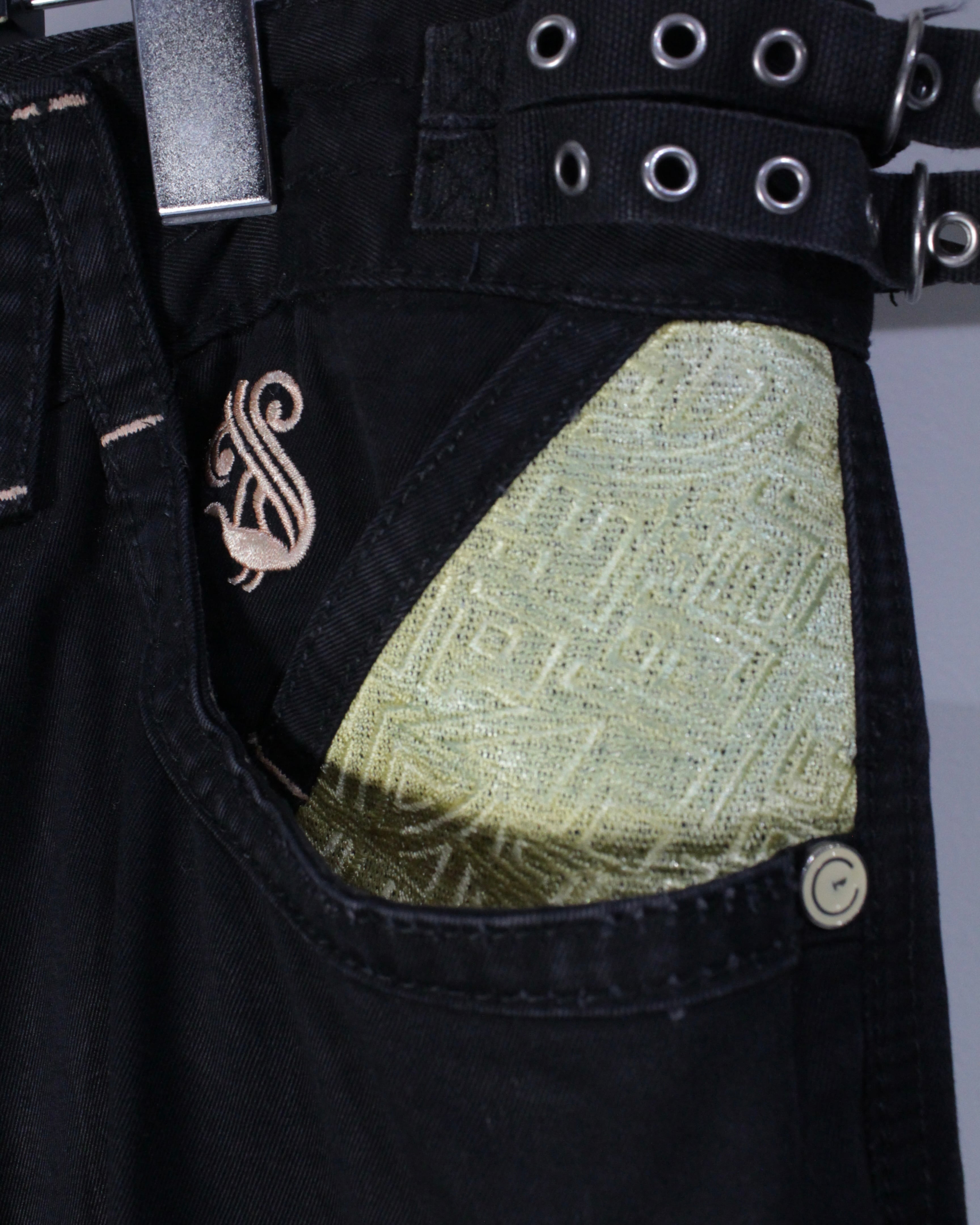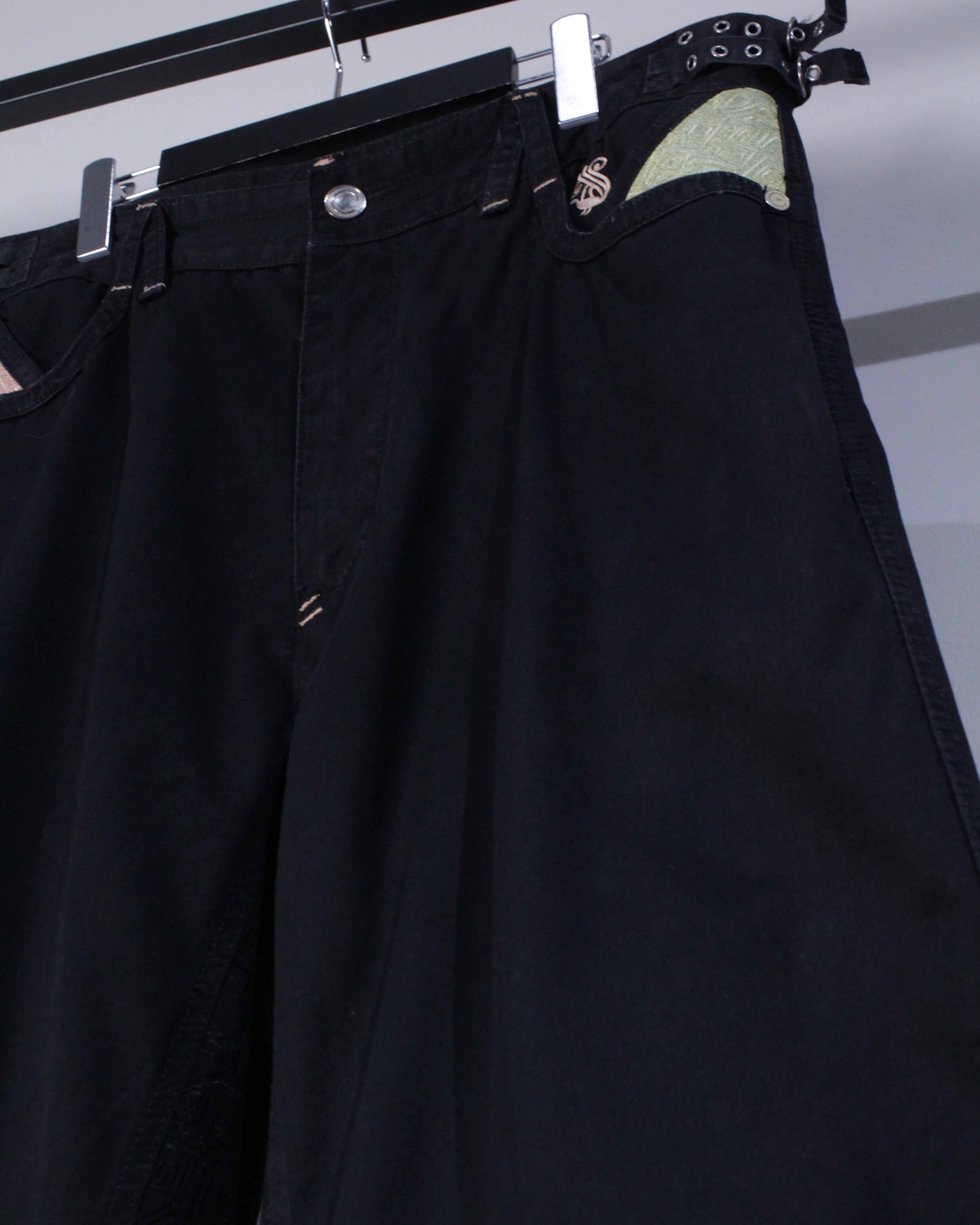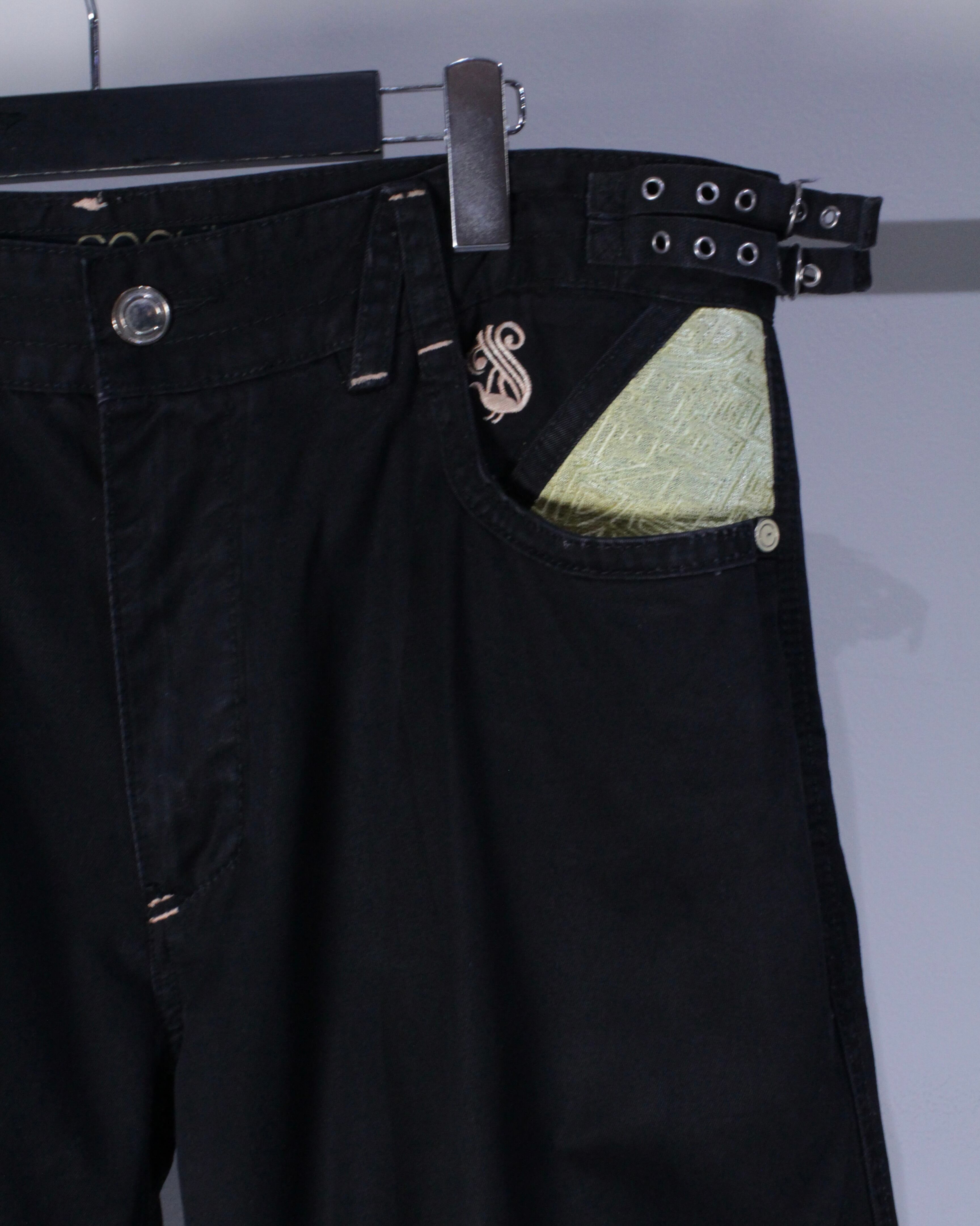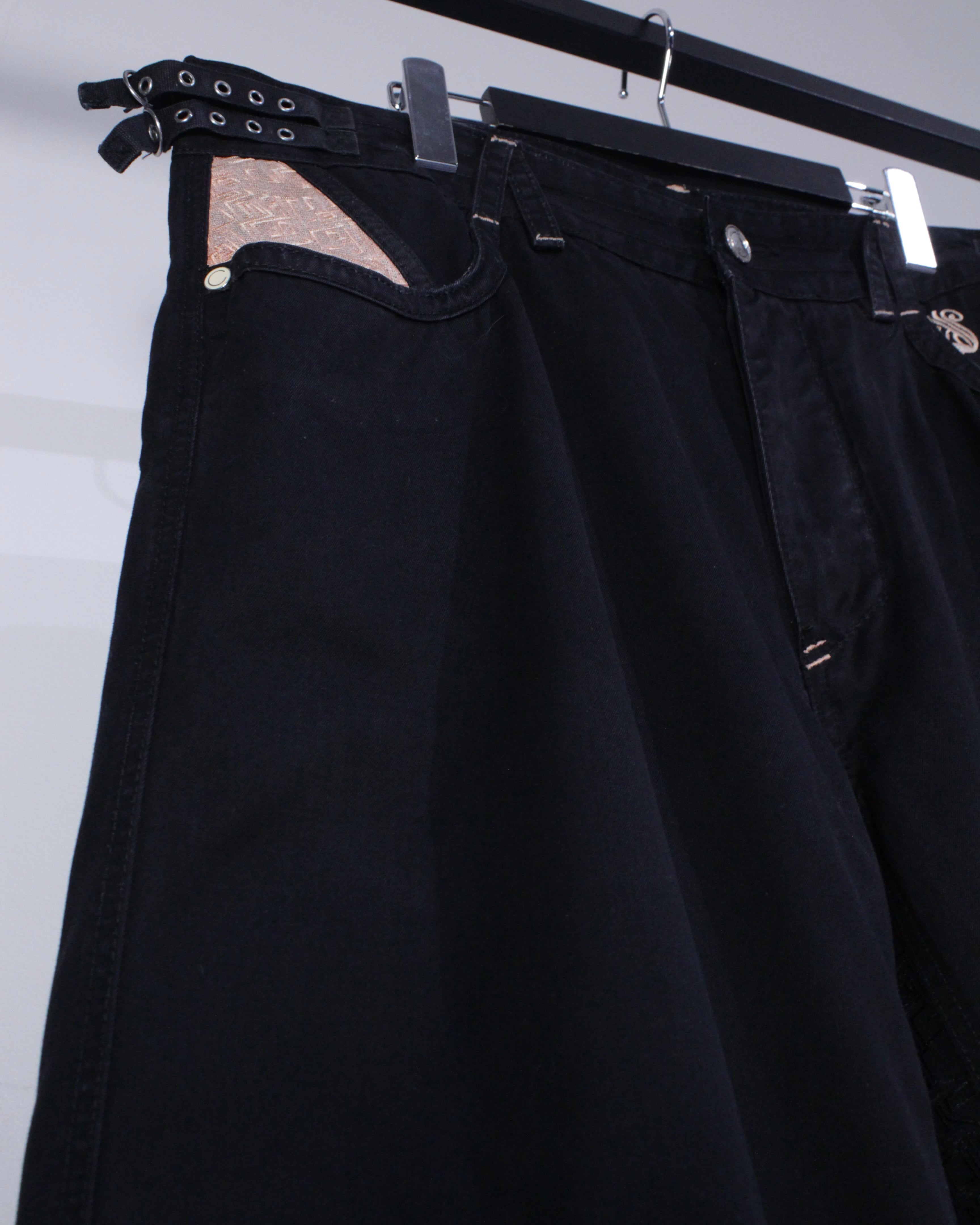 色残りがしっかりとあるブラックのデニムに、バックポケットやフロントのポケットにアーティスティックなデザインを刺繍で施した逸品。