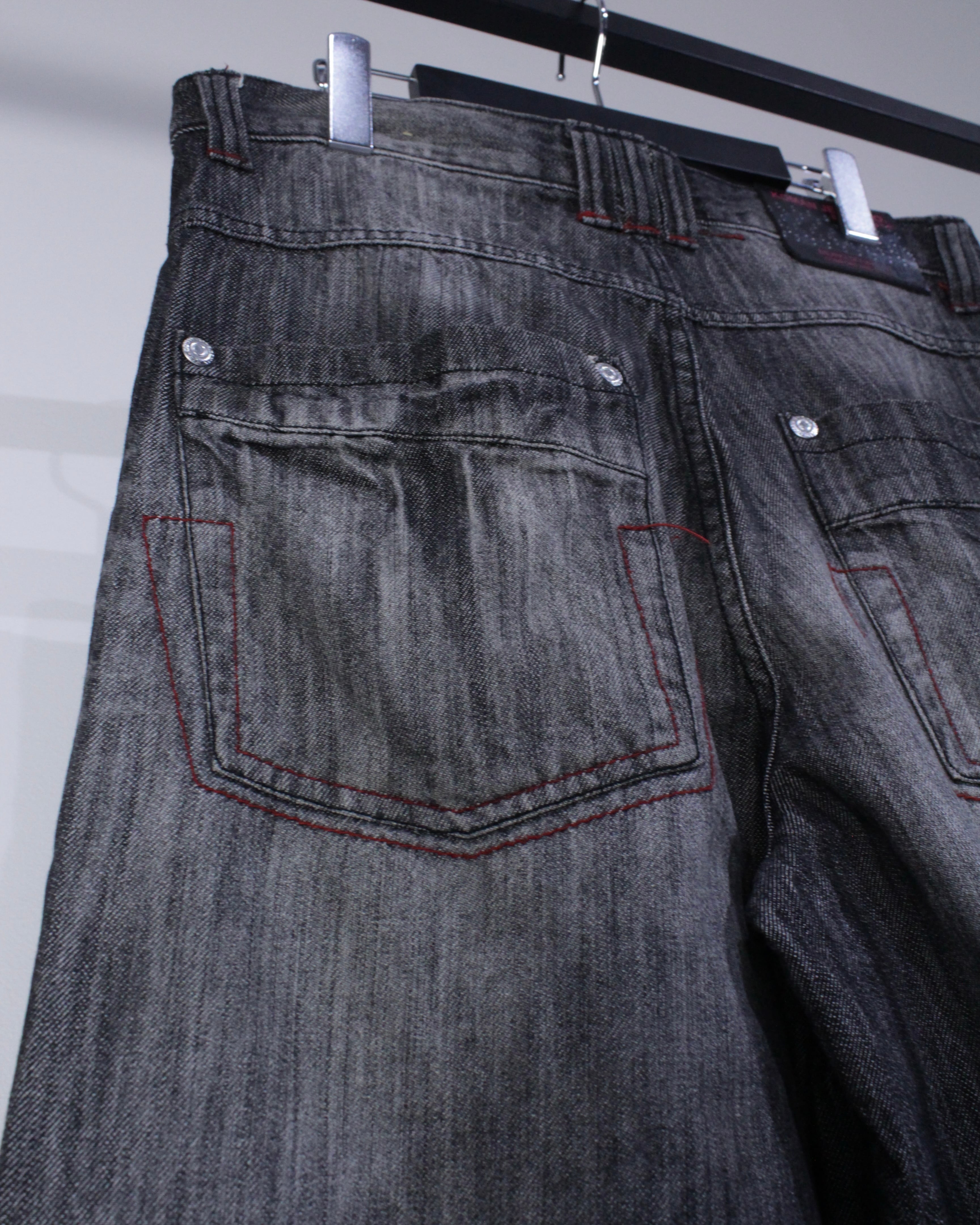 目を惹くフェード加工は言わずもがな、ボディ随所に施された赤色のステッチがデザインのアクセントに。ウエスト背面にはロゴパッチと細部に至る作り込みも抜かりなし。