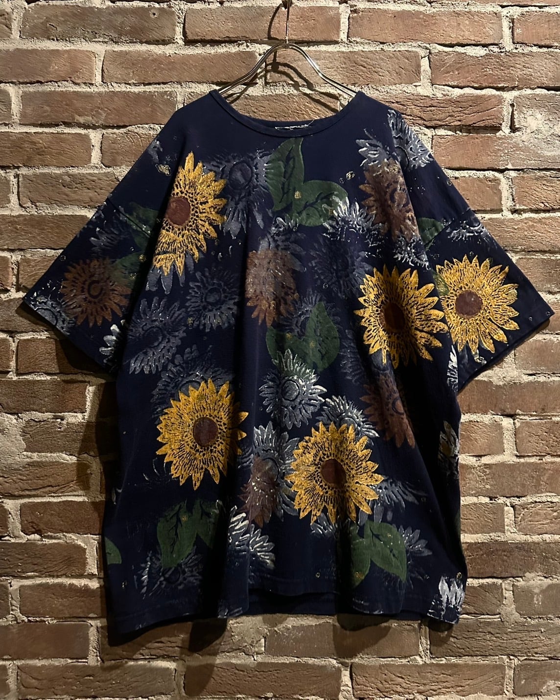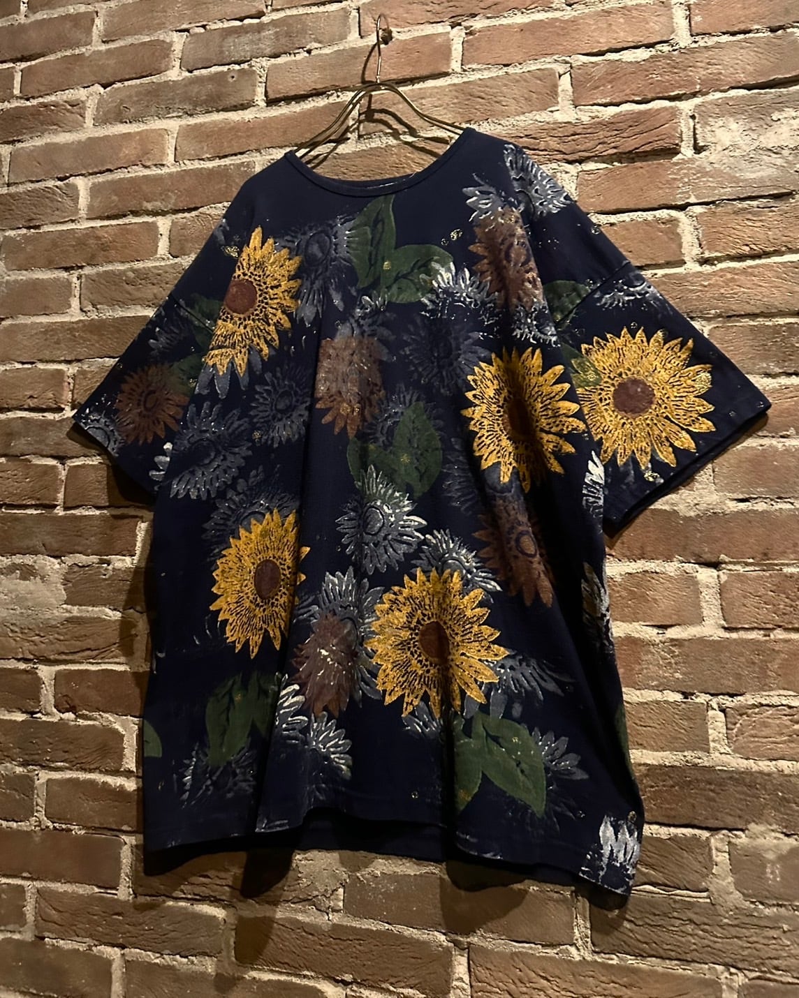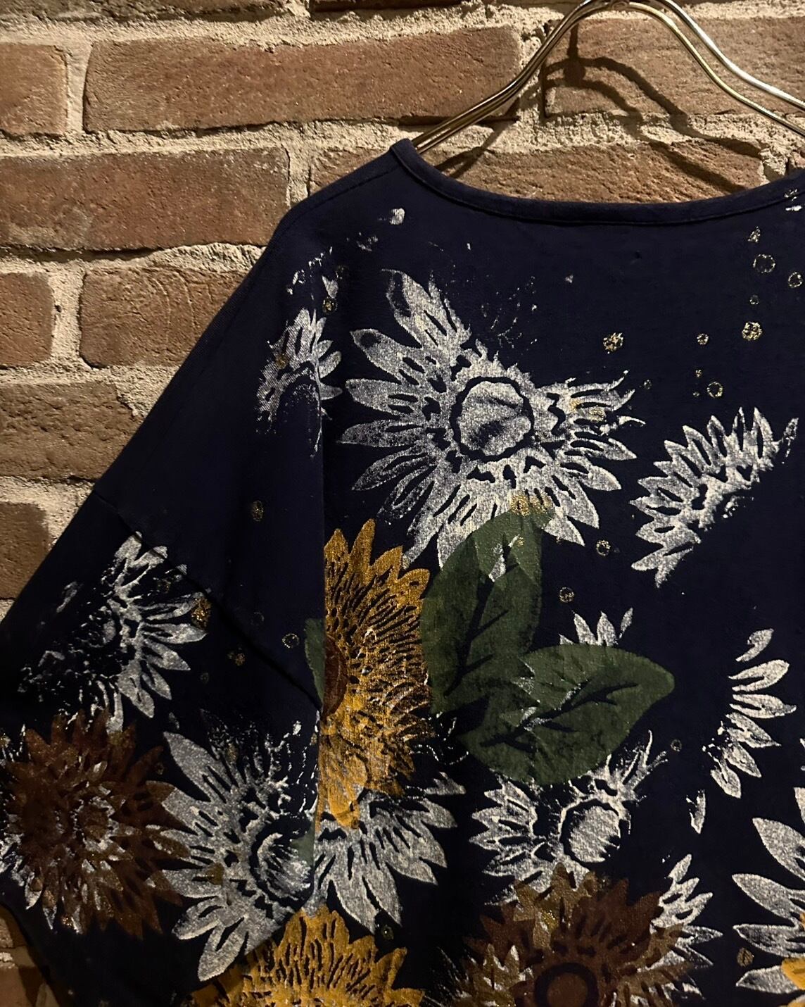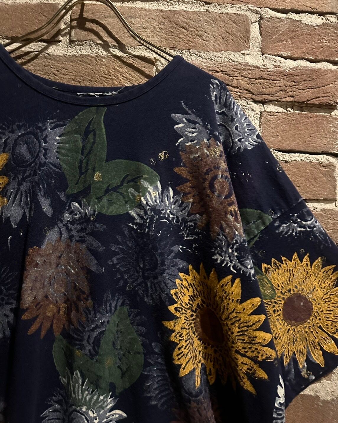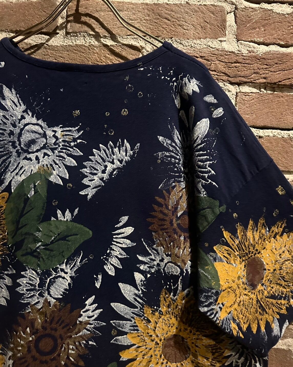 深いネイビーボディーにひまわりの花を手描きのペイントによって全面に配したTシャツ。