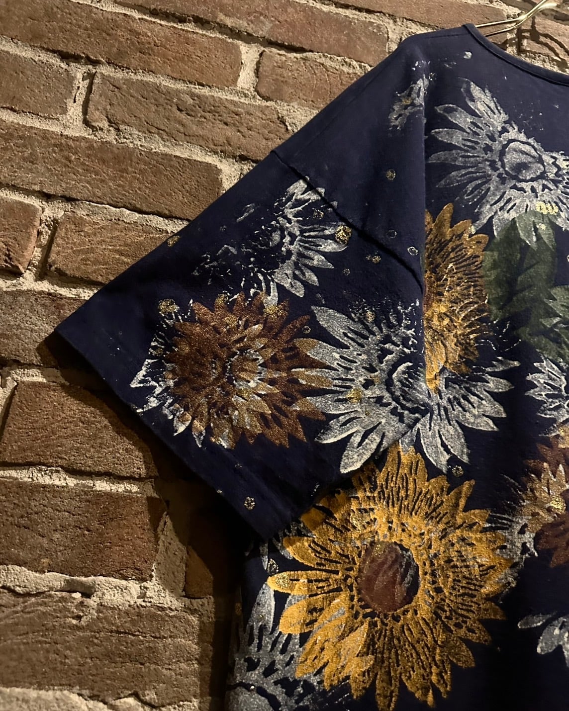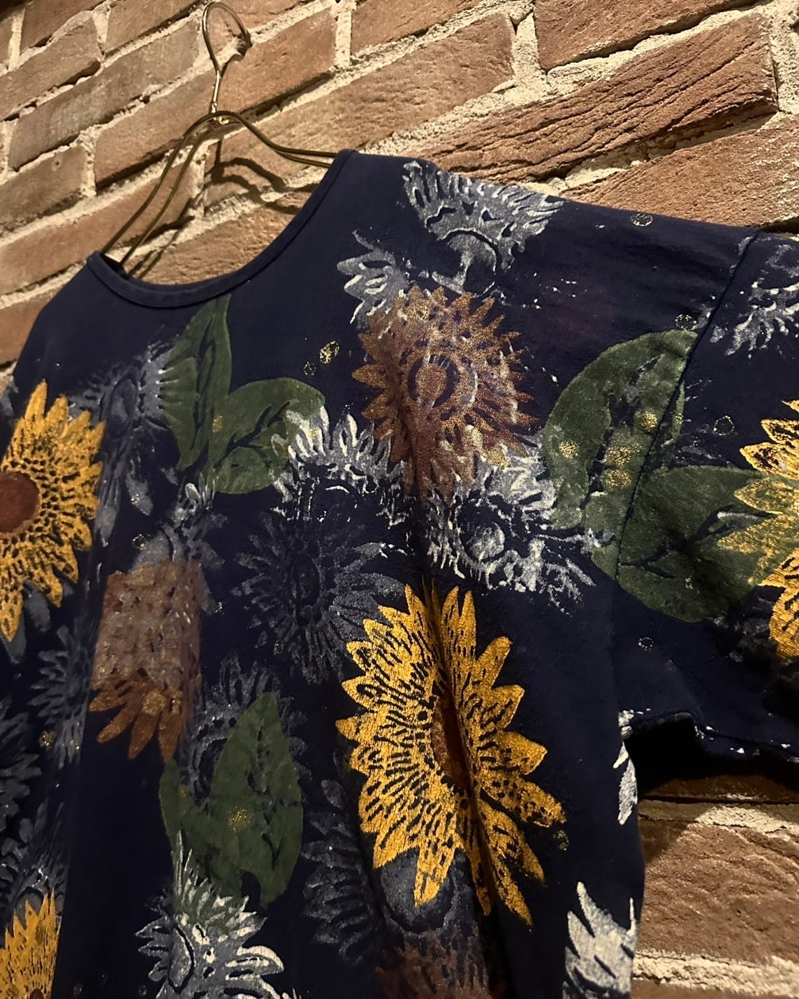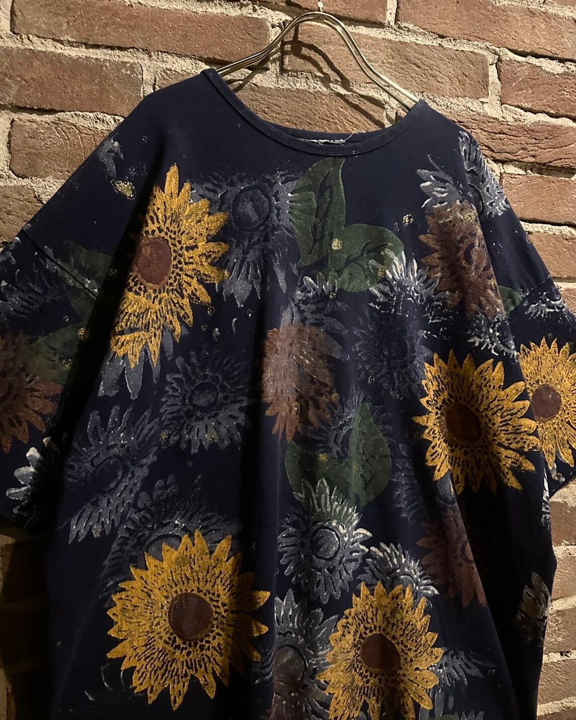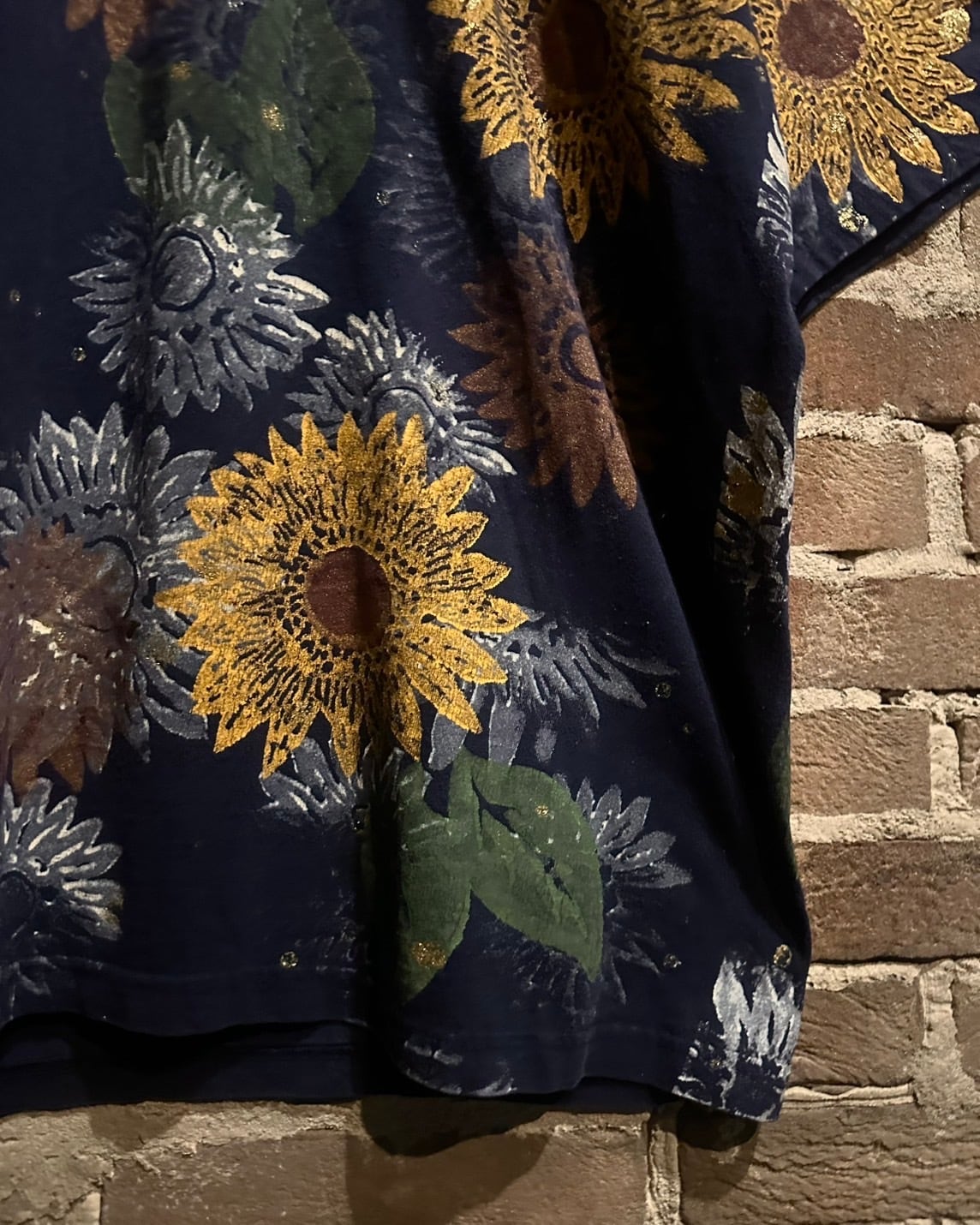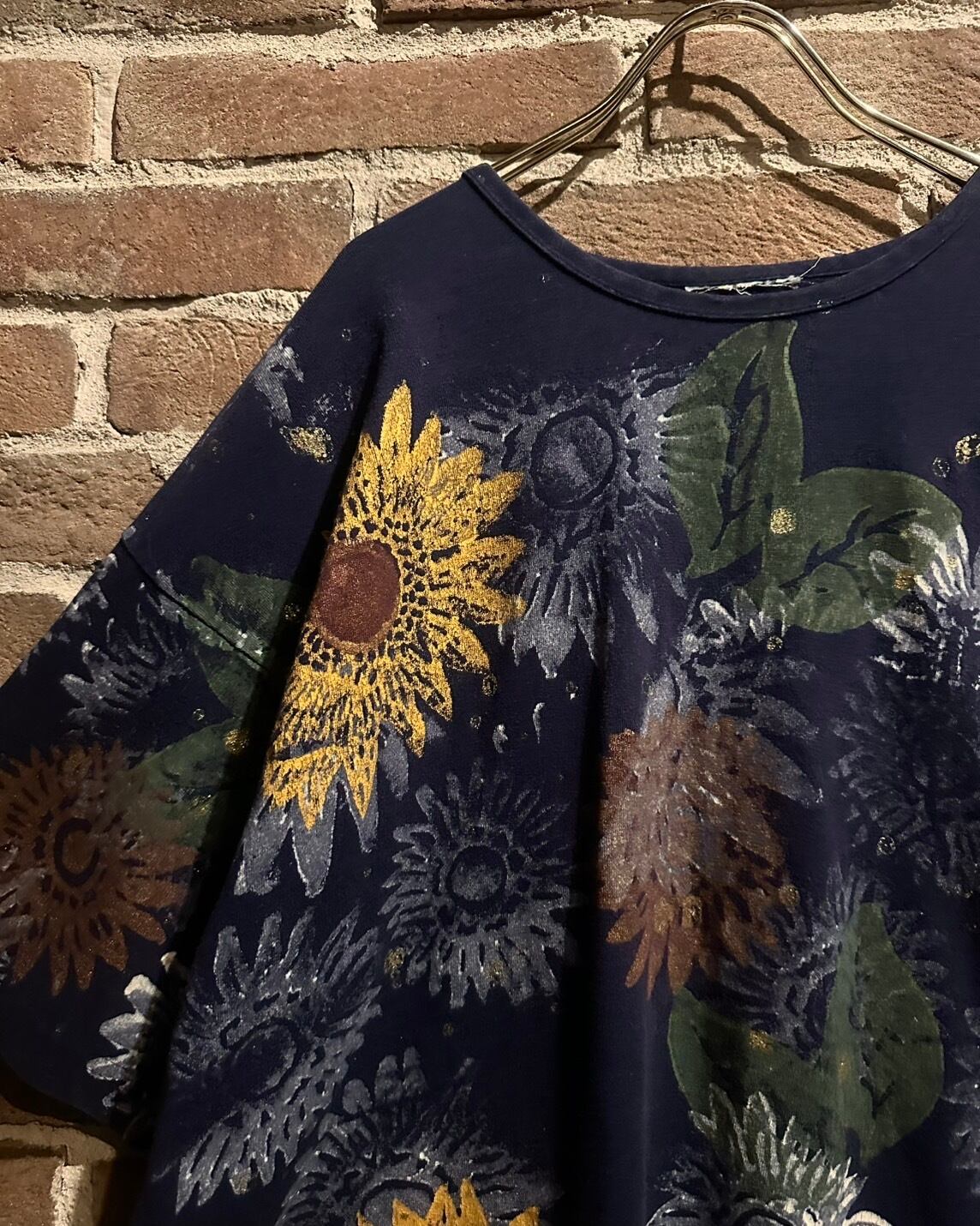 深いネイビーボディーにひまわりの花を手描きのペイントによって全面に配したTシャツ。