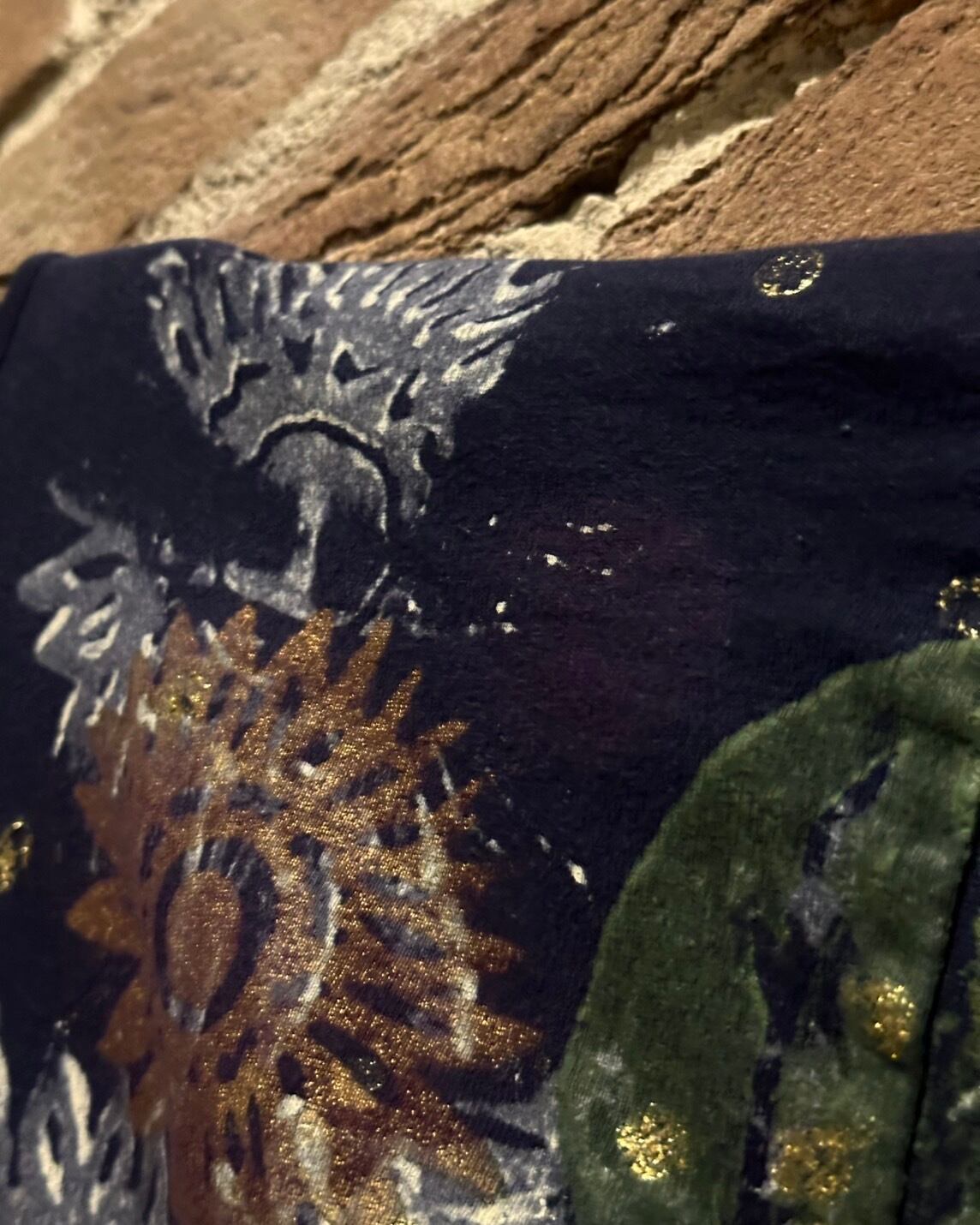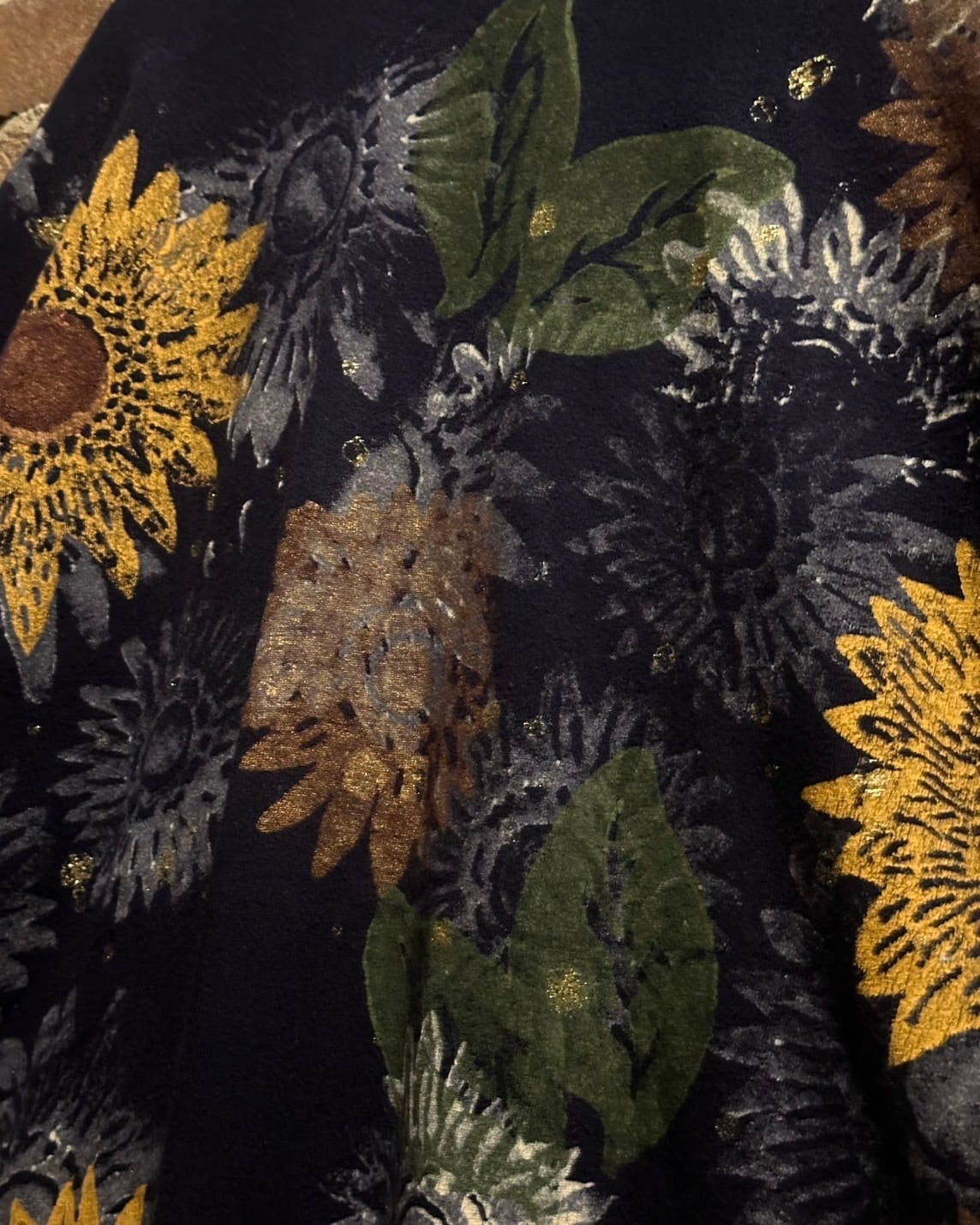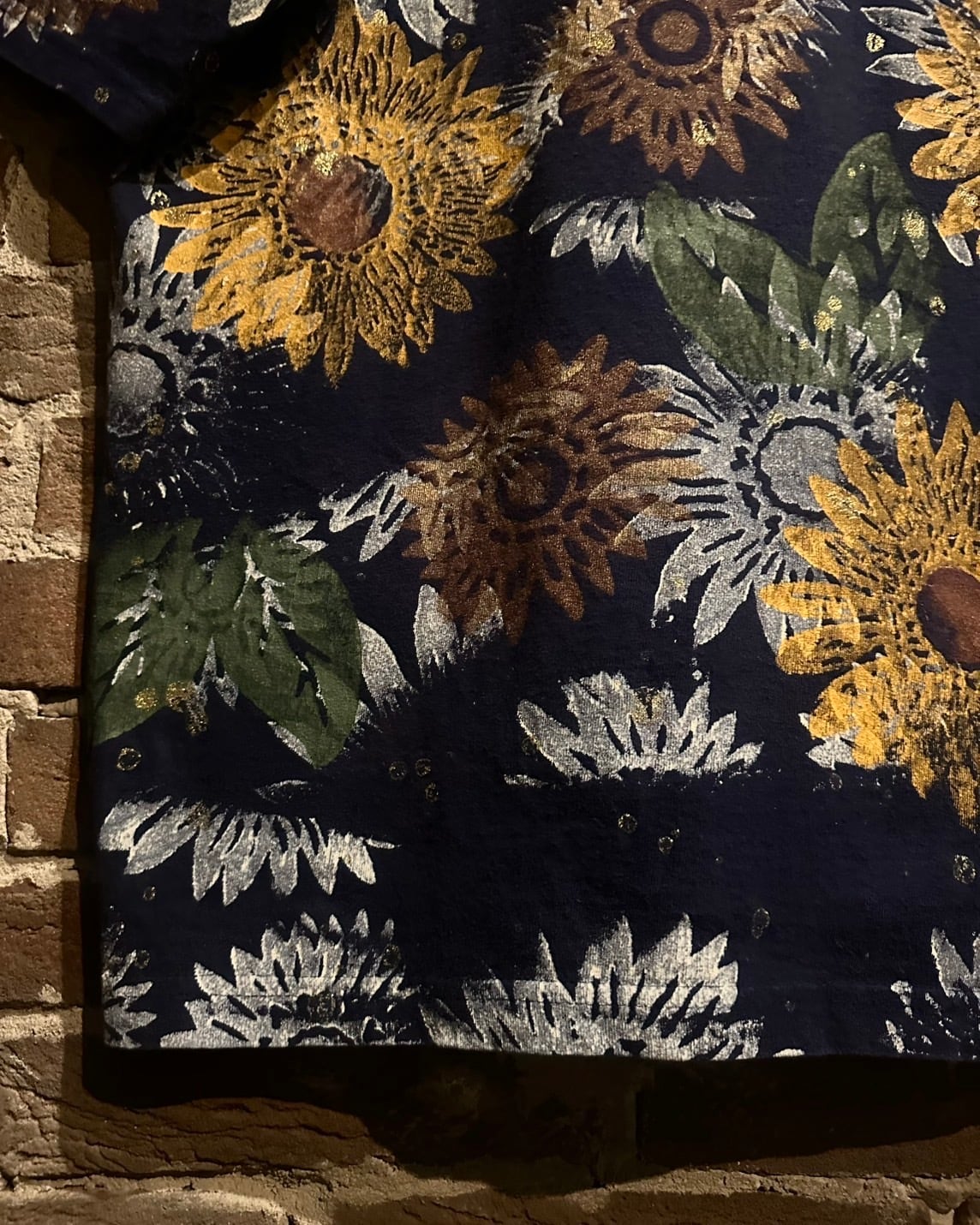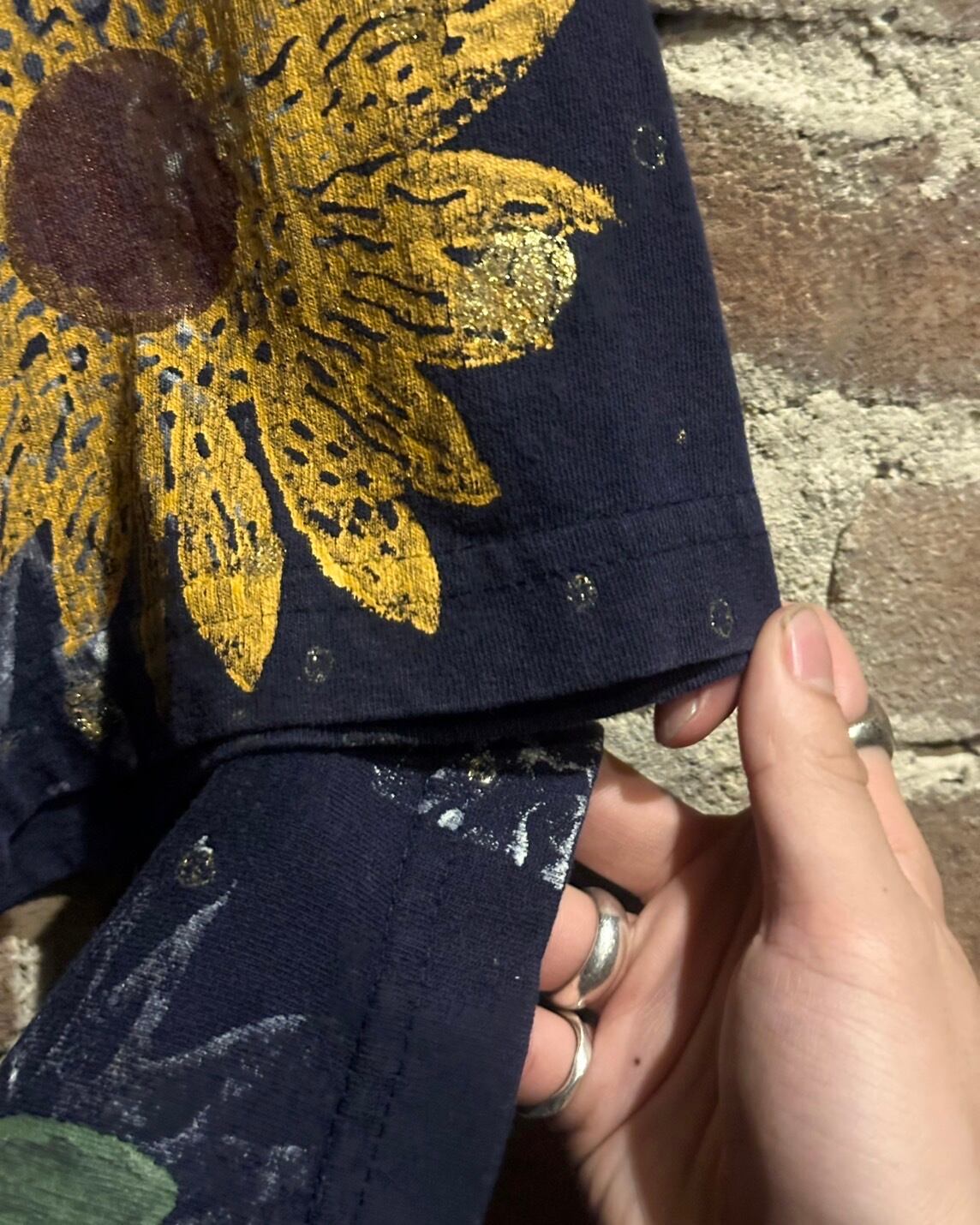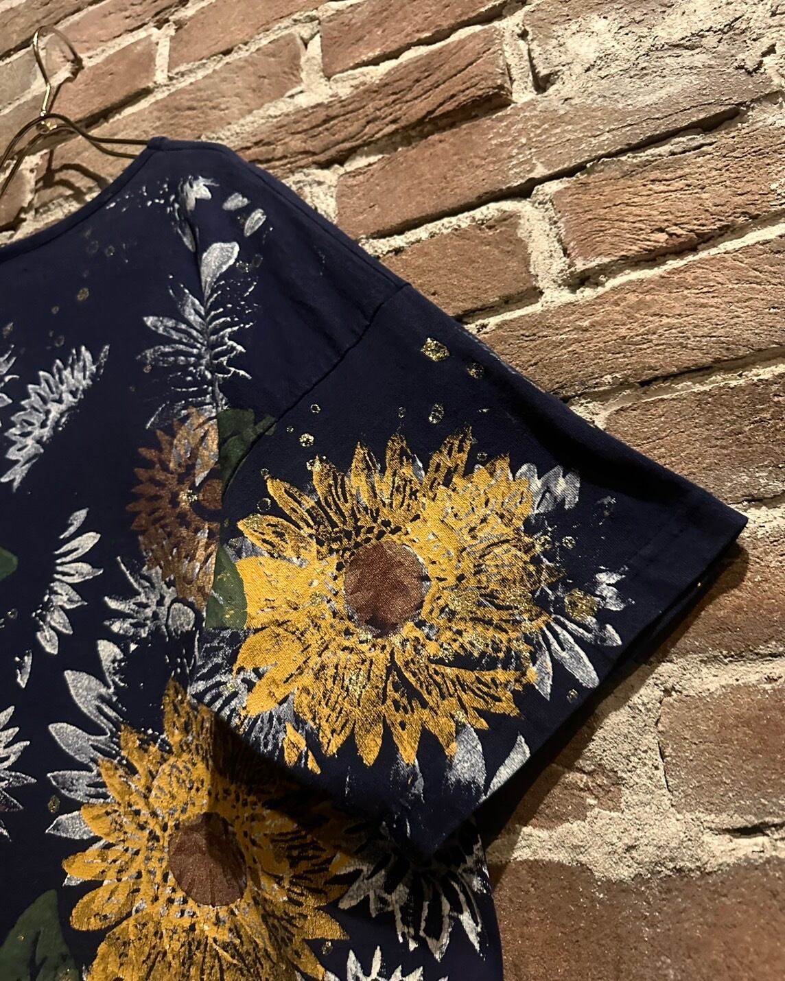 深いネイビーボディーにひまわりの花を手描きのペイントによって全面に配したTシャツ。