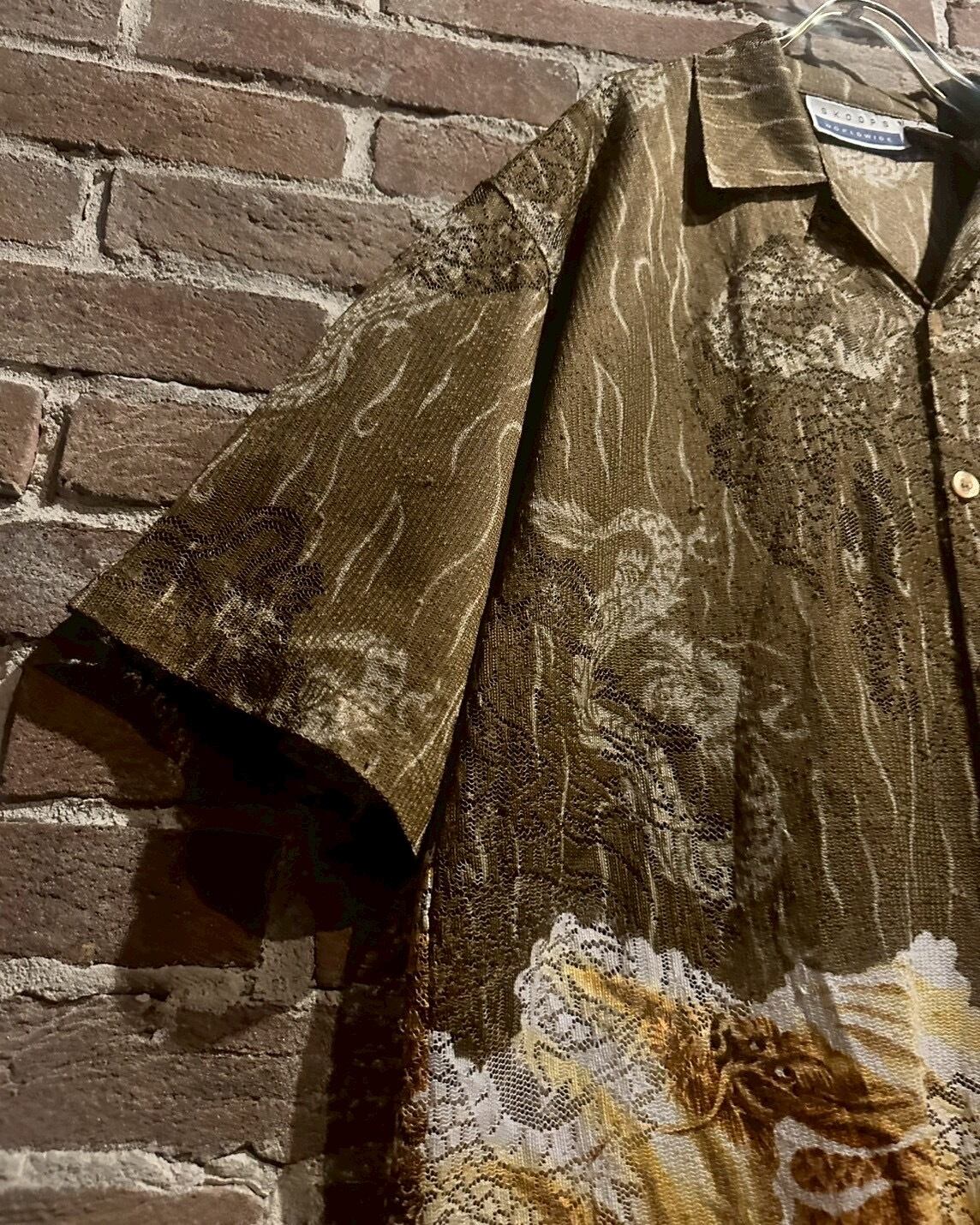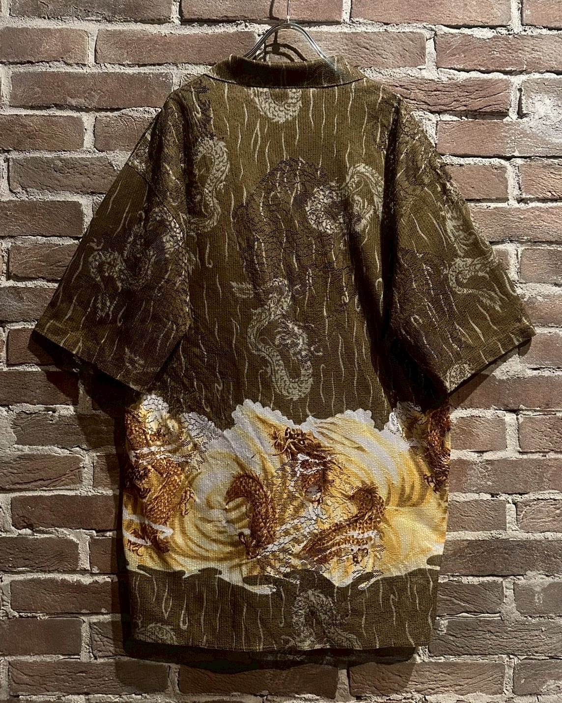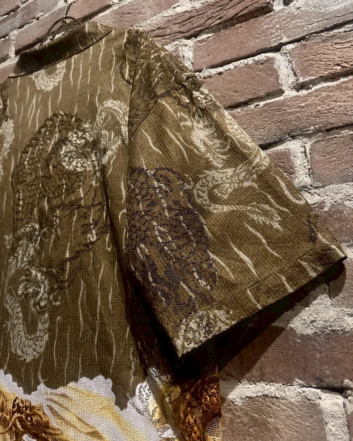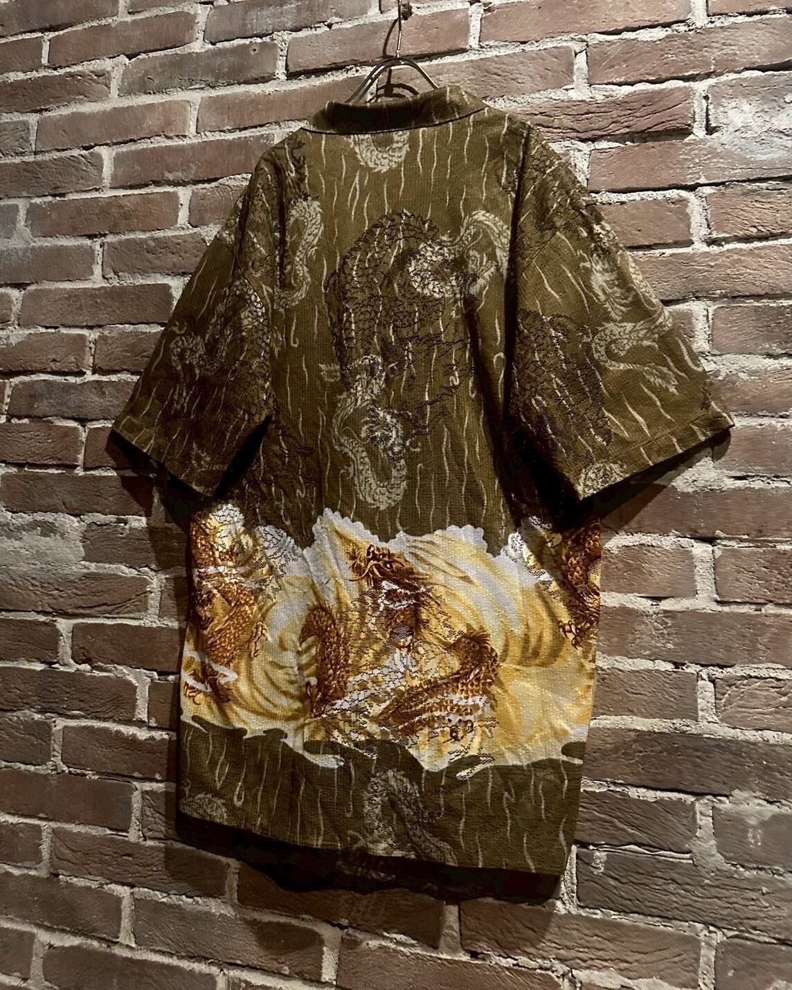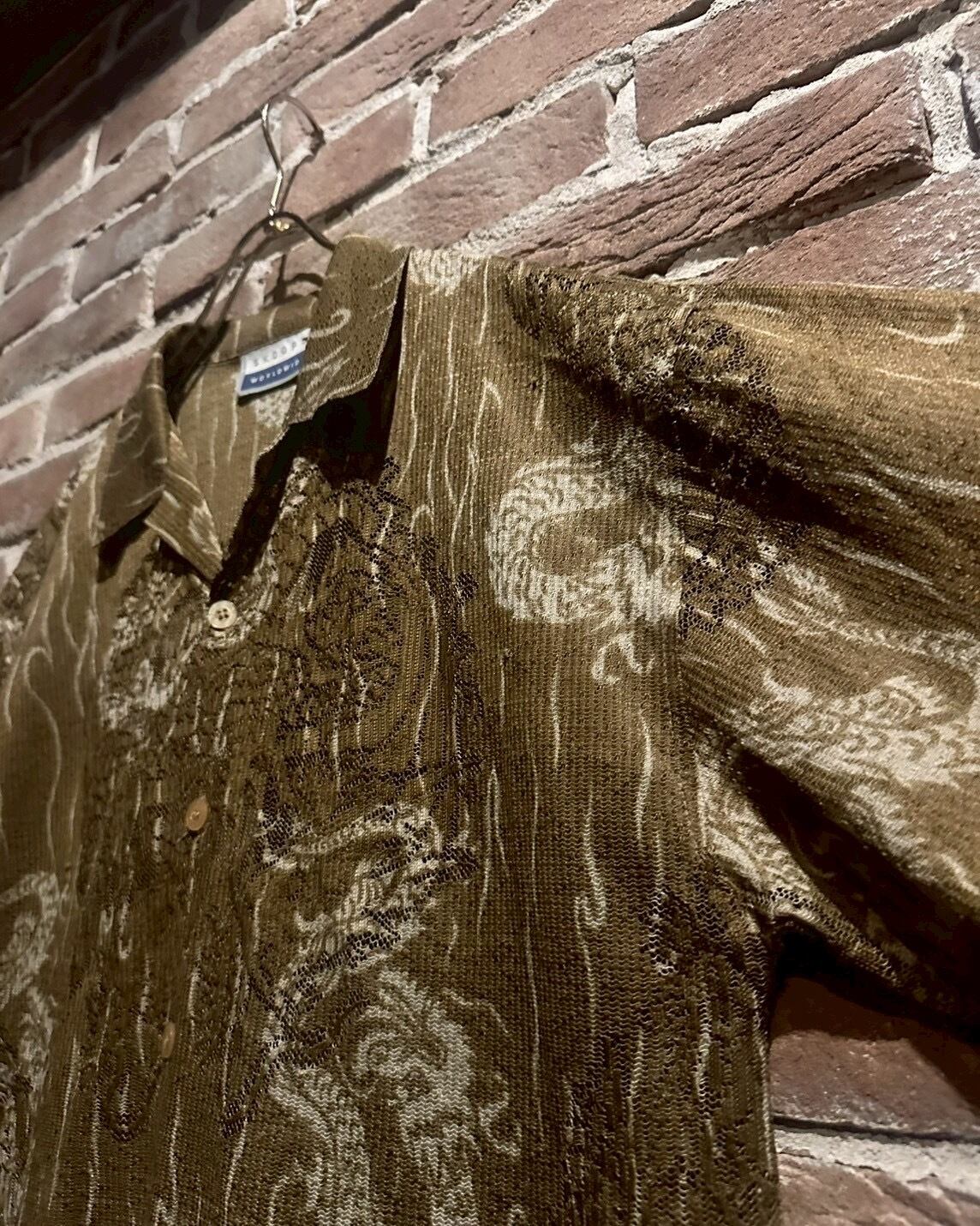 通気性が良く、着心地軽やかなメッシュ素材を用いたボディに、龍のデザインを載せた半袖オープンカラーシャツ。