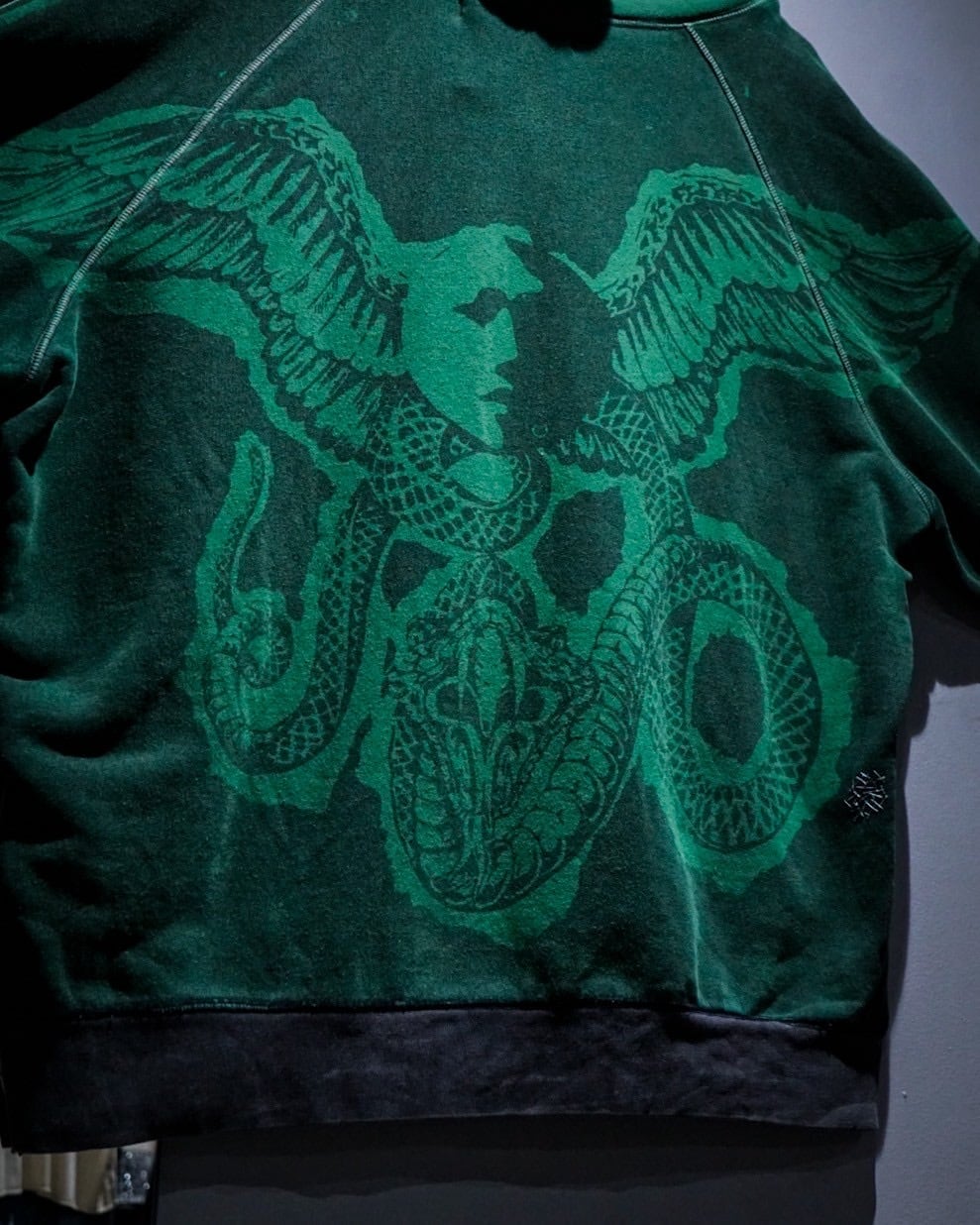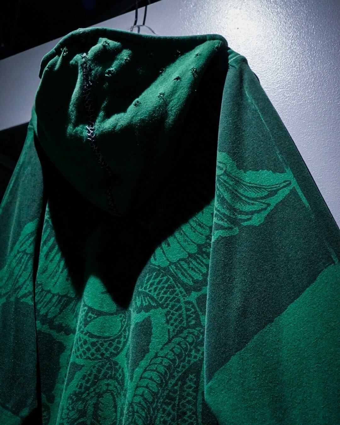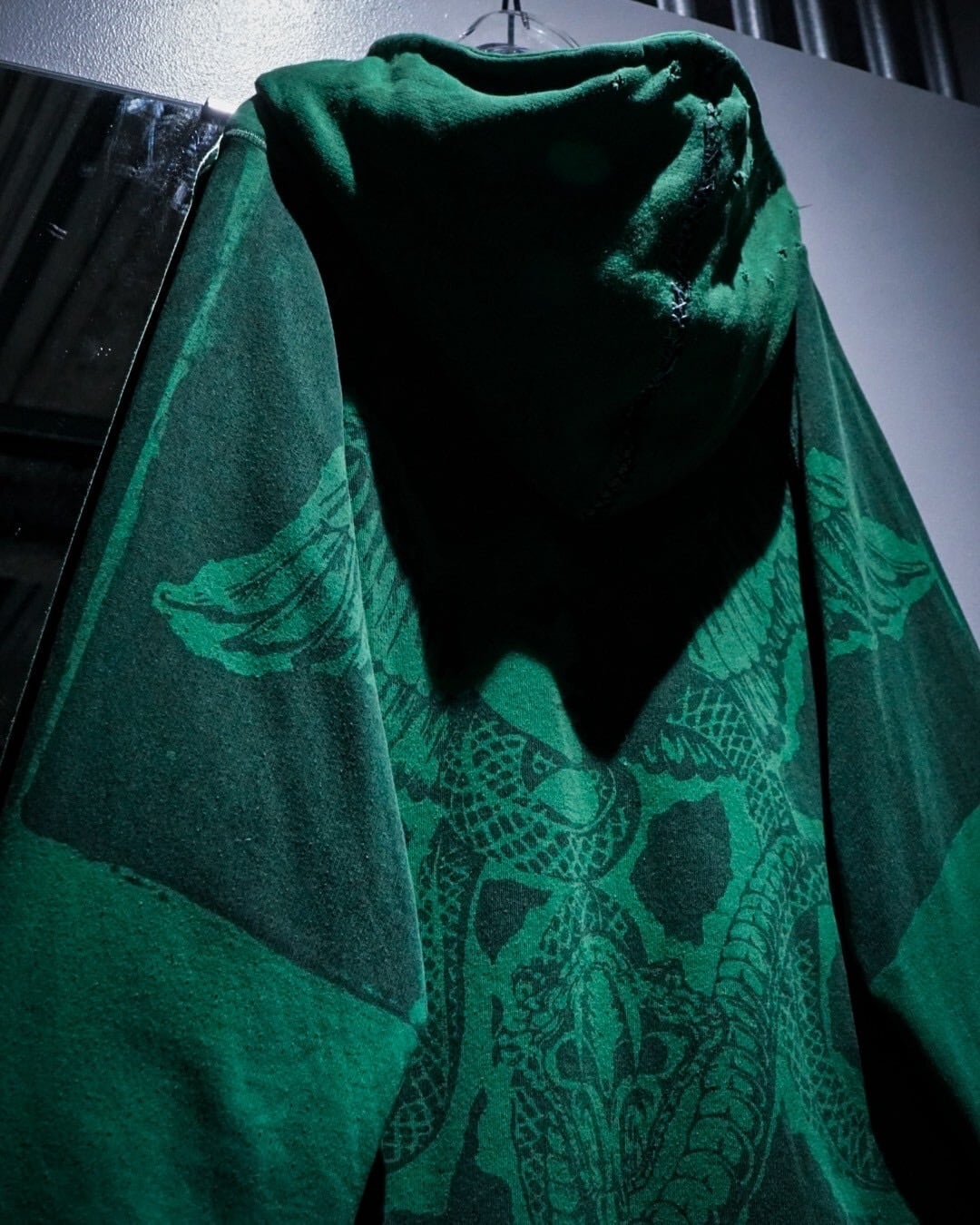 トーンの異なるグリーンでボーダーを表現したボディに、フロントにブランドネームを、背面にコブラなど荘厳な雰囲気を放つグラフィックを載せたプルオーバーフーディ。