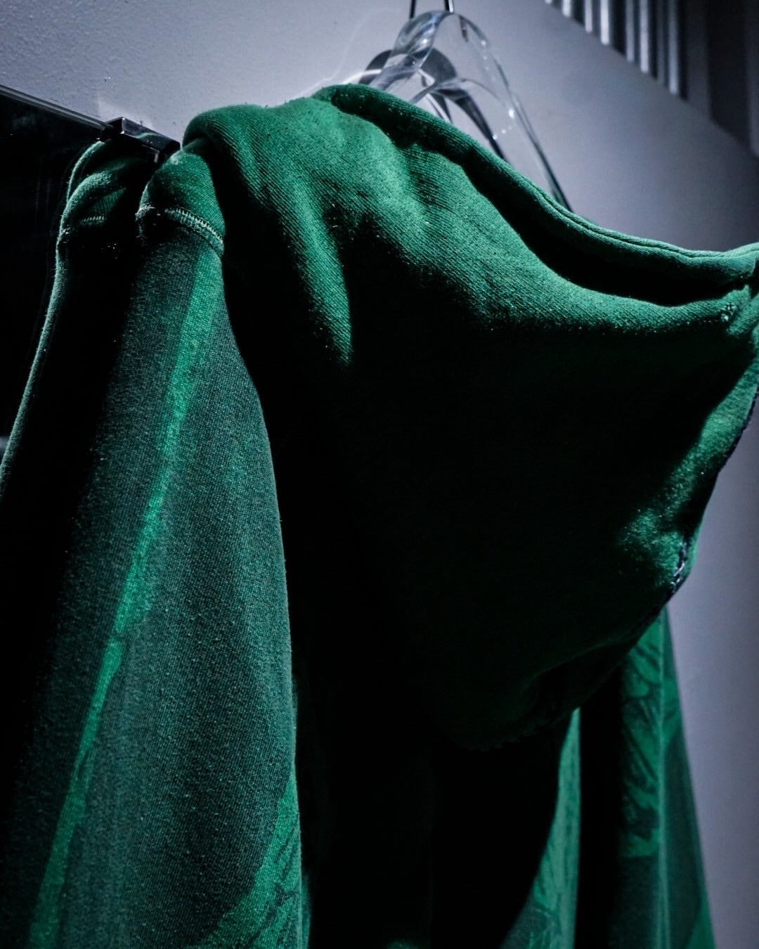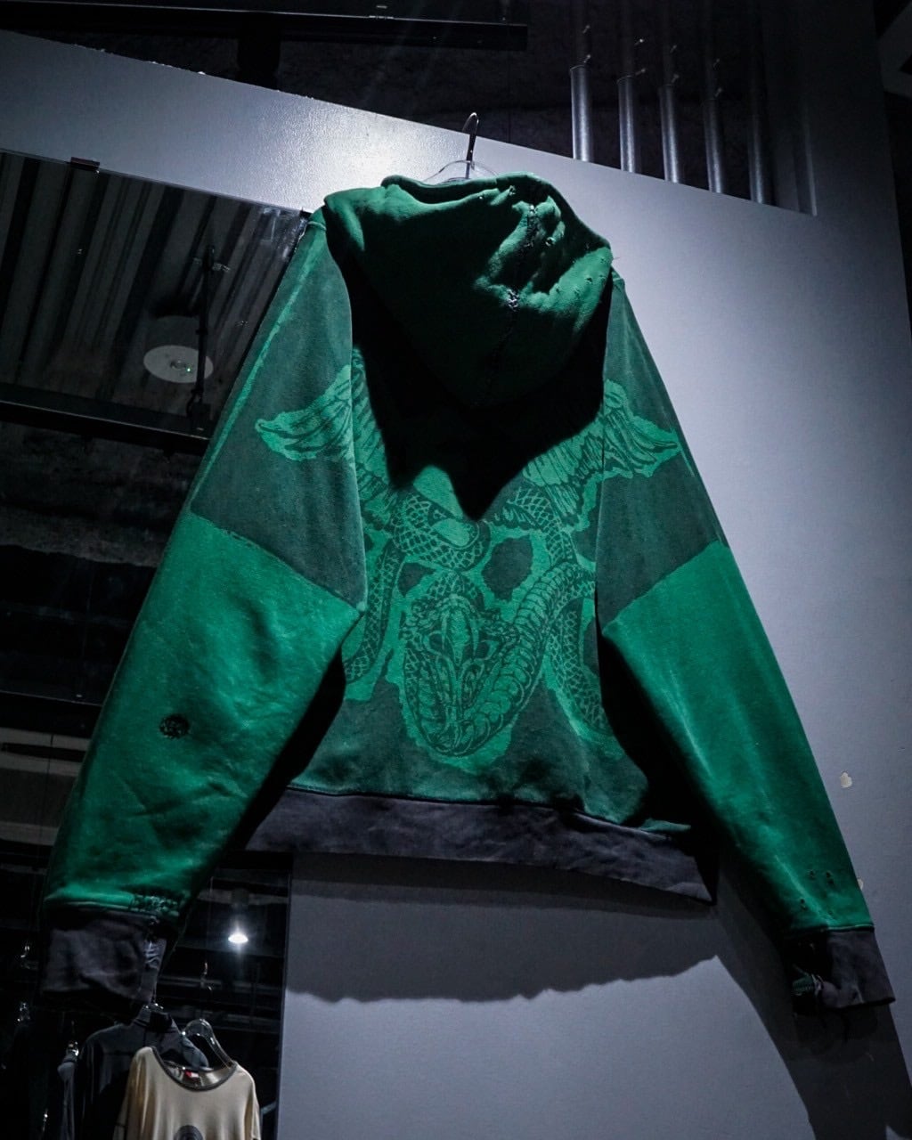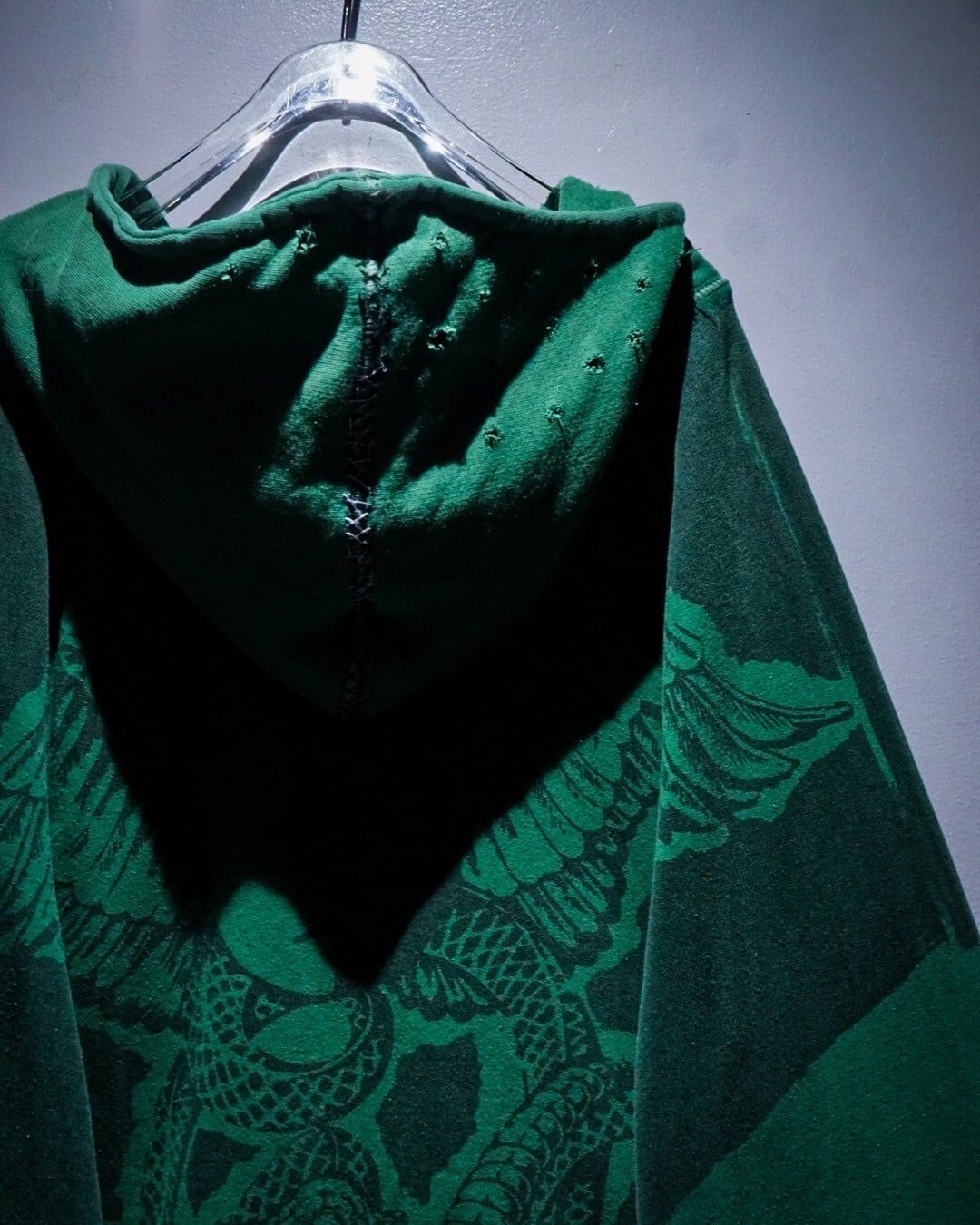 トーンの異なるグリーンでボーダーを表現したボディに、フロントにブランドネームを、背面にコブラなど荘厳な雰囲気を放つグラフィックを載せたプルオーバーフーディ。