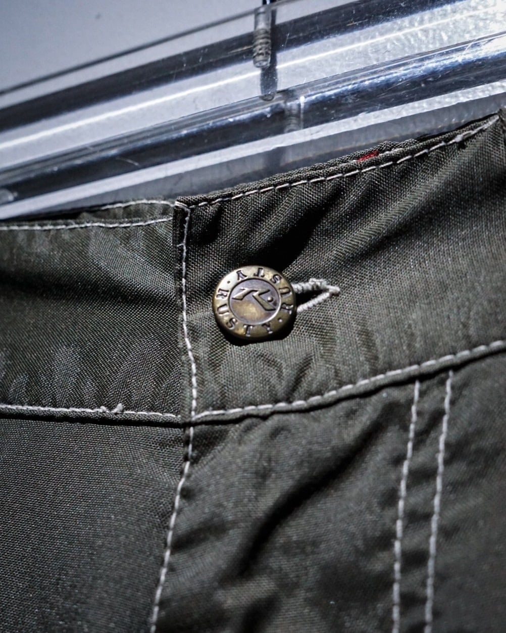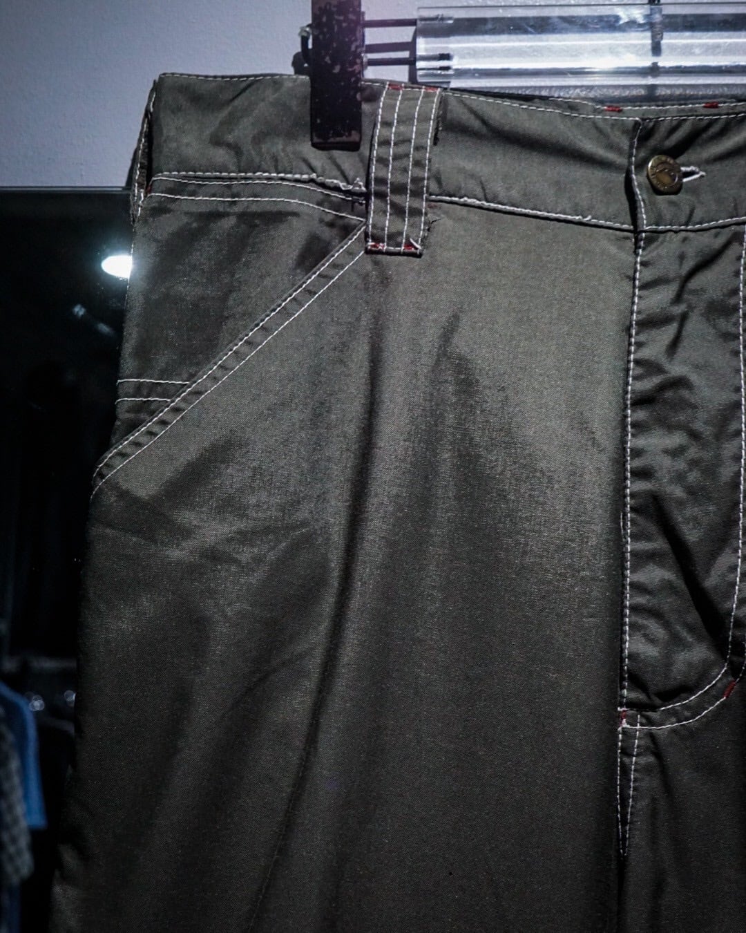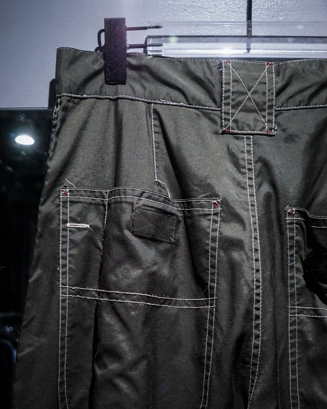 ハリのあるナイロンを用いたボディに、裾にリブの効いた生地を切り替えたナイロンパンツ。