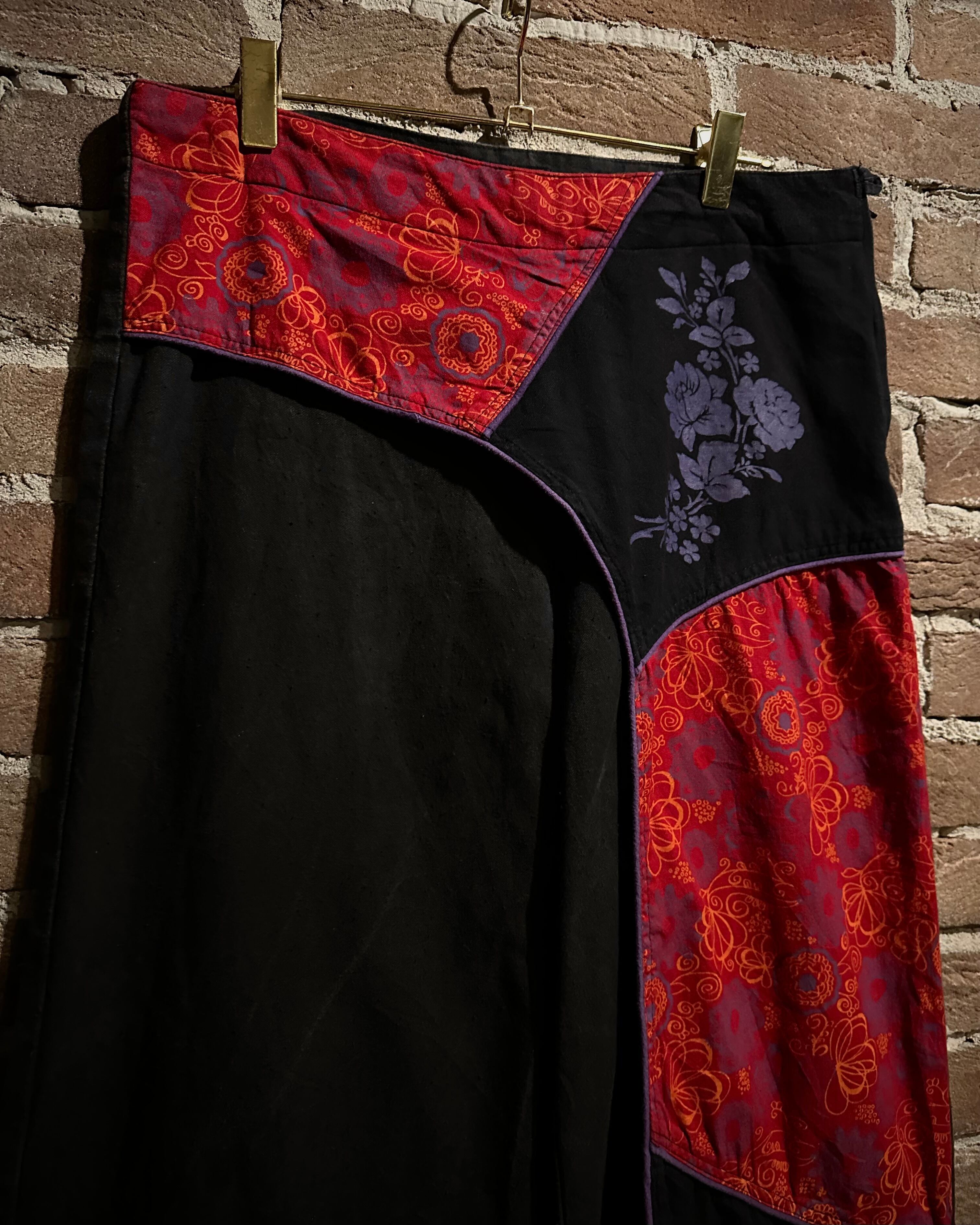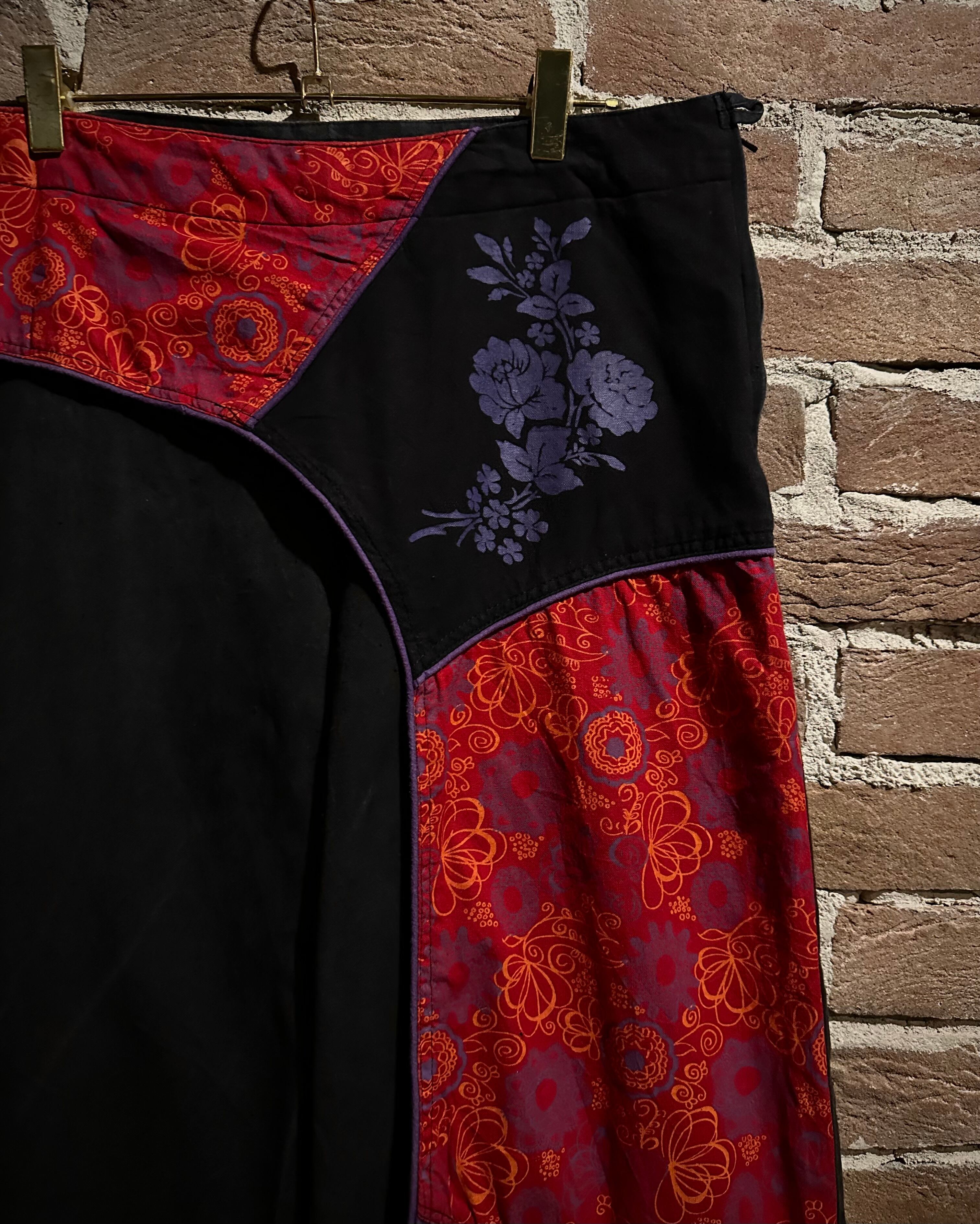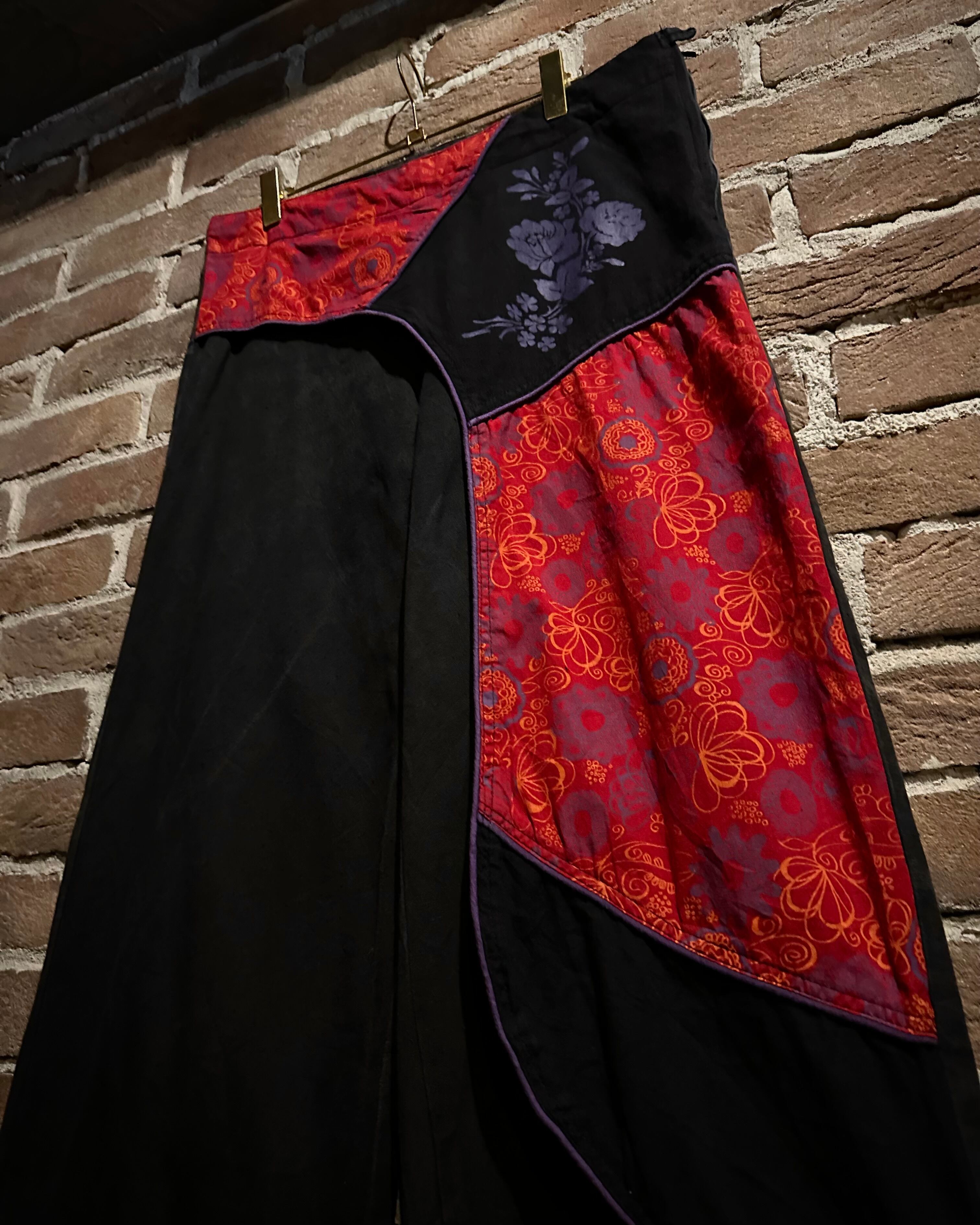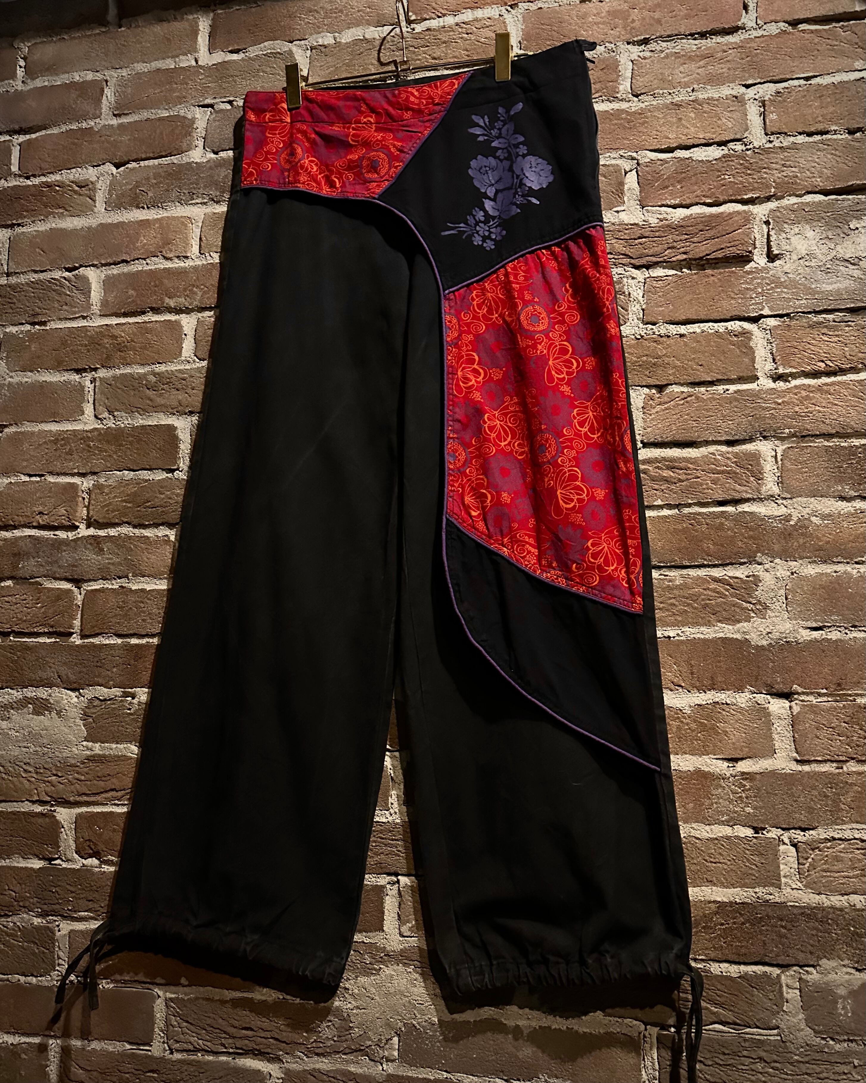 ブラックのボディをベースに、フロントウエストから左足にかけて花柄を載せたテキスタイルを重ねた、レイヤード風のデザインに仕上げたワイドパンツ。