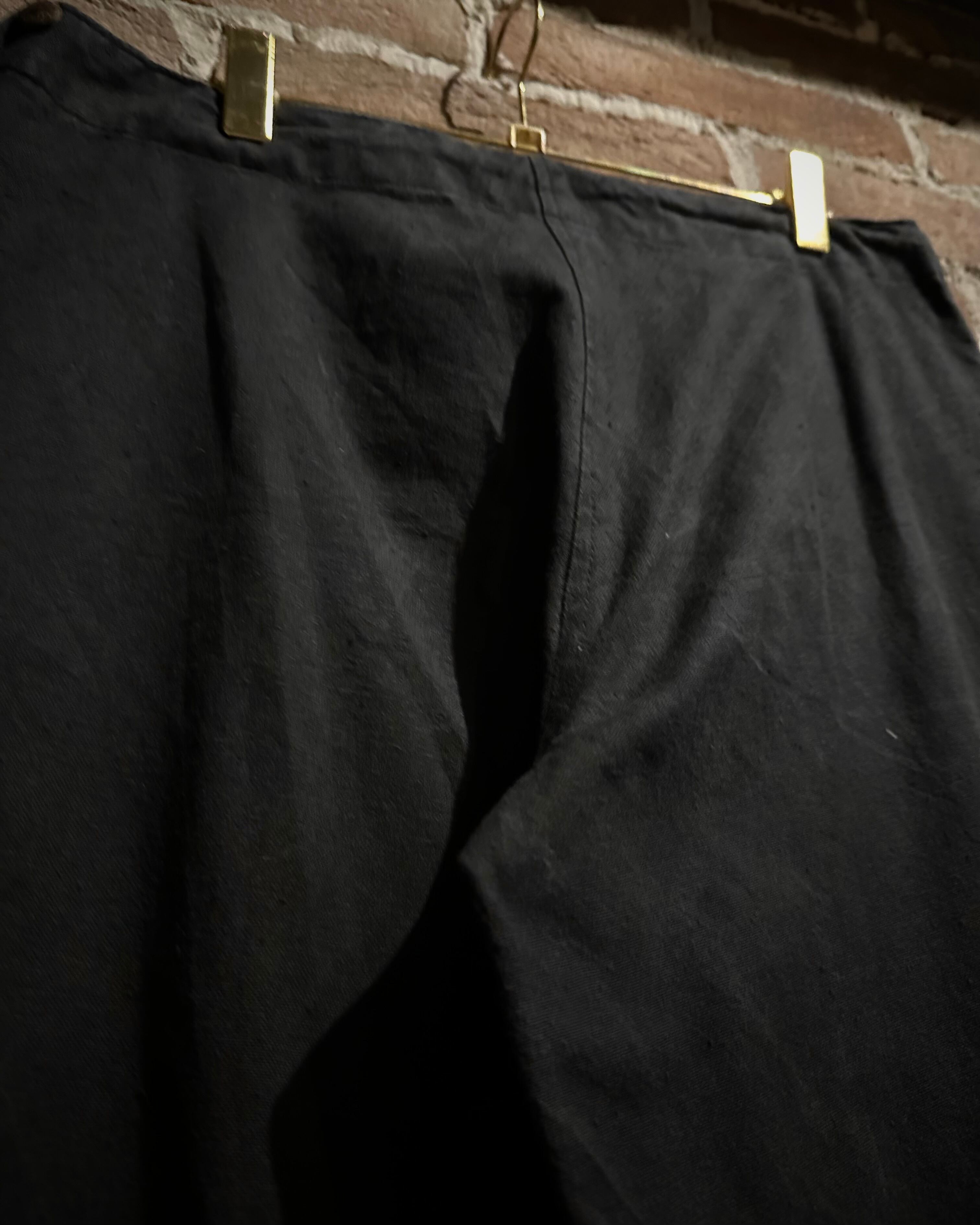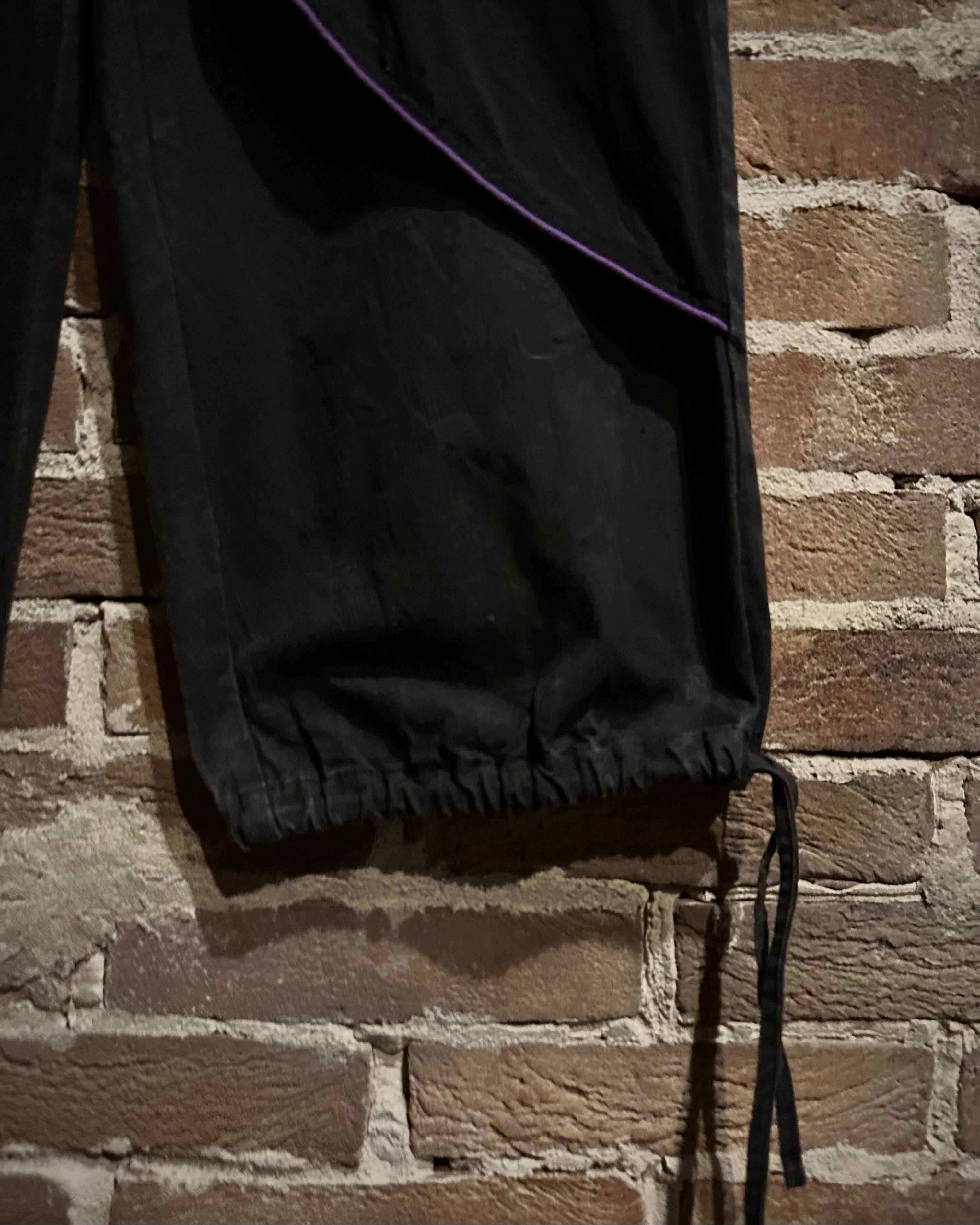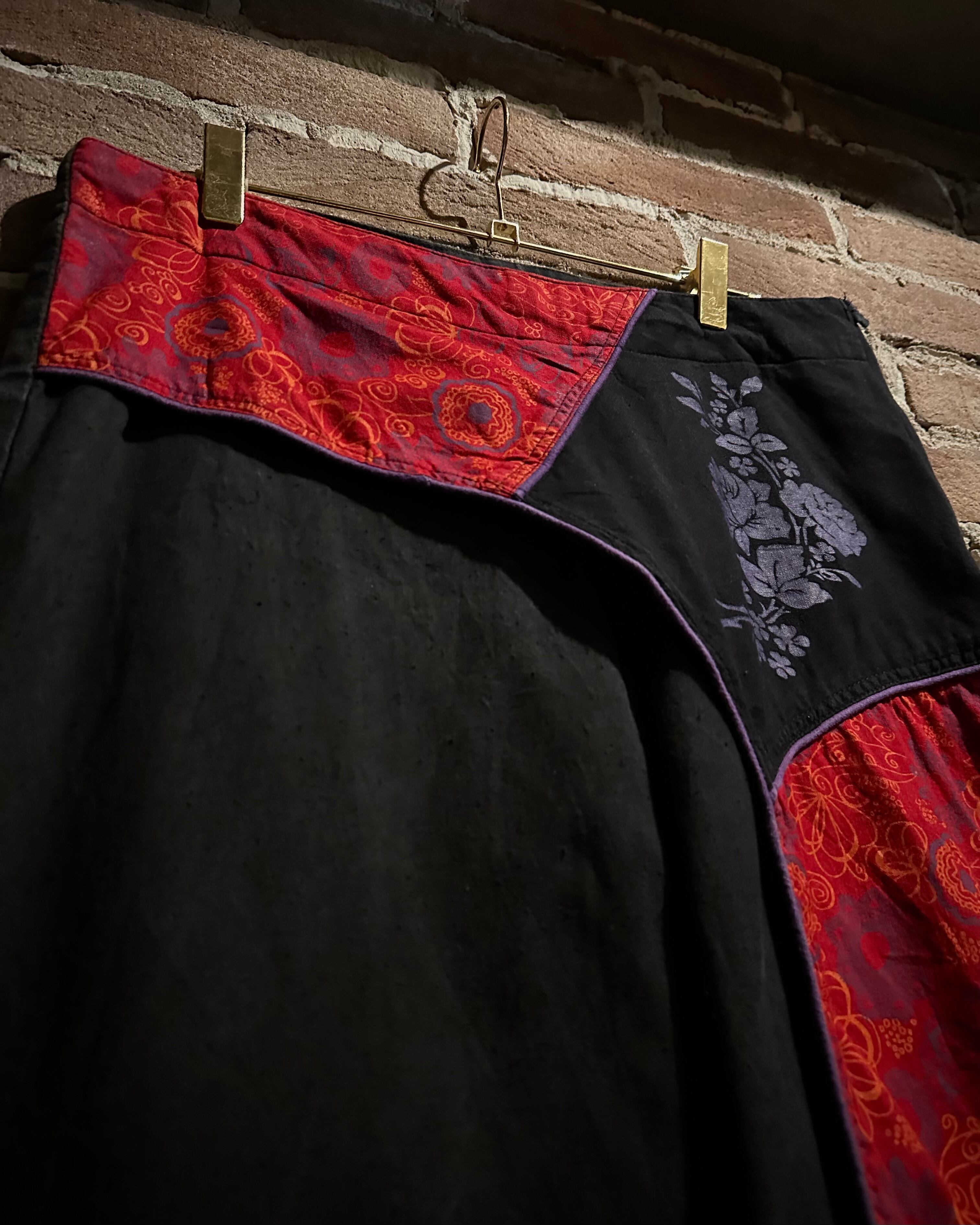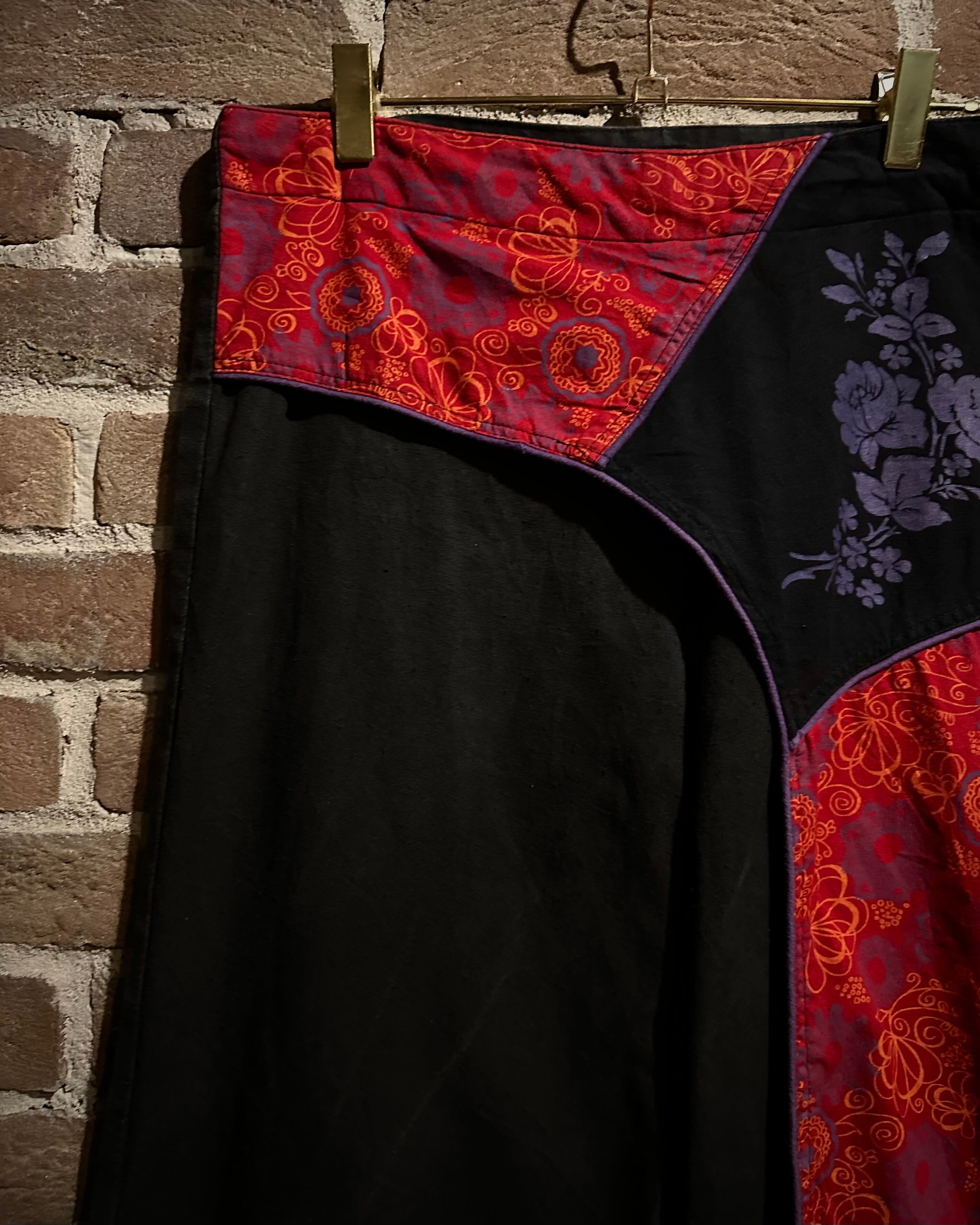 ブラックのボディをベースに、フロントウエストから左足にかけて花柄を載せたテキスタイルを重ねた、レイヤード風のデザインに仕上げたワイドパンツ。