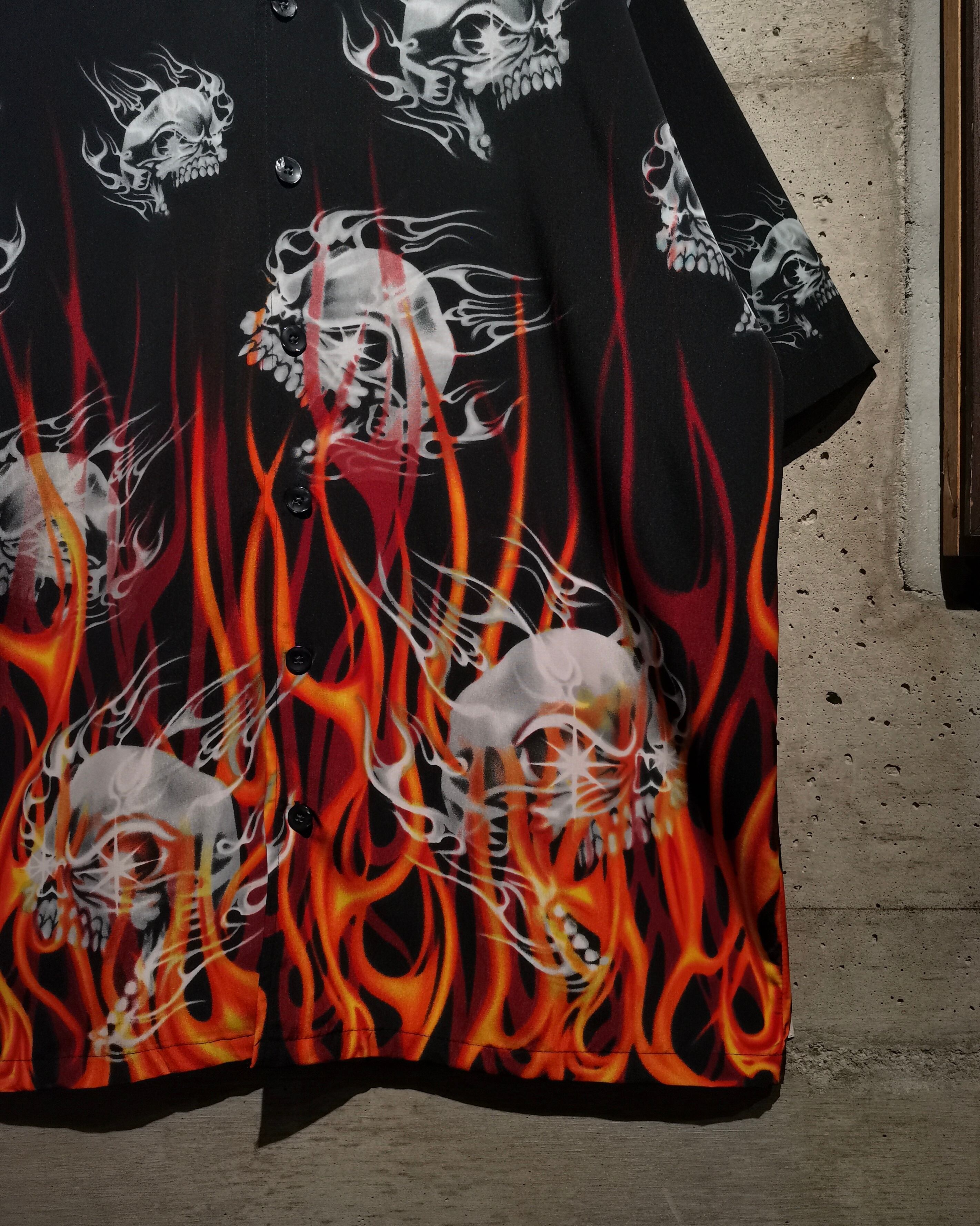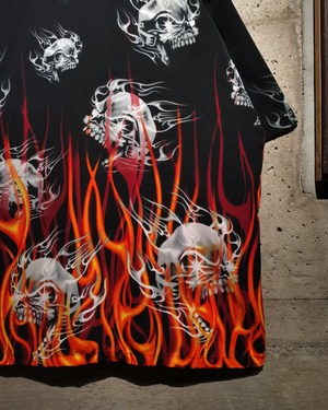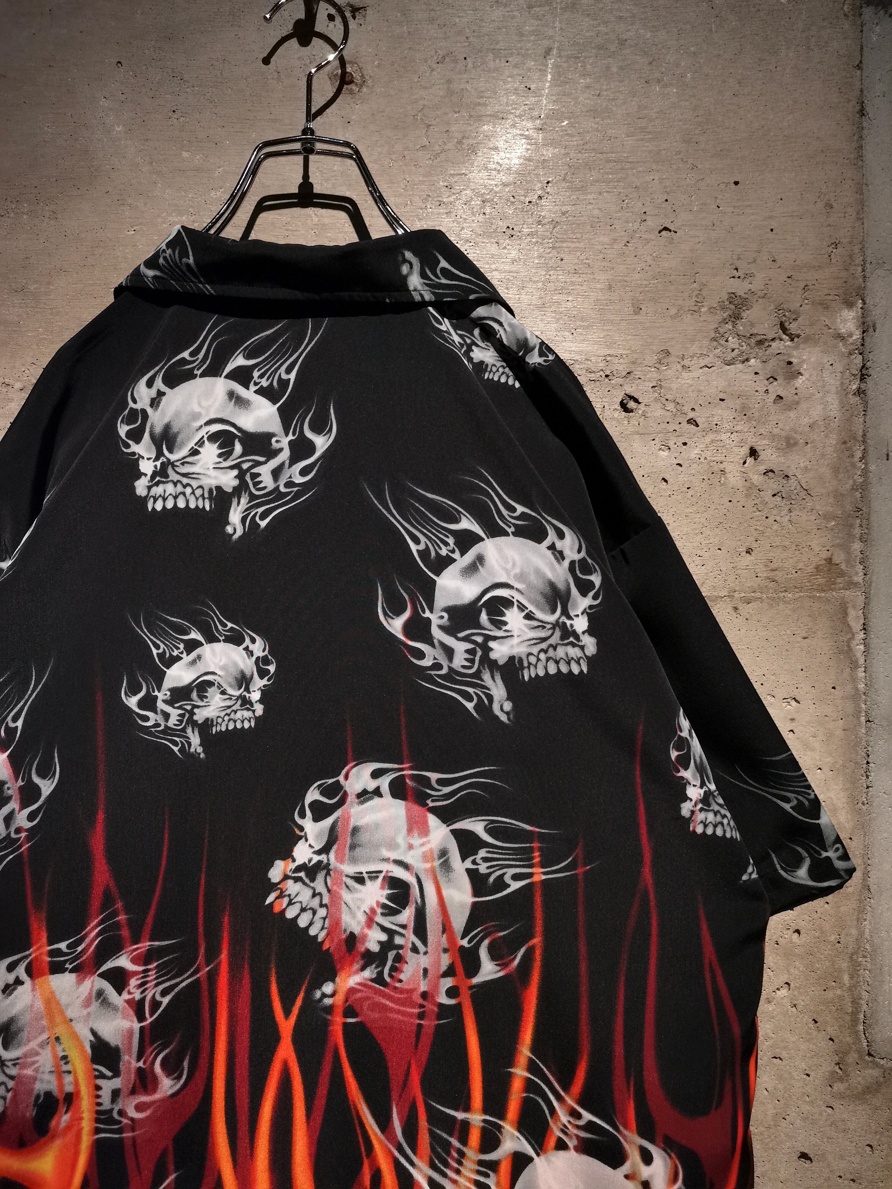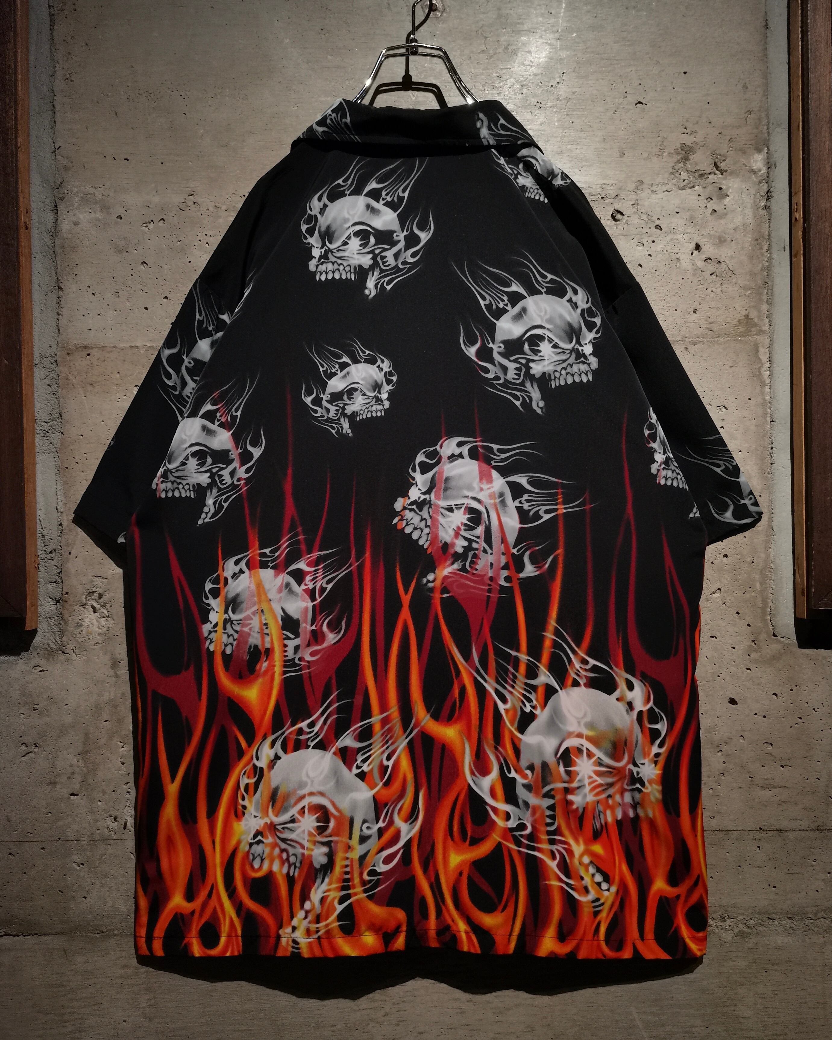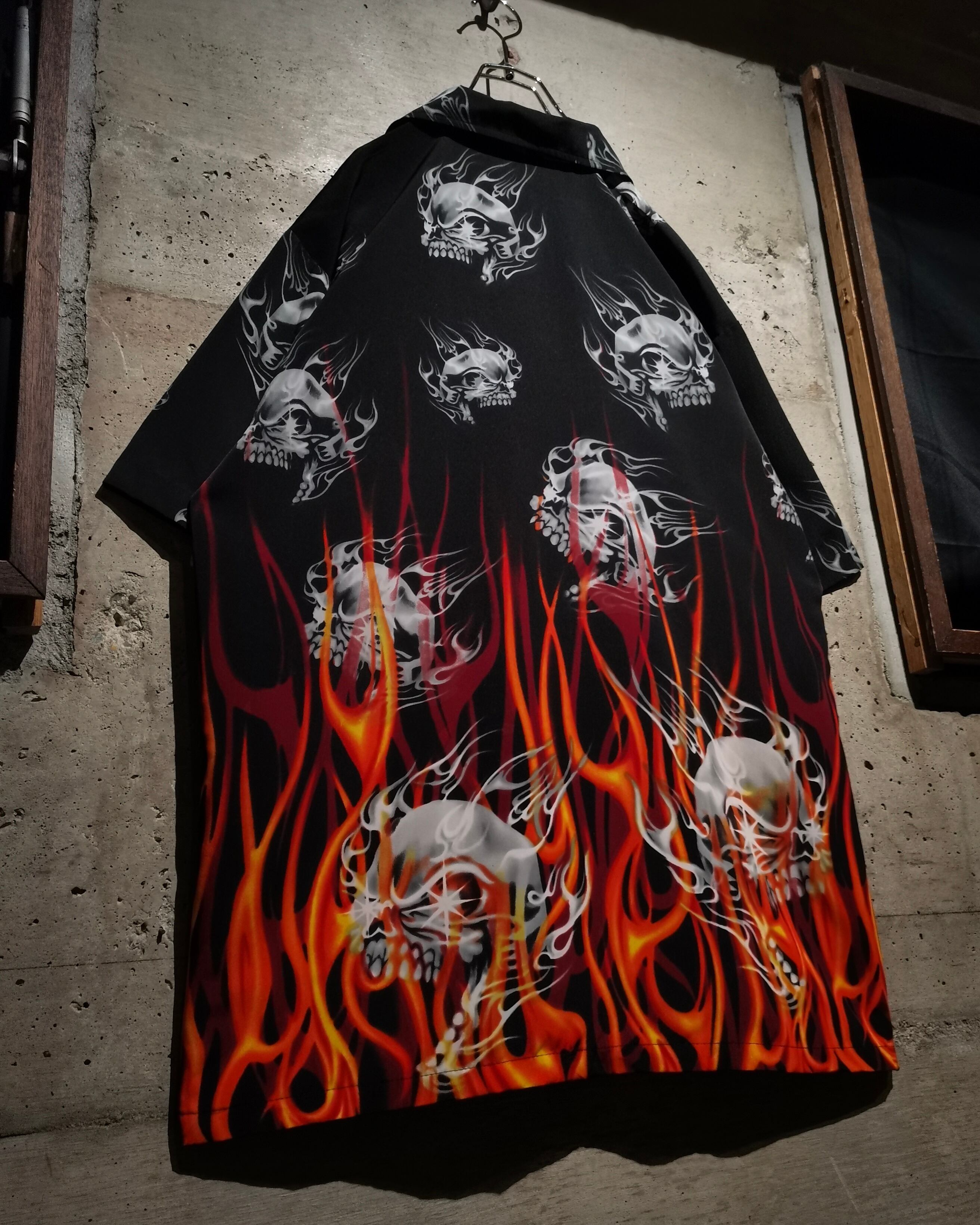 ブラックのボディをベースに、フレイム、スカルを載せた半袖オープンカラーシャツ。