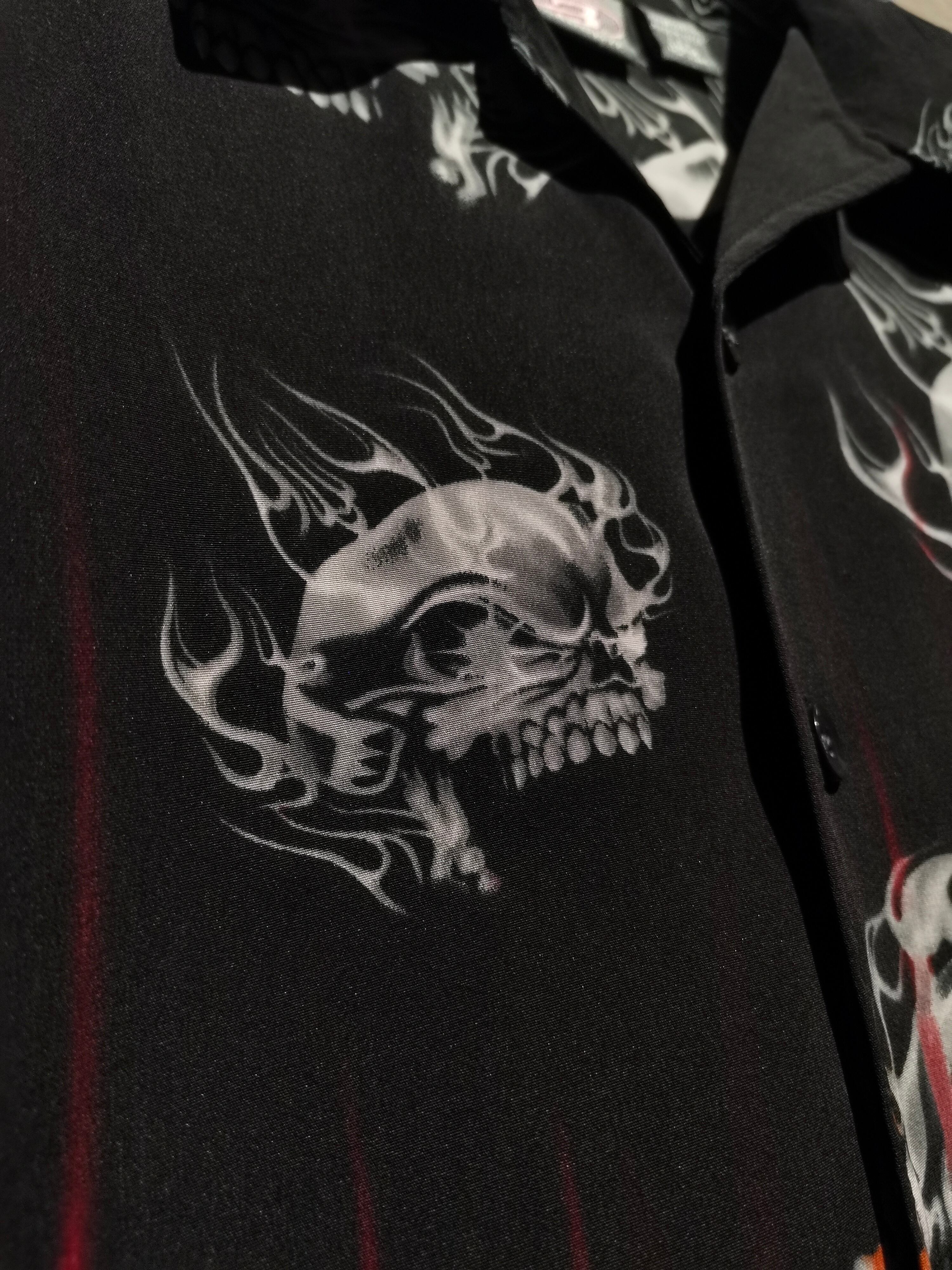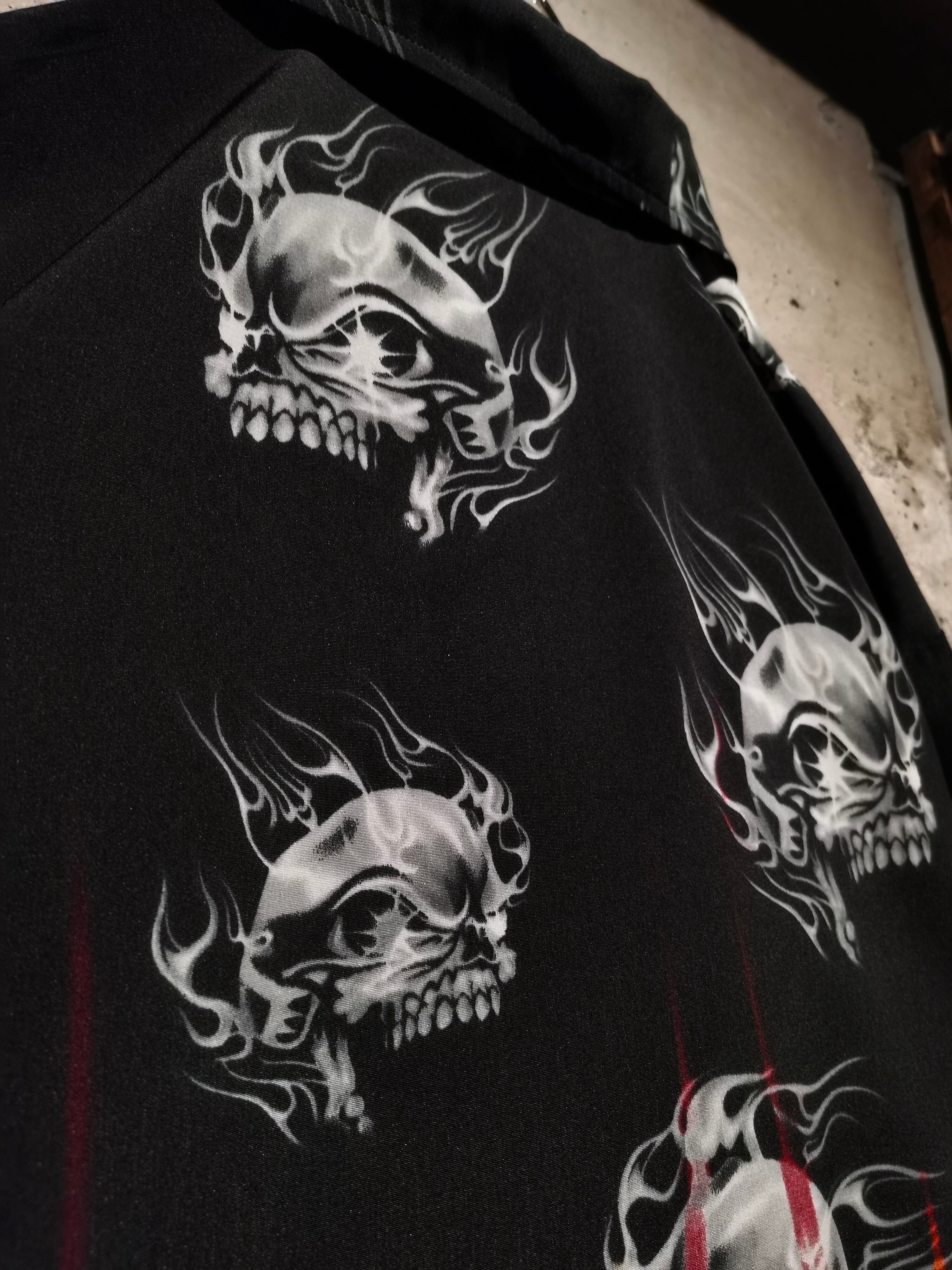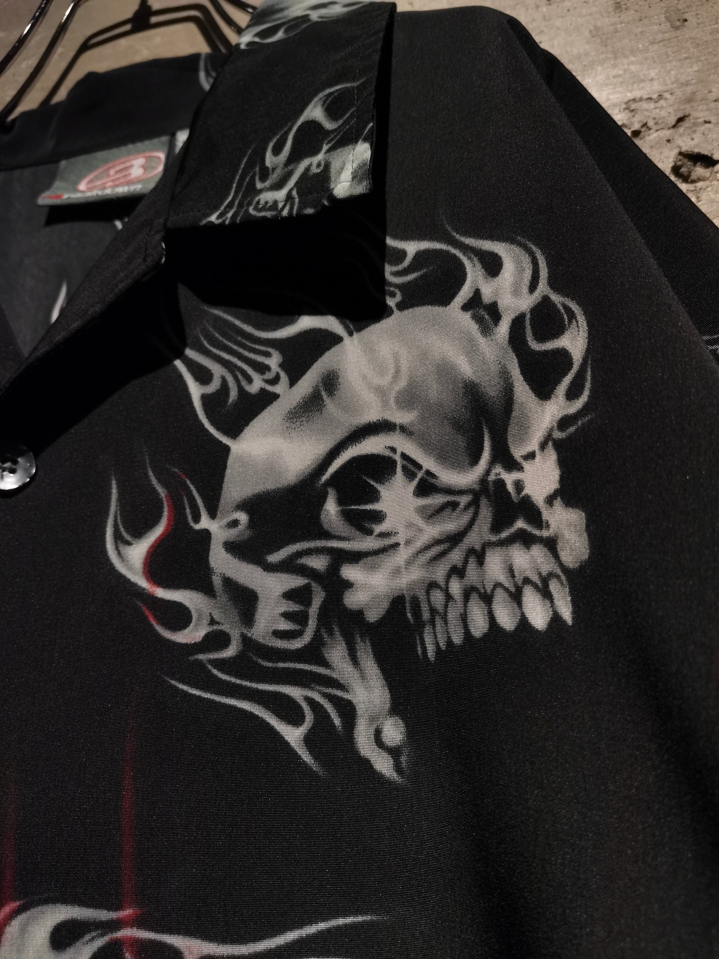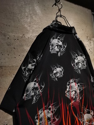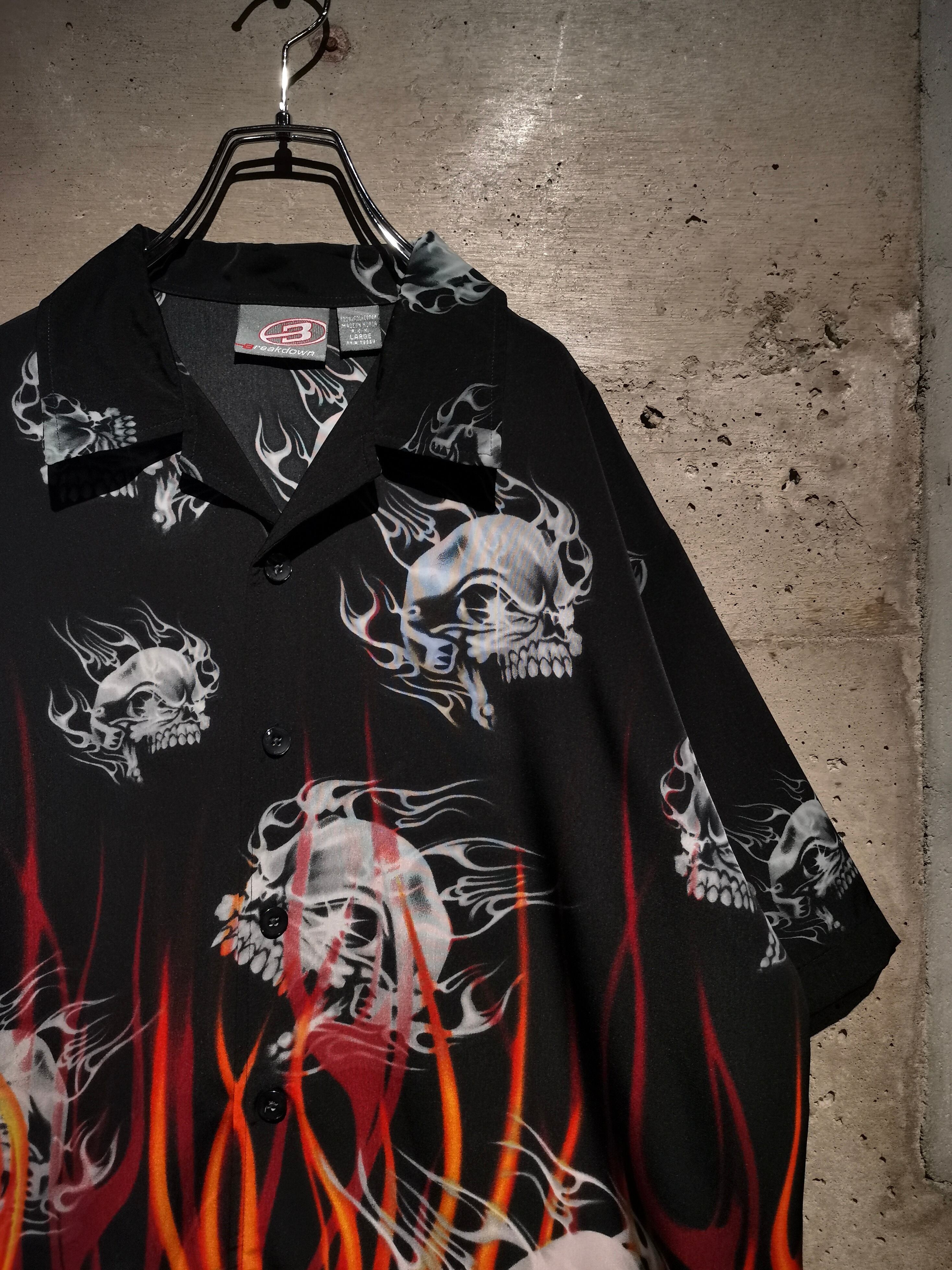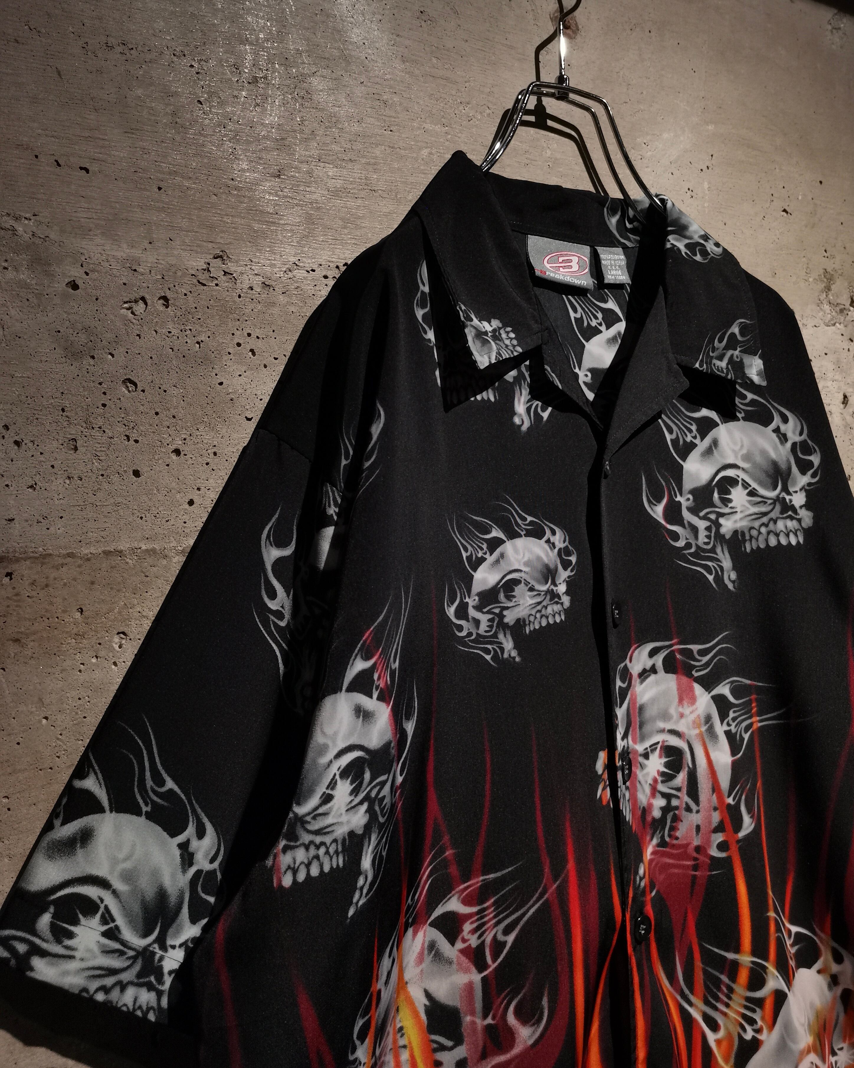 ブラックのボディをベースに、フレイム、スカルを載せた半袖オープンカラーシャツ。