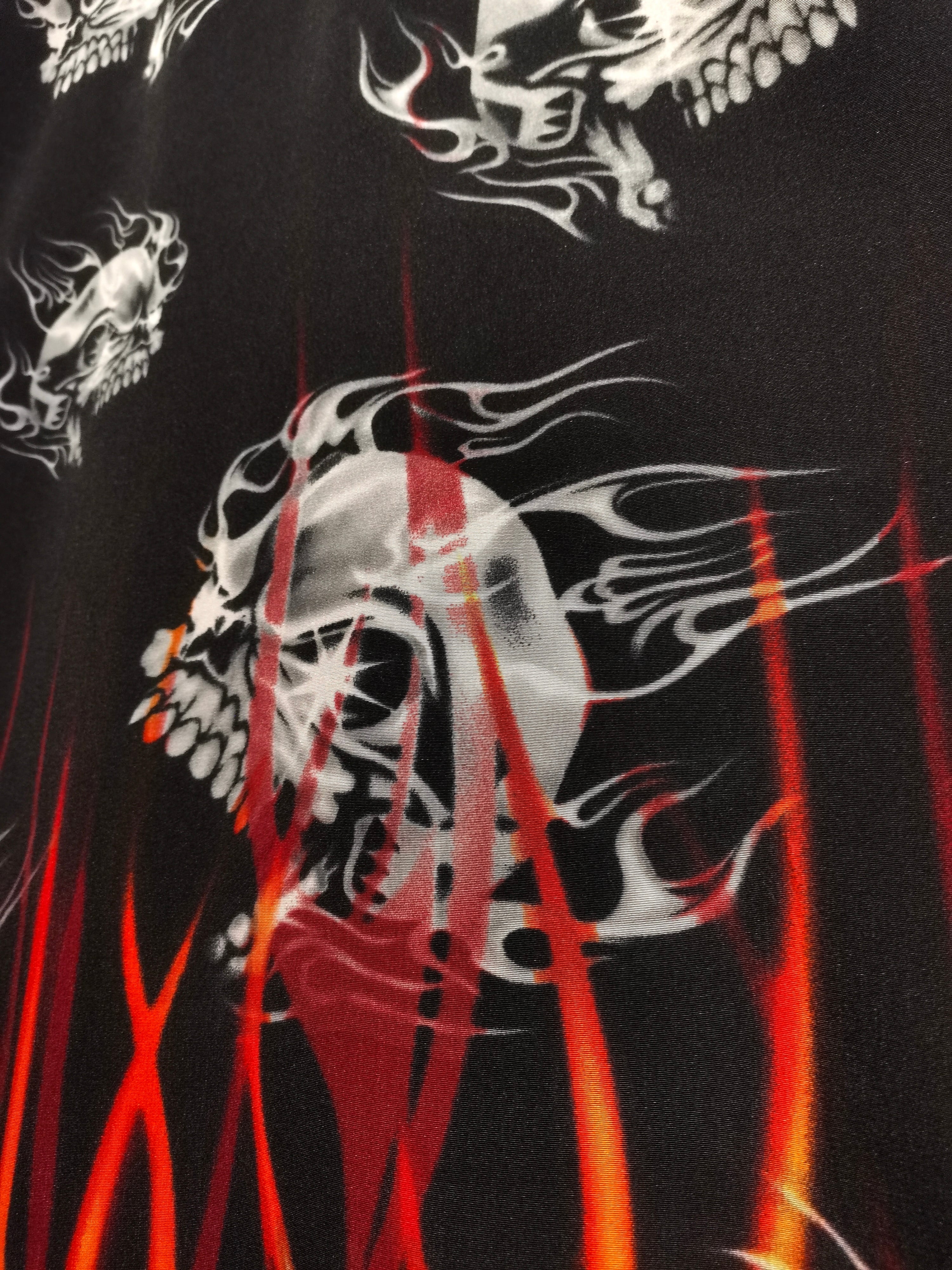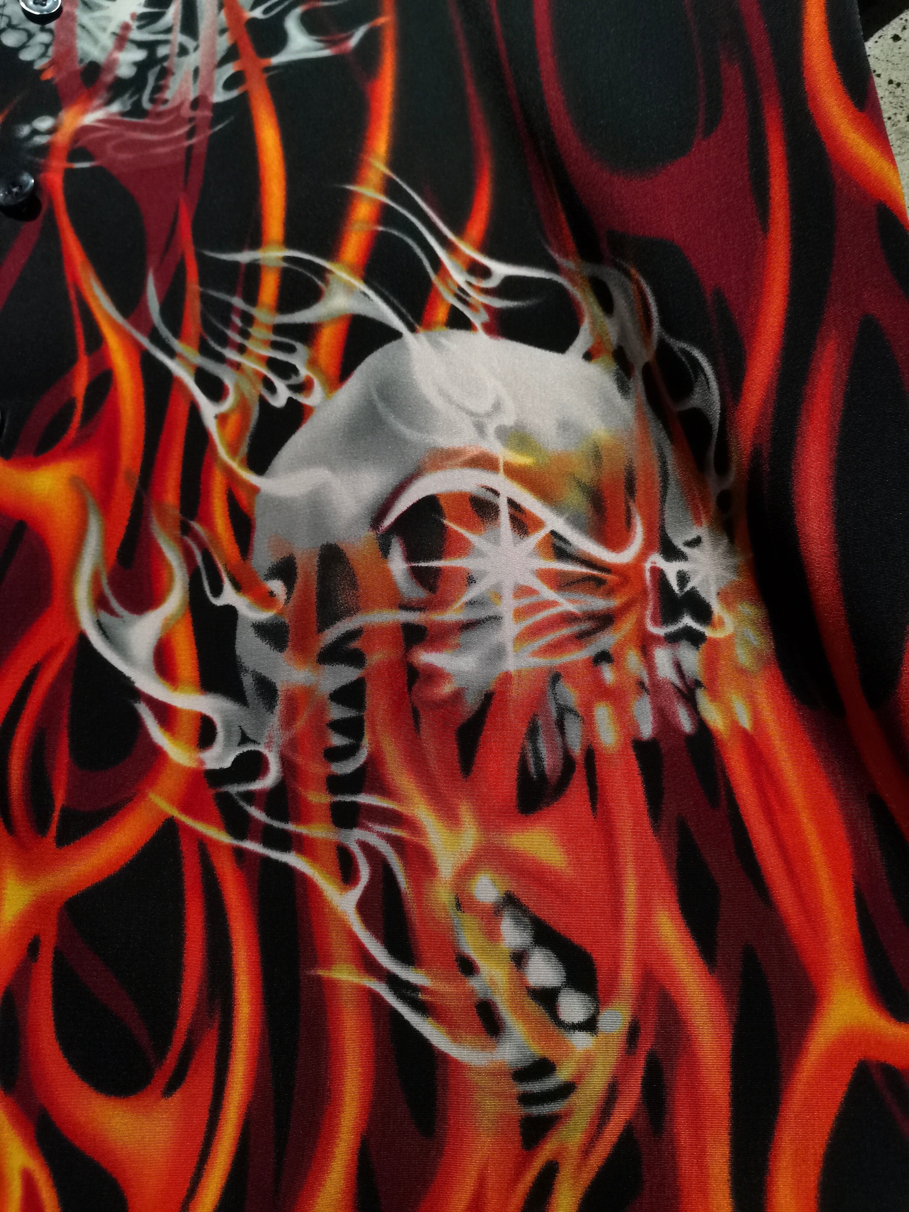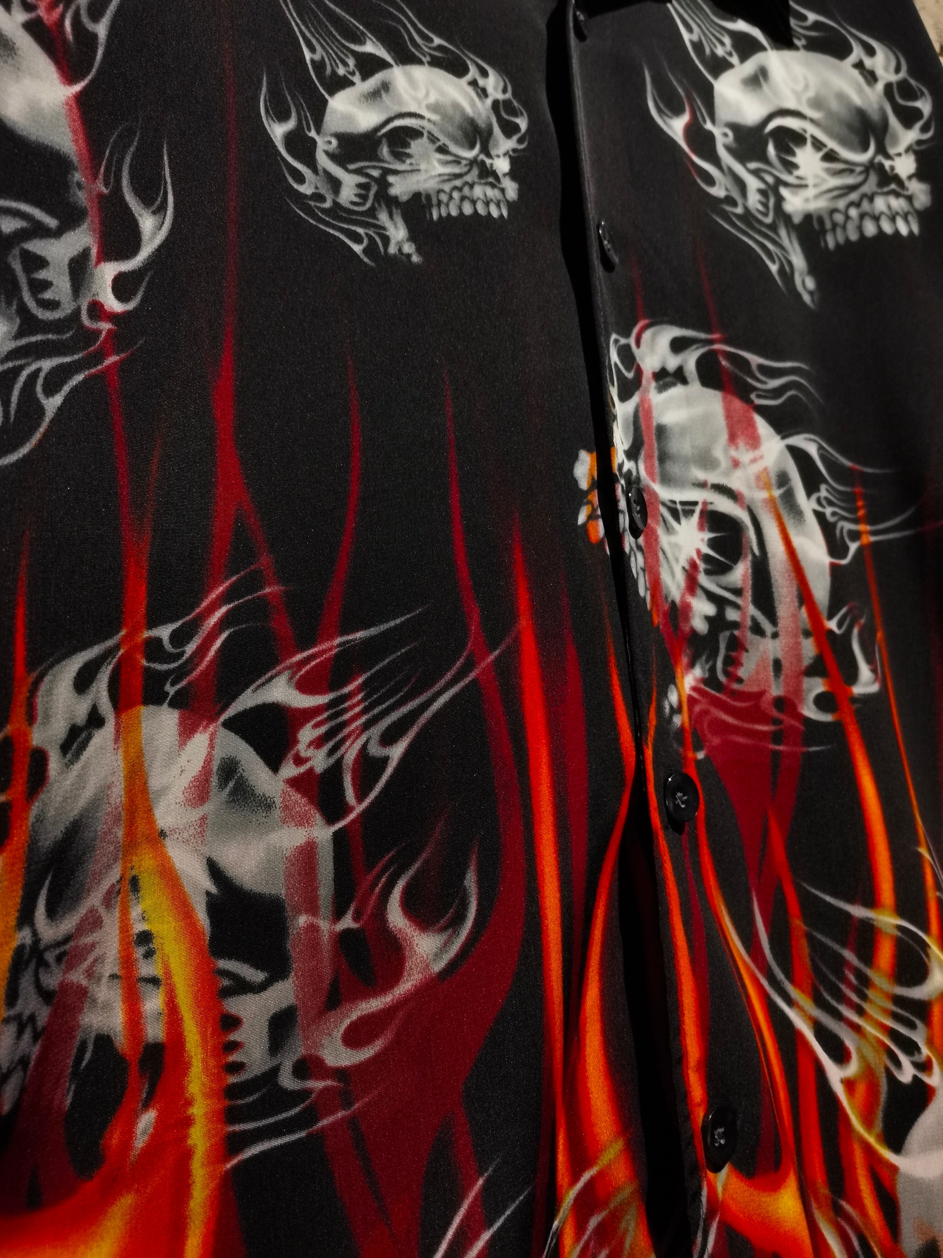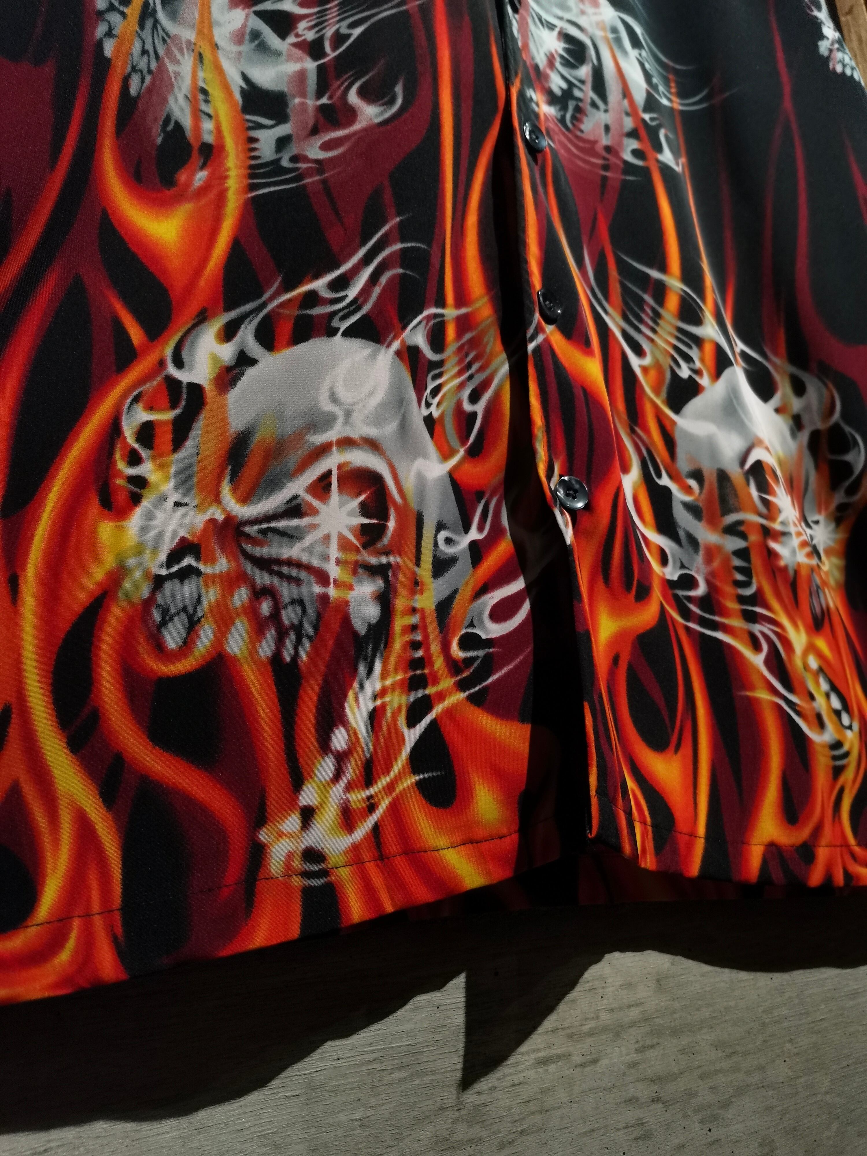 ブラックのボディをベースに、フレイム、スカルを載せた半袖オープンカラーシャツ。