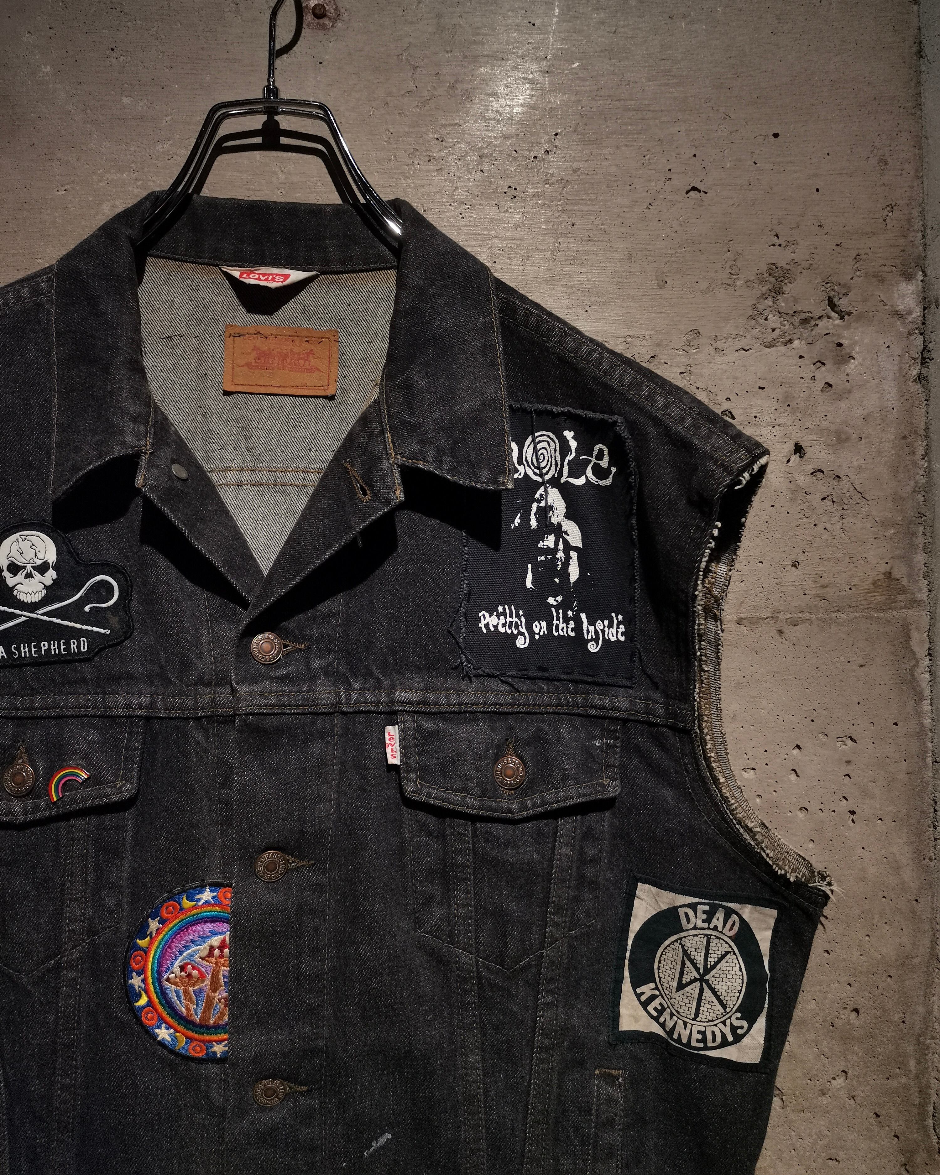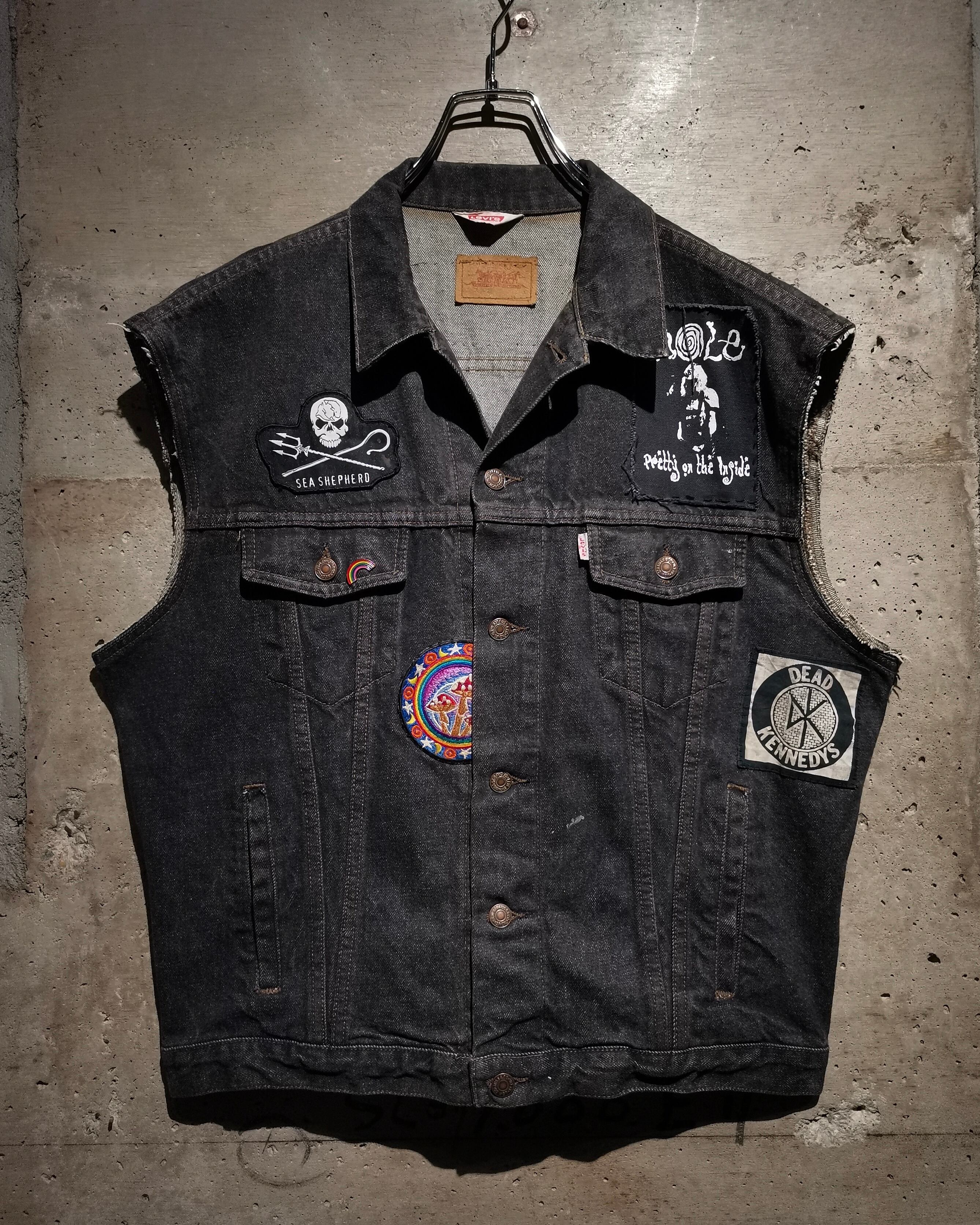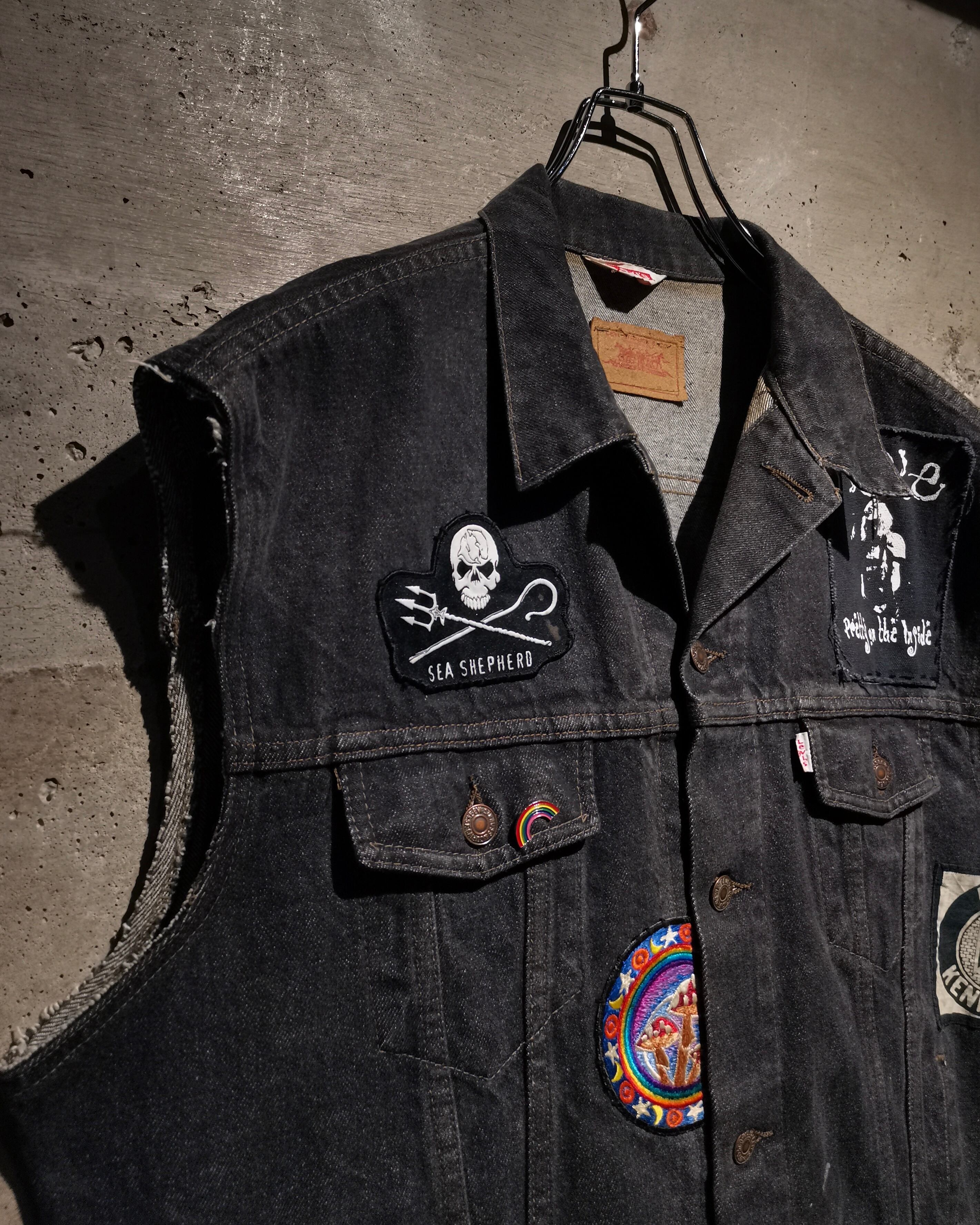 稀少なユーロ企画"Levi's"の先染めデニムジャケットに、ワッペンを載せ、さらに袖をカットオフしベストに仕上げた、スペシャルなデニムベスト。