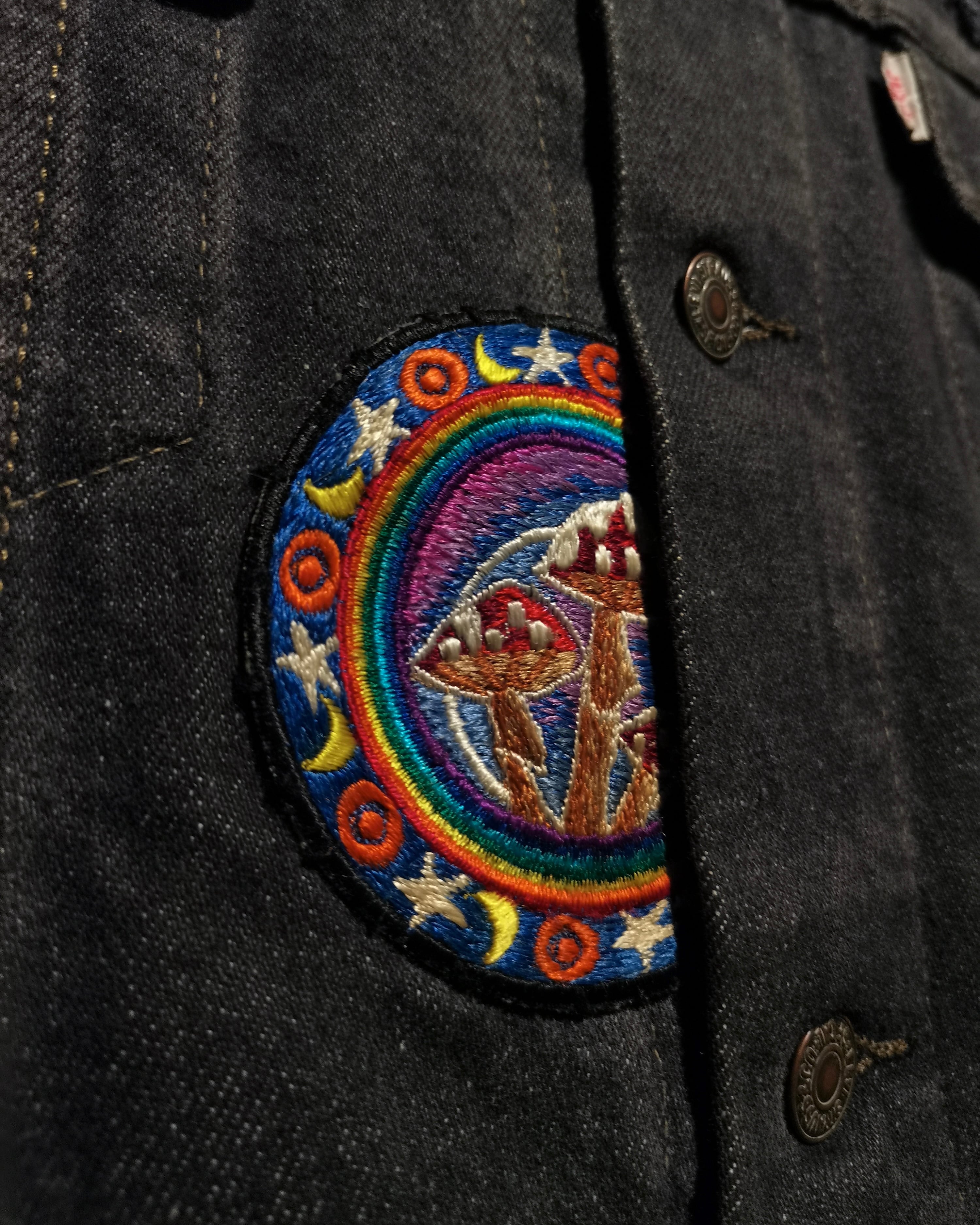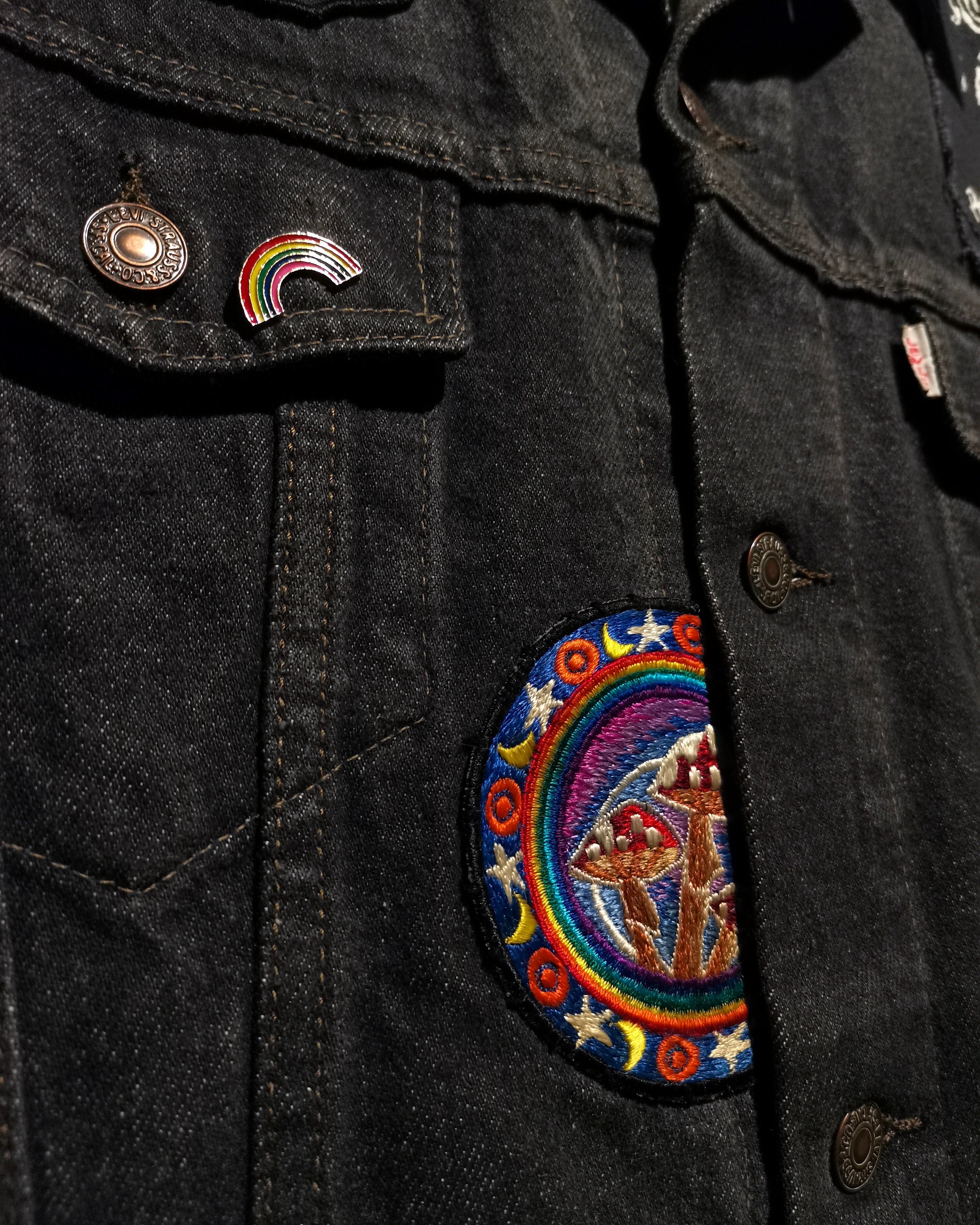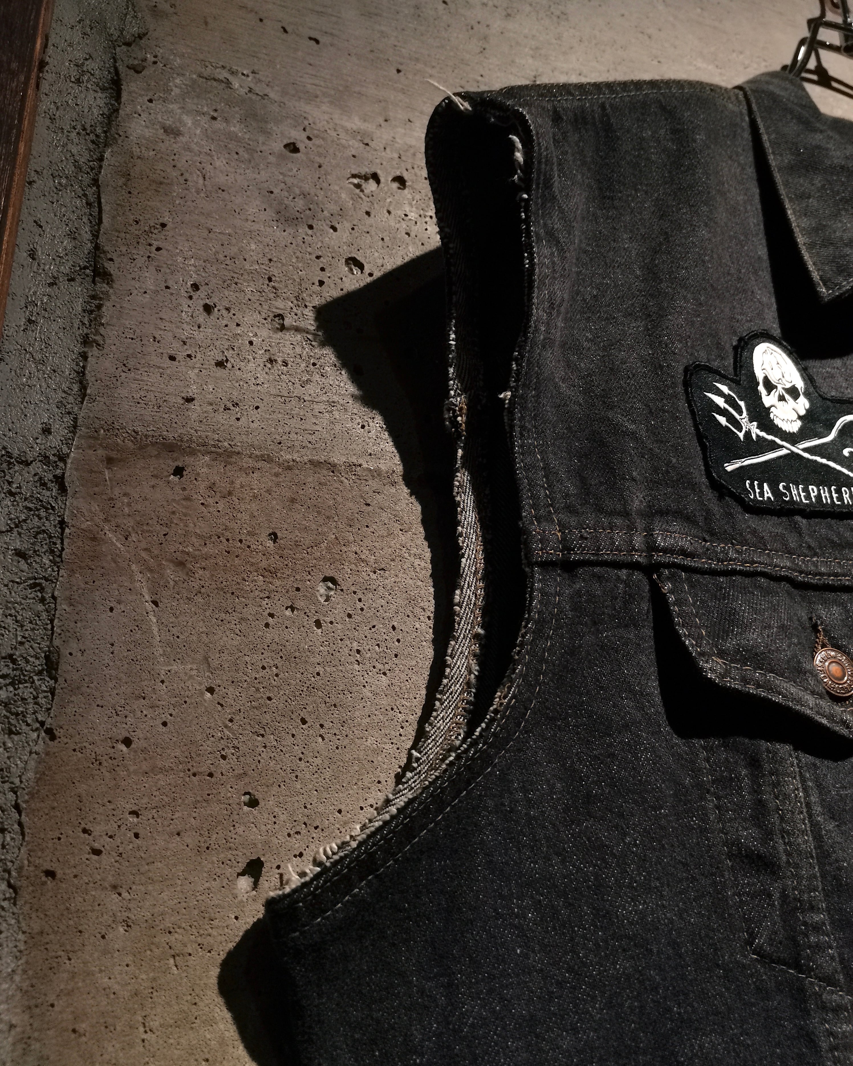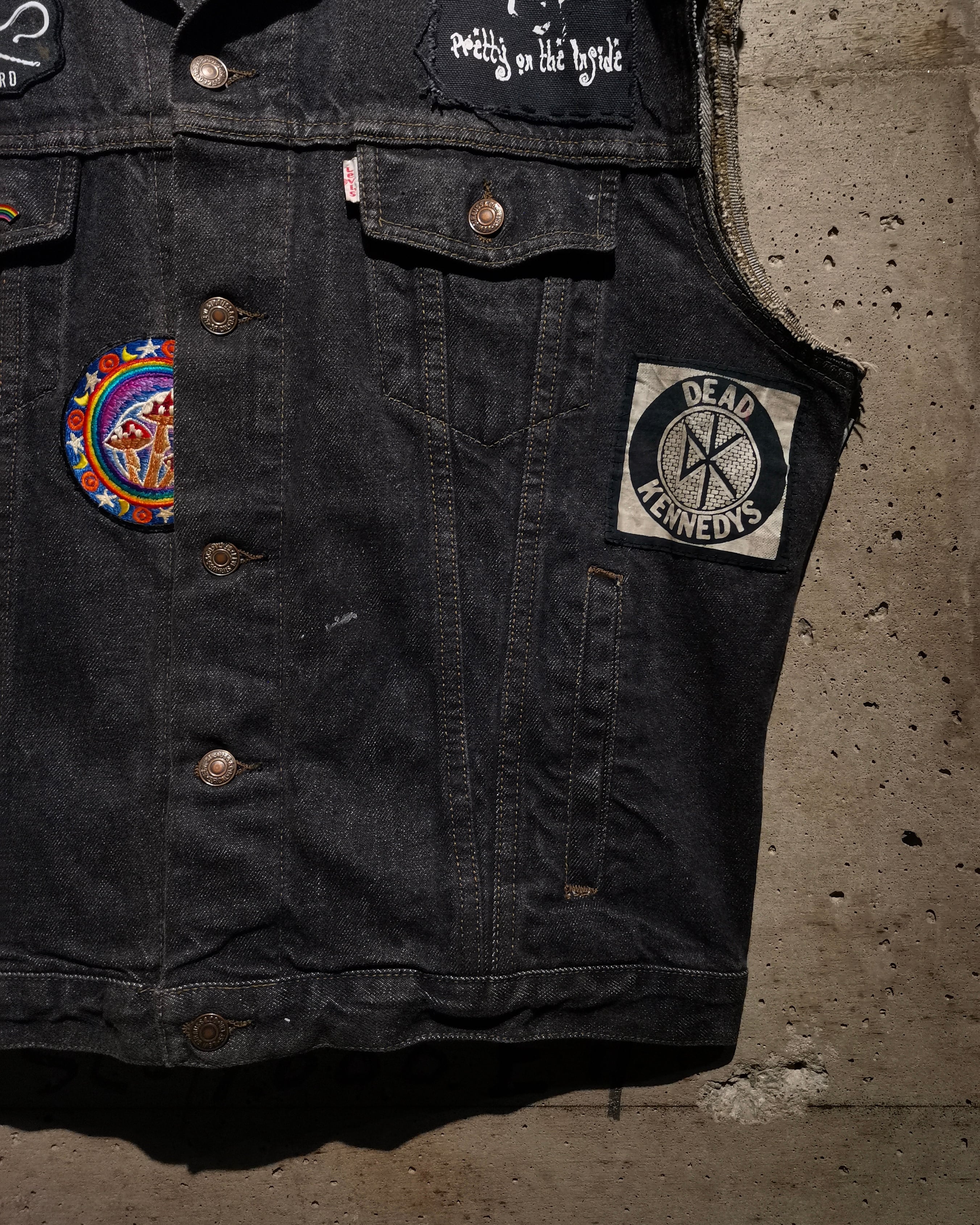稀少なユーロ企画"Levi's"の先染めデニムジャケットに、ワッペンを載せ、さらに袖をカットオフしベストに仕上げた、スペシャルなデニムベスト。