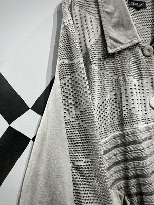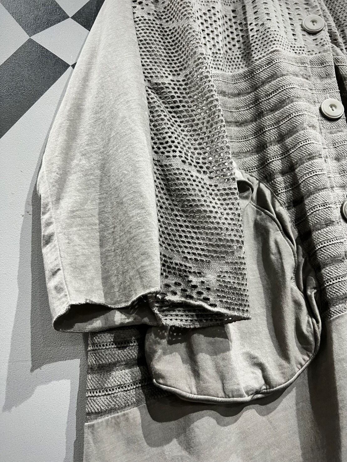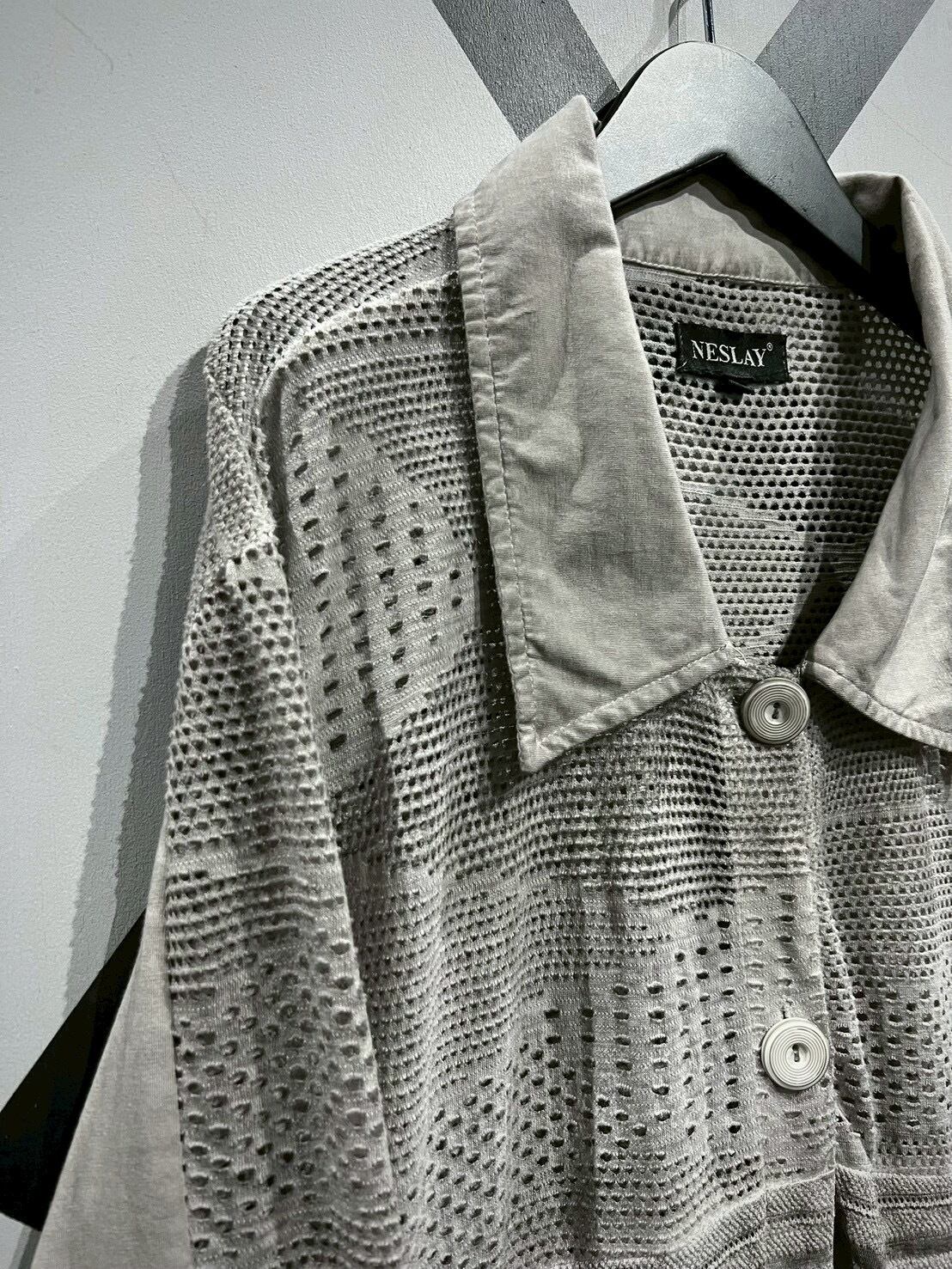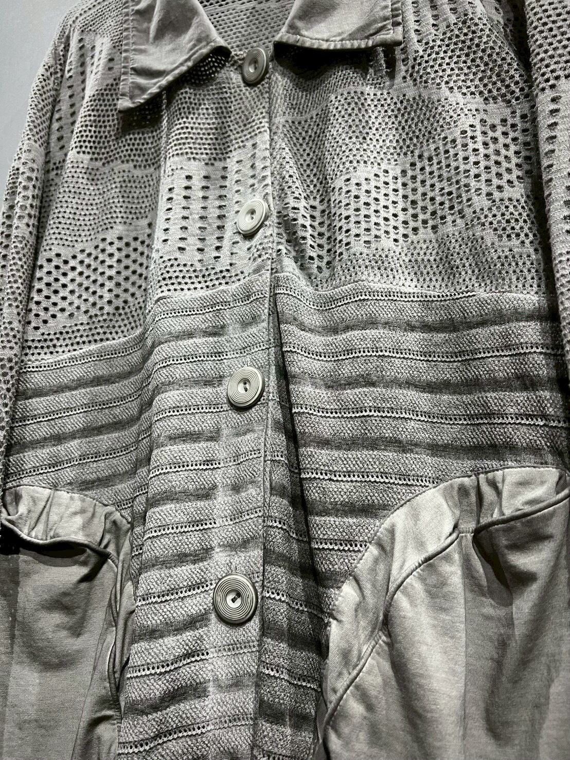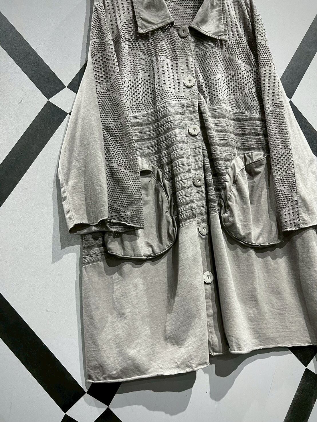 柔らかく肌触りの良いコットンを用いて、ボーダーやメッシュを切り替えたハーフレングスのジャケット。