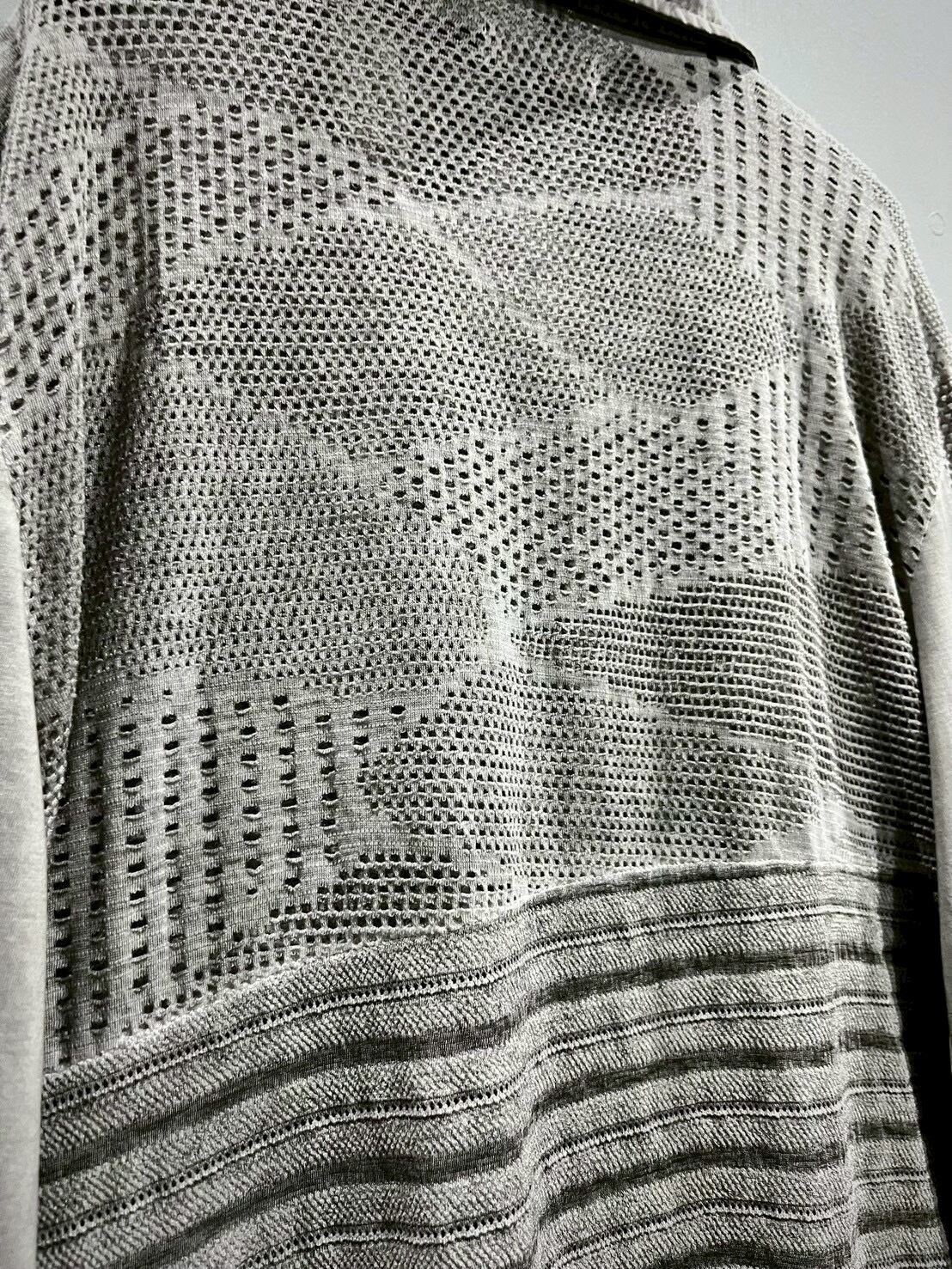 メッシュ部分の穴の大きさを変えることでパネル状に切り替わったようにデザイン。ボーダー部分も織り方を変えた事で立体感もあり、様々な方法を用いて表現されたデザインが奥行きのある見栄えを演出しています。フロントの立体感のあるポケットのディテールも◎