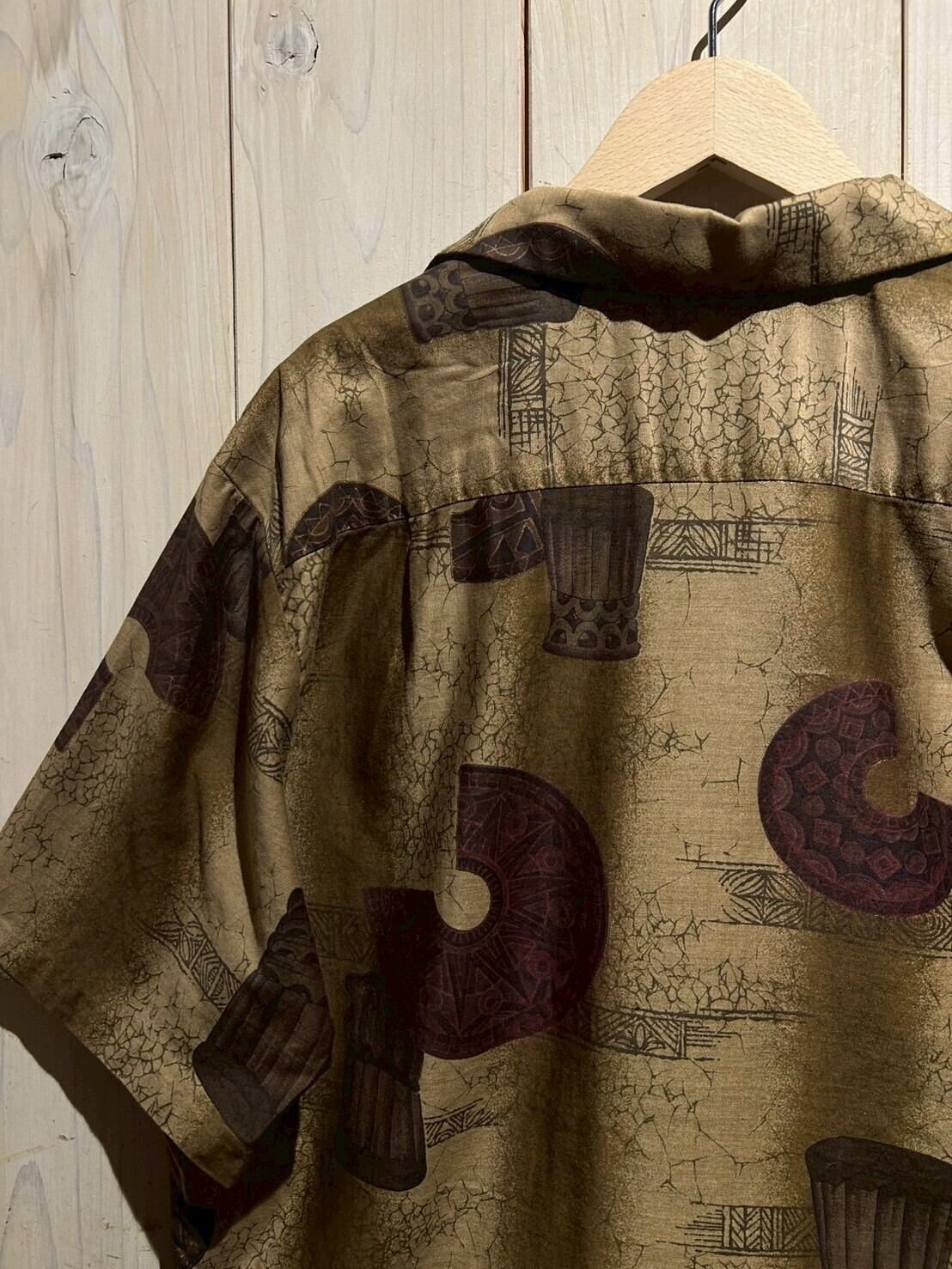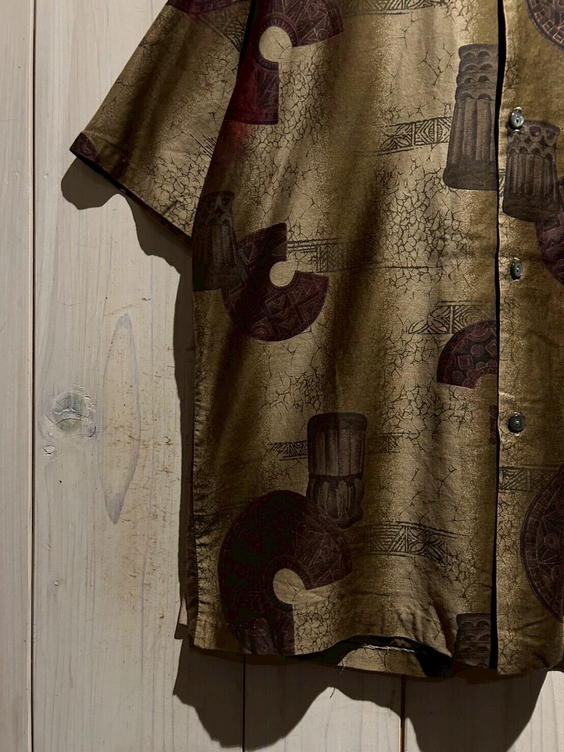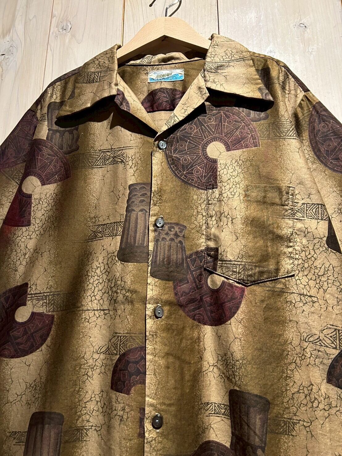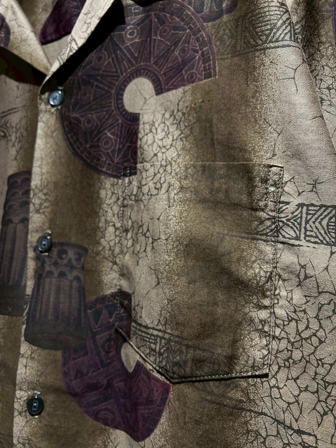 壁画風にデザインされたボディに、古代文明の装飾品、古代ギリシャやローマの建築物を連想させる石柱などのデザインを落とし込んだ70'sヴィンテージのアロハシャツ。