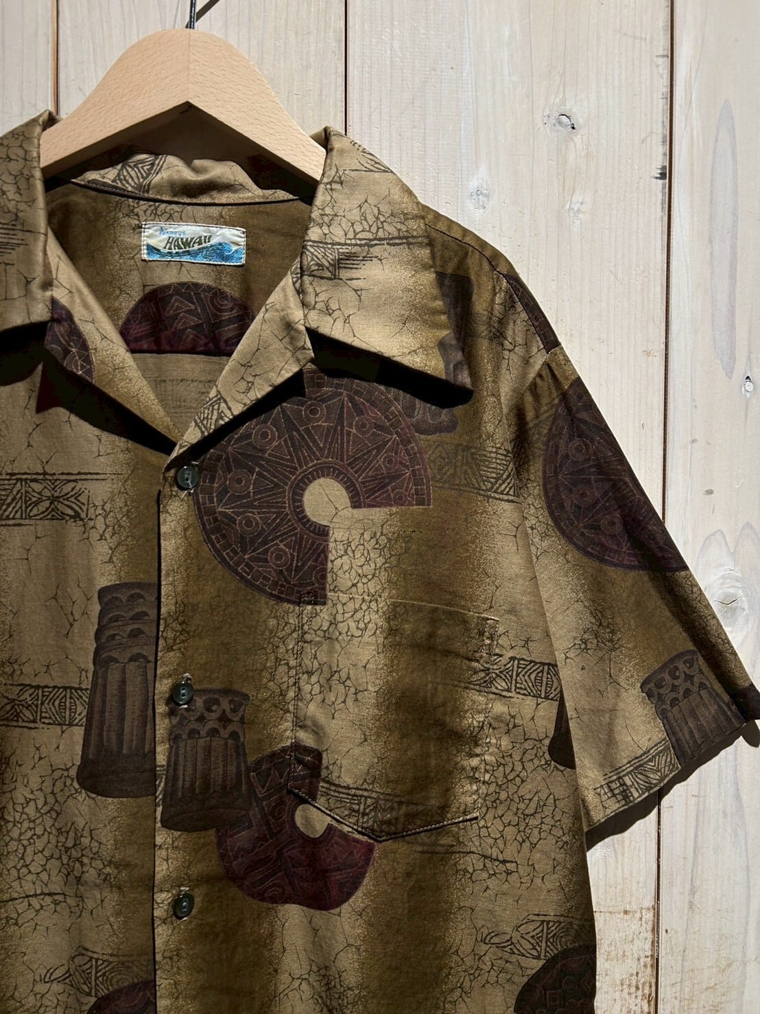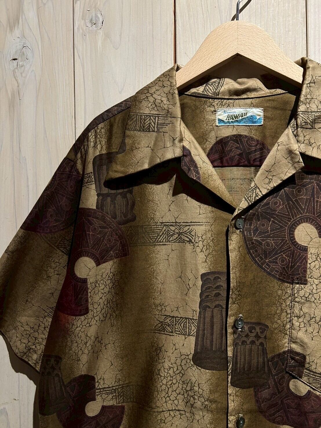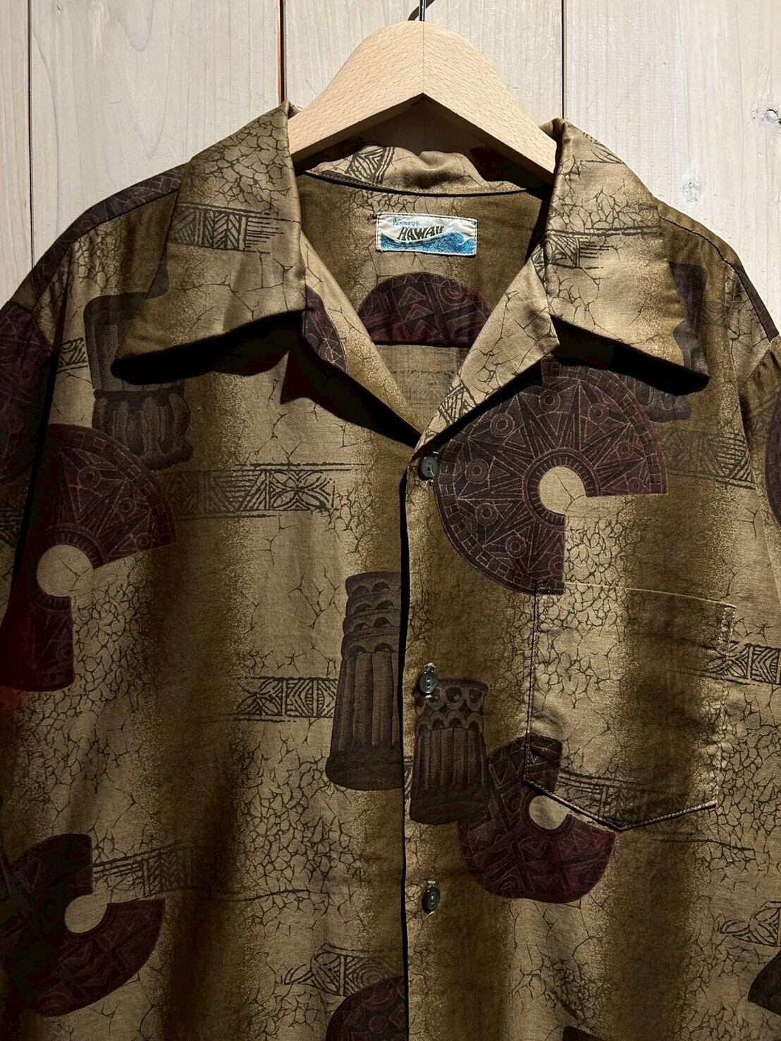 壁画風にデザインされたボディに、古代文明の装飾品、古代ギリシャやローマの建築物を連想させる石柱などのデザインを落とし込んだ70'sヴィンテージのアロハシャツ。