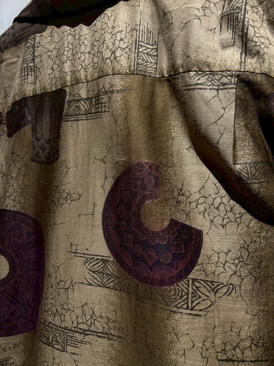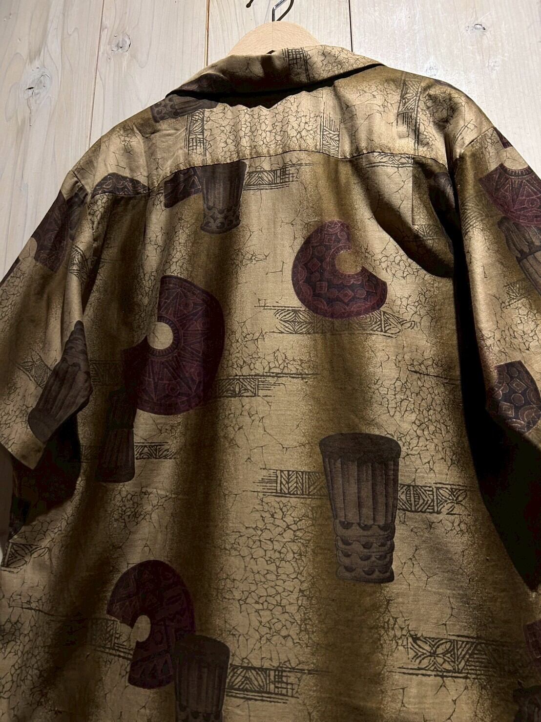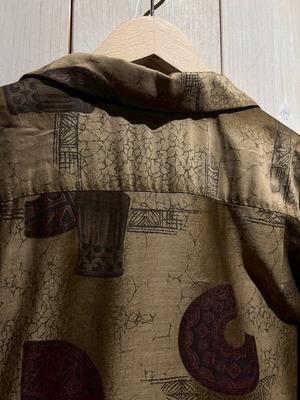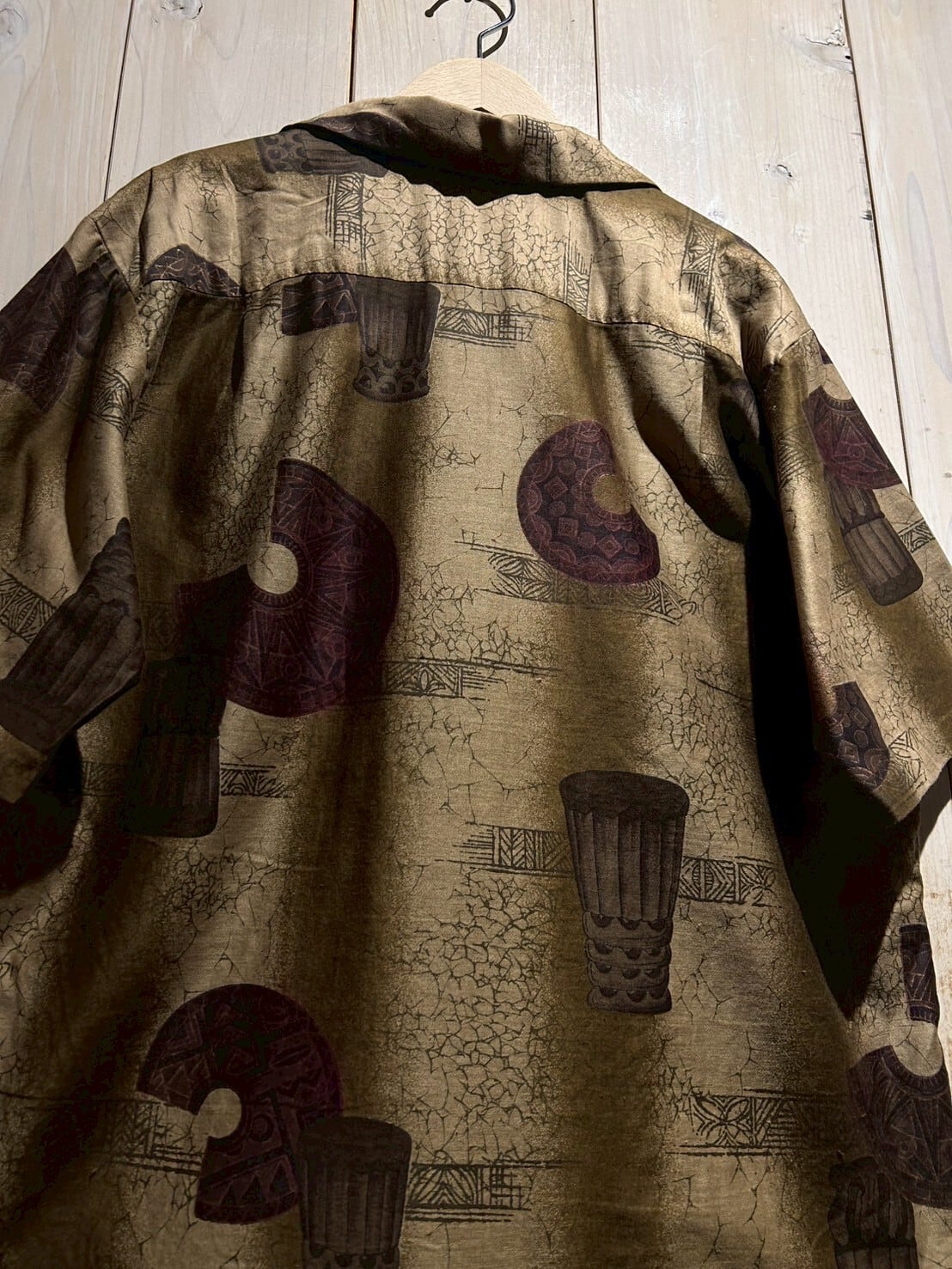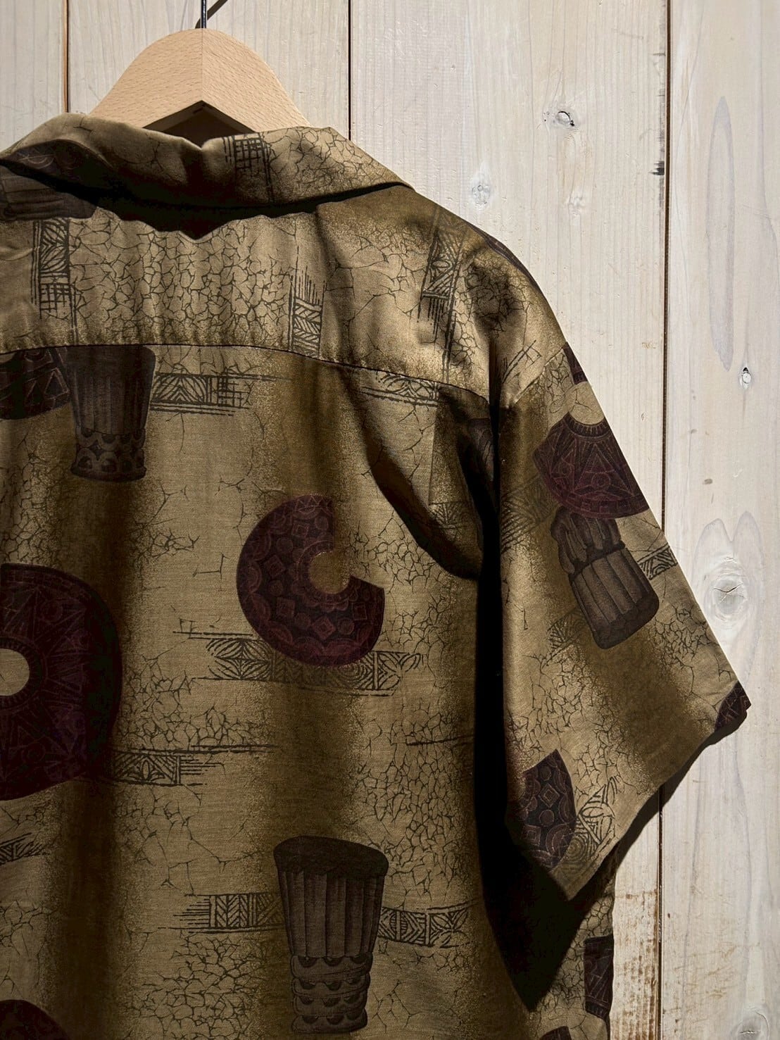 壁画風にデザインされたボディに、古代文明の装飾品、古代ギリシャやローマの建築物を連想させる石柱などのデザインを落とし込んだ70'sヴィンテージのアロハシャツ。