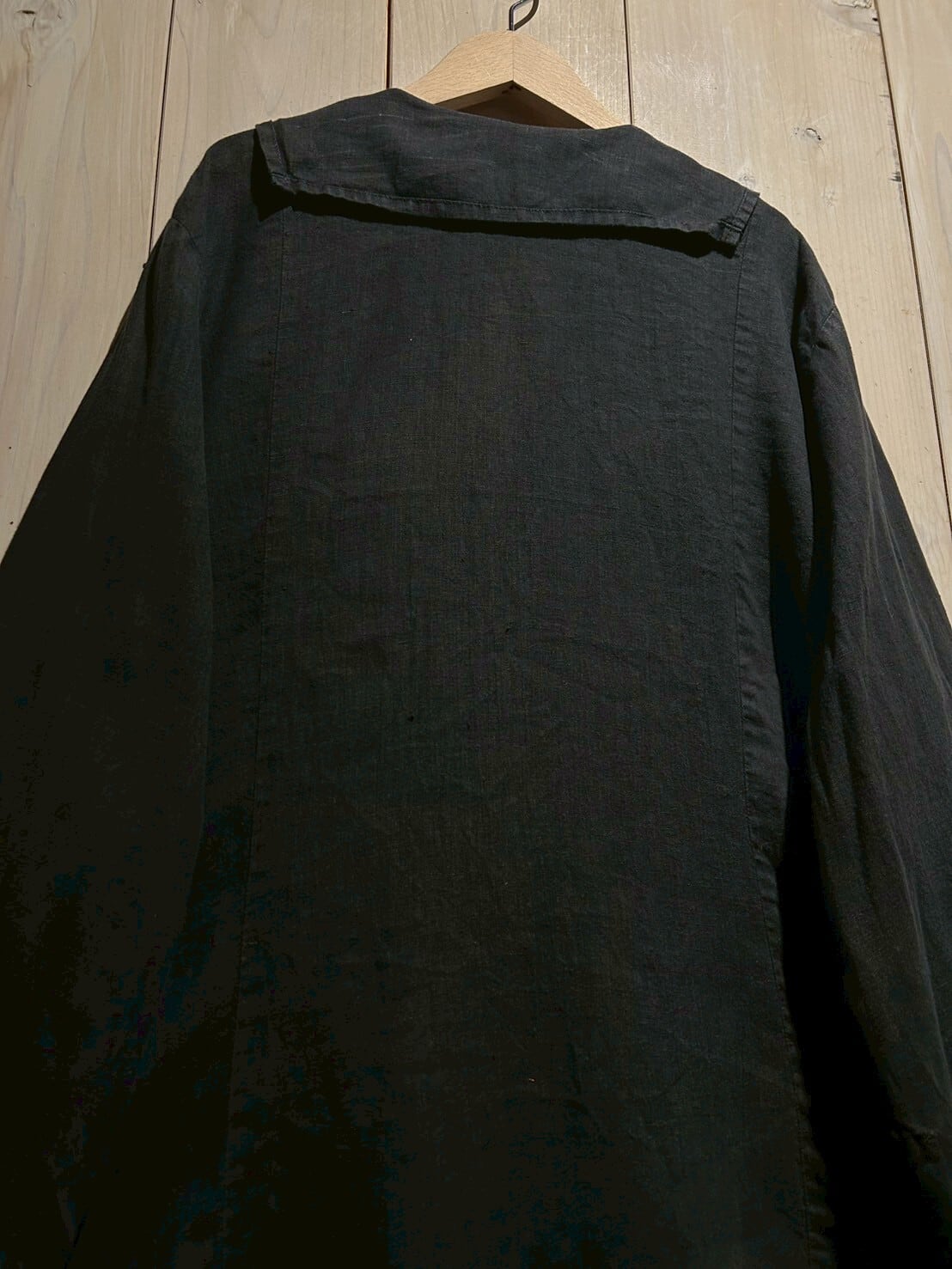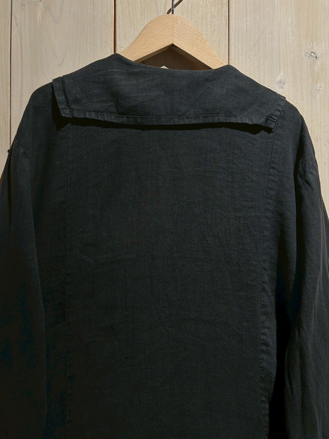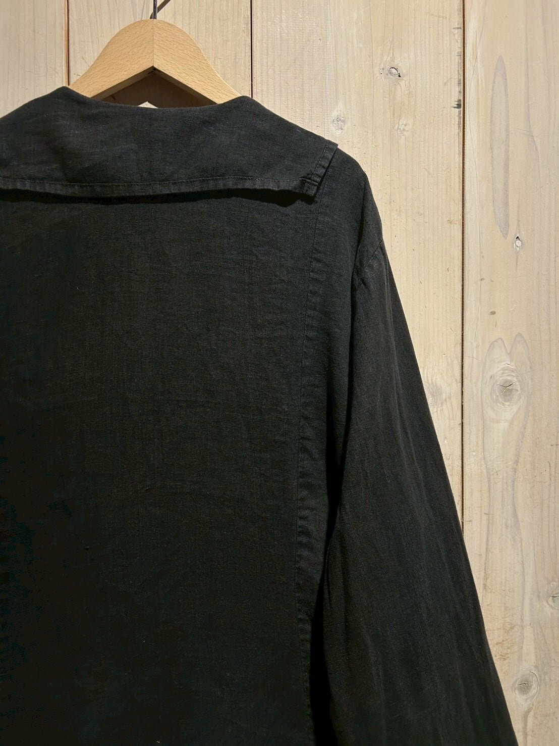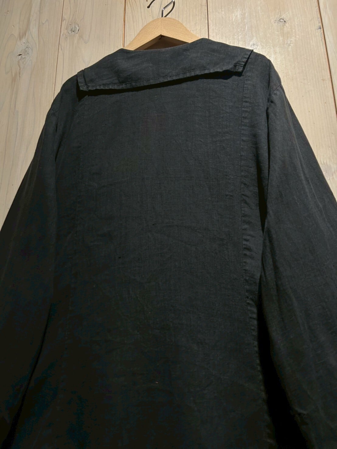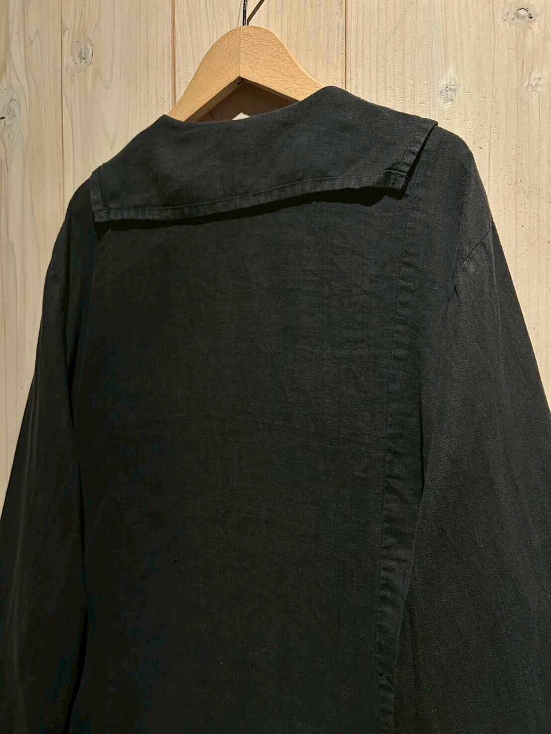 フロントには大ぶりなフラップポケットに、首元には小ぶりのセーラー風の襟が施された、シンプルながら一癖効いた当店らしい1着。