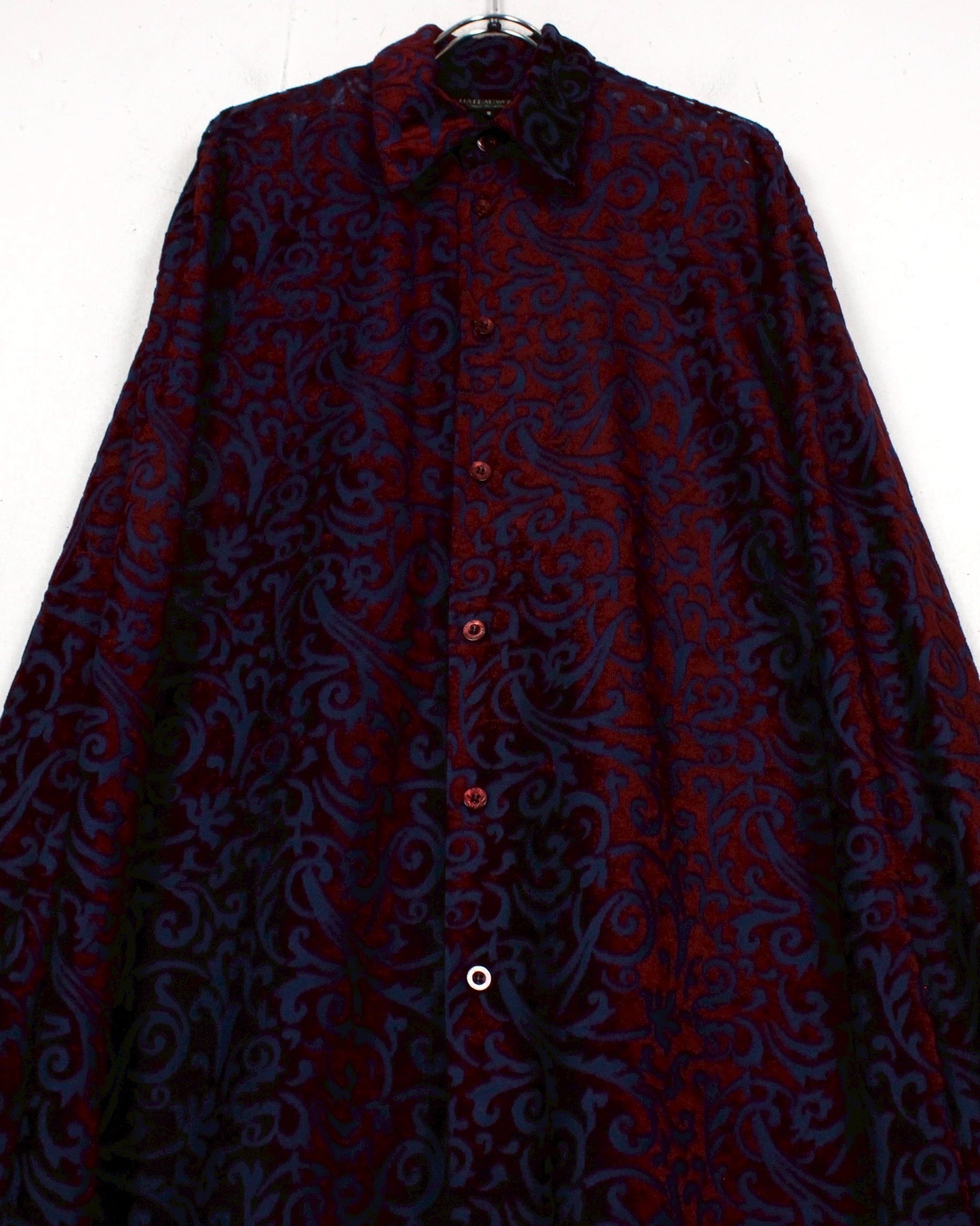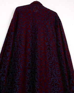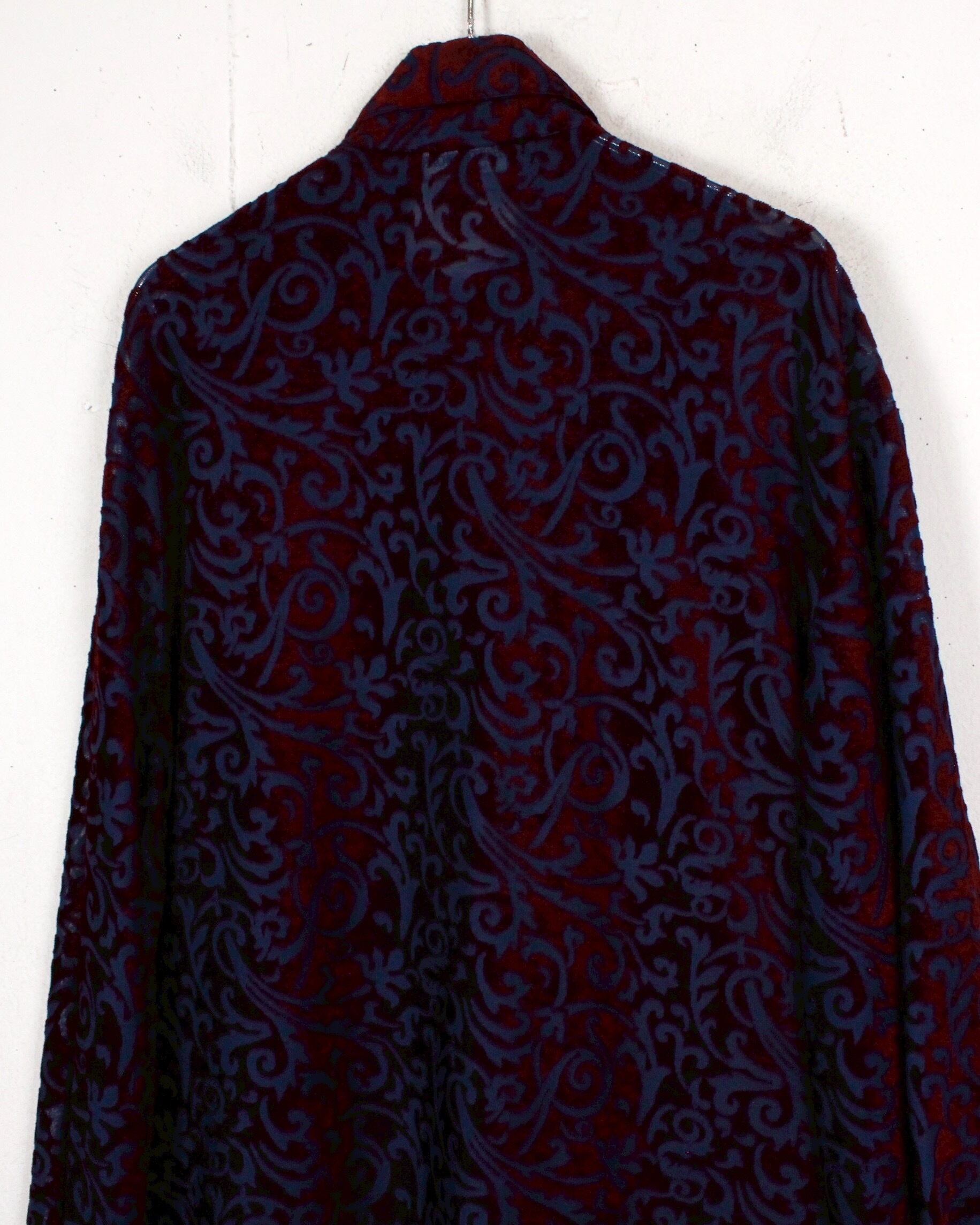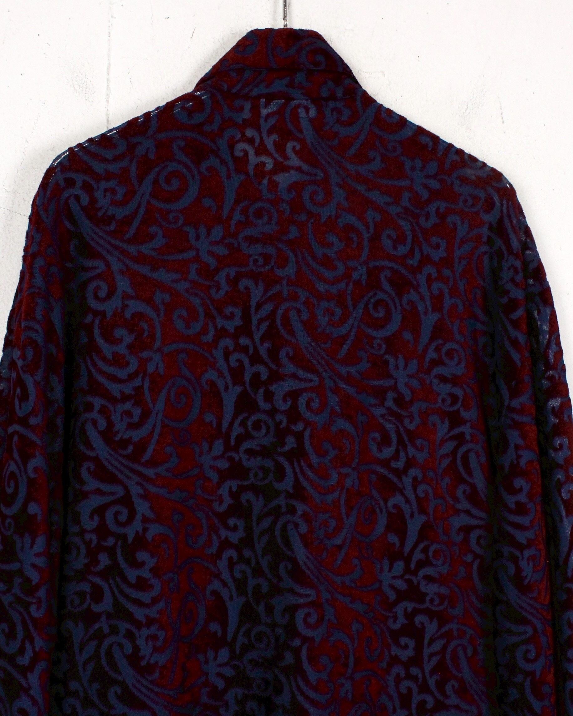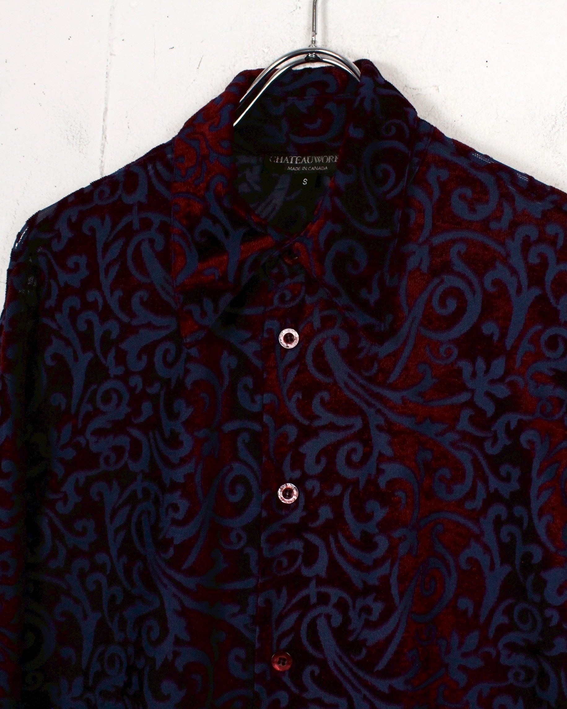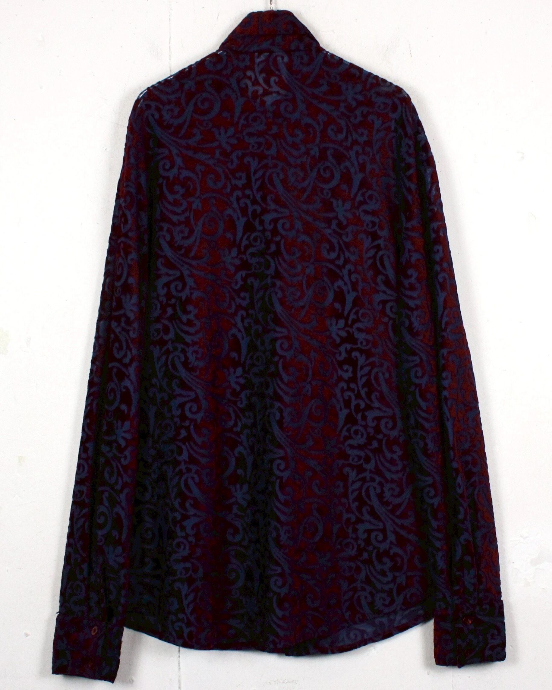 透け感の美しいネイビーカラーのシアー生地のボディに、鈍い光沢を帯びたボルドーのベロアによるフロッキープリントで、ダマスク柄を載せたシアーシャツ。