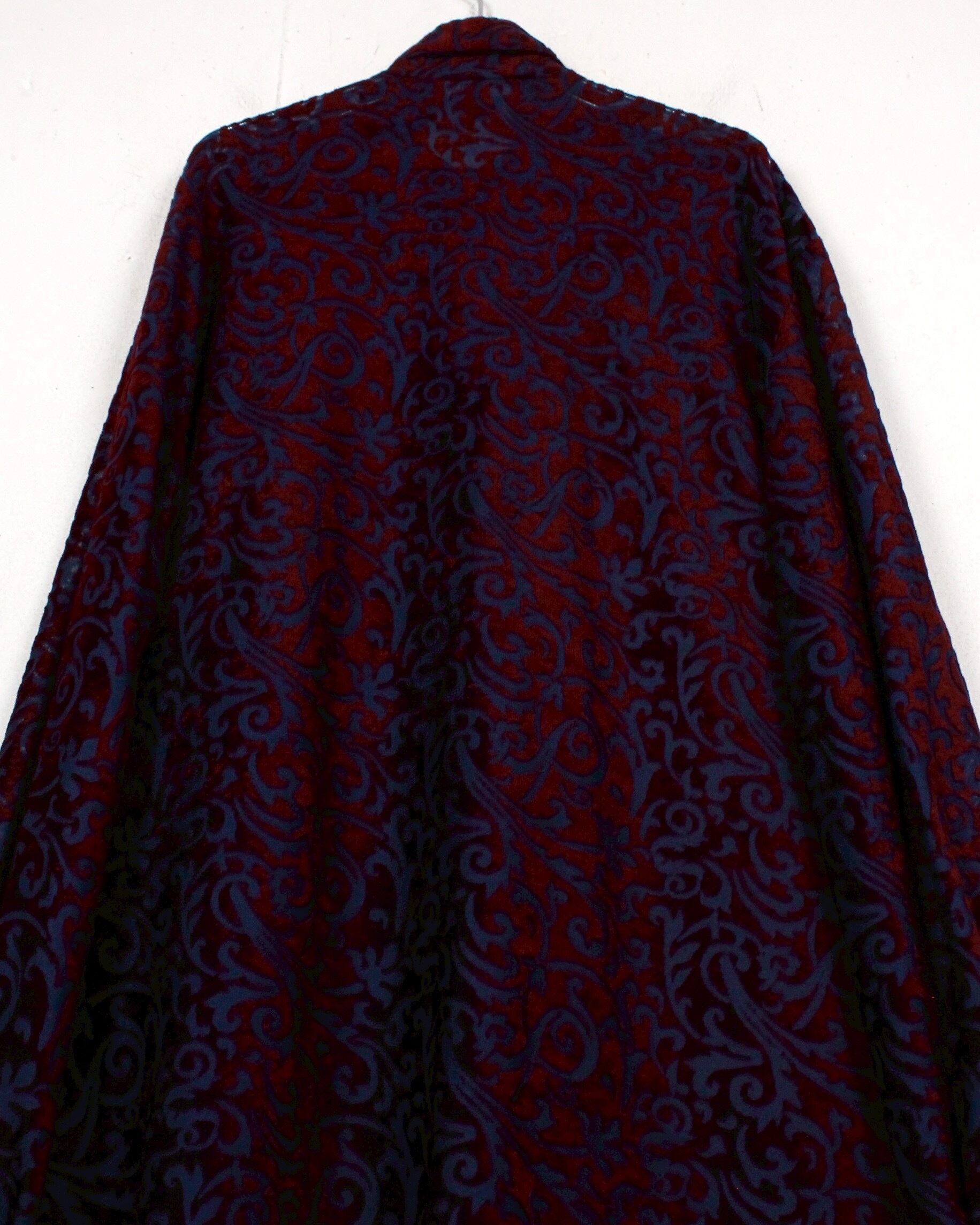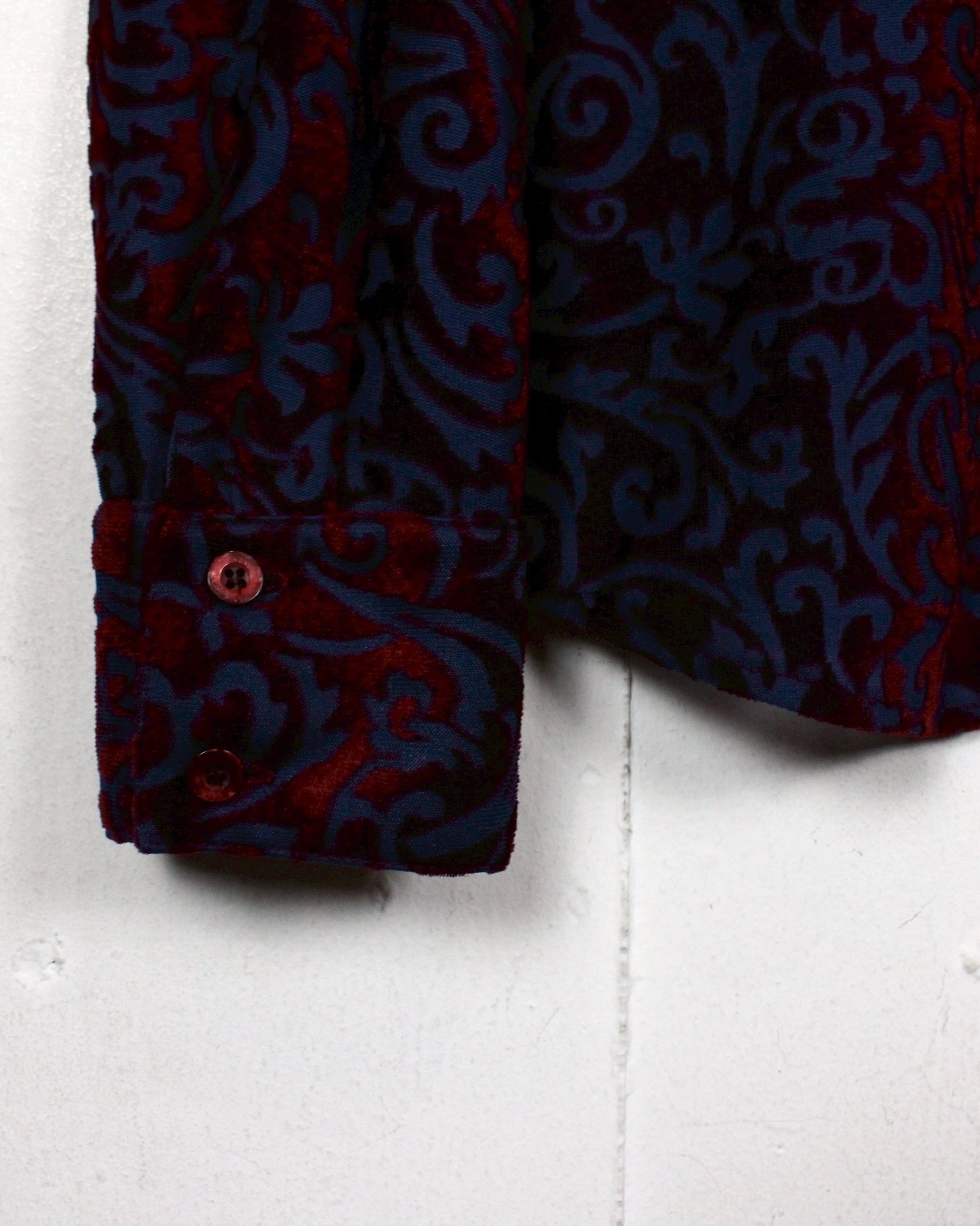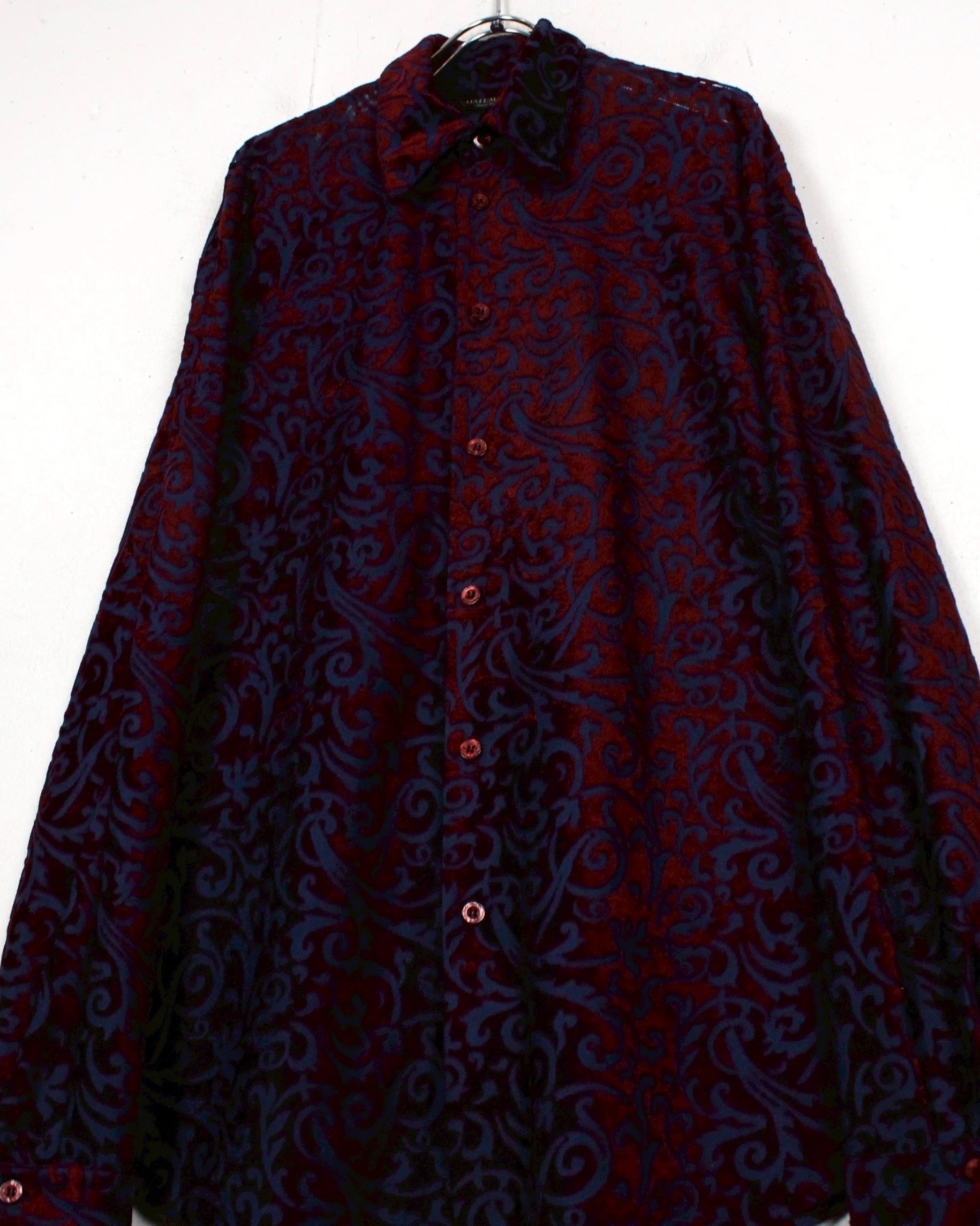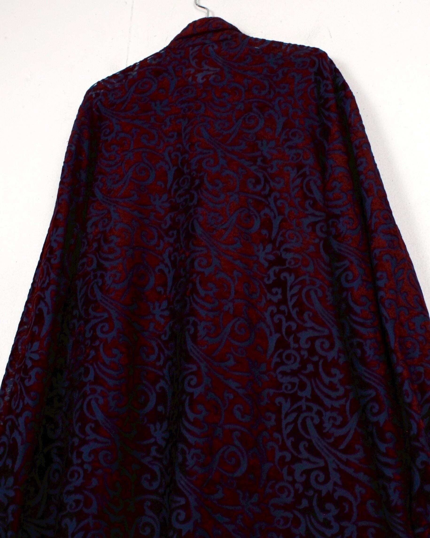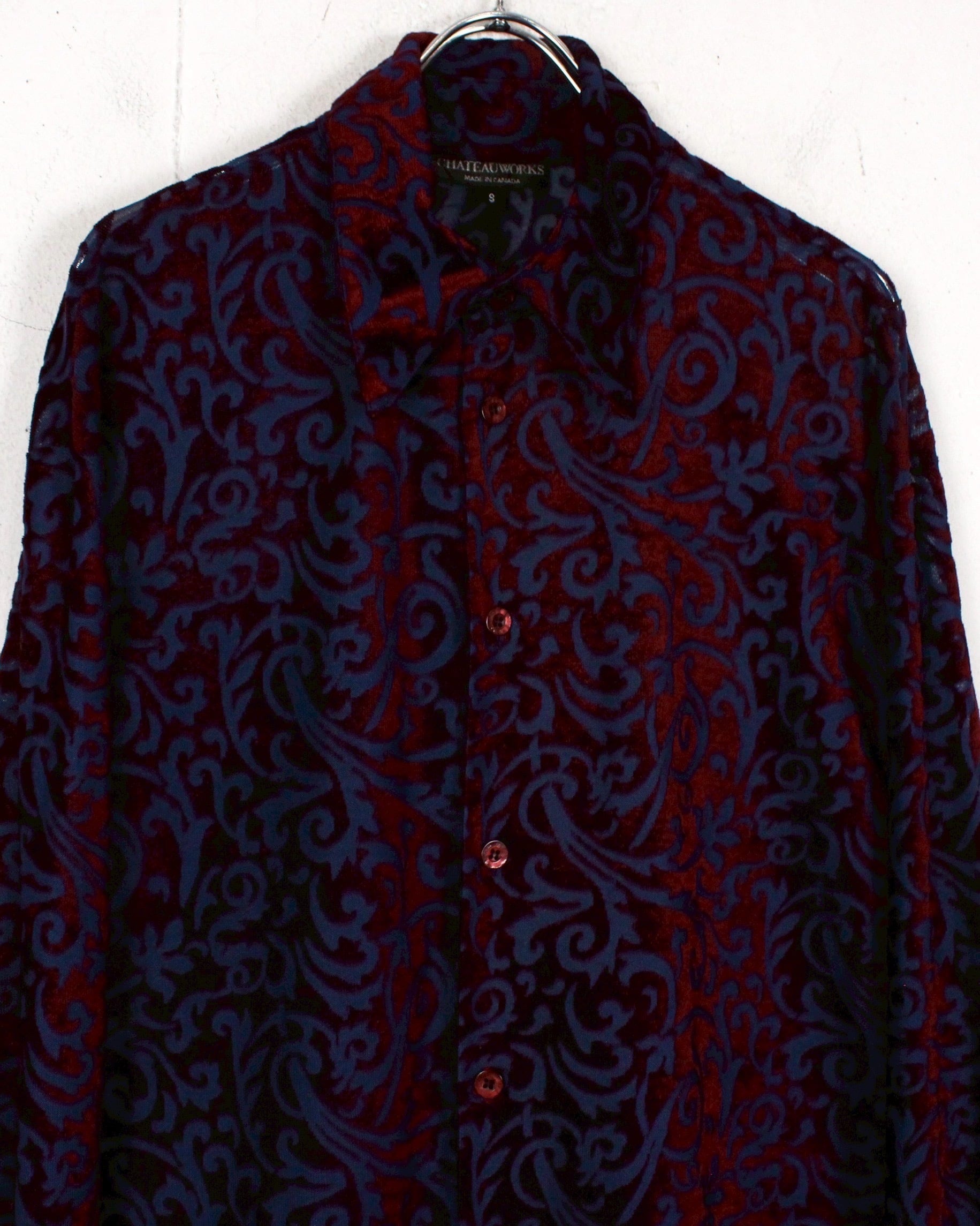 透け感の美しいネイビーカラーのシアー生地のボディに、鈍い光沢を帯びたボルドーのベロアによるフロッキープリントで、ダマスク柄を載せたシアーシャツ。