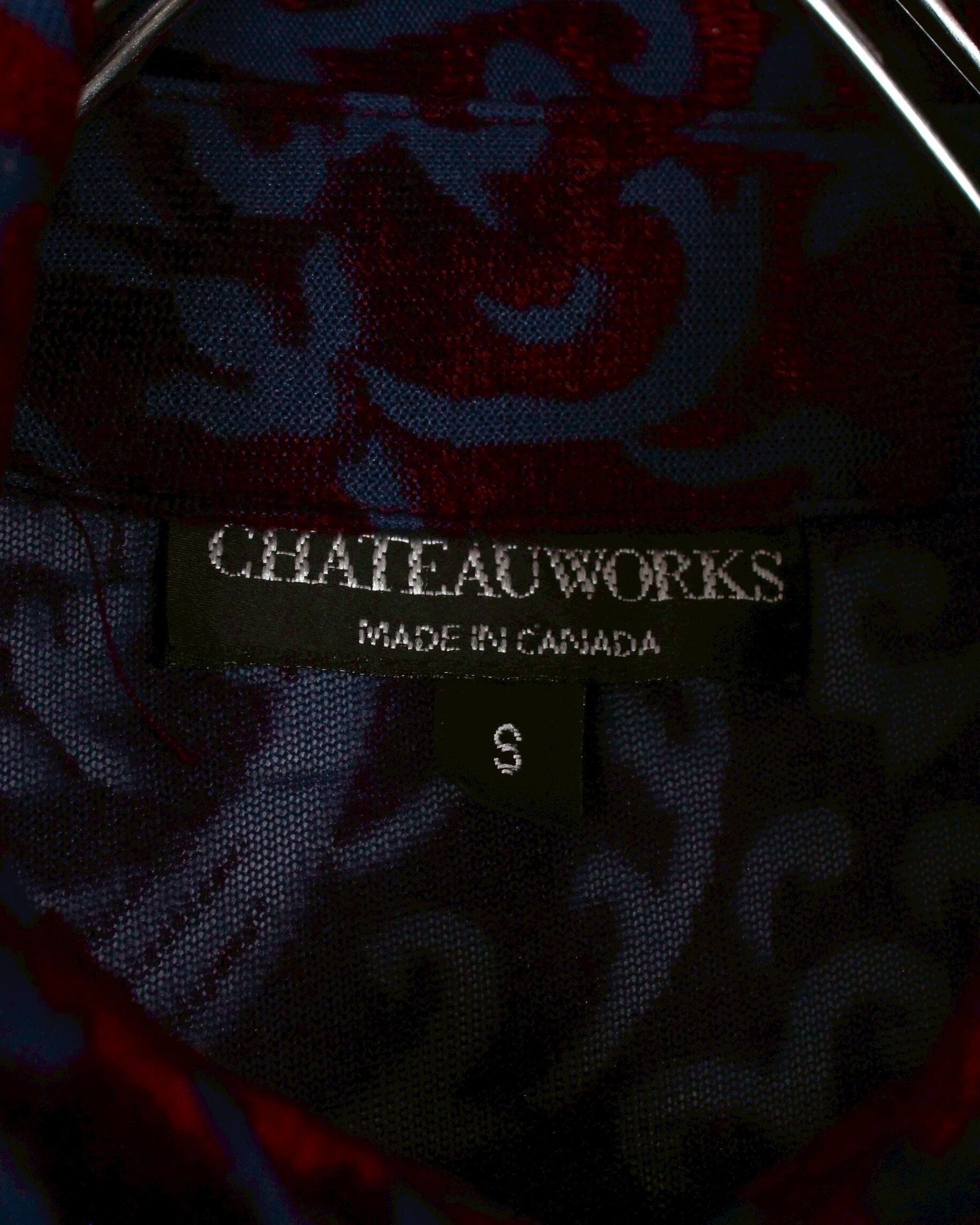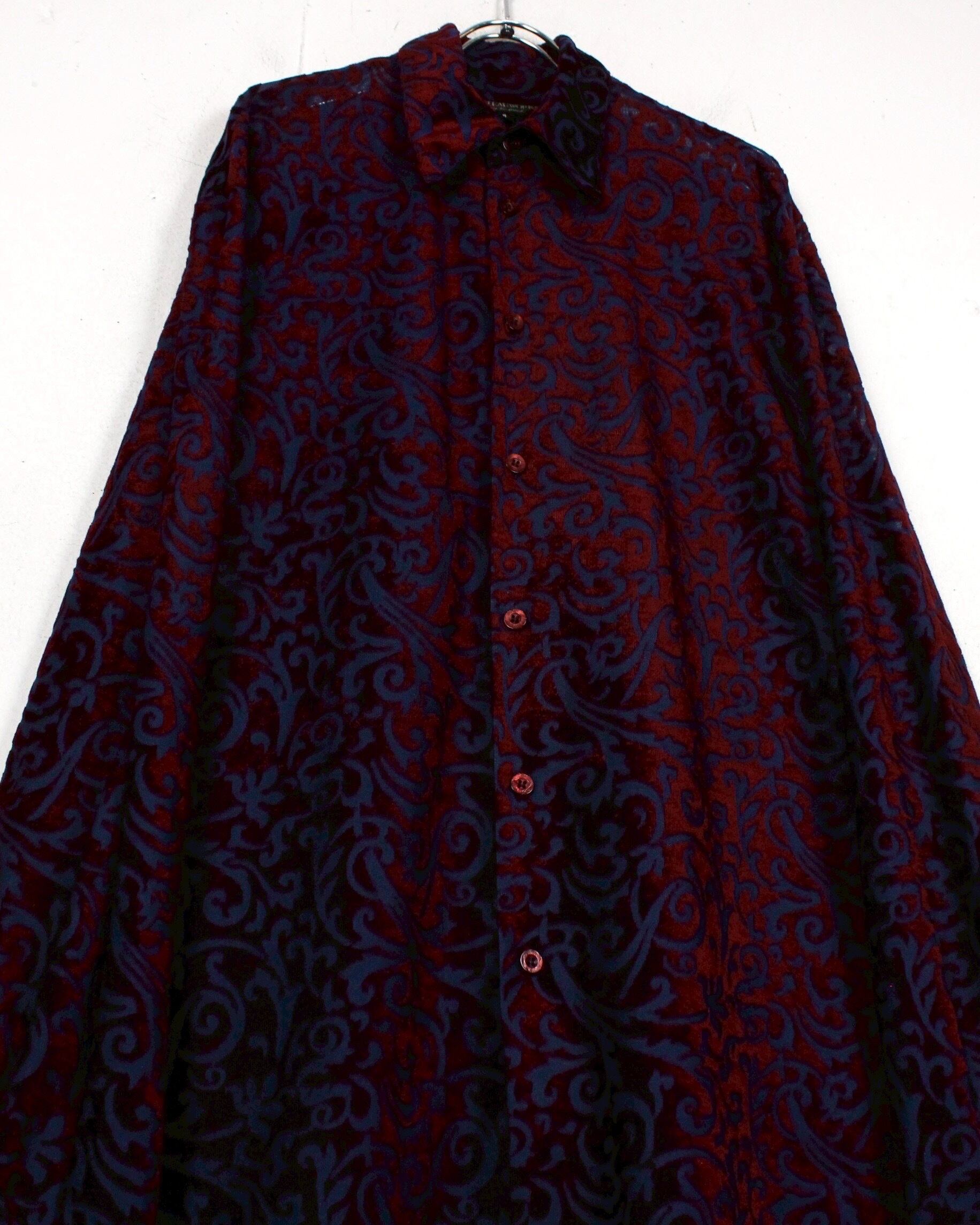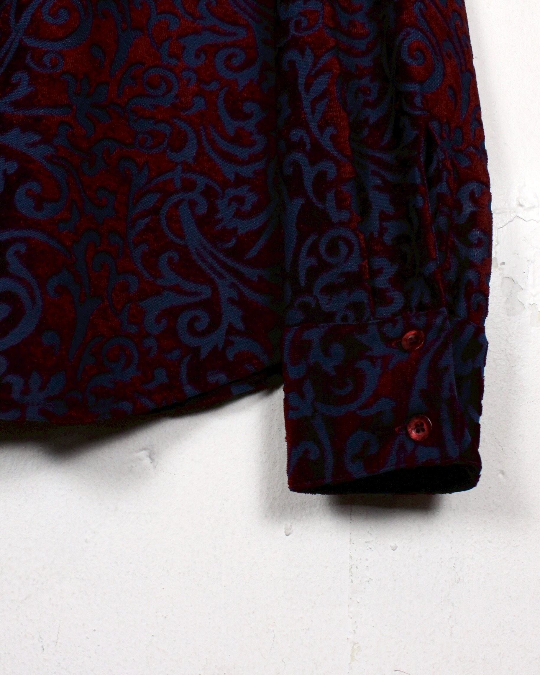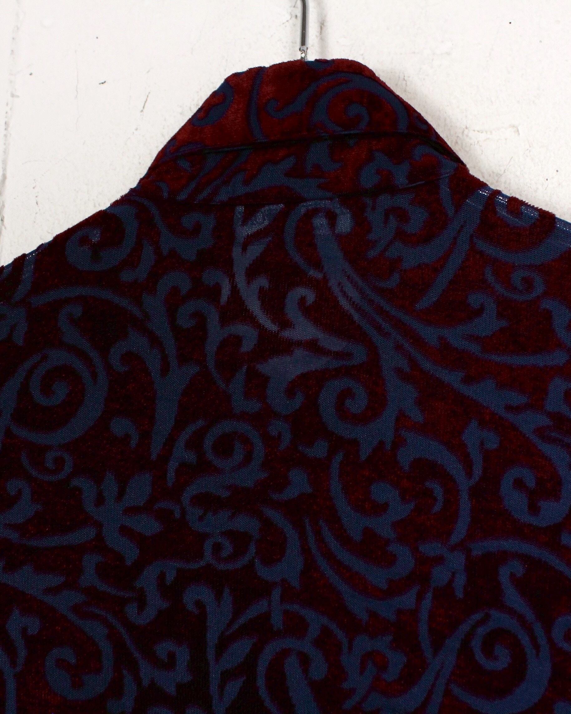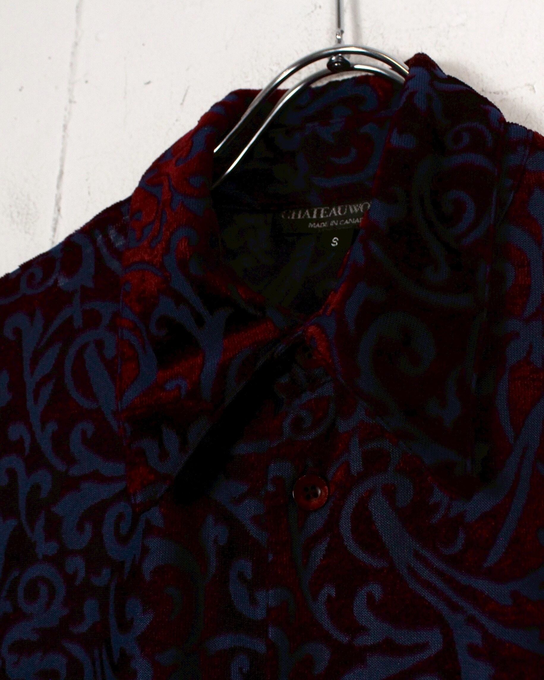 透け感の美しいネイビーカラーのシアー生地のボディに、鈍い光沢を帯びたボルドーのベロアによるフロッキープリントで、ダマスク柄を載せたシアーシャツ。