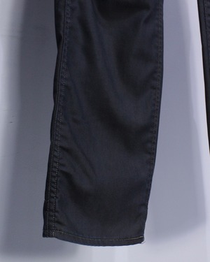 スッキリと纏め上げられた上品なシルエットのブラックジーンズにワックス加工が施され、パキッとした立体感とマッドな光沢がジーンズの武骨さとラグジュアリーな表情を両立させる、スペシャルな1着。