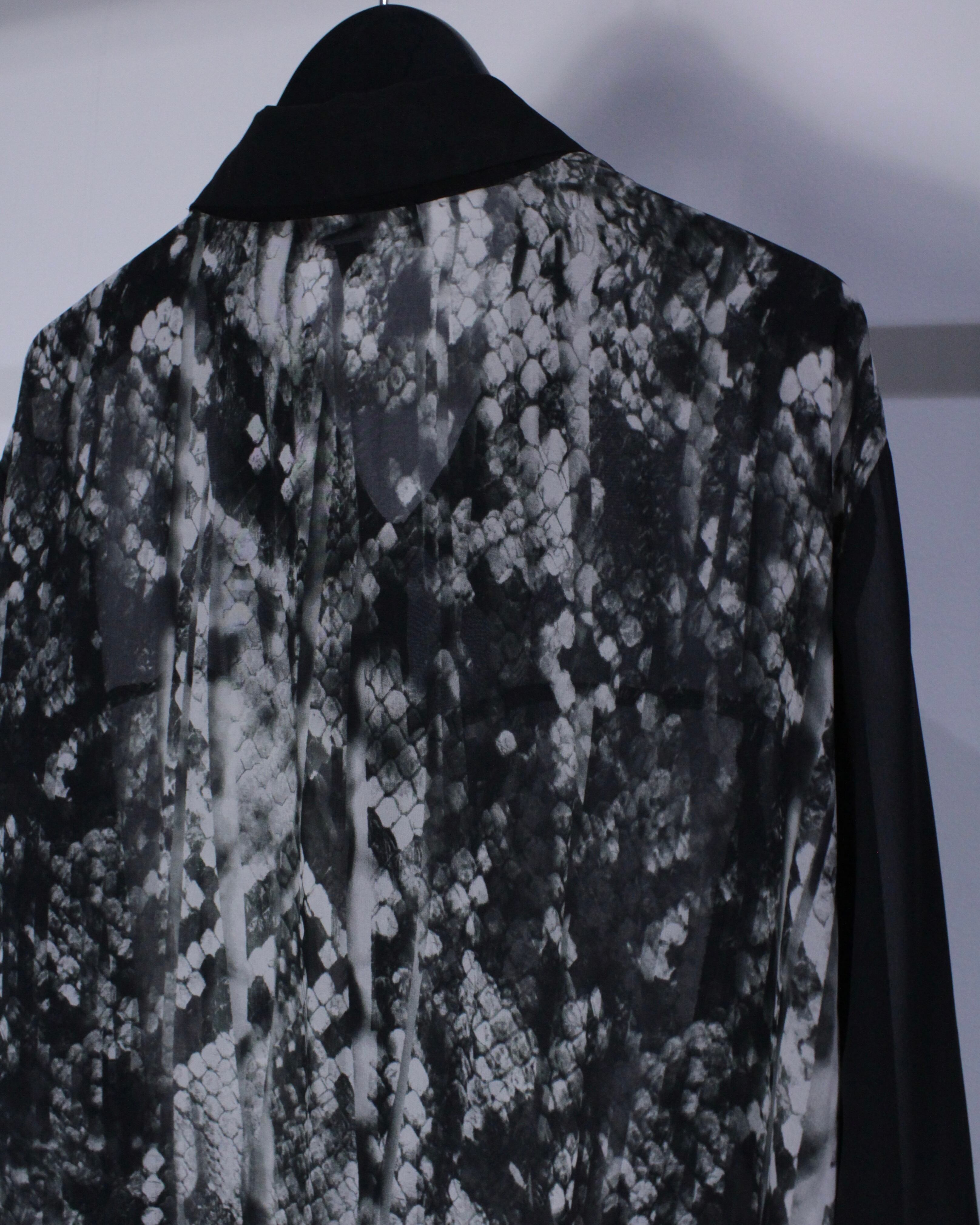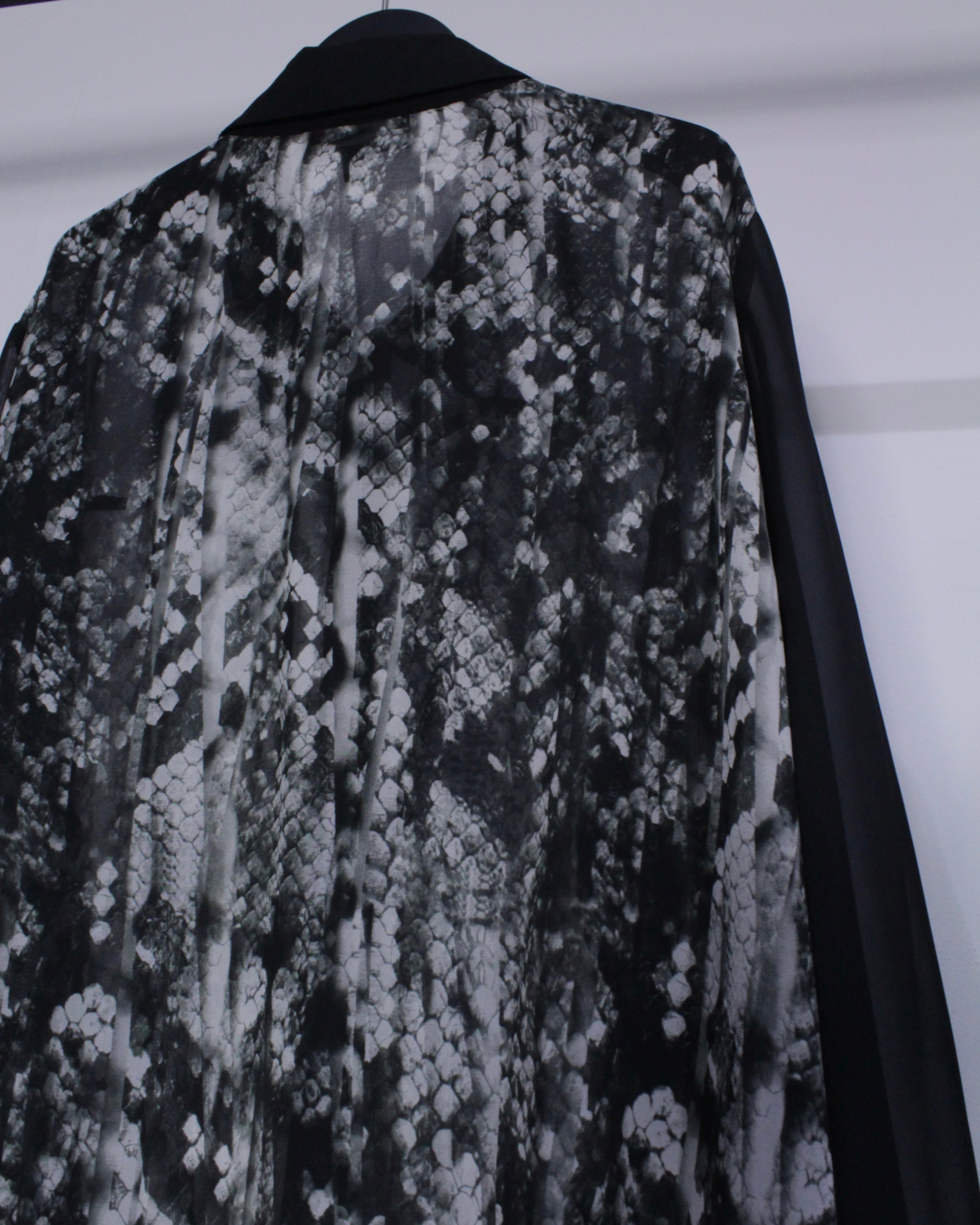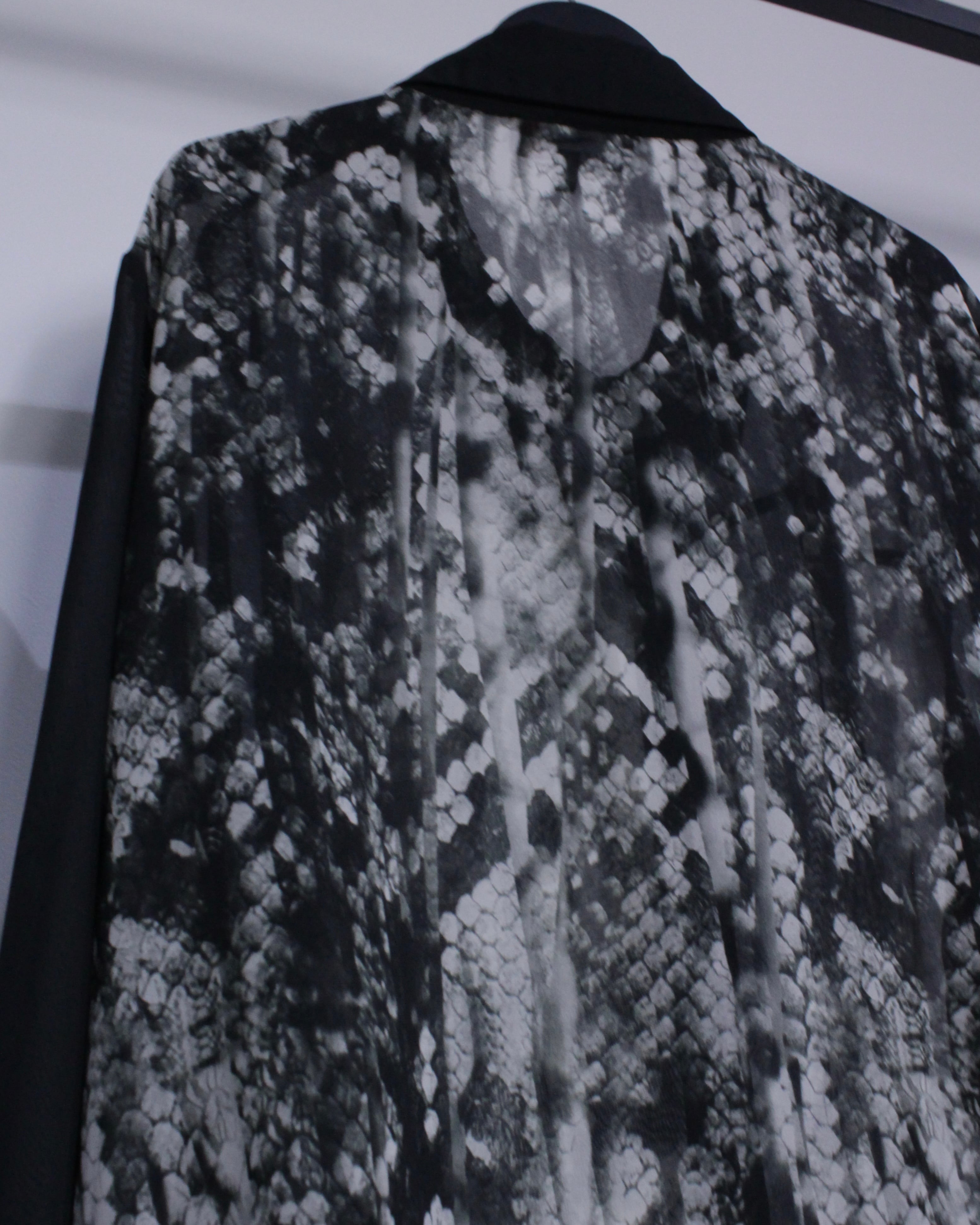 身頃にパイソン柄、襟やアームには無地の生地を切り替え、パイソン柄が程よく主張する仕上がりとなっています。