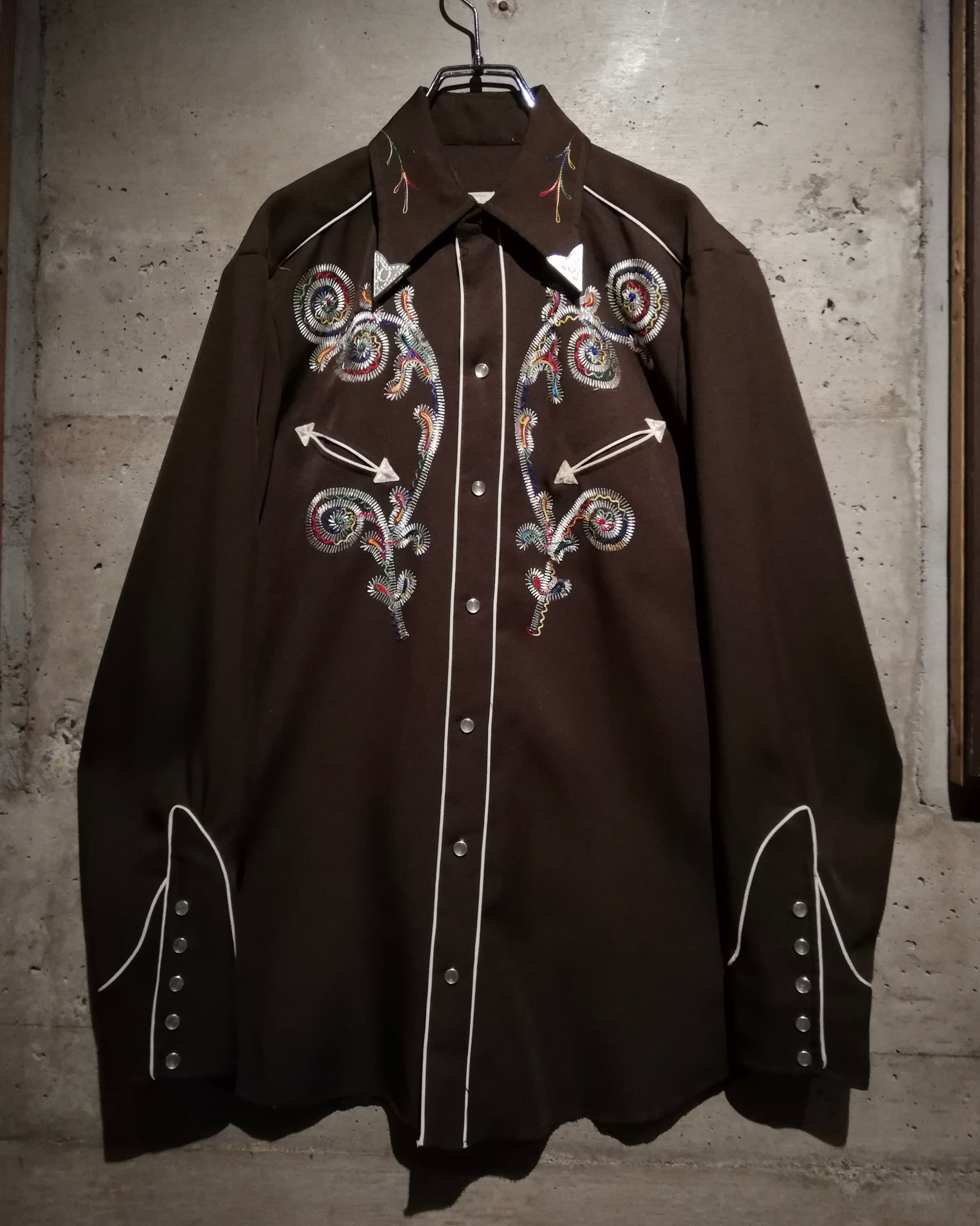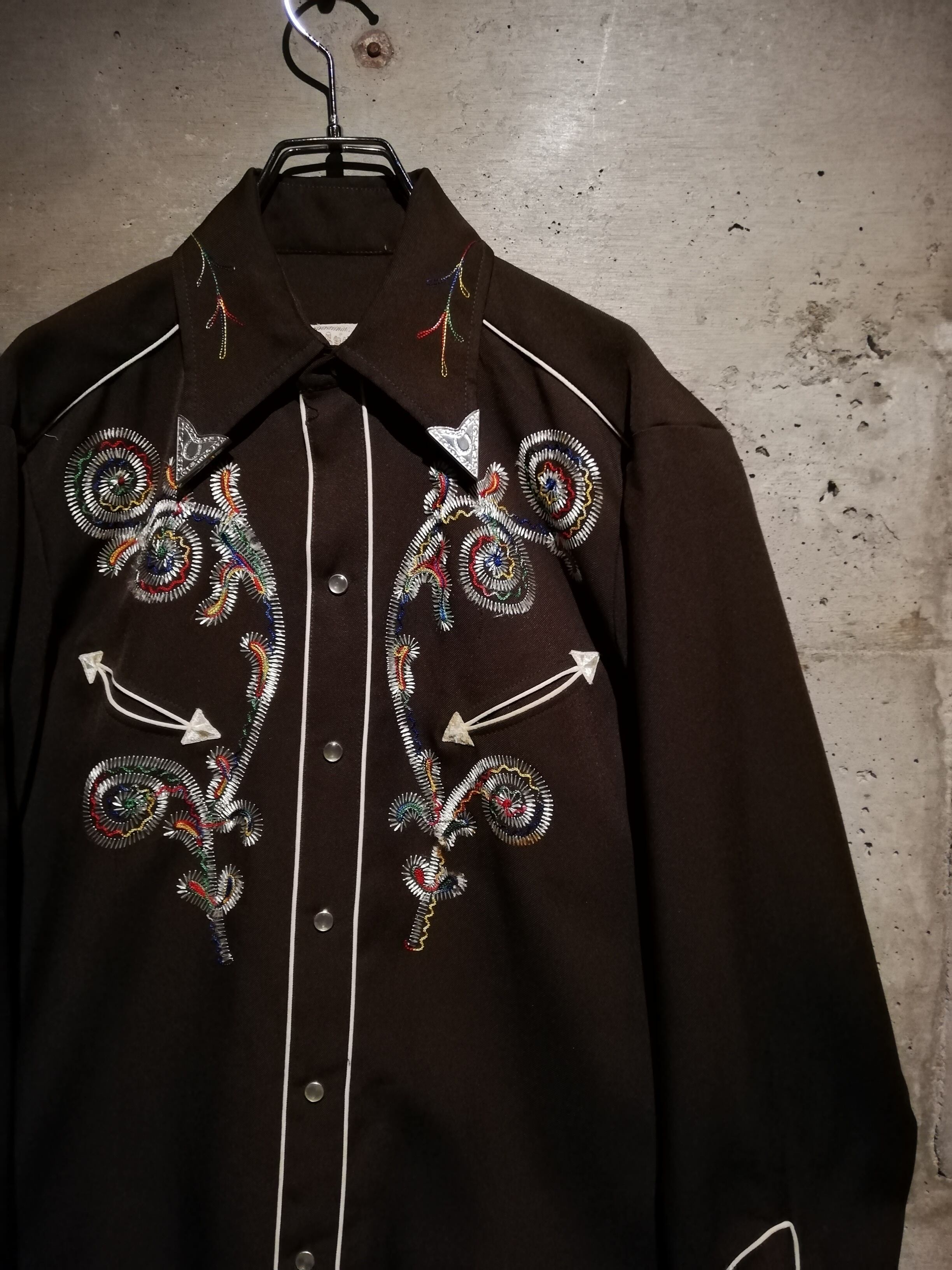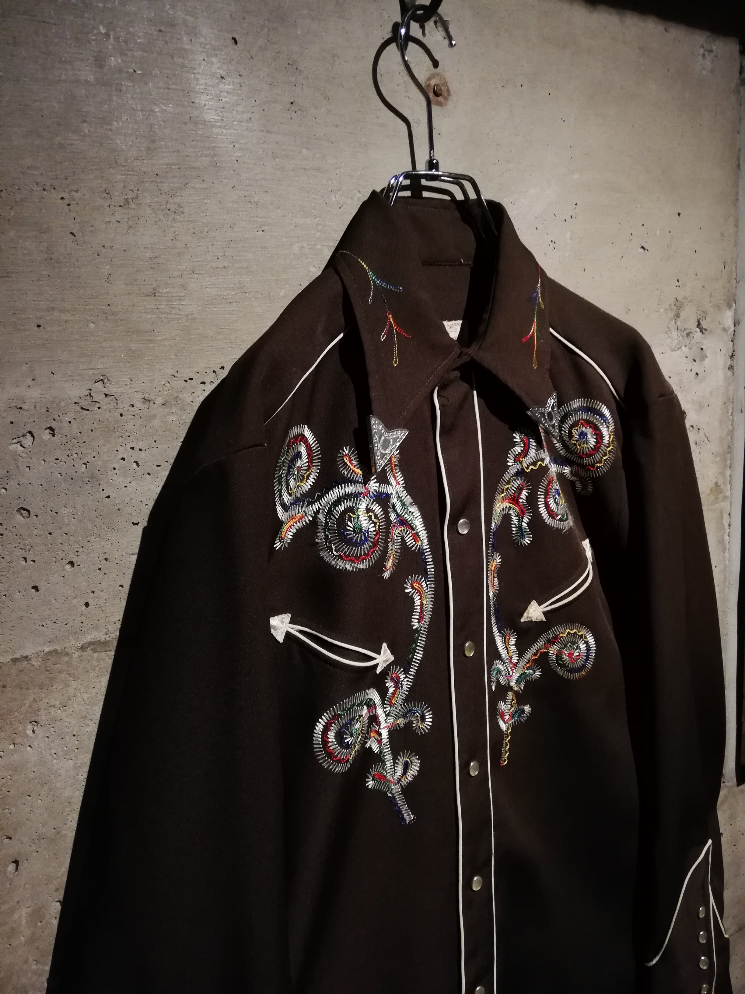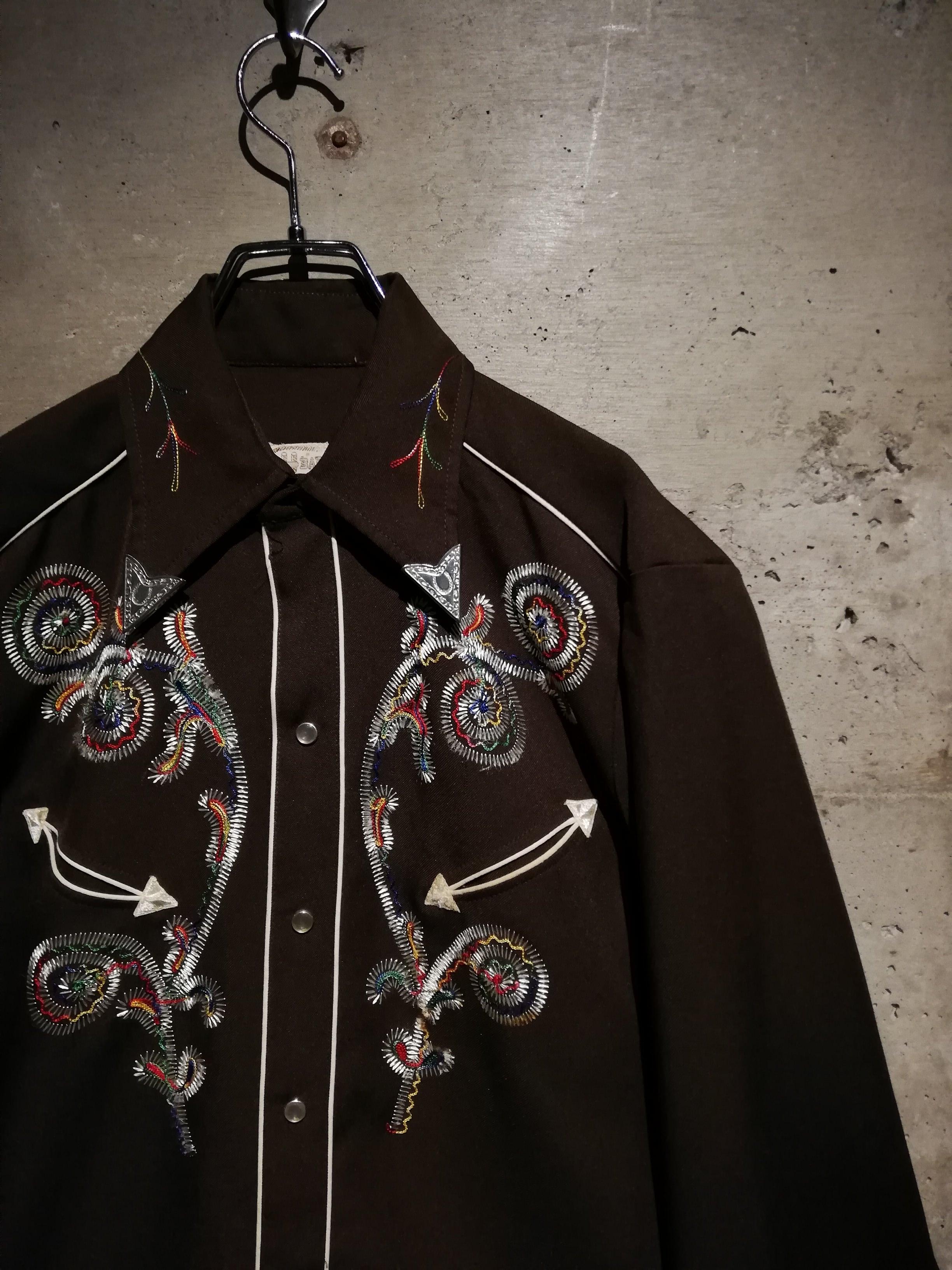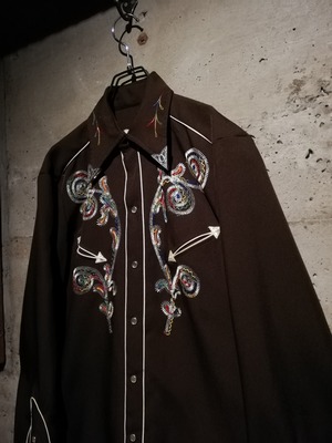 ブラウンのボディをベースに、多彩なカラーリングでボタニカルな刺繍を刻んだ70'sヴィンテージのウエスタンシャツ。