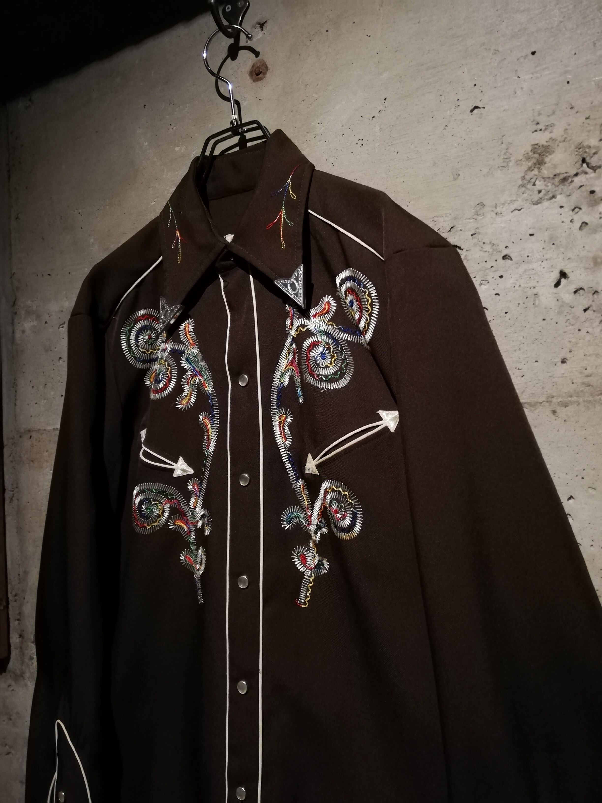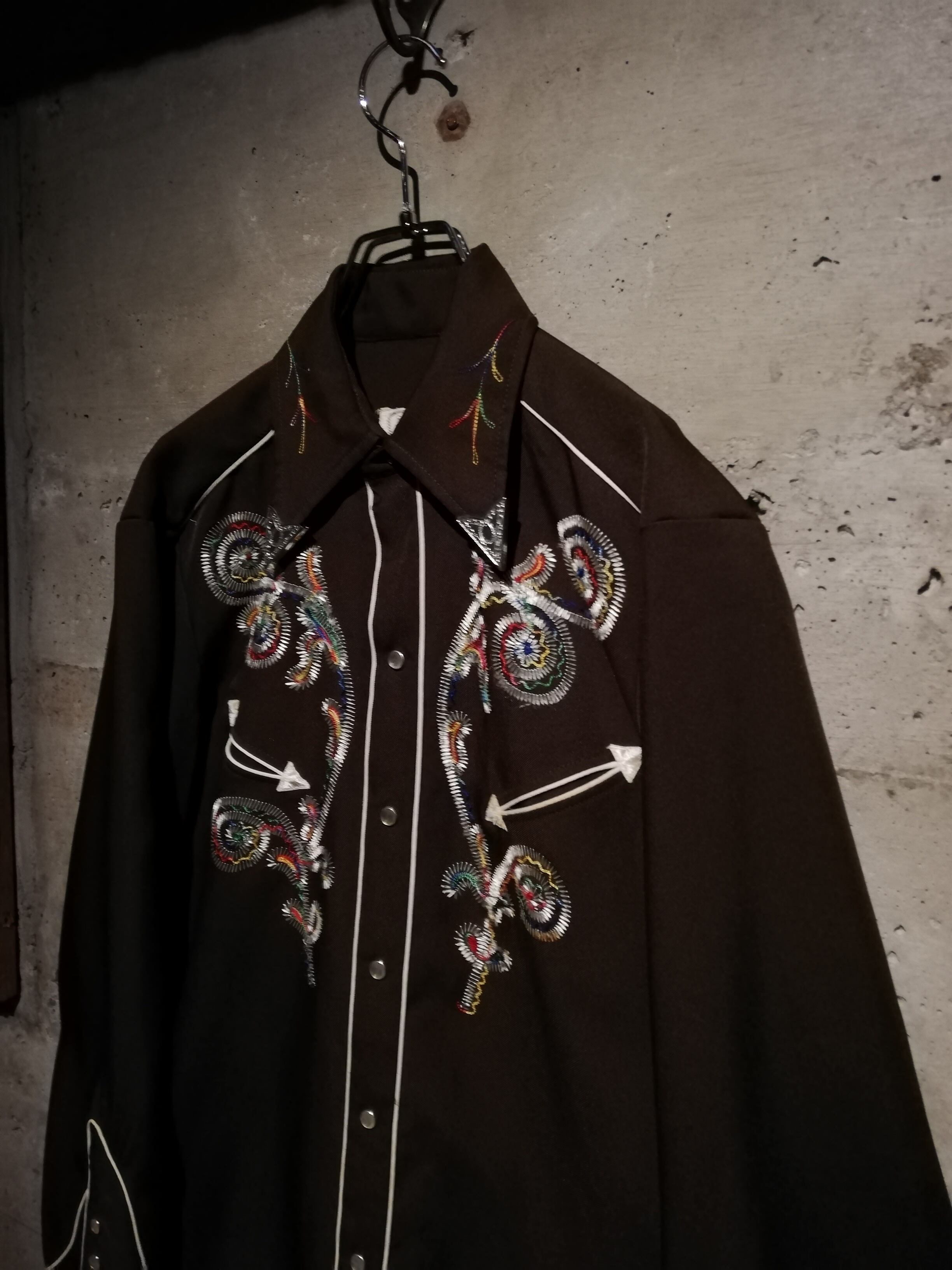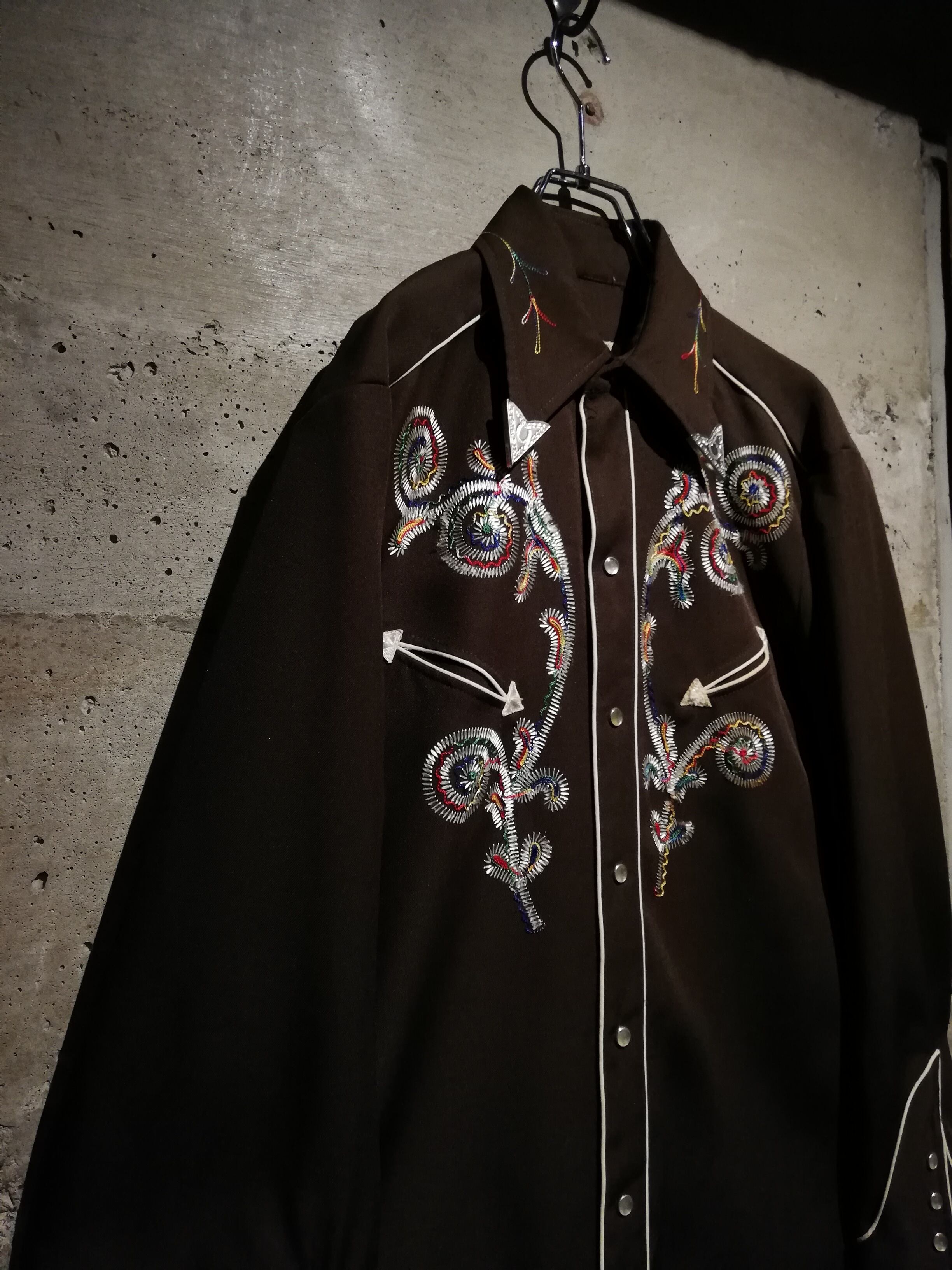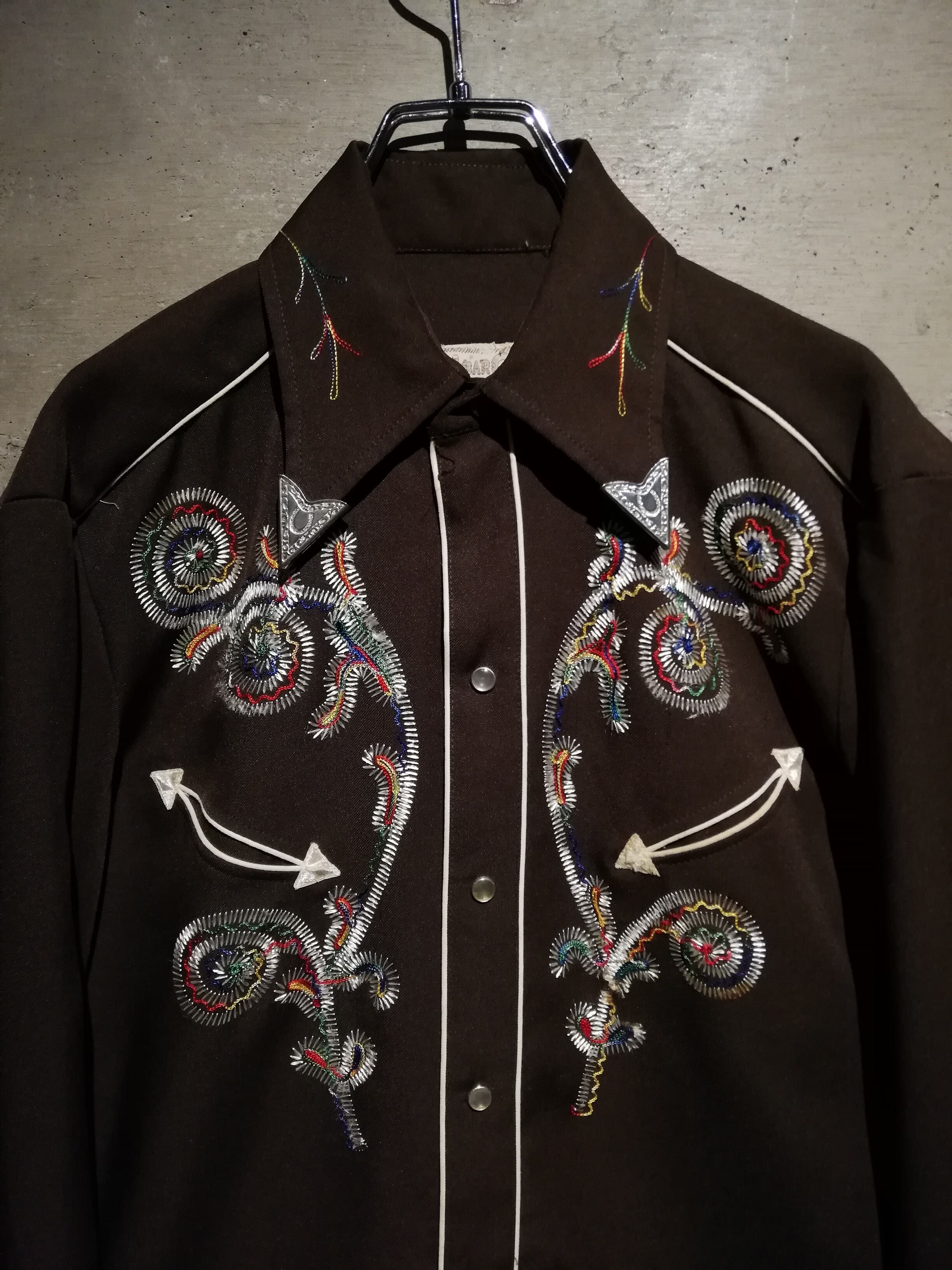 ブラウンのボディをベースに、多彩なカラーリングでボタニカルな刺繍を刻んだ70'sヴィンテージのウエスタンシャツ。