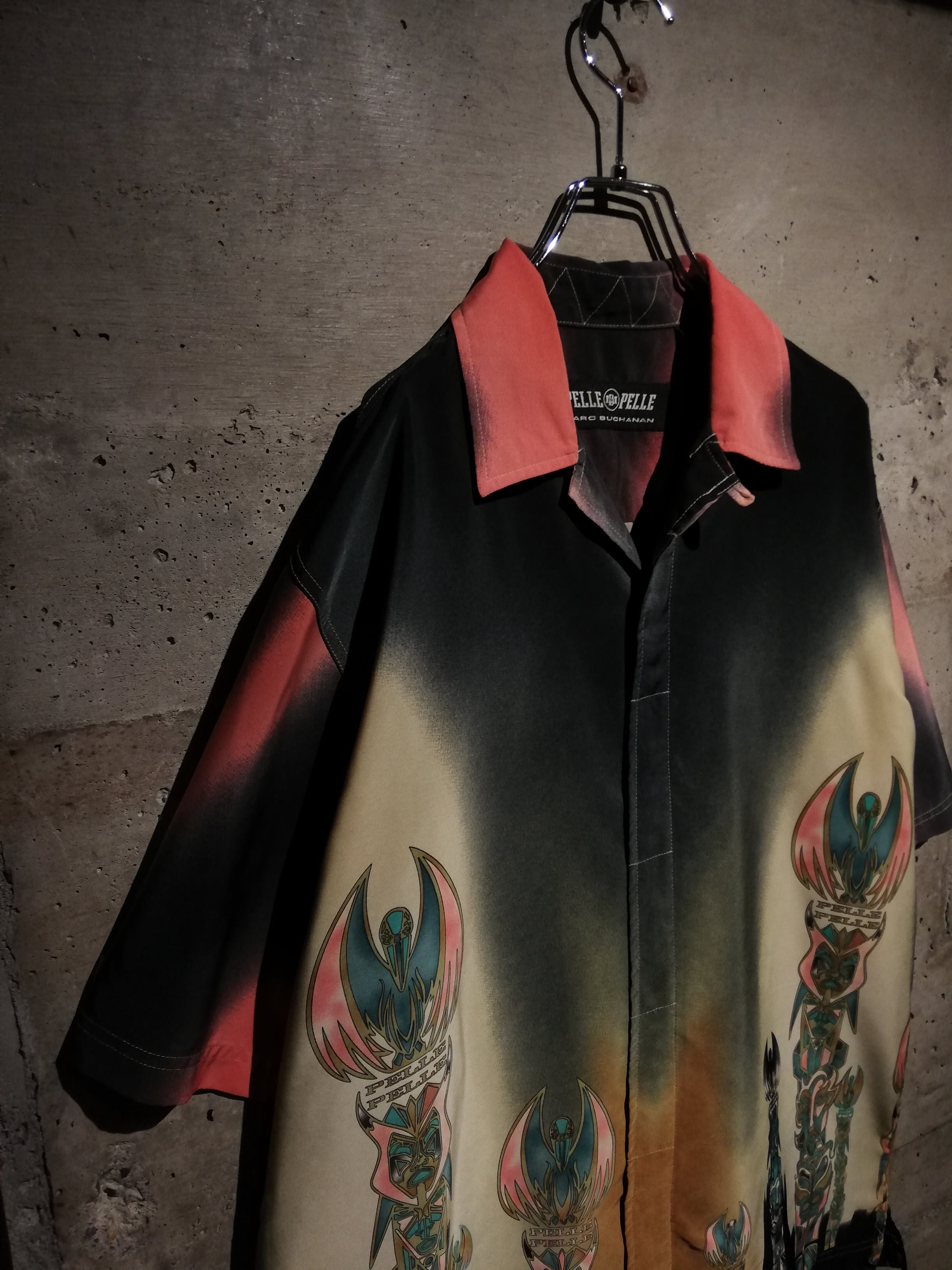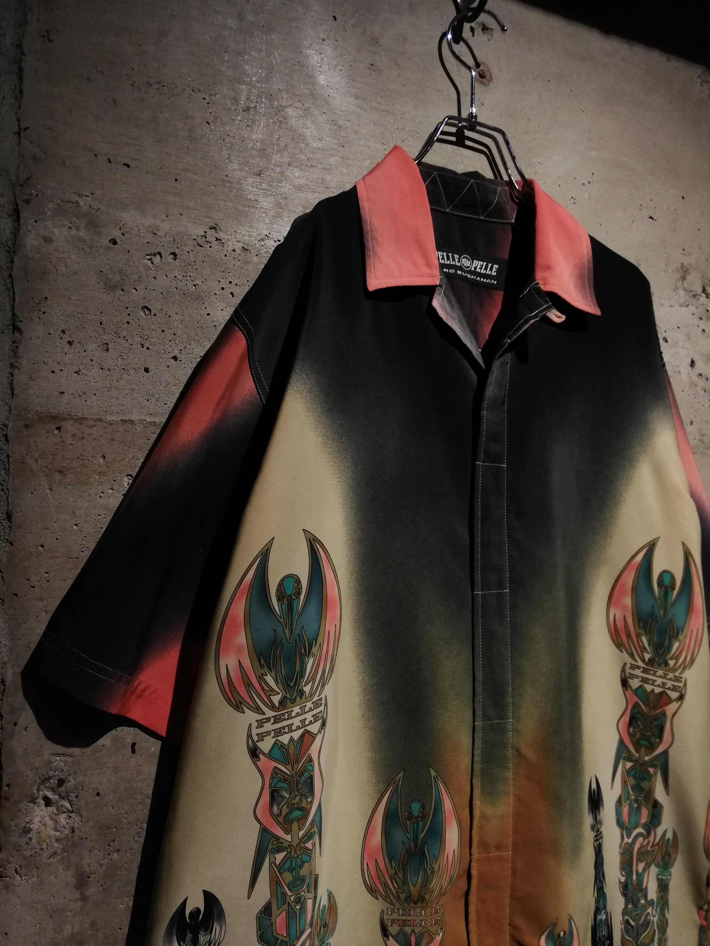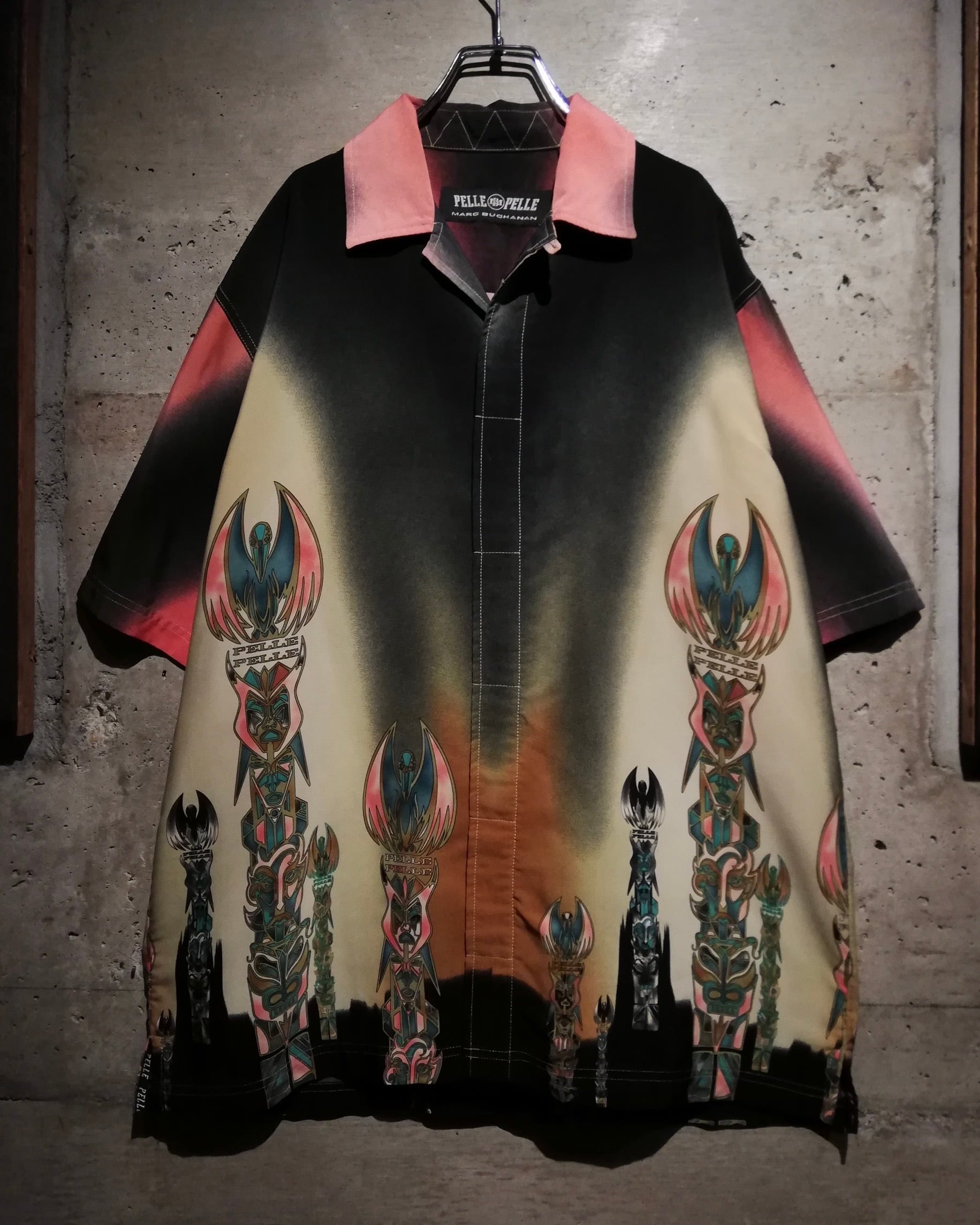 ピンク、黒、黄色などのグラデーションがかったボディに、ブランドロゴ、緻密なタッチで描かれたトーテムポールを組み込んだ、唯一無二な雰囲気をムンムンに漂わせつつ、ストリートにバッチリと映えるこのブランドらしい1枚。