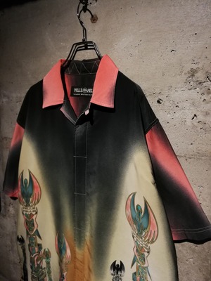ツルッと滑らかな質感のボディに、インディアンの木造彫刻"トーテムポール"を全面に載せた半袖シャツ。