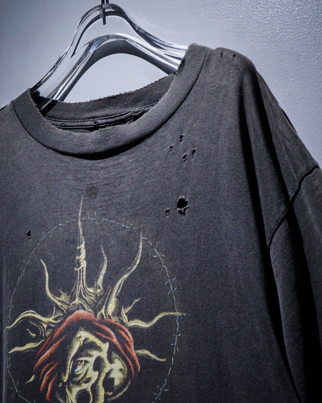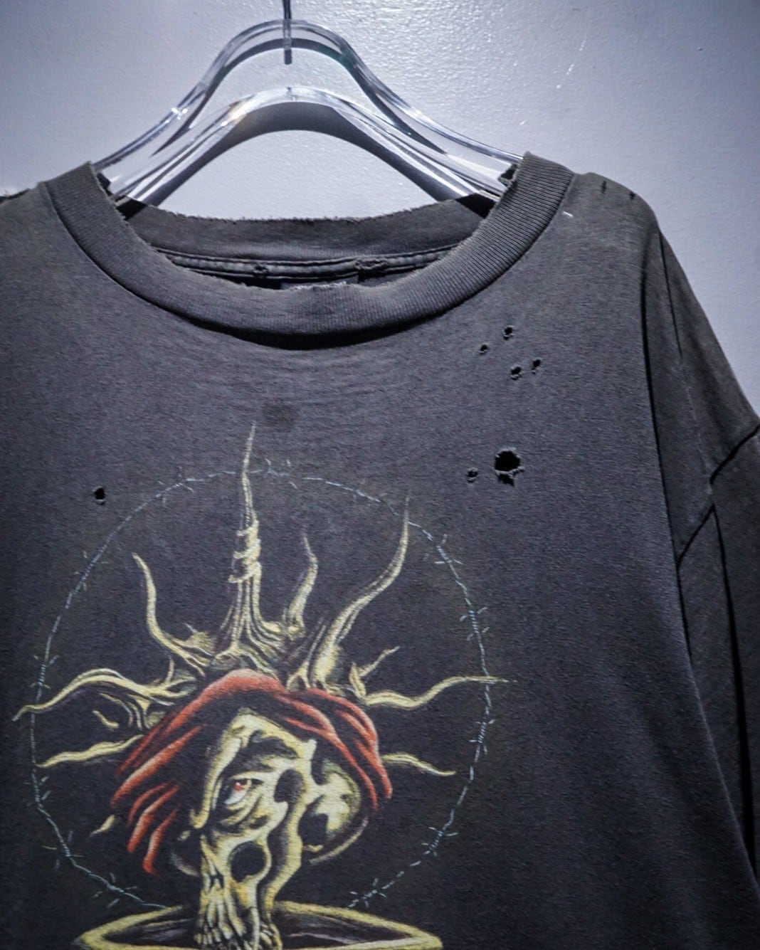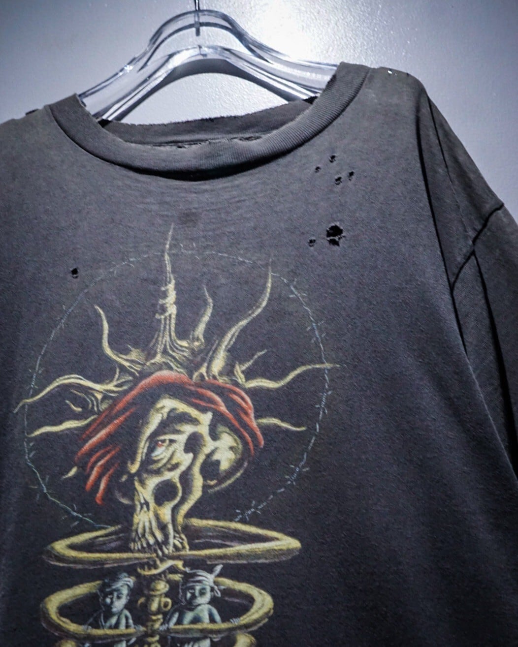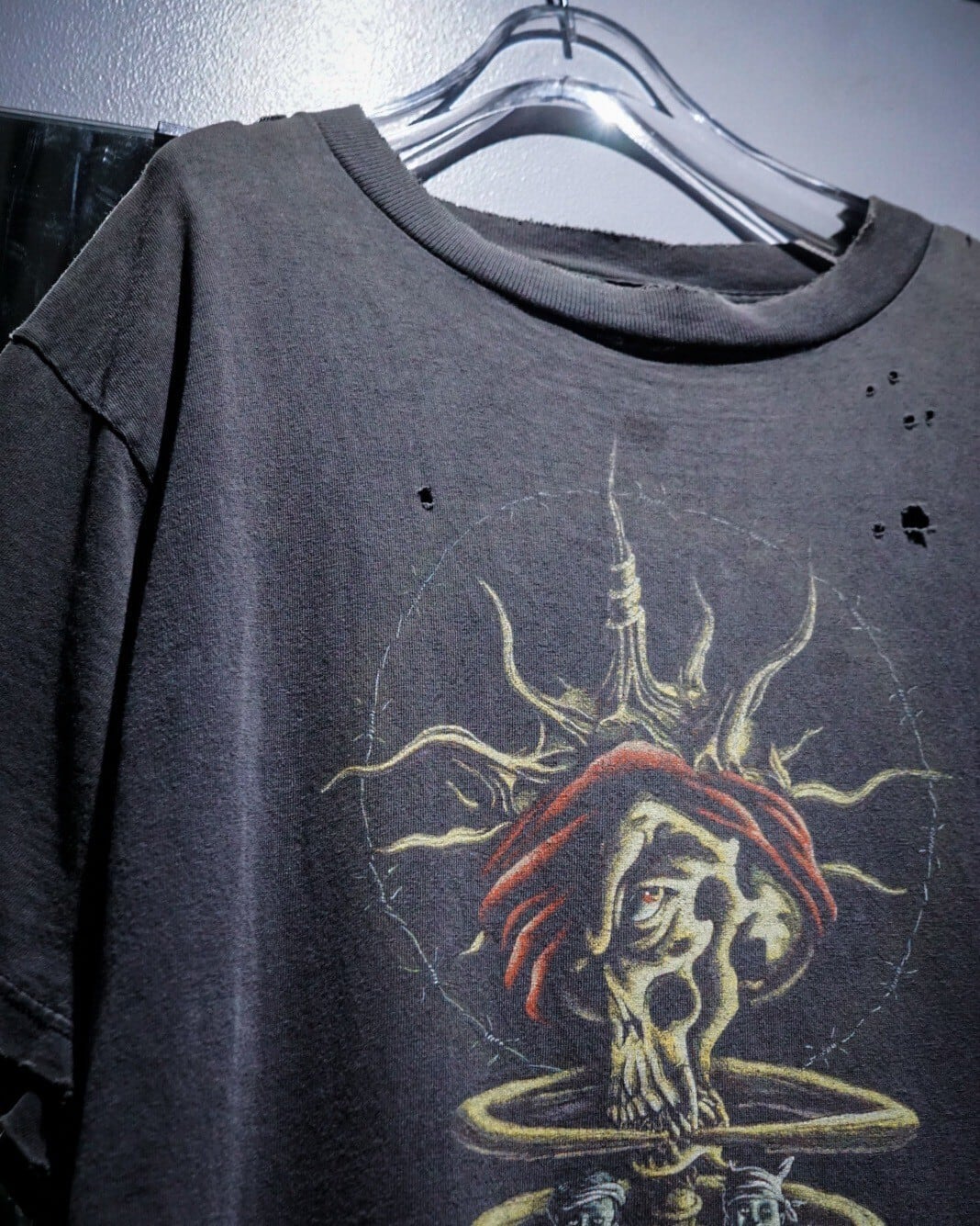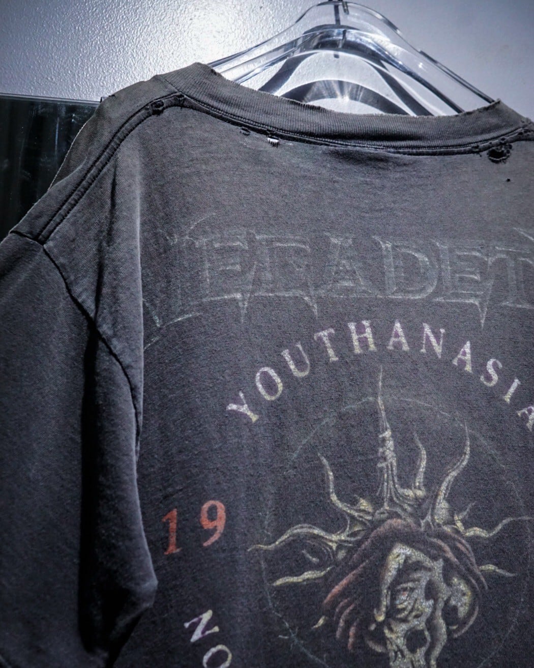 フロント、背面にはメガデスらしい雰囲気を漂わせるアートワークのプリント。ボディ全体が経年によってフェードし、絶妙なボロ感がより一層アイテムの雰囲気を引き立てています。
