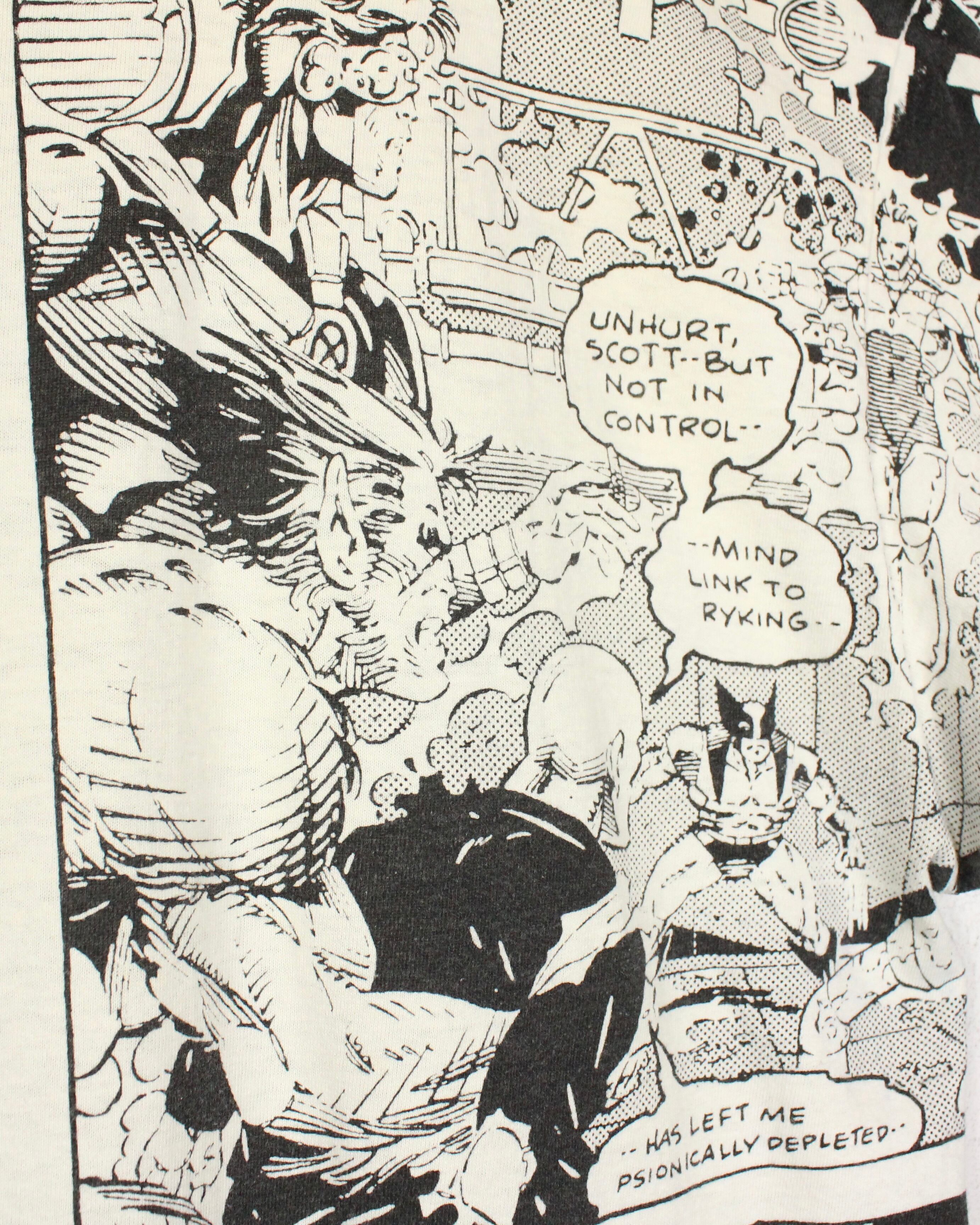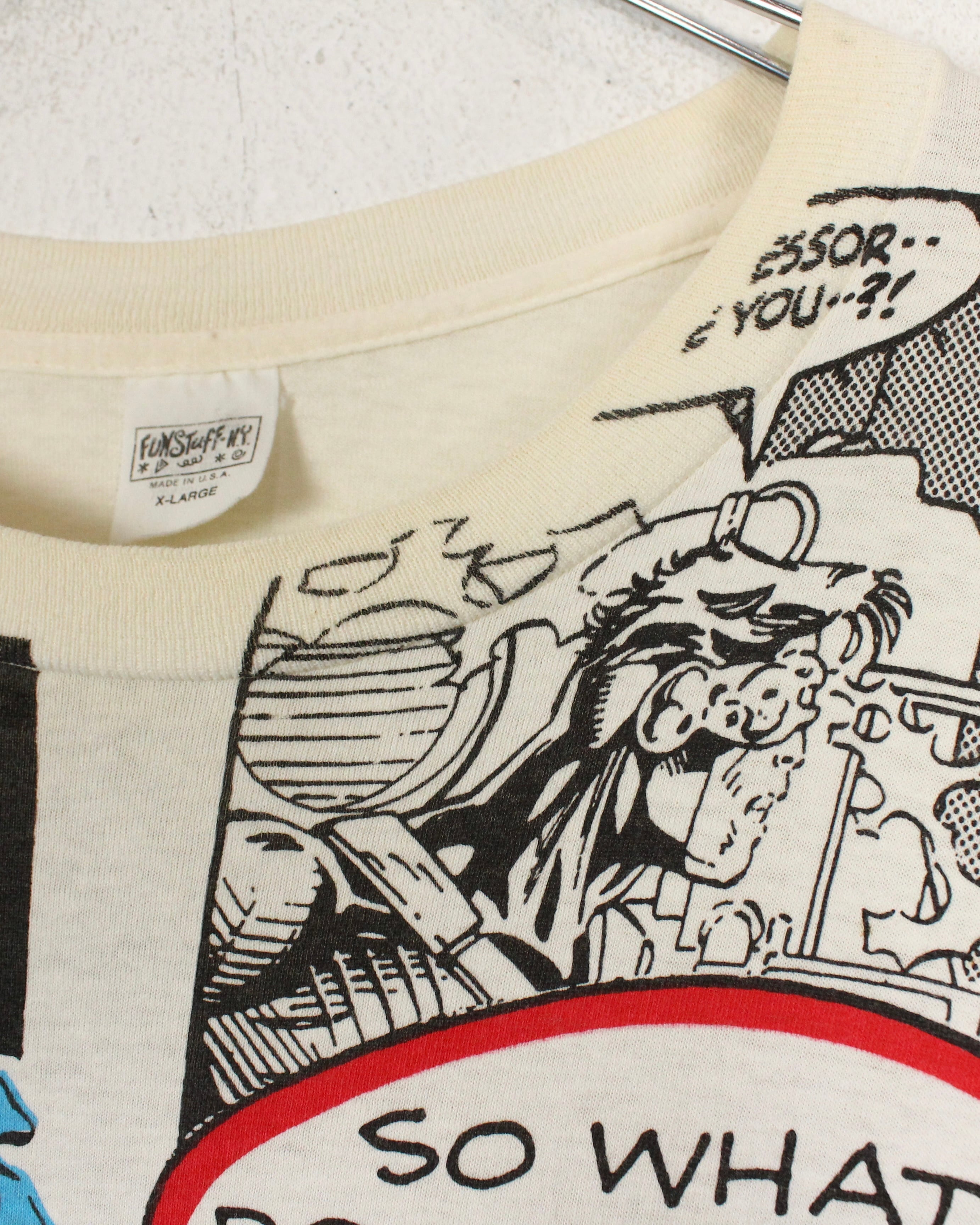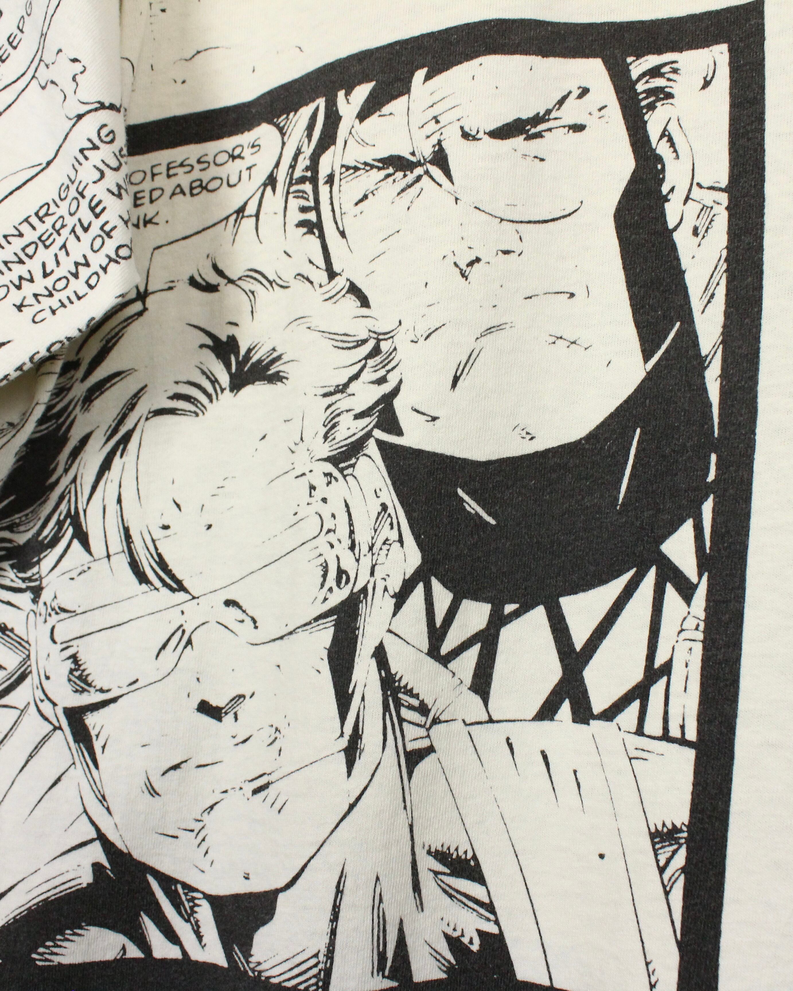 X‑MENのビーストを中心に、「SO WHAT DO WE TELL THE OTHERS?」という吹き出しと共に、コミックのページをシルクスクリーンでボディ全体にプリントしたTシャツ。