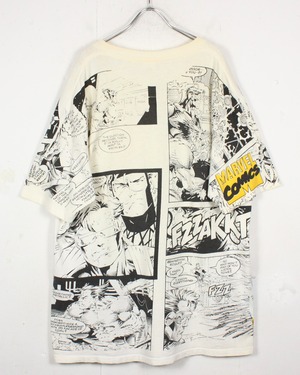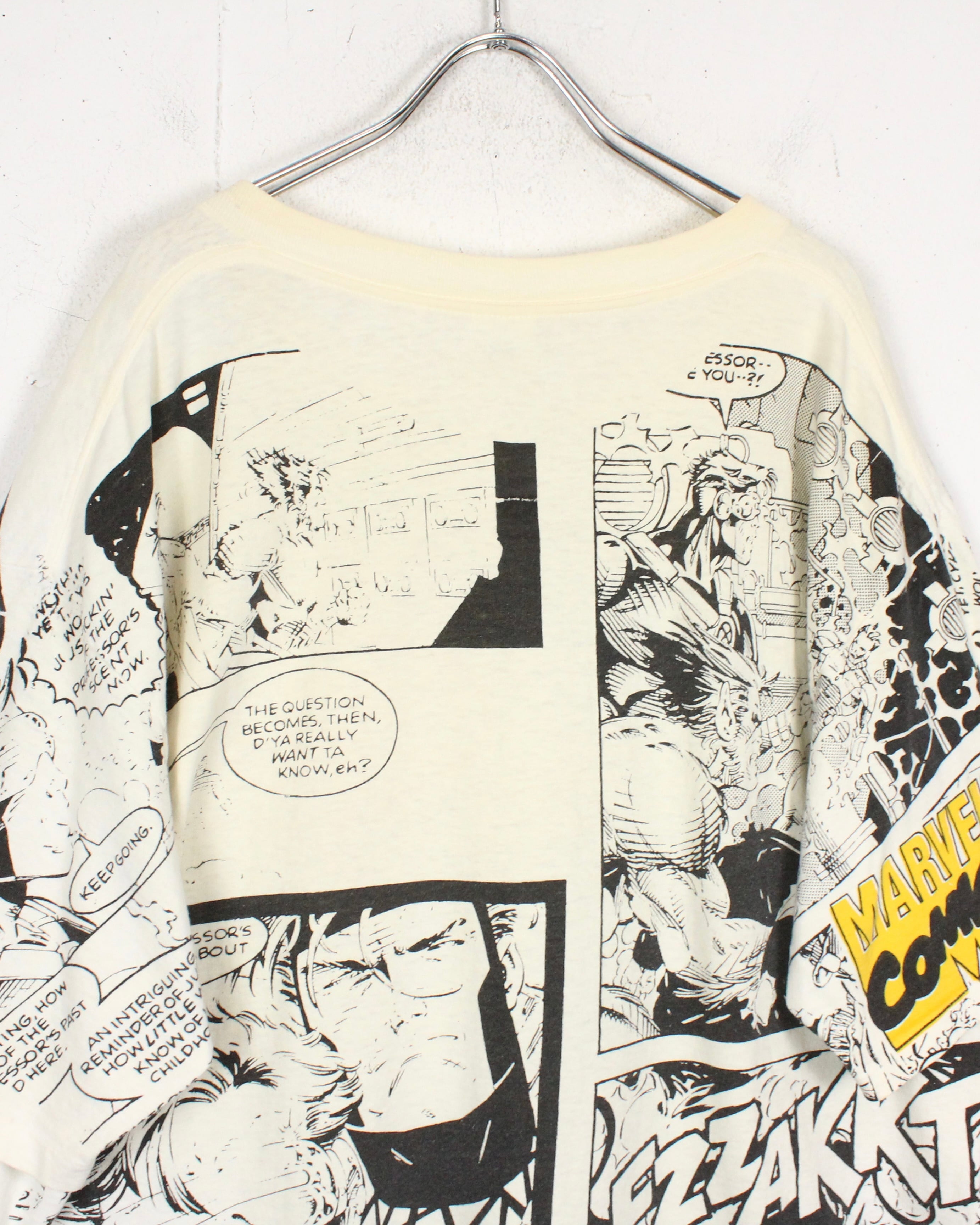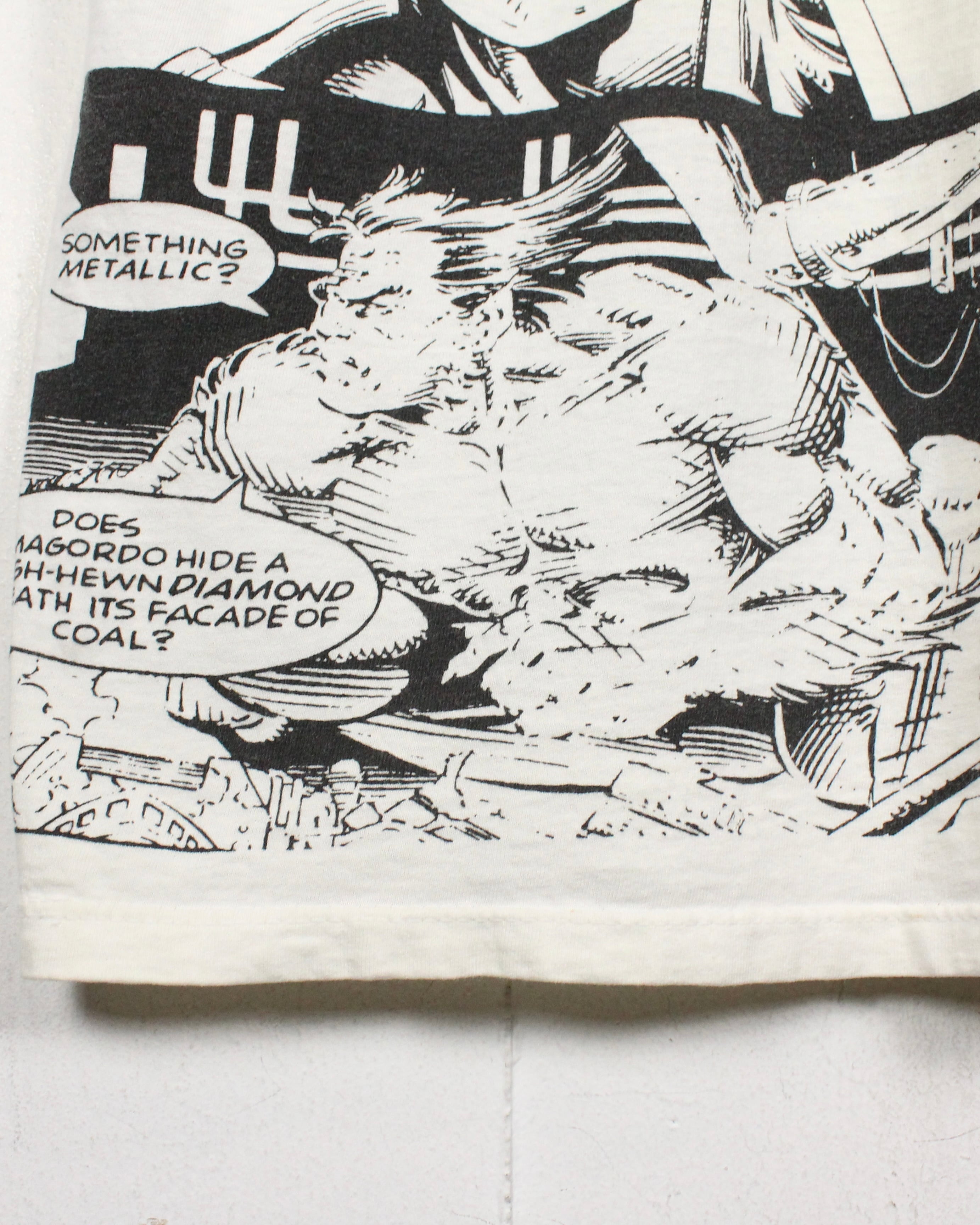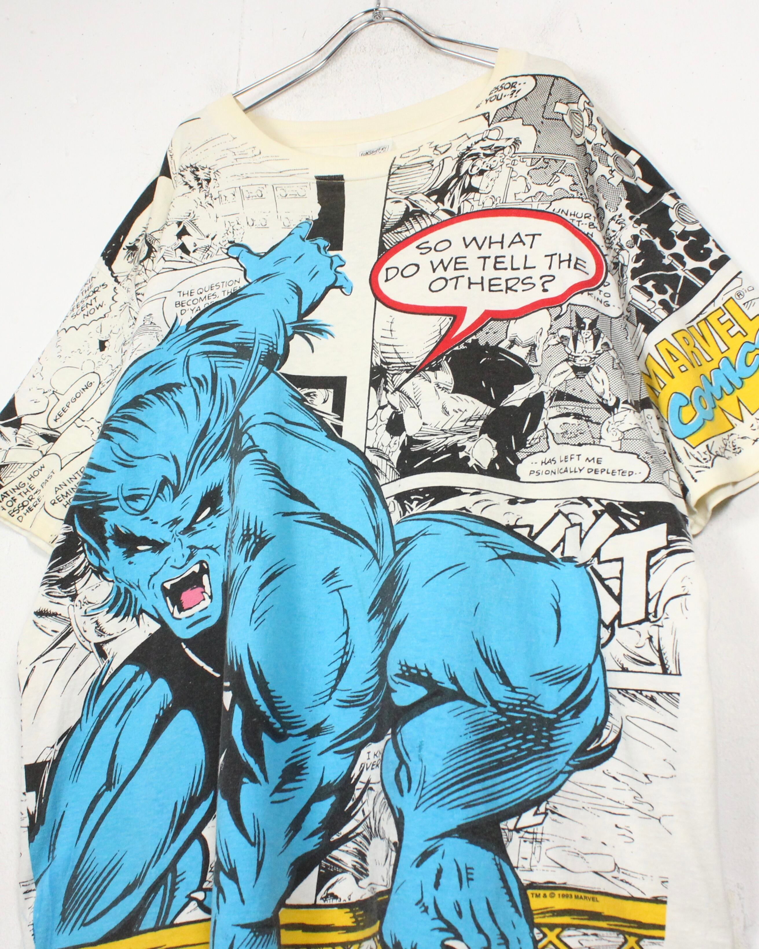 X‑MENのビーストを中心に、「SO WHAT DO WE TELL THE OTHERS?」という吹き出しと共に、コミックのページをシルクスクリーンでボディ全体にプリントしたTシャツ。