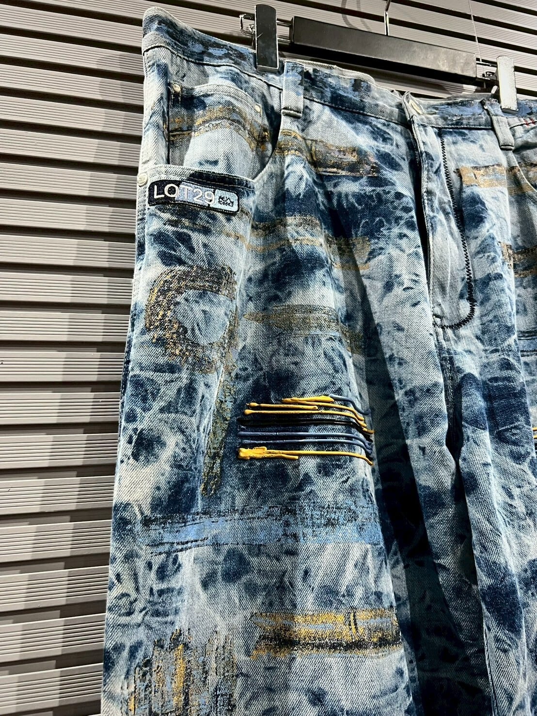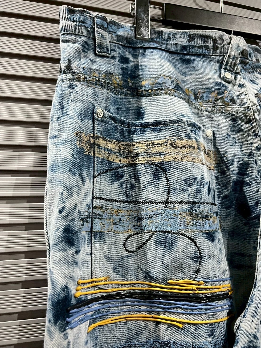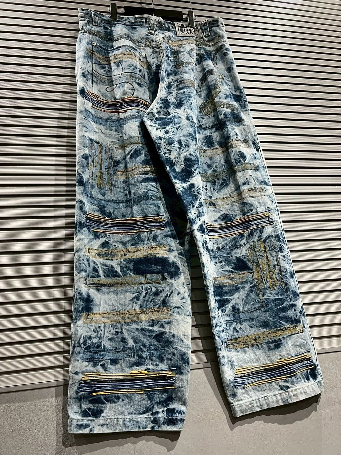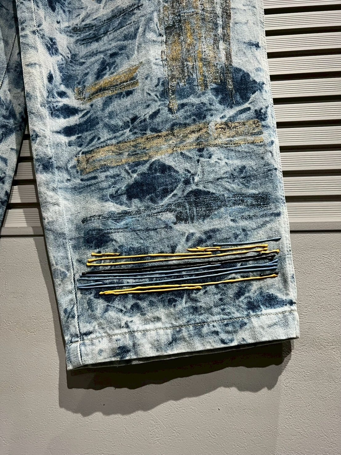 インディゴブルーのボディにブリーチとペイントによってデザインを施したバギーパンツ。