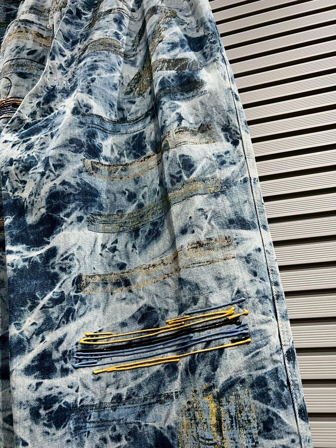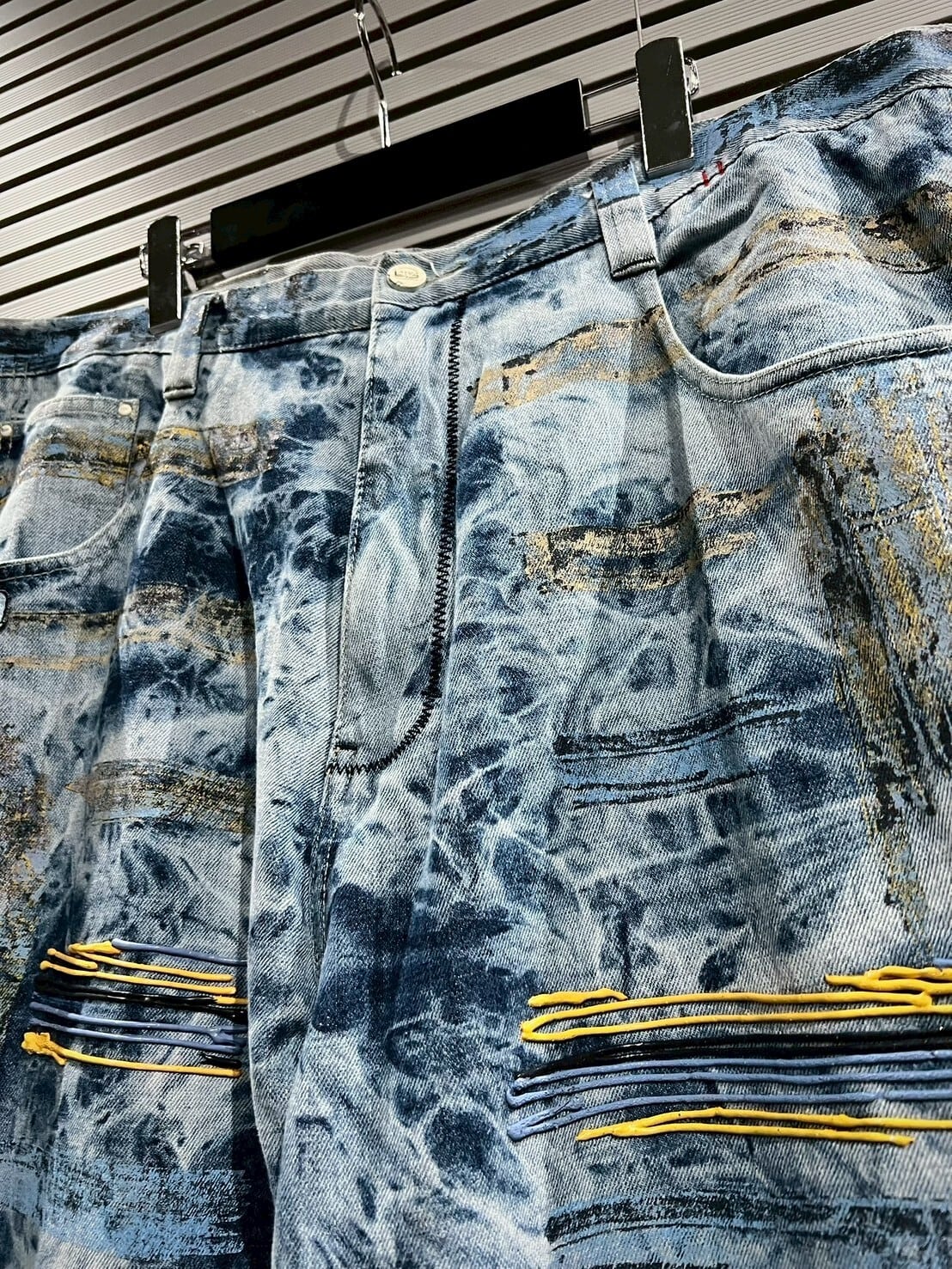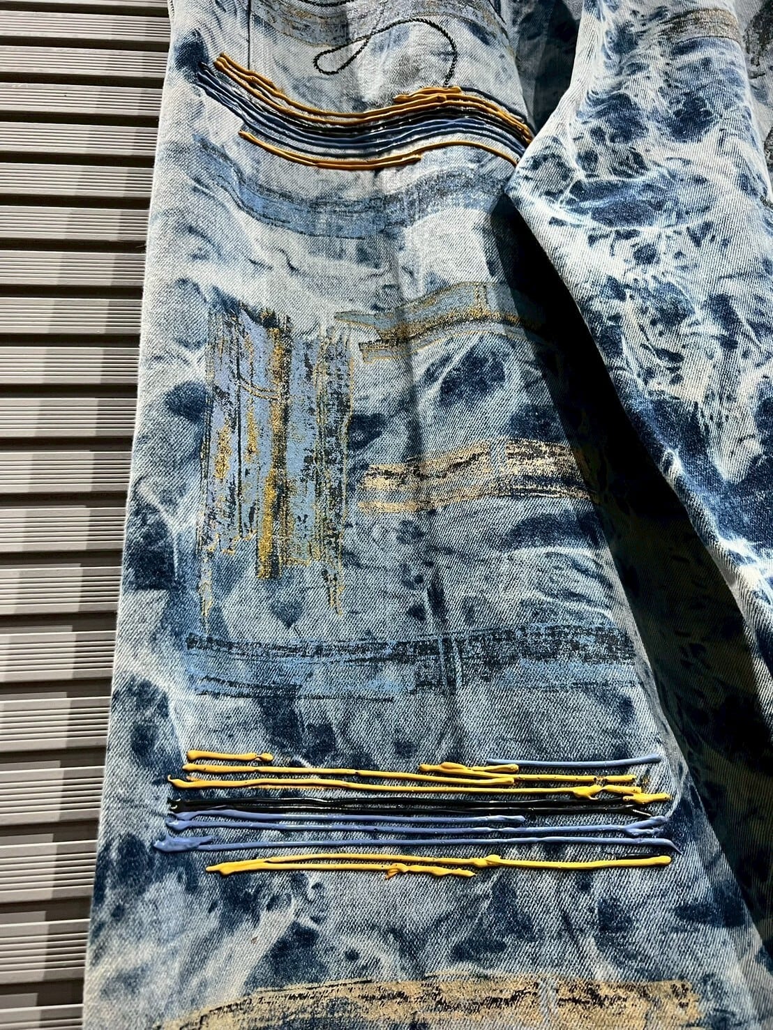 インディゴブルーのボディにブリーチとペイントによってデザインを施したバギーパンツ。