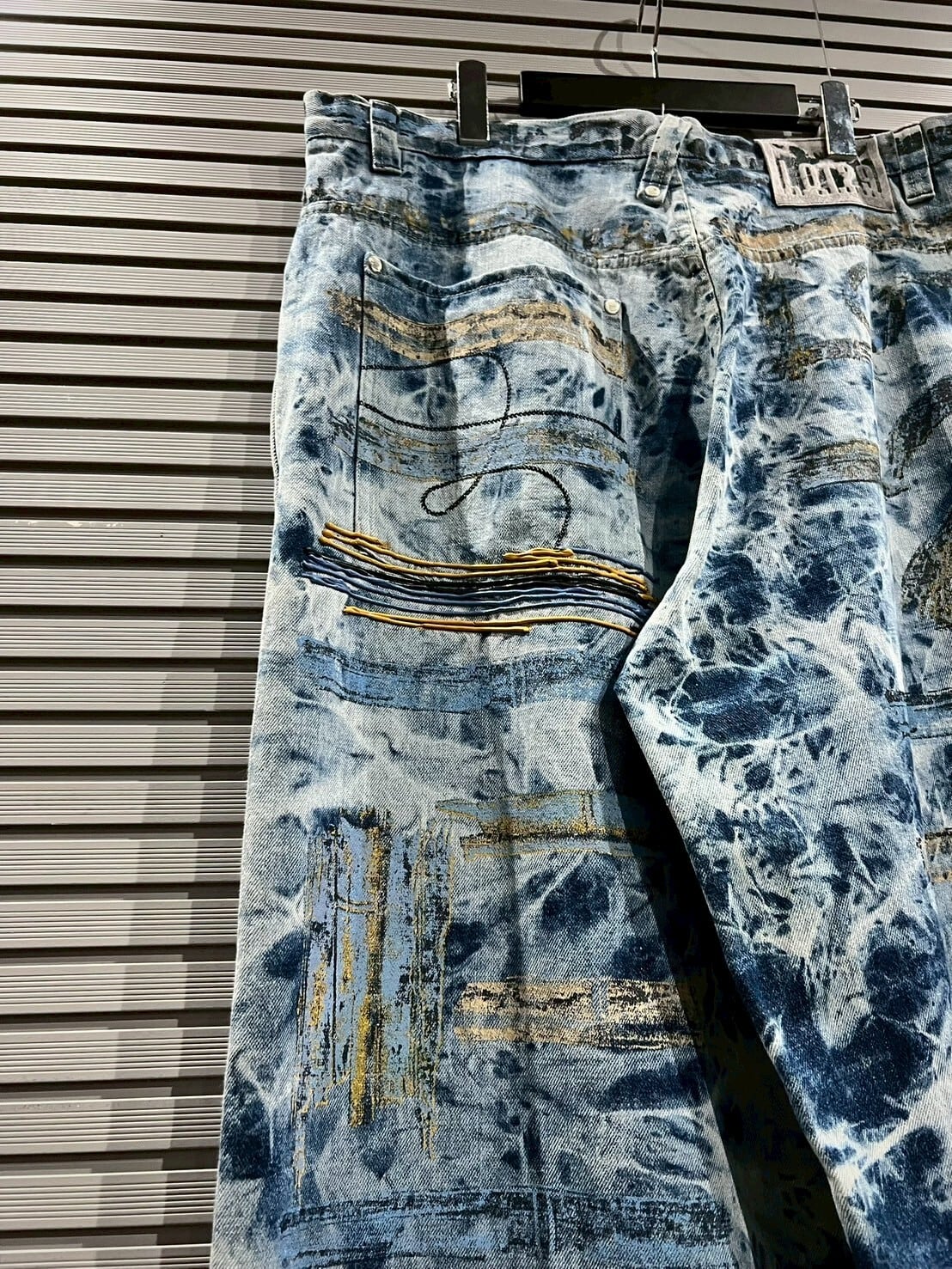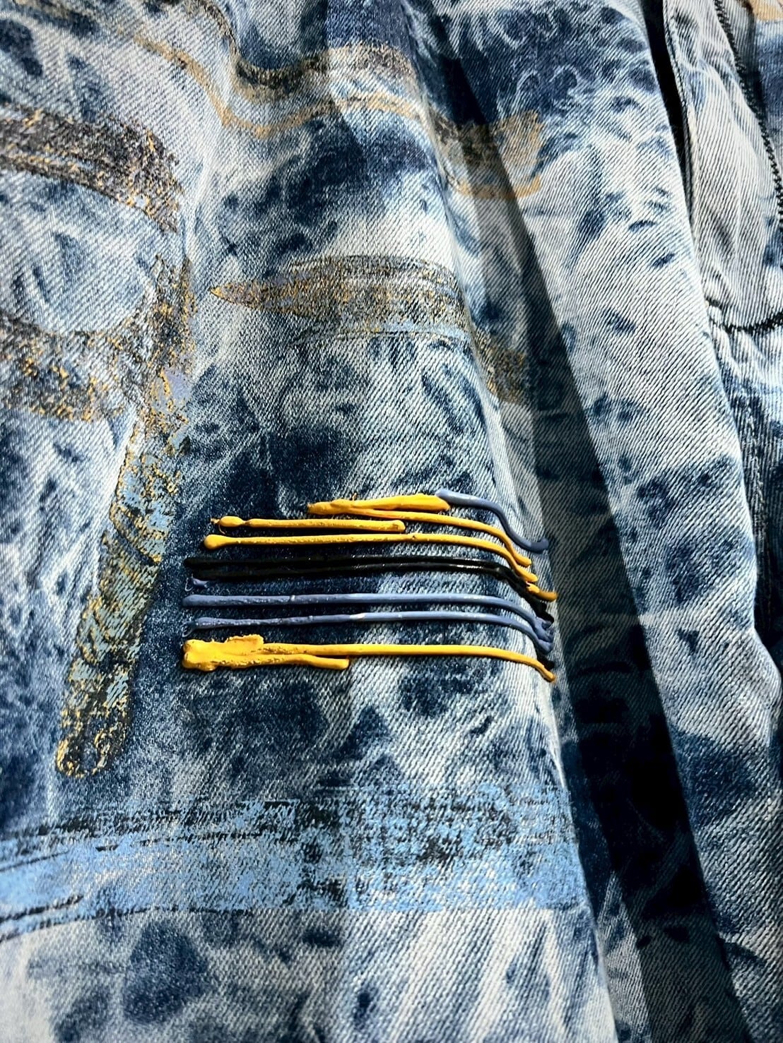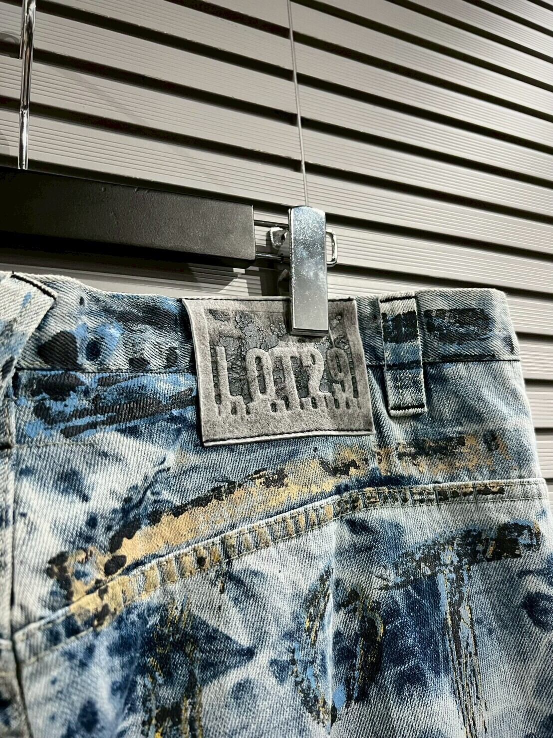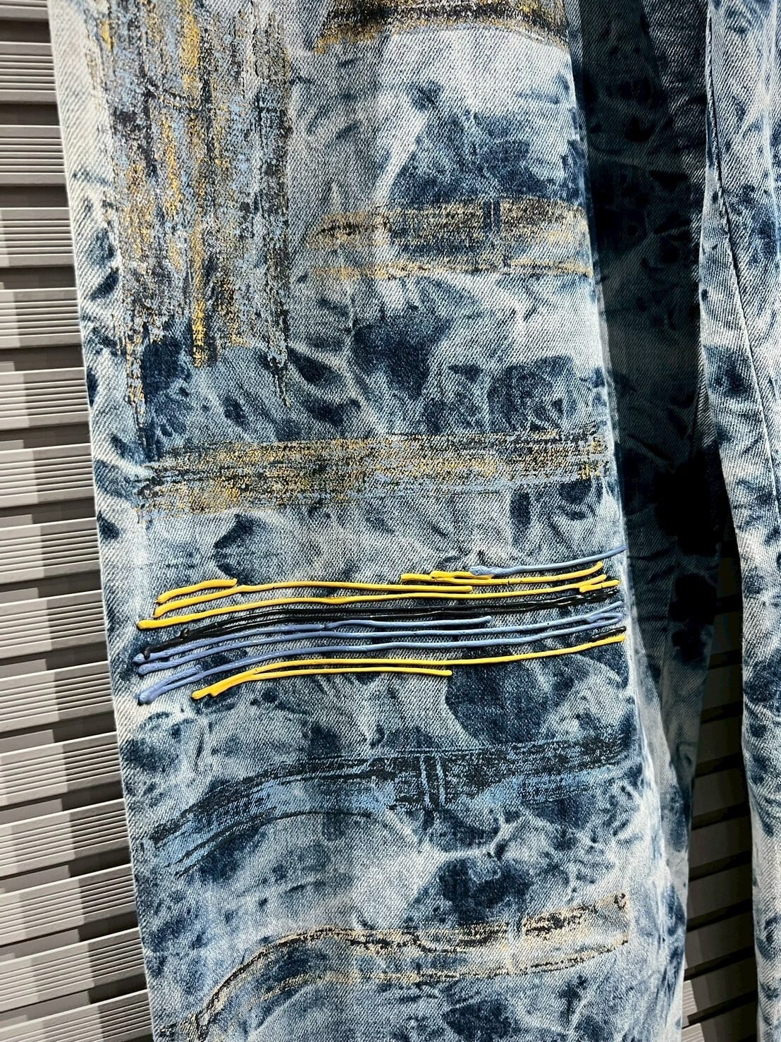 インディゴブルーのボディにブリーチとペイントによってデザインを施したバギーパンツ。